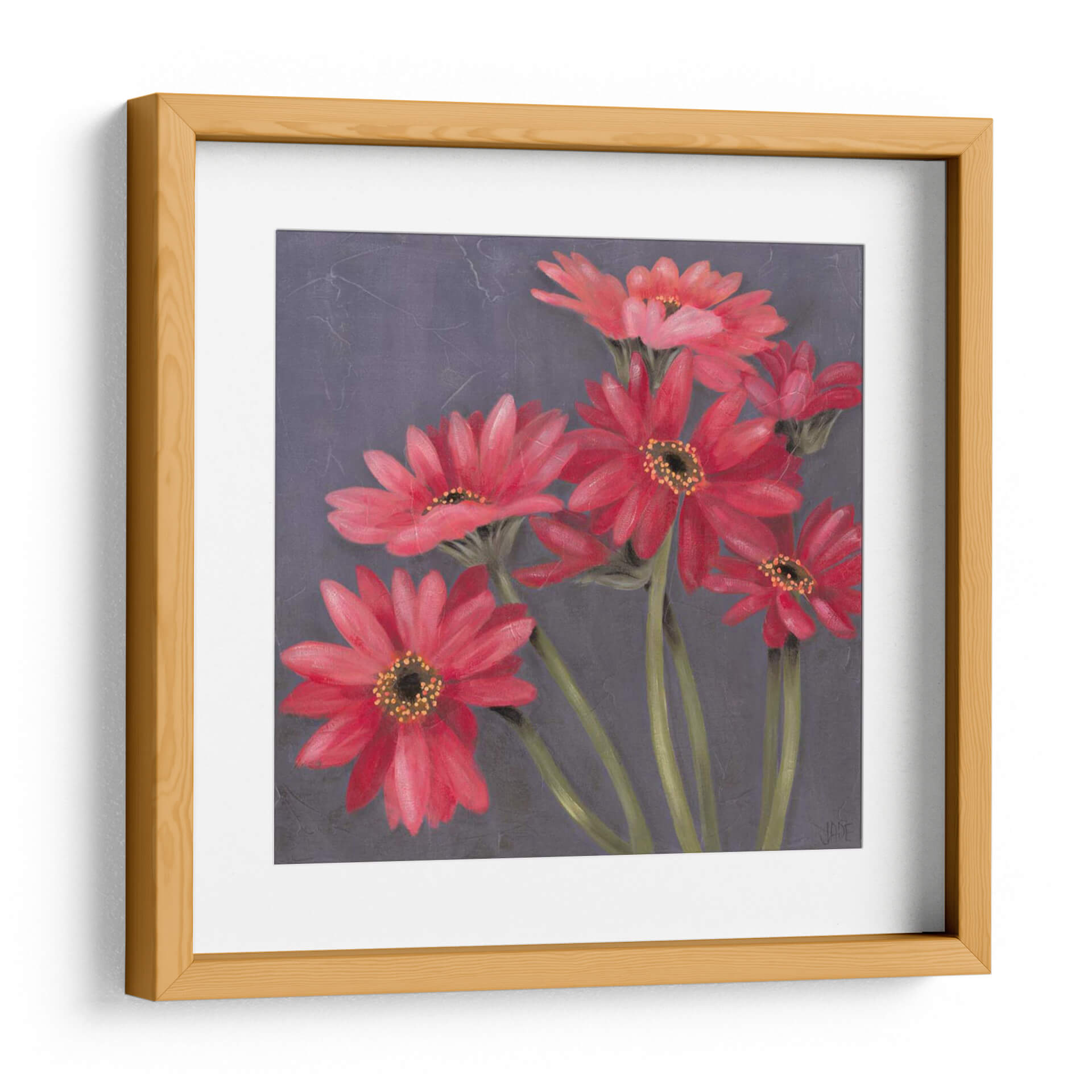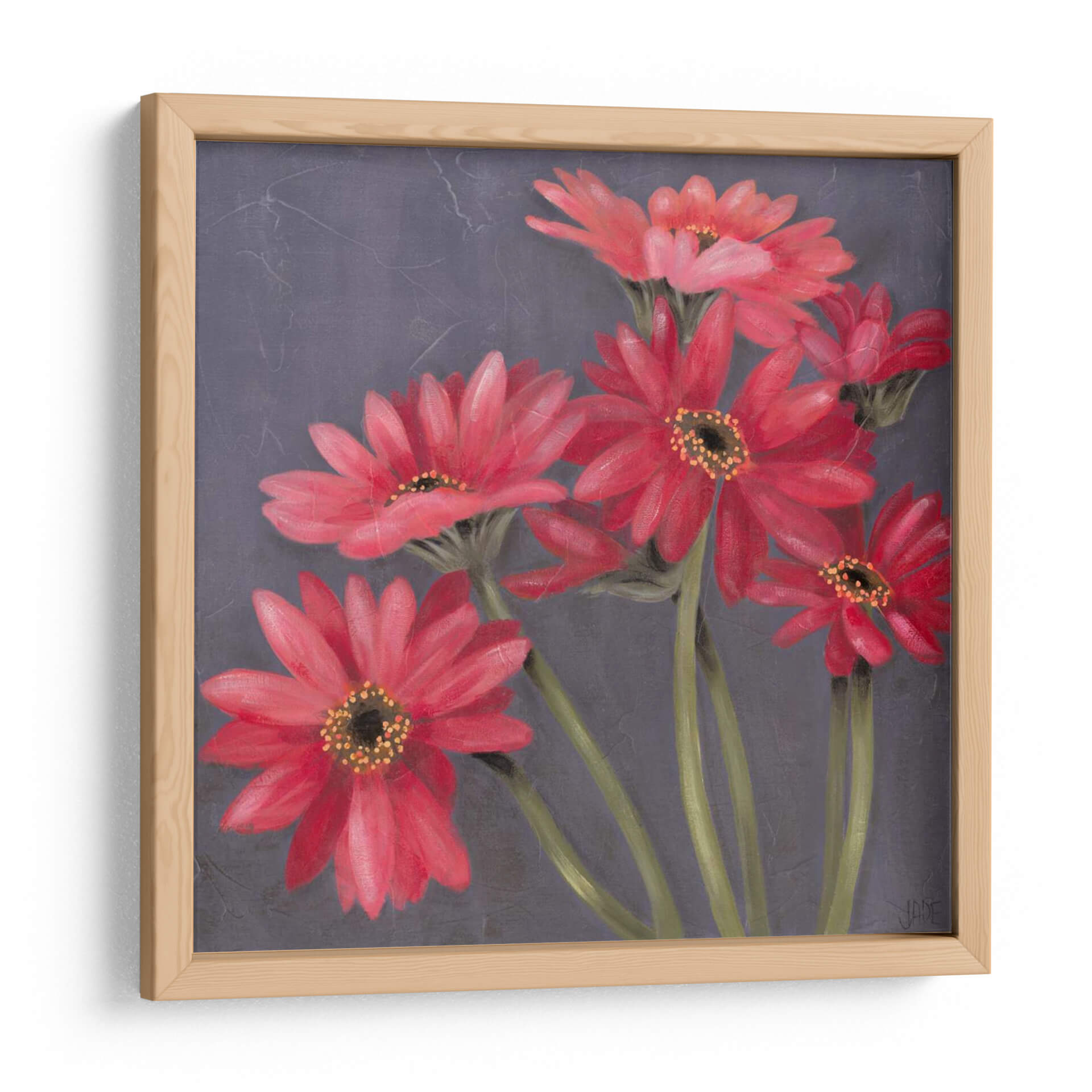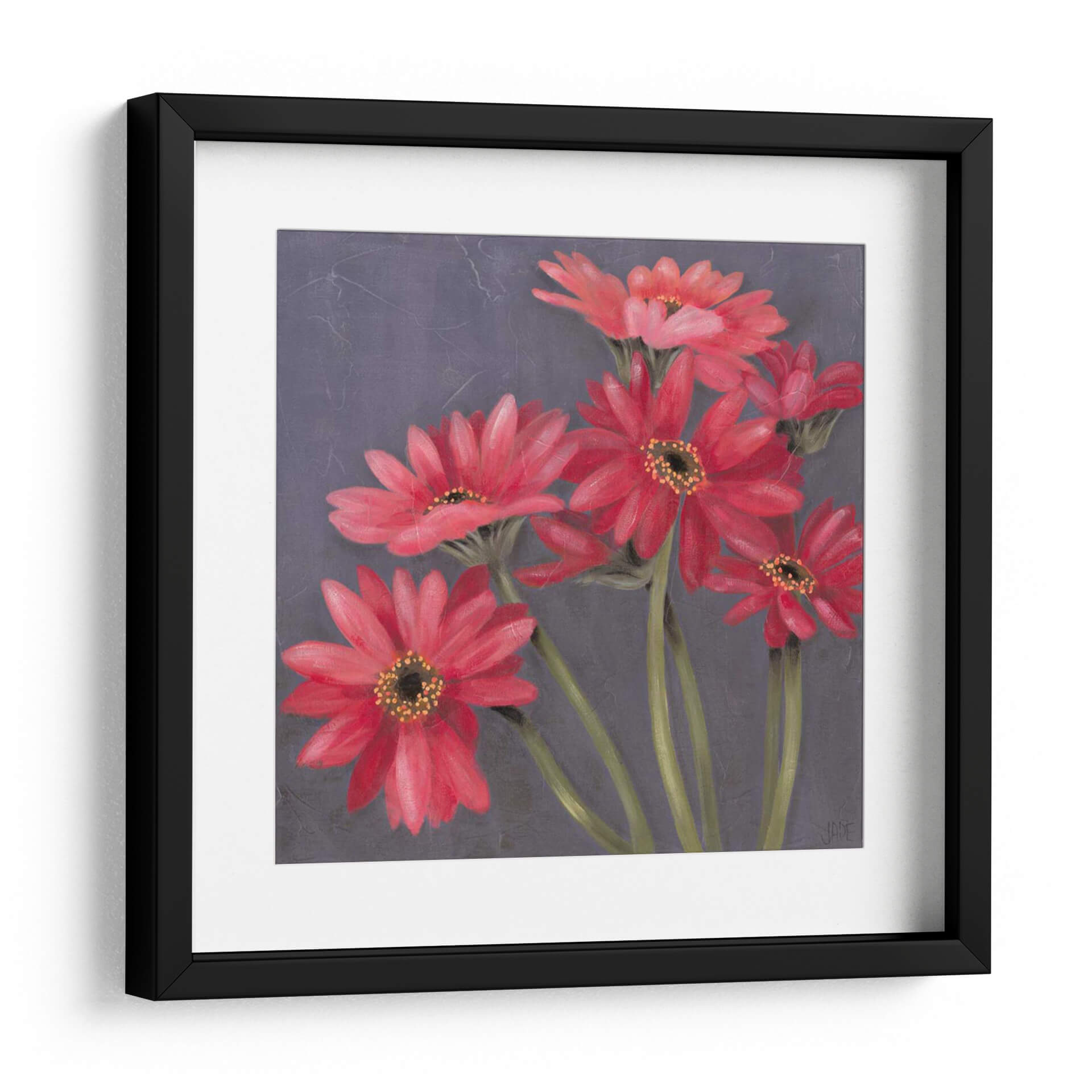 Embellece tu espacio con "Gerber En Grey II", una obra de arte contemporánea de Jade Reynolds que captura la vibrante esencia de las gerberas en plena floración. Esta pieza presenta un cautivador arreglo de flores en tonos rojos intensos y rosados, cuyas delicadas pétalos se despliegan con gracia sobre un fondo texturizado en gris oscuro. La paleta de colores, dominada por los rojos vivos de las flores y contrastada con los tallos verdes y el sombrío fondo, crea una atmósfera de elegancia y vitalidad. El estilo pictórico, con pinceladas sutiles que sugieren movimiento y profundidad, aporta un toque sofisticado y moderno. "Gerber En Grey II" es ideal para añadir un punto focal de color y frescura a cualquier habitación, desde una sala de estar moderna hasta un sereno dormitorio o una oficina inspiradora. Transmite una sensación de alegría y optimismo, invitando a la contemplación de la belleza natural. Este cuadro decorativo es una elección perfecta para quienes buscan arte que hable de pasión y delicadeza, aportando vida y carácter a la decoración de interiores.