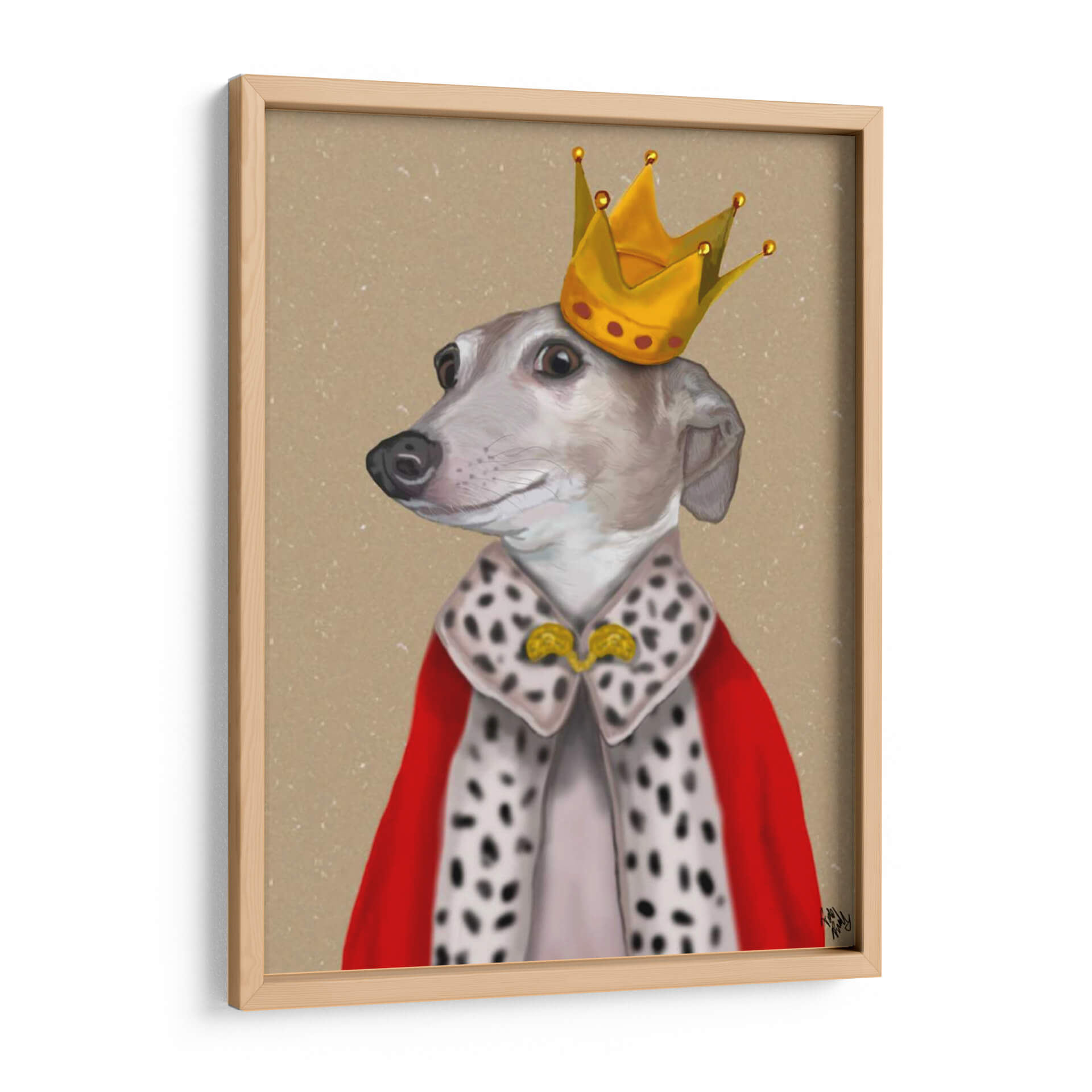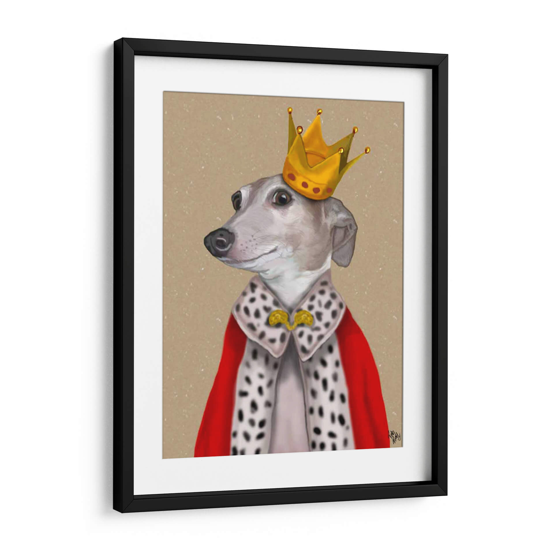 Transforma tu espacio con el encantador cuadro decorativo "Greyhound Reina" del artista Fab Funky. Esta obra de arte captura la majestuosidad y el encanto de un galgo ataviado con una corona dorada y una capa real de armiño y terciopelo rojo. La paleta de colores, dominada por tonos neutros y terrosos en el fondo, resalta la vibrante corona y la rica vestimenta, creando un contraste visual cautivador. El estilo detallado pero con un toque de humor y ternura, evoca una sensación de realeza juguetona y elegancia atemporal. La expresión serena y la pose distinguida del galgo invitan a la contemplación y añaden un toque de sofisticación a cualquier ambiente. Este cuadro decorativo es perfecto para añadir un punto focal de personalidad a tu sala de estar, estudio u oficina. Su singularidad lo convierte en una pieza ideal para amantes de los animales y del arte que buscan añadir carácter y un toque de originalidad a su decoración. Ideal para quienes buscan "arte de pared de animales", "decoración de perros con estilo" o "cuadros modernos con humor". Haz que tu hogar o lugar de trabajo destaque con esta pieza única que combina arte contemporáneo y un toque de fantasía real.