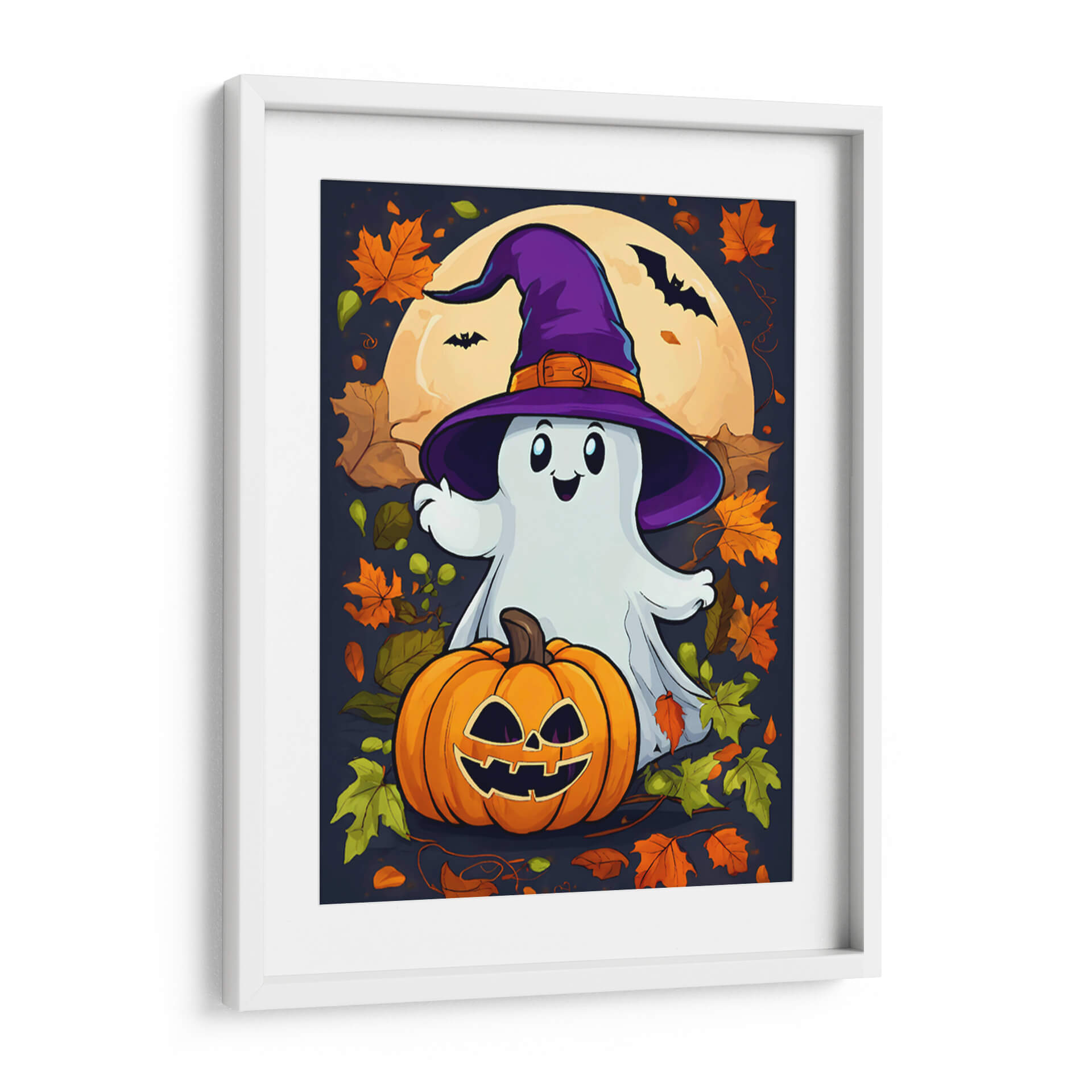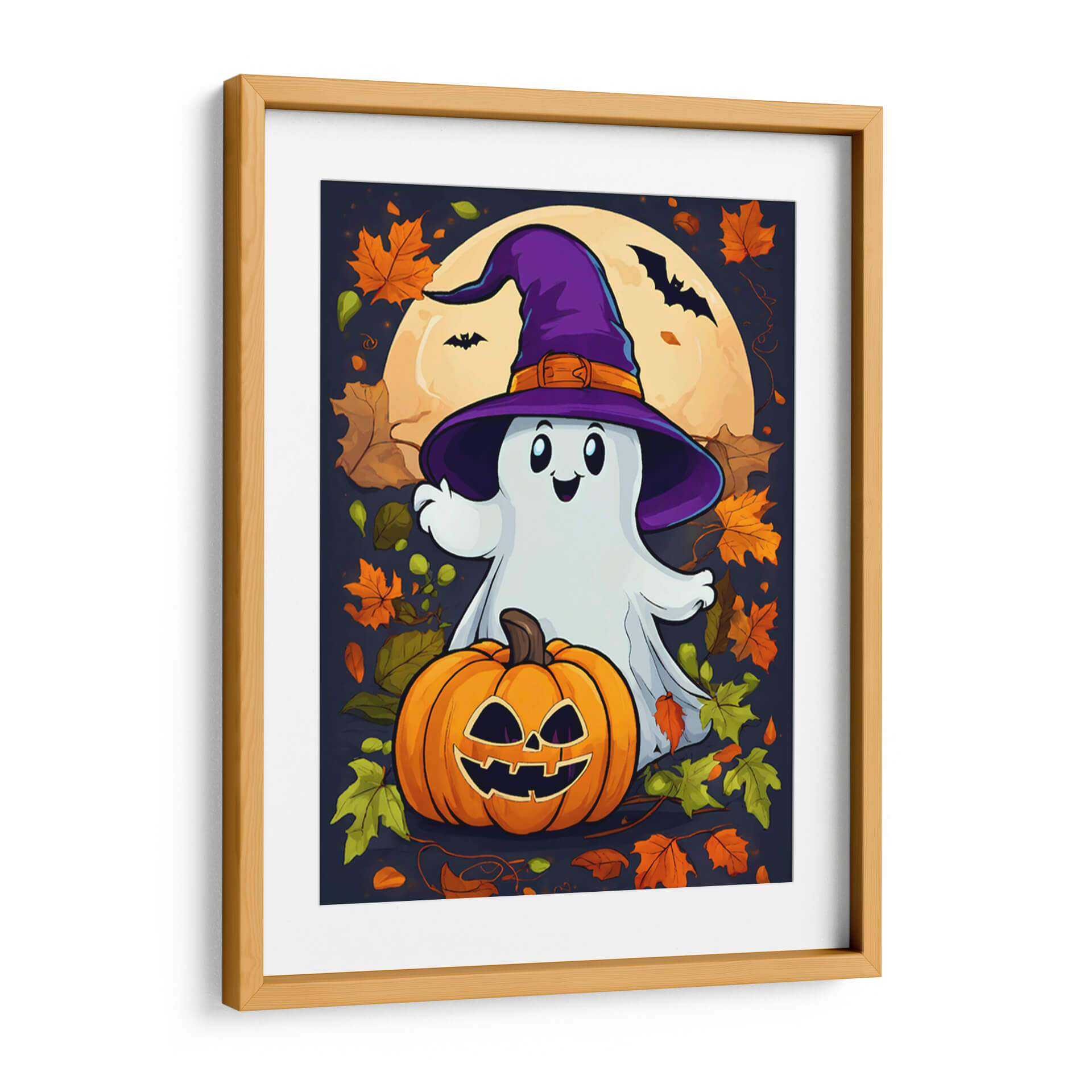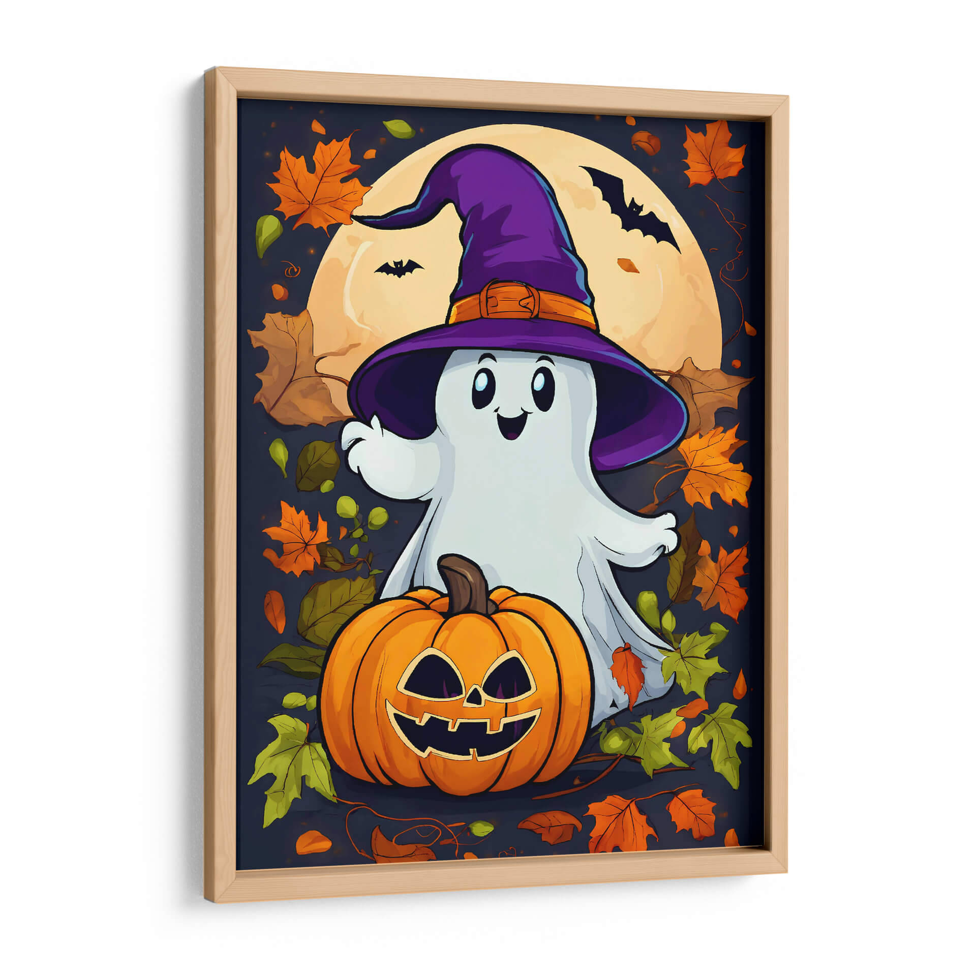 Celebra la temporada otoñal y la diversión espeluznante con este encantador cuadro decorativo de Halloween. La obra presenta a un adorable fantasma con un sombrero de bruja morado, sonriendo alegremente junto a una calabaza tallada con una expresión juguetona. El fondo está adornado con hojas de otoño en tonos naranjas y verdes, y una gran luna amarilla que evoca la atmósfera mágica de la noche de Halloween. Los murciélagos revolotean sutilmente, añadiendo un toque clásico de la festividad. El estilo de arte digital es vibrante y amigable, con líneas claras y colores saturados, lo que lo convierte en una pieza decorativa perfecta para espacios que buscan un toque de alegría y fantasía. Ideal para habitaciones infantiles, salas de estar, o cualquier rincón que necesite un acento festivo y lleno de carácter. Este cuadro decorativo captura la esencia lúdica de Halloween, invitando a la celebración y a crear recuerdos entrañables. Su composición equilibrada y su temática universalmente atractiva aseguran que sea un punto de conversación y admiración.