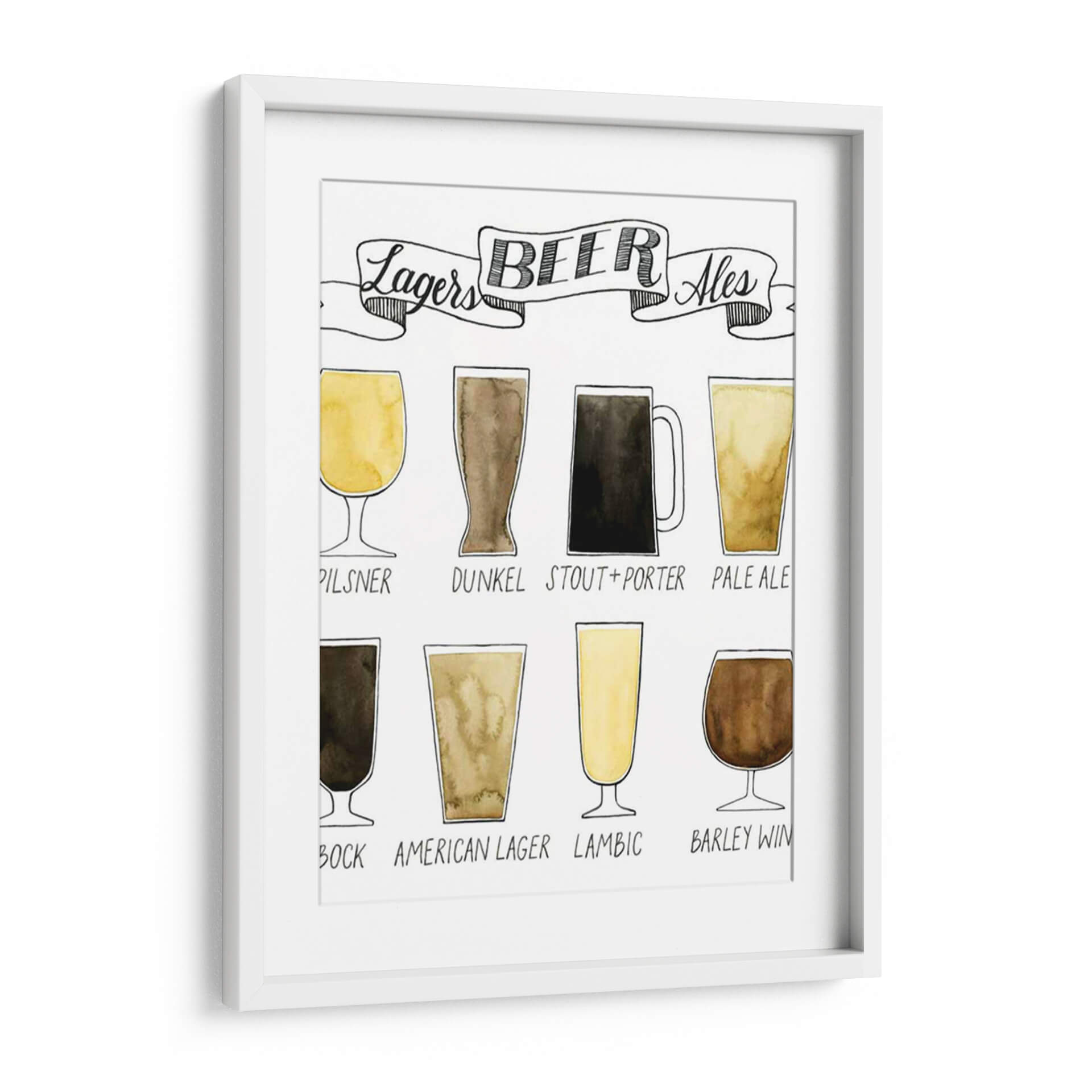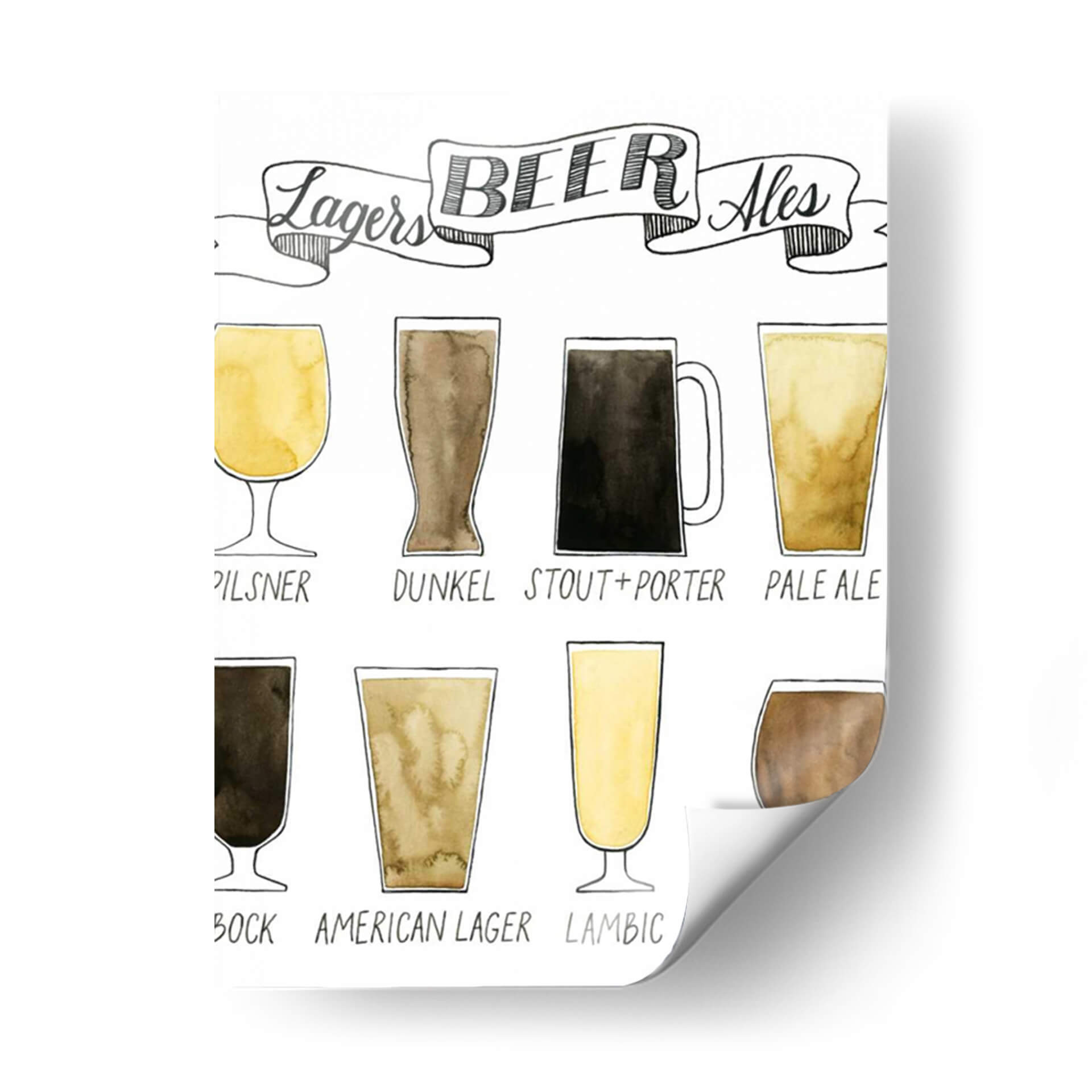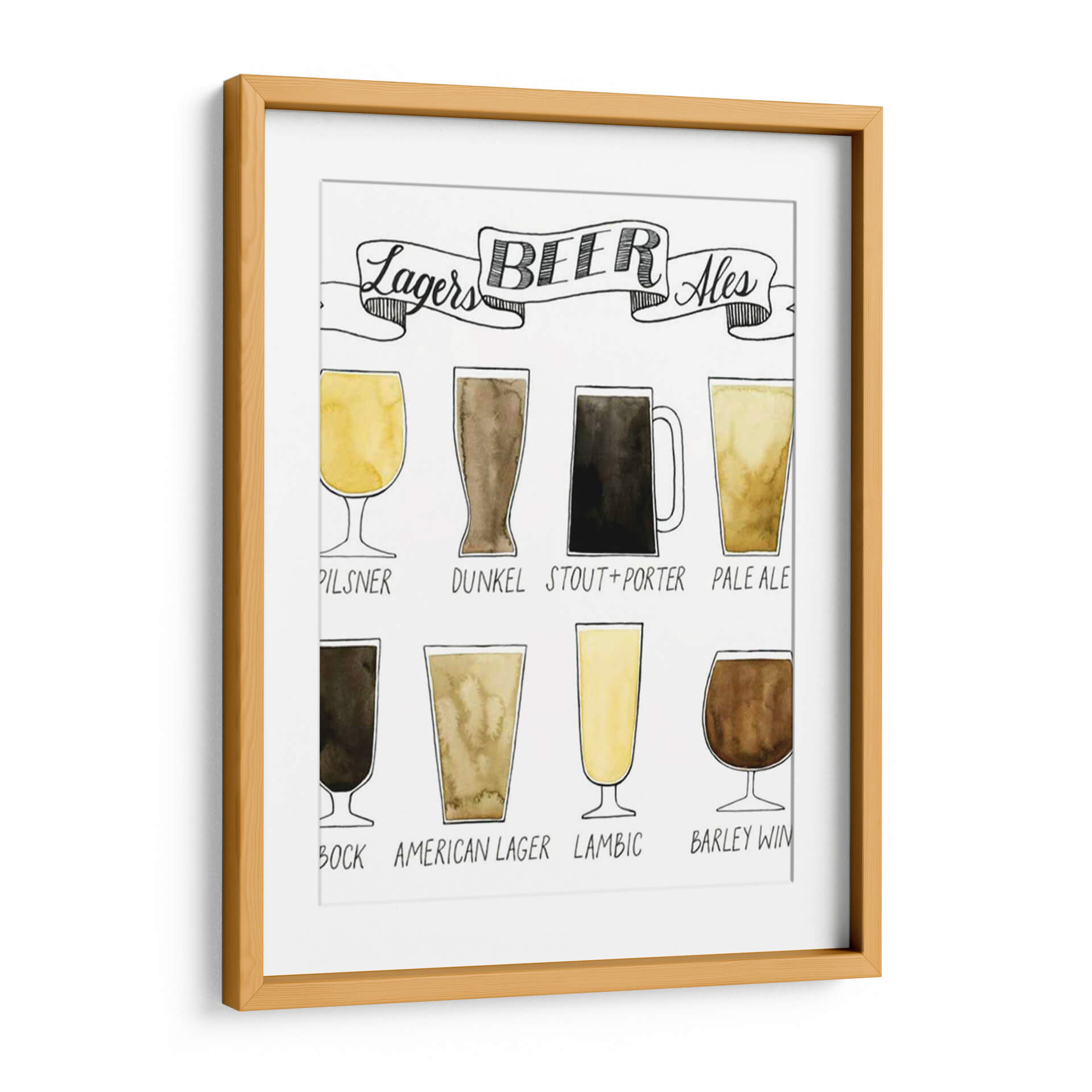 Descubre "Información De Cerveza Gráfica" de Grace Popp, una obra de arte que celebra la diversidad de las cervezas con un estilo acuarela encantador. Esta pieza visualmente atractiva presenta una serie de vasos, cada uno representando un tipo distinto de cerveza, desde las pálidas Lagers como Pilsner y Pale Ale, hasta las oscuras Dunkel, Stout y Porter, sin olvidar las más complejas como Bock, American Lager, Lambic y Barley Wine. La paleta de colores se centra en tonos tierra, ámbar y dorados, evocando la calidez y la riqueza de la bebida. La técnica de acuarela le otorga una textura suave y orgánica, mientras que el estilo de ilustración, con sus líneas sencillas y el texto manuscrito, añade un toque artesanal y moderno. Este cuadro decorativo es ideal para los amantes de la cerveza, sommeliers o para añadir un carácter único y conversacional a cocinas, bares caseros, salas de estar o espacios de ocio. Su diseño educativo y estético lo convierte en un punto focal interesante y una fuente de inspiración para cualquier aficionado a la cultura cervecera, aportando una atmósfera de camaradería y disfrute.