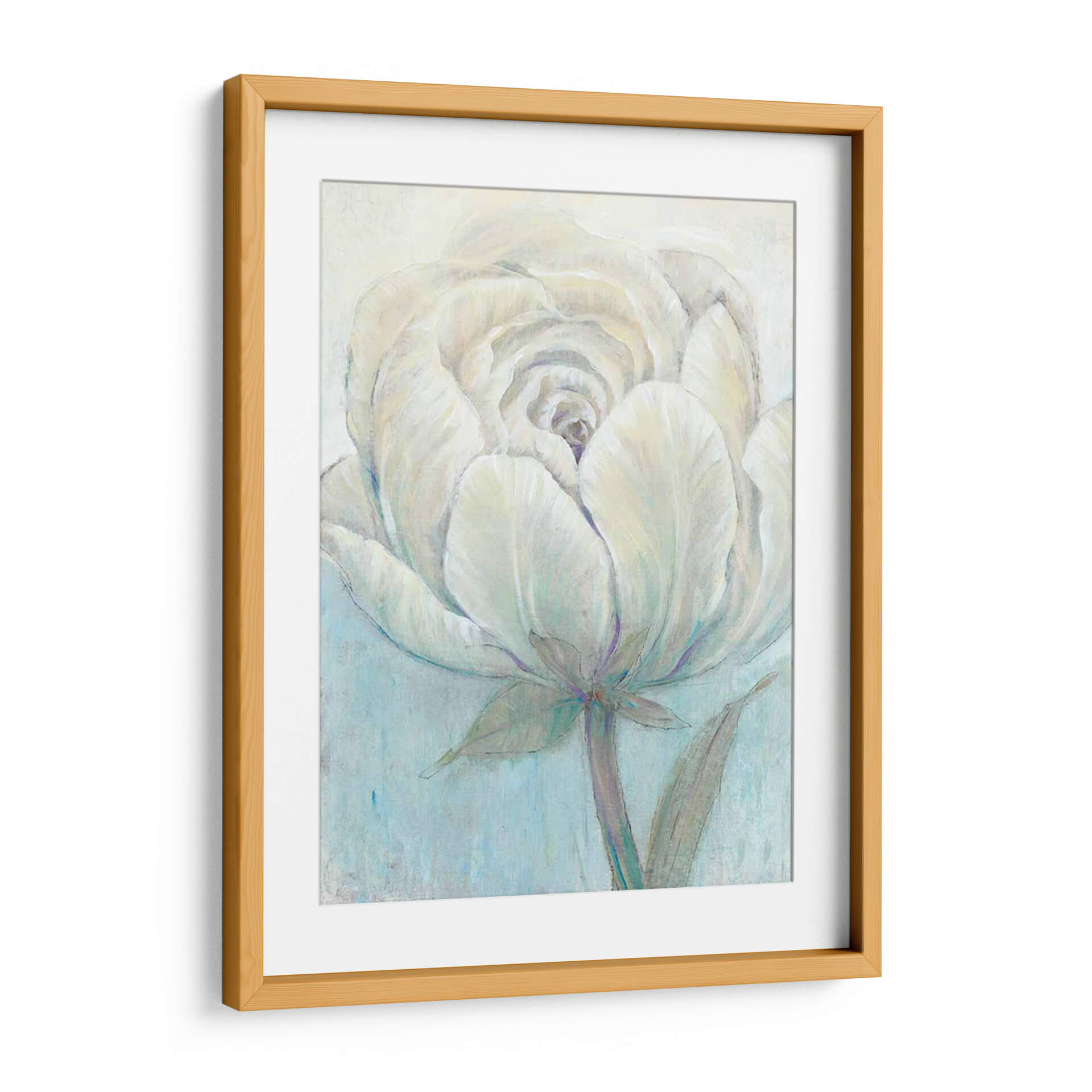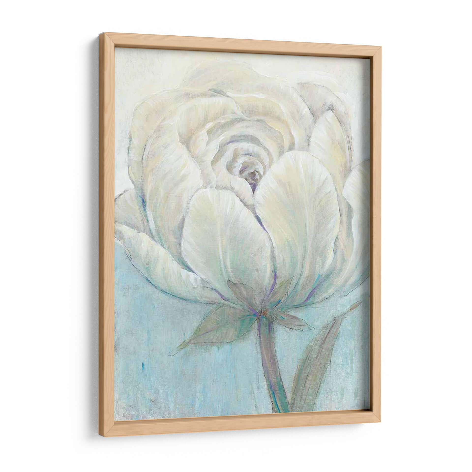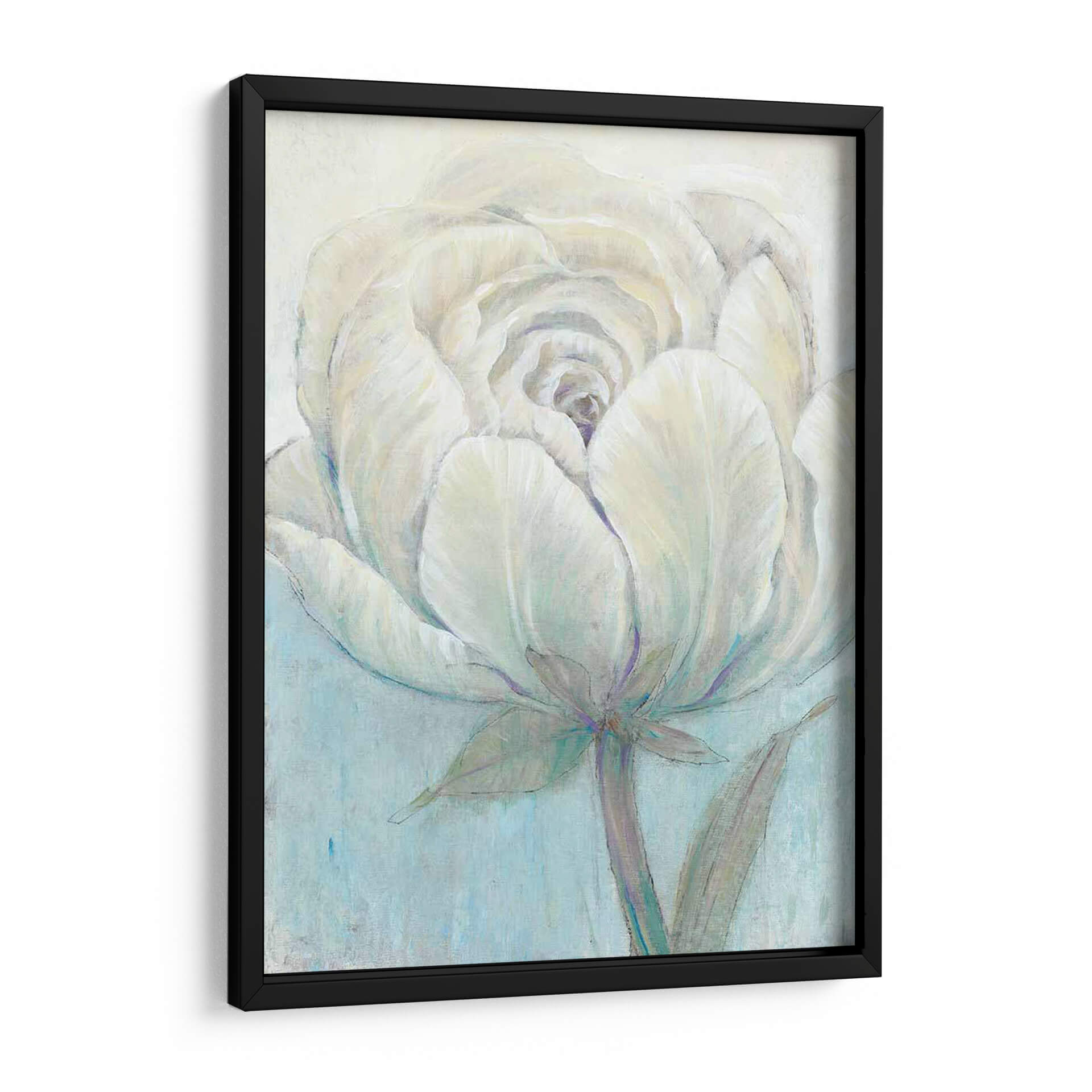 Sumérgete en la delicadeza y elegancia de "Inglés Rose I", una obra de arte floral que captura la esencia de una rosa en plena floración. Los suaves pétalos blancos y cremosos se despliegan con una textura rica, pintados con pinceladas que sugieren movimiento y vida. La paleta de colores, dominada por tonos pastel y acentos sutiles de azul pálido y verde, crea una atmósfera de serenidad y calma, invitando a la contemplación. El fondo etéreo y la delicada línea del tallo y las hojas refuerzan la delicadeza de la composición, haciendo de esta pieza un elemento decorativo ideal para espacios que buscan transmitir paz y sofisticación. El estilo evocador, que mezcla lo figurativo con toques impresionistas, permite que la obra se adapte a diversos estilos de decoración, desde el moderno hasta el más clásico. Este cuadro decorativo es perfecto para añadir un punto de sutileza y belleza natural a tu dormitorio, sala de estar o incluso a un espacio de trabajo que necesite un toque de inspiración. Deja que la belleza atemporal de esta rosa transforme tu hogar en un oasis de tranquilidad y estilo.
