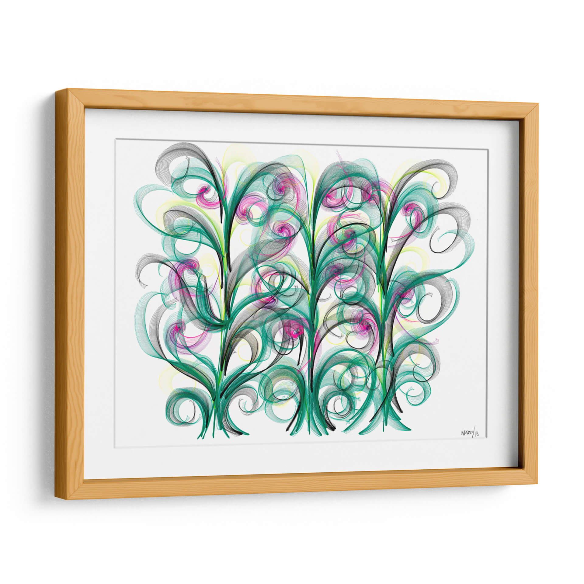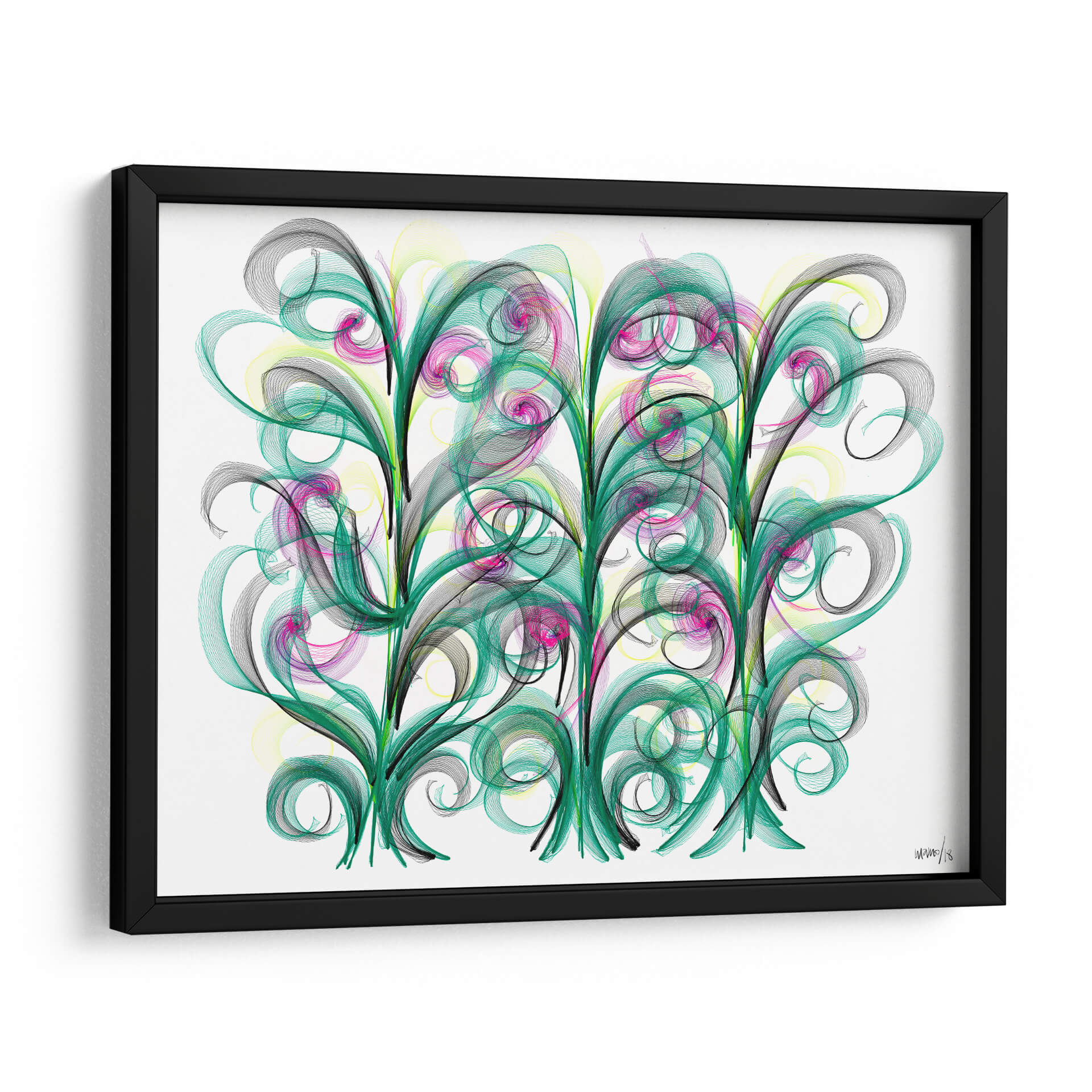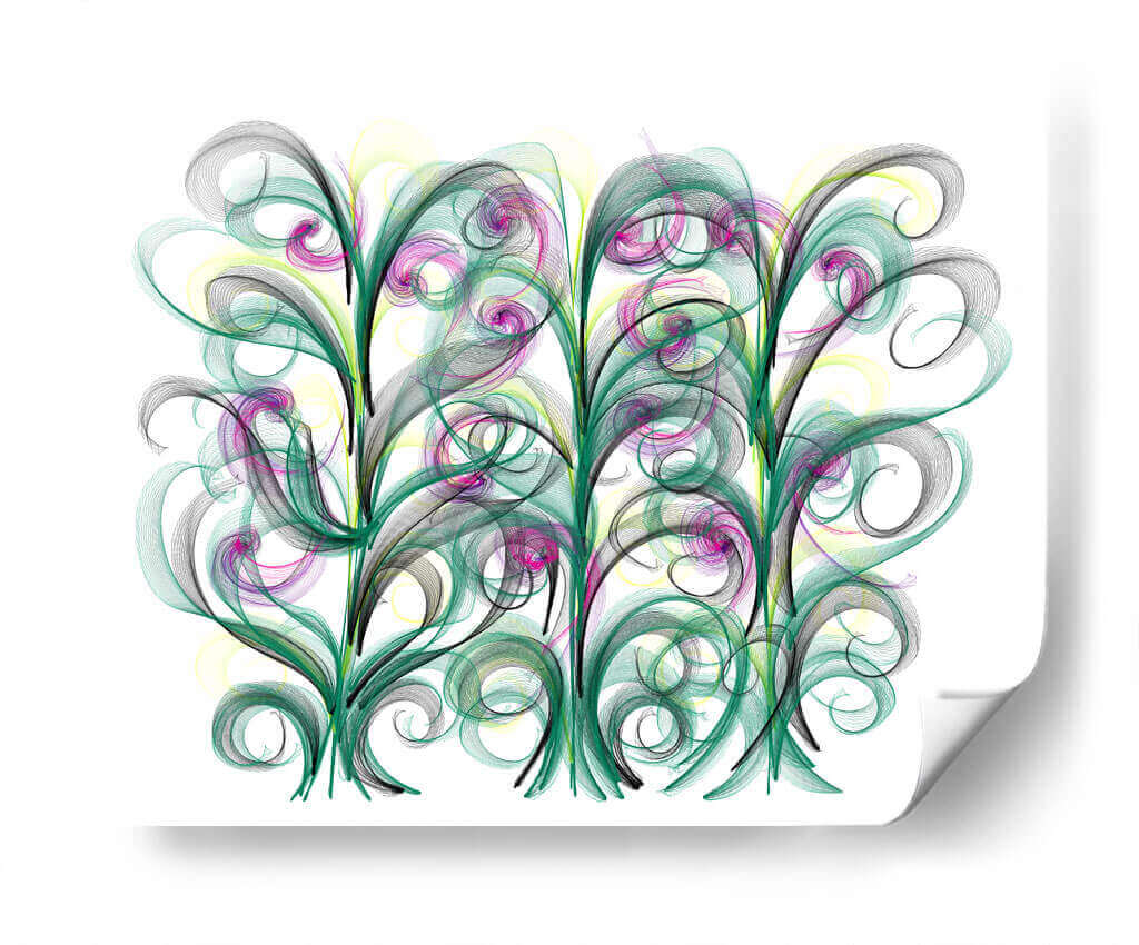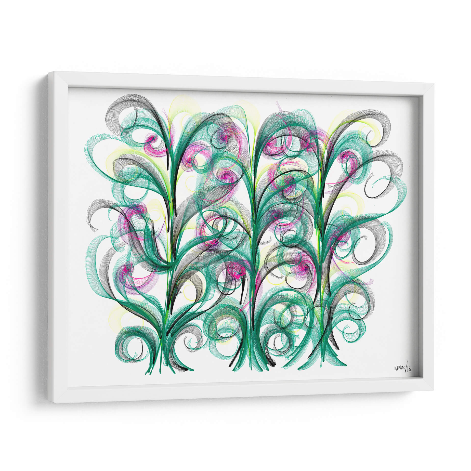 Sumérgete en la serenidad y la belleza etérea de 'Jardín Secreto', una obra de arte contemporáneo de Gina Villalobos que cautiva con su delicada representación de formas orgánicas. Este cuadro decorativo se despliega en un lienzo blanco, permitiendo que las finas líneas de color verde esmeralda, fucsia vibrante y toques de amarillo pálido tomen protagonismo. La composición se asemeja a un jardín botánico estilizado, donde tallos esbeltos se curvan y entrelazan en elegantes espirales, evocando el movimiento grácil de las plantas al viento o la fluidez de la naturaleza misma. La técnica, que parece emular trazos de pincel o incluso un proceso digital intrincado, crea una sensación de ligereza y profundidad, invitando al espectador a perderse en sus detalles. 'Jardín Secreto' es ideal para infundir calma y un toque de sofisticación natural en cualquier espacio, desde un dormitorio tranquilo hasta un salón moderno o una oficina serena. Transforma tu hogar u oficina con este cuadro abstracto que celebra la elegancia de lo orgánico y la sutileza del color.