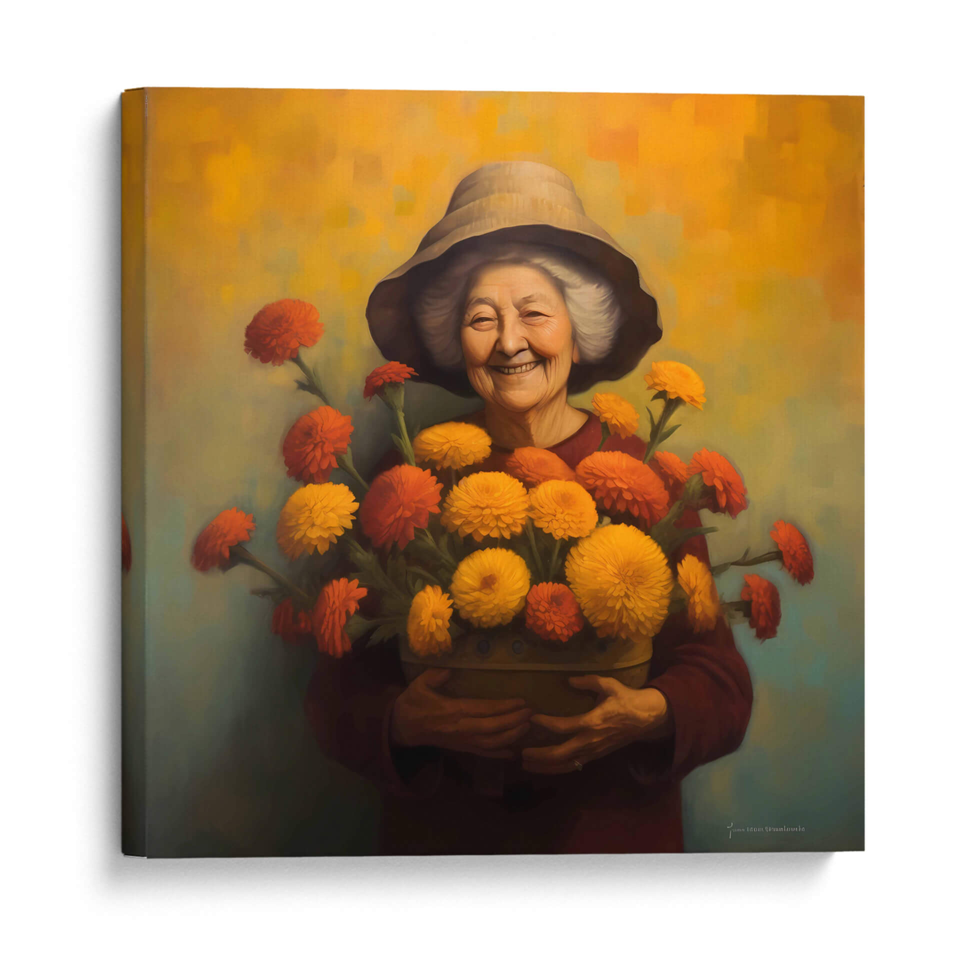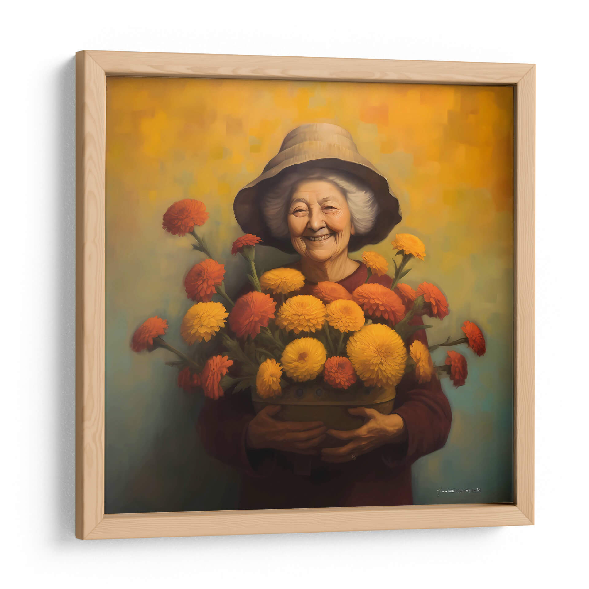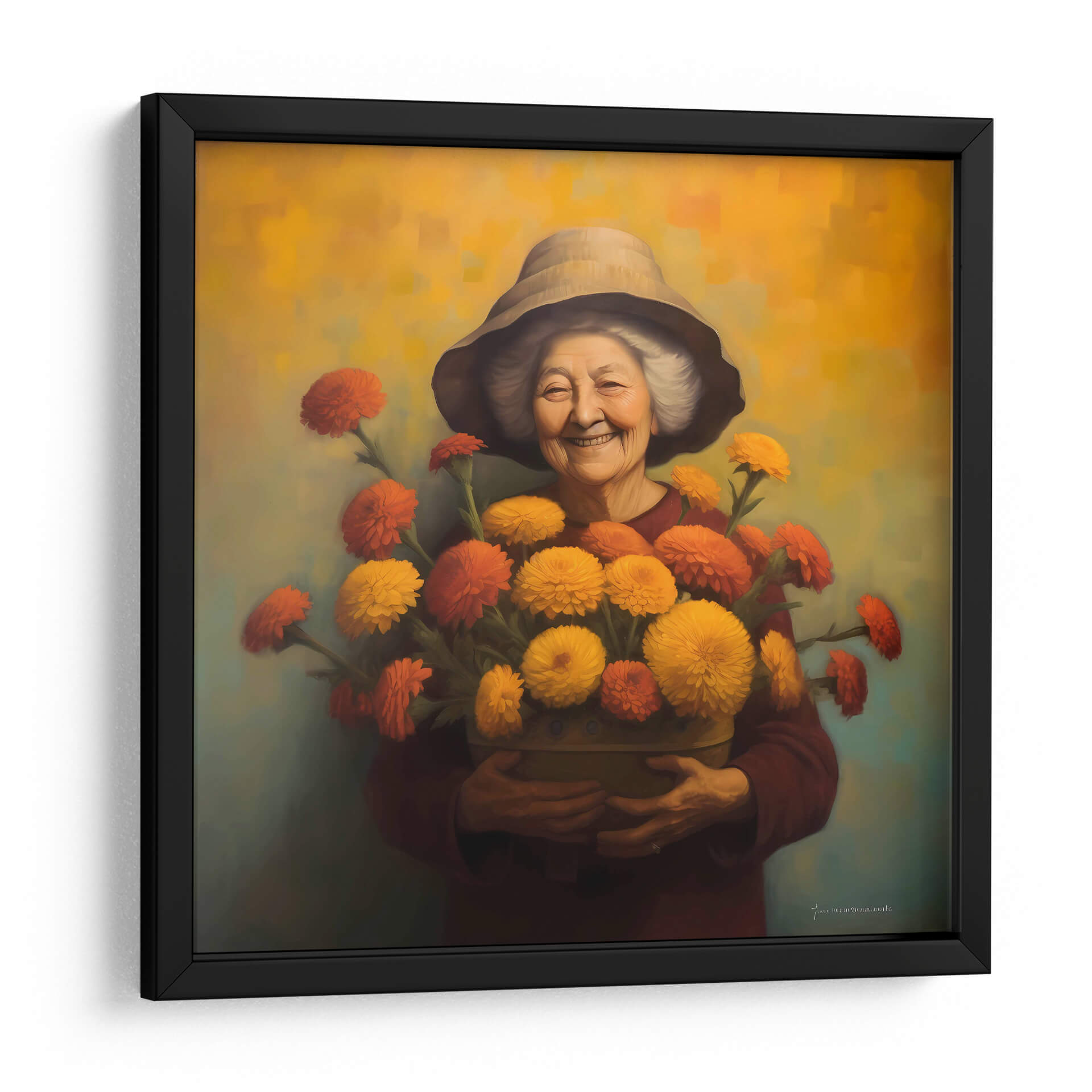Adéntrate en la calidez y la vitalidad de "La Viejita", una obra de arte cautivadora que celebra la alegría y la abundancia de la vida. Este cuadro decorativo presenta a una encantadora anciana, con una sonrisa radiante y un sombrero de ala ancha, que sostiene con ternura una exuberante cesta repleta de flores vibrantes en tonos naranjas y amarillos intensos. La artista Jessica CA ha capturado una escena llena de luz, donde la paleta de colores cálidos, dominada por amarillos dorados y naranjas ardientes, se funde suavemente con un fondo de tonos turquesa y verdosos apagados, creando una atmósfera acogedora y nostálgica. El estilo pictórico, con pinceladas visibles y una textura rica, aporta profundidad y emoción a la pieza. "La Viejita" es más que una simple imagen; es una representación de la sabiduría, la experiencia y la belleza que florece con el tiempo. Su composición centrada y el enfoque en la expresión de la protagonista invitan a la contemplación y transmiten una profunda sensación de paz y satisfacción. Ideal para añadir un toque de color y una narrativa emotiva a tu sala de estar, comedor o incluso a un espacio de oficina que necesite un soplo de vitalidad y calidez. Este cuadro decorativo es perfecto para quienes buscan una pieza que hable de la conexión humana y la belleza de la naturaleza.