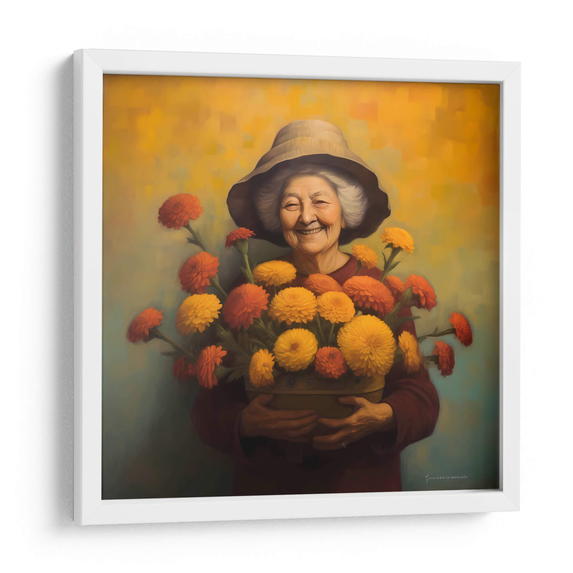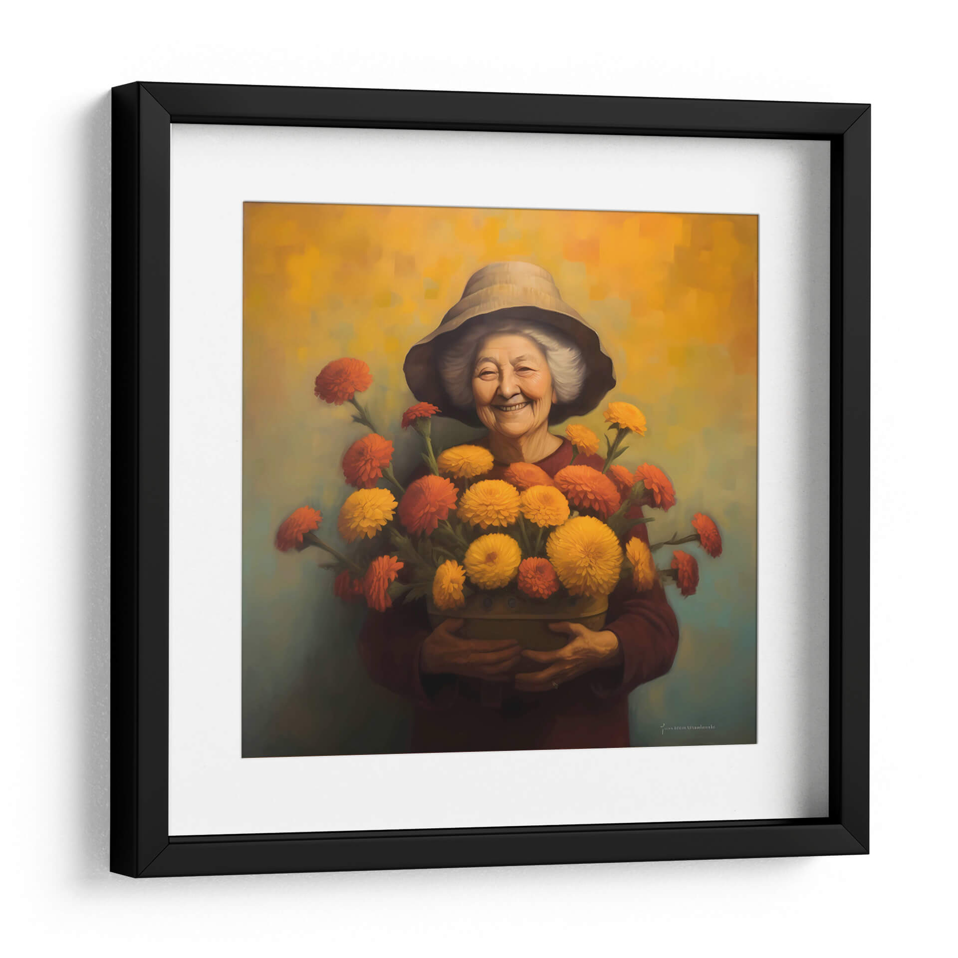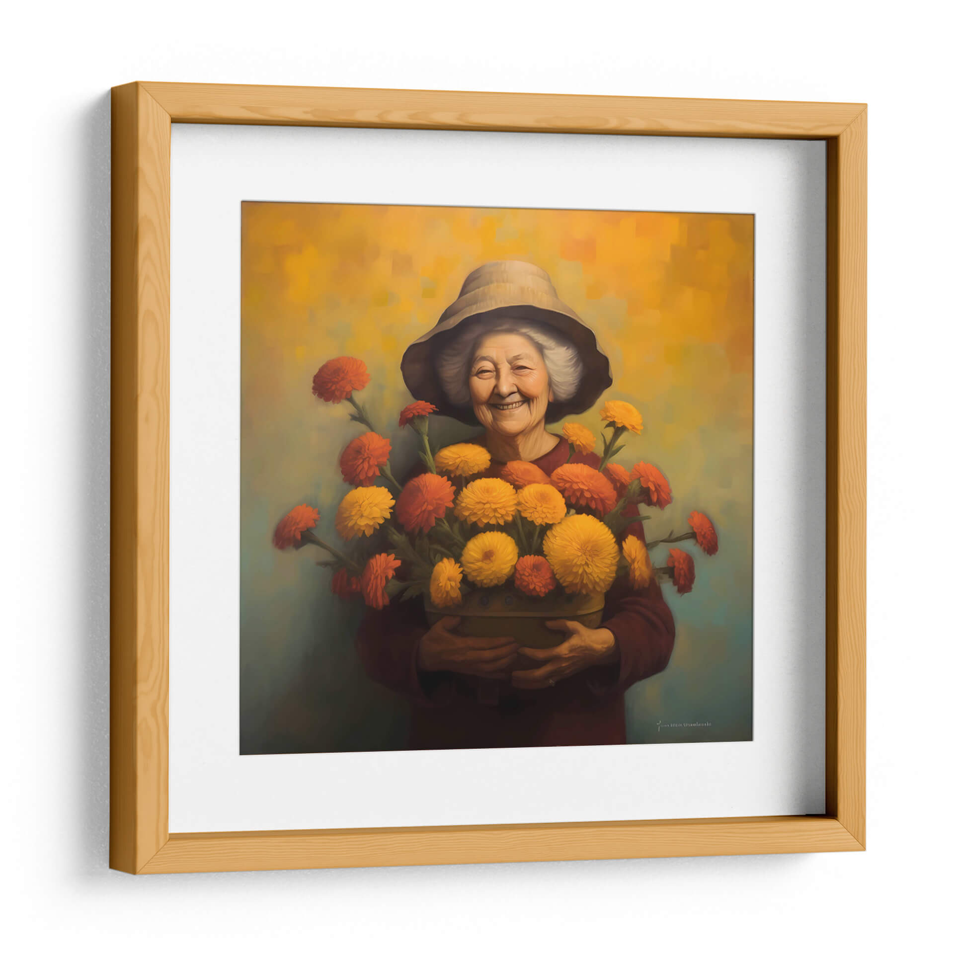 Adéntrate en la calidez y la vitalidad de "La Viejita", una obra de arte cautivadora que celebra la alegría y la abundancia de la vida. Este cuadro decorativo presenta a una encantadora anciana, con una sonrisa radiante y un sombrero de ala ancha, que sostiene con ternura una exuberante cesta repleta de flores vibrantes en tonos naranjas y amarillos intensos. La artista Jessica CA ha capturado una escena llena de luz, donde la paleta de colores cálidos, dominada por amarillos dorados y naranjas ardientes, se funde suavemente con un fondo de tonos turquesa y verdosos apagados, creando una atmósfera acogedora y nostálgica. El estilo pictórico, con pinceladas visibles y una textura rica, aporta profundidad y emoción a la pieza. "La Viejita" es más que una simple imagen; es una representación de la sabiduría, la experiencia y la belleza que florece con el tiempo. Su composición centrada y el enfoque en la expresión de la protagonista invitan a la contemplación y transmiten una profunda sensación de paz y satisfacción. Ideal para añadir un toque de color y una narrativa emotiva a tu sala de estar, comedor o incluso a un espacio de oficina que necesite un soplo de vitalidad y calidez. Este cuadro decorativo es perfecto para quienes buscan una pieza que hable de la conexión humana y la belleza de la naturaleza.