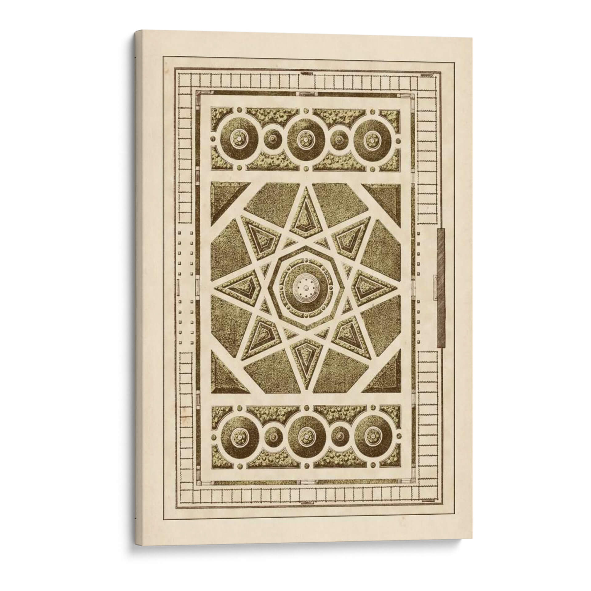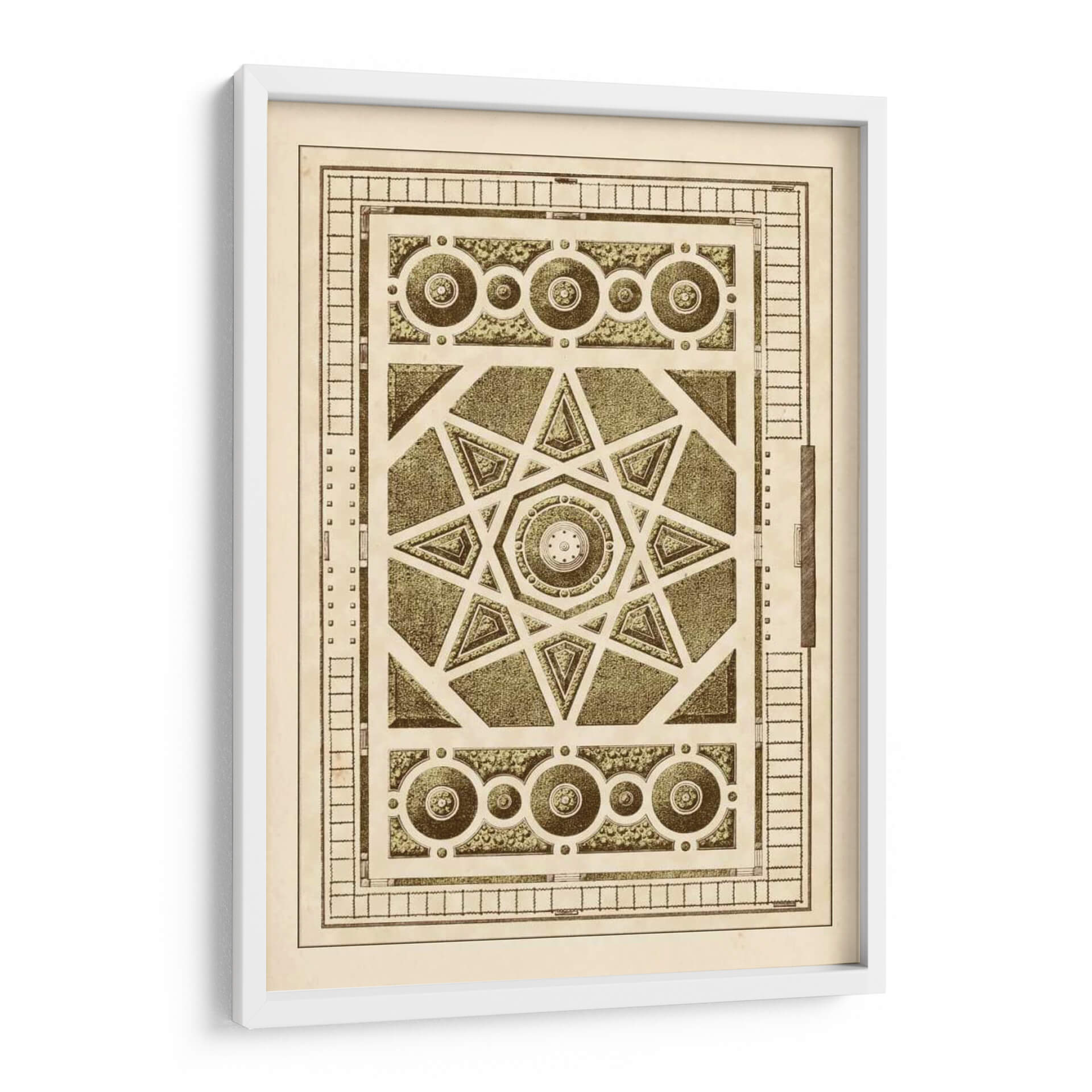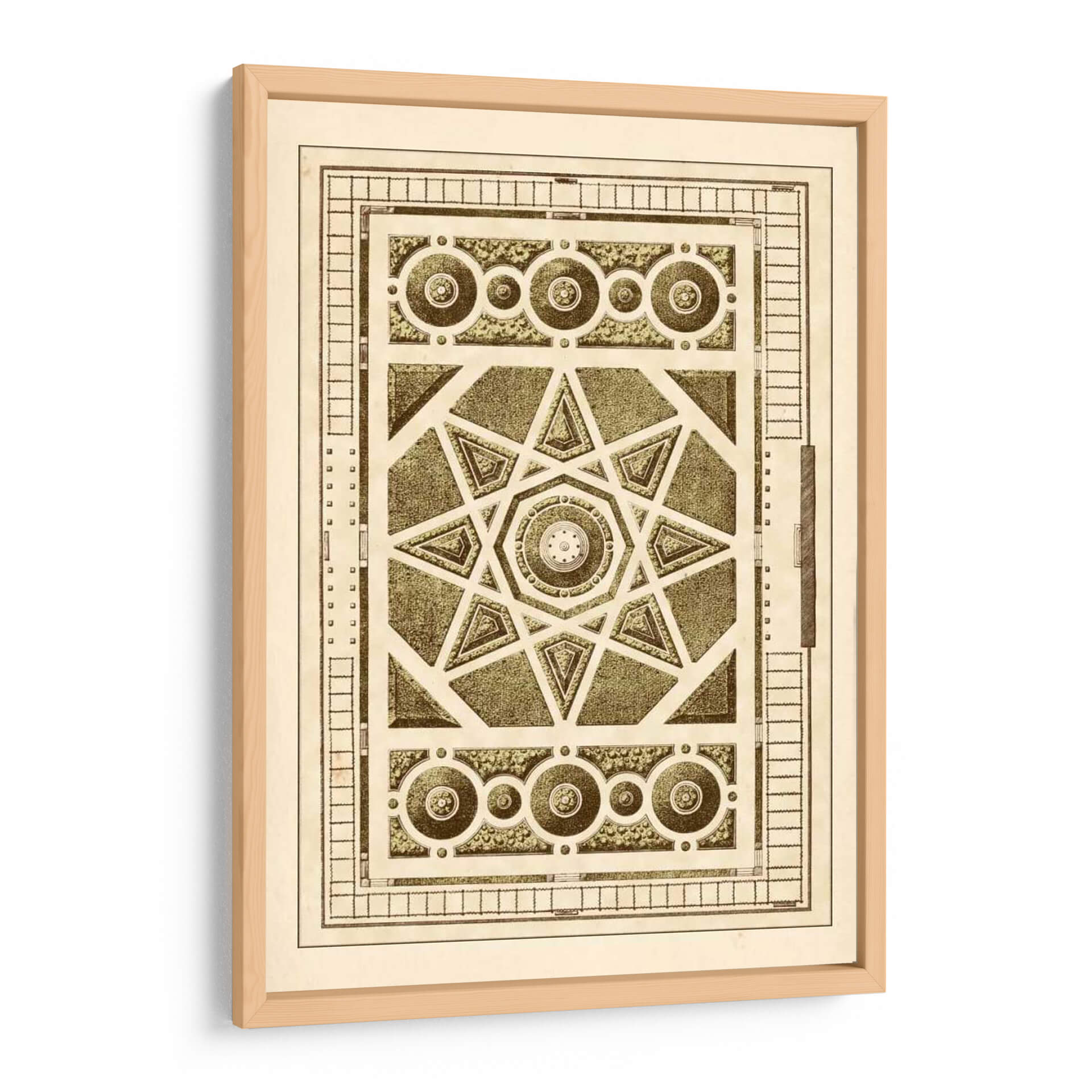 Sumérgete en la complejidad geométrica y la serenidad de 'Laberinto Del Jardín VI', una obra de arte que evoca la precisión y la belleza de los diseños de jardines clásicos. Este cuadro decorativo presenta un intrincado patrón central con una estrella de ocho puntas, rodeado por elementos circulares y rectangulares que recuerdan a los trazados de un jardín francés o un diseño arquitectónico detallado. La paleta de colores, dominada por tonos sepia, beige y verdes apagados, confiere a la pieza una atmósfera de nostalgia y sofisticación atemporal, perfecta para añadir un toque de refinamiento y orden visual a cualquier espacio. La composición simétrica y los detalles minuciosos invitan a la contemplación, transformando cualquier pared en un punto focal de elegancia y carácter. Ideal para salones, estudios o despachos que buscan una decoración con historia y una estética cuidada. Añade esta pieza única a tu colección y deja que su diseño detallado inspire tranquilidad y reflexión en tu hogar u oficina, creando un ambiente de calma y buen gusto.