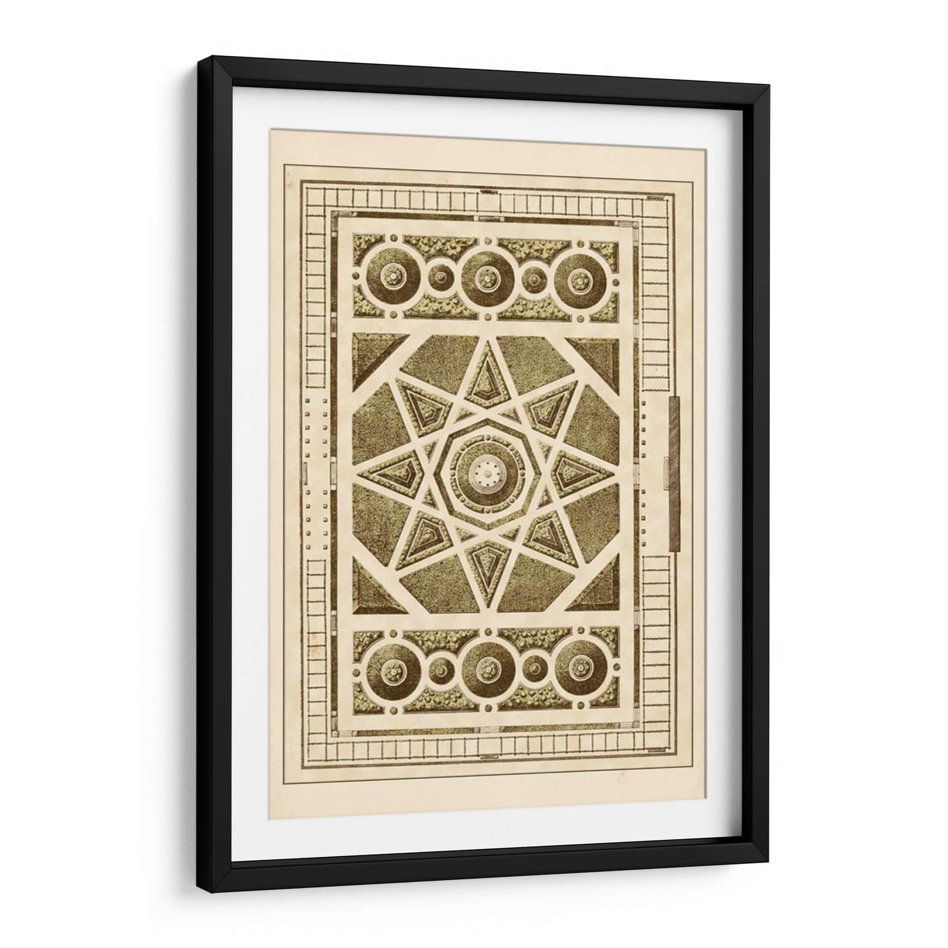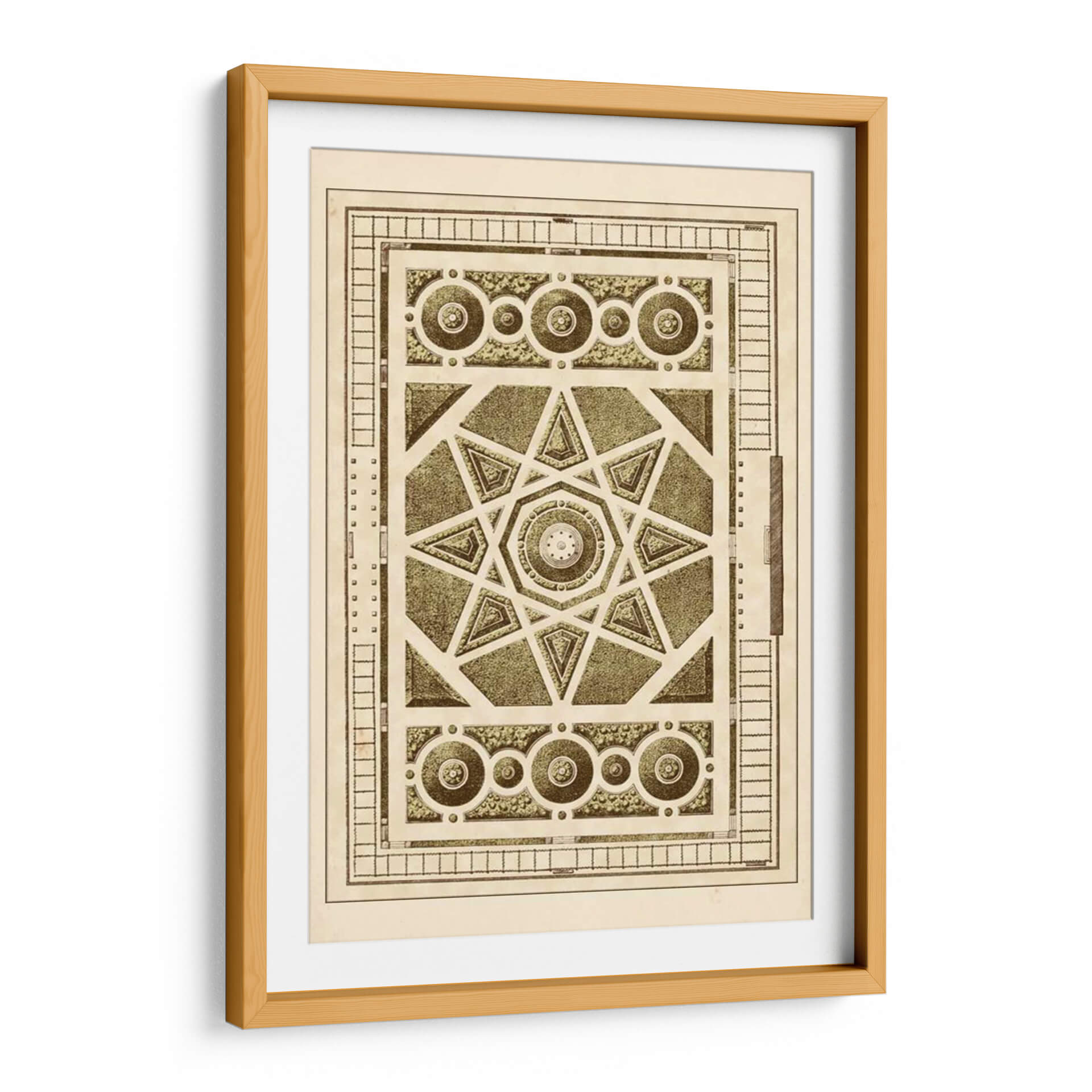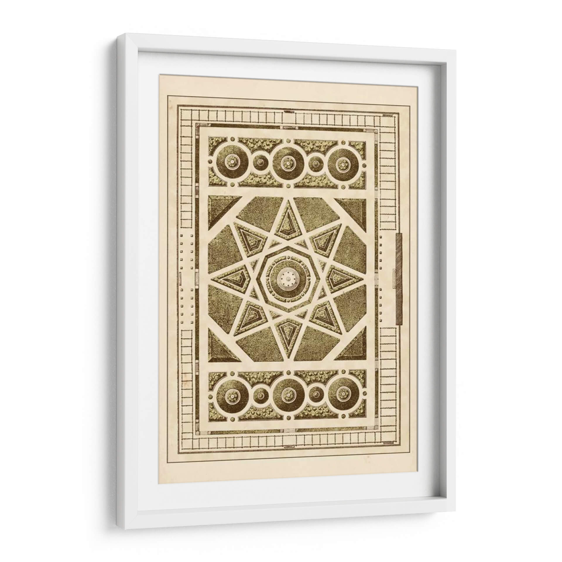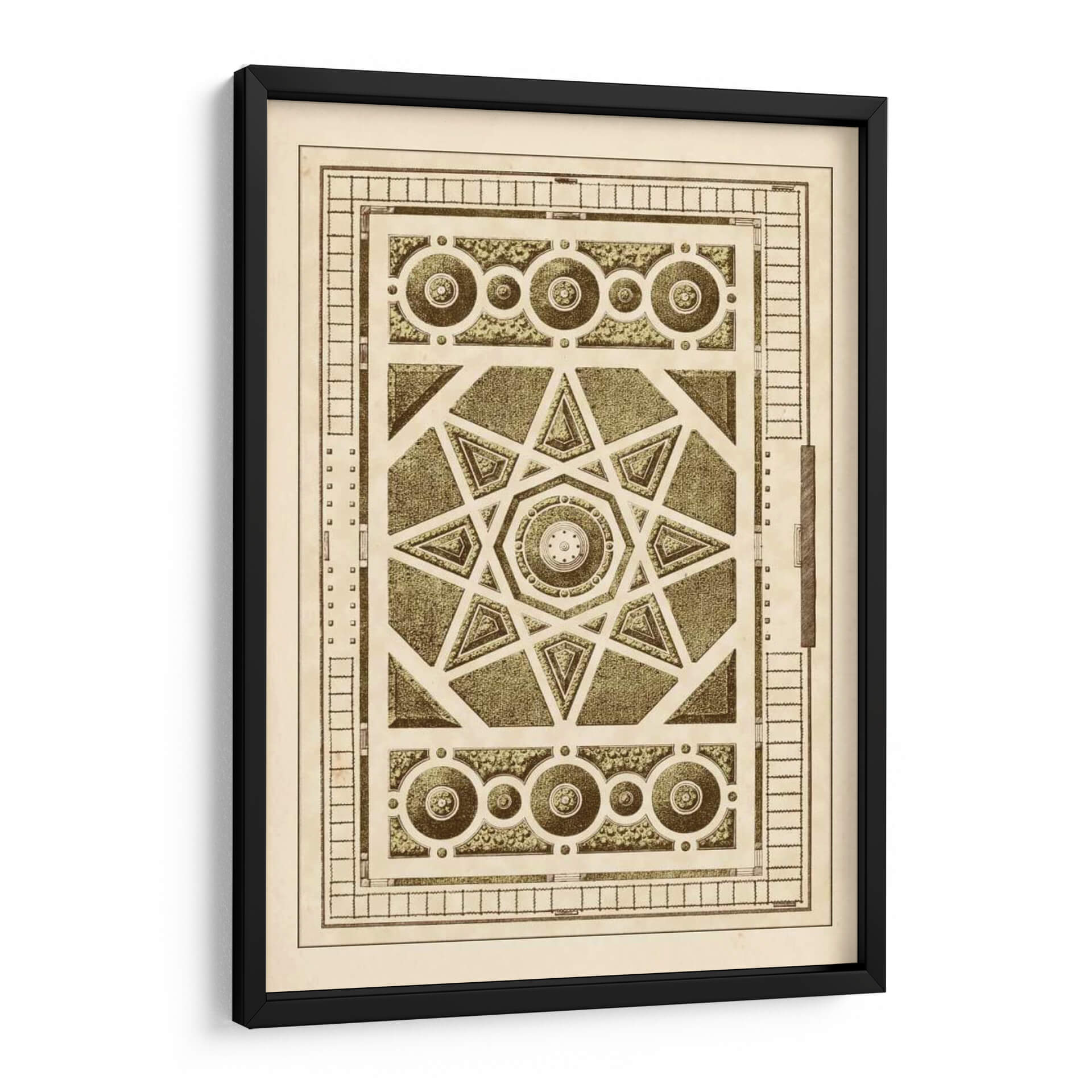 Sumérgete en la complejidad geométrica y la serenidad de 'Laberinto Del Jardín VI', una obra de arte que evoca la precisión y la belleza de los diseños de jardines clásicos. Este cuadro decorativo presenta un intrincado patrón central con una estrella de ocho puntas, rodeado por elementos circulares y rectangulares que recuerdan a los trazados de un jardín francés o un diseño arquitectónico detallado. La paleta de colores, dominada por tonos sepia, beige y verdes apagados, confiere a la pieza una atmósfera de nostalgia y sofisticación atemporal, perfecta para añadir un toque de refinamiento y orden visual a cualquier espacio. La composición simétrica y los detalles minuciosos invitan a la contemplación, transformando cualquier pared en un punto focal de elegancia y carácter. Ideal para salones, estudios o despachos que buscan una decoración con historia y una estética cuidada. Añade esta pieza única a tu colección y deja que su diseño detallado inspire tranquilidad y reflexión en tu hogar u oficina, creando un ambiente de calma y buen gusto.
