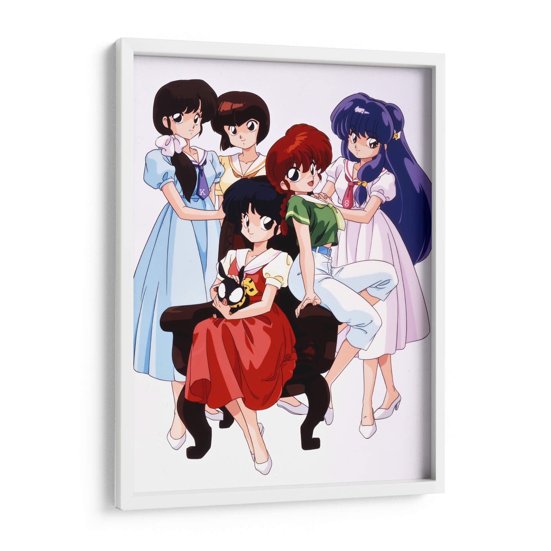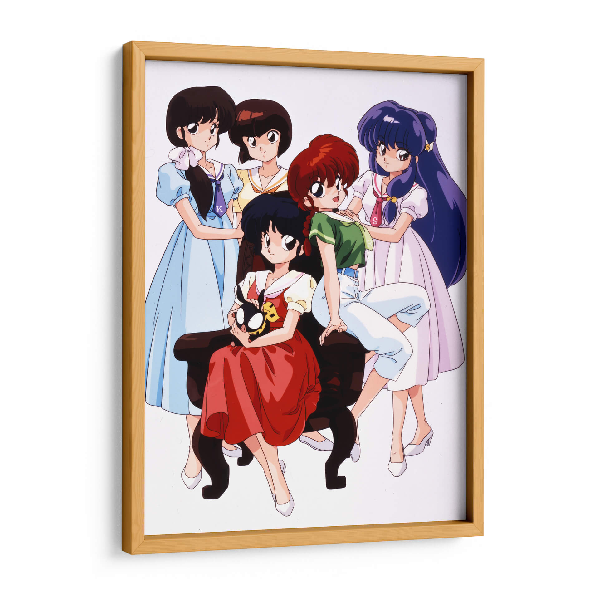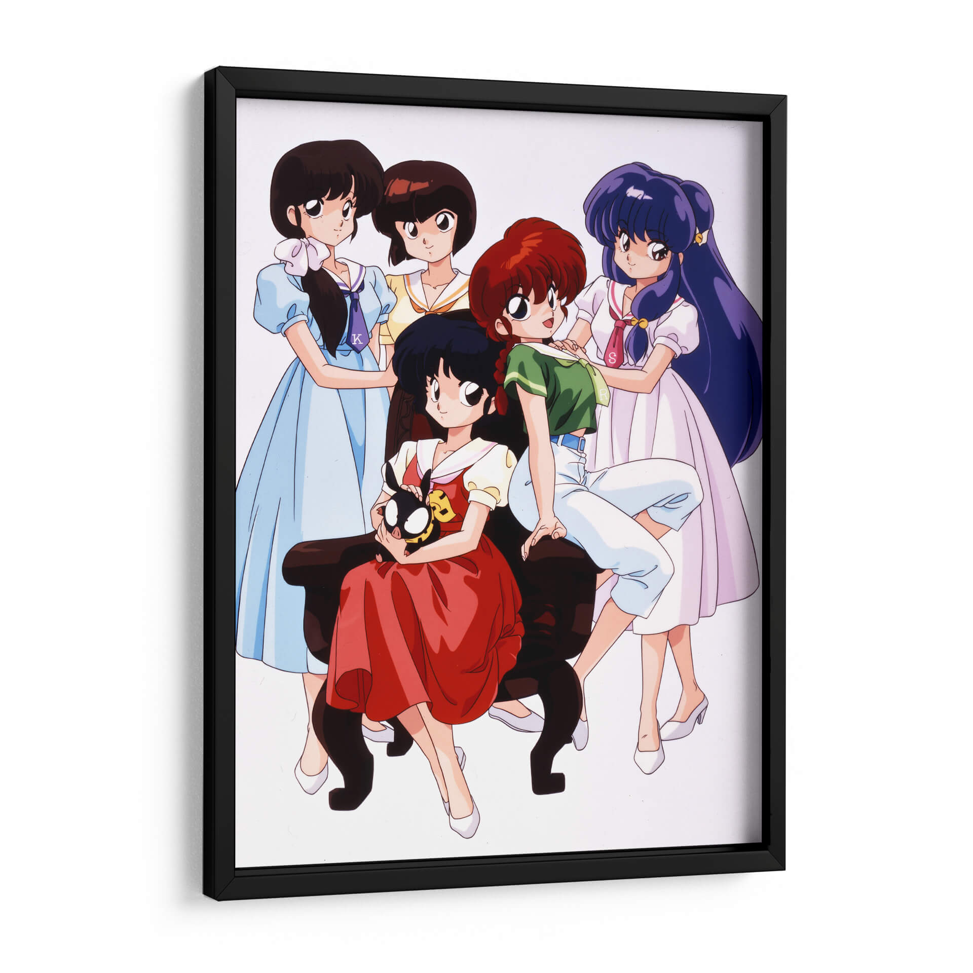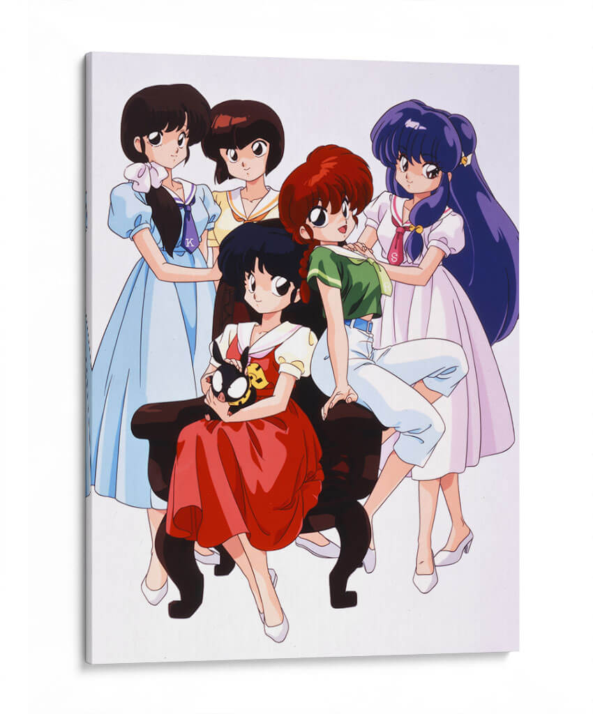 Este cautivador cuadro decorativo, titulado "Las Chicas de Ranma", presenta una vibrante y nostálgica reunión de personajes femeninos de estilo anime. La obra destaca por su paleta de colores vivos y alegres, dominada por tonos pastel como el azul cielo, rosa pálido y lavanda, contrastados con acentos en rojo y verde que aportan energía. Cinco figuras femeninas, cada una con un peinado y atuendo distintivo, son representadas en una composición dinámica y armoniosa. Algunas sentadas en un sillón oscuro y otras de pie, crean una escena que evoca camaradería y juventud. El estilo artístico se enmarca dentro del anime clásico, con grandes ojos expresivos, líneas limpias y una estética que apela a los amantes de la cultura pop japonesa. Este cuadro es ideal para añadir un toque de color y personalidad a cualquier habitación, desde un dormitorio juvenil hasta una sala de estar moderna o un espacio de trabajo creativo. Su atmósfera juguetona y llena de vida lo convierte en una pieza de conversación perfecta para quienes buscan decorar con arte que refleje sus pasiones.