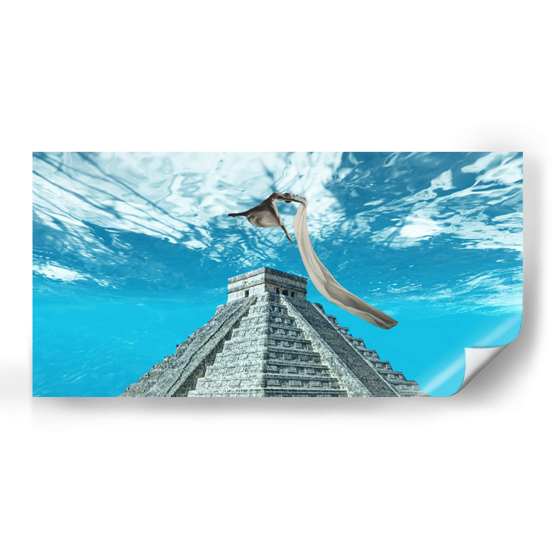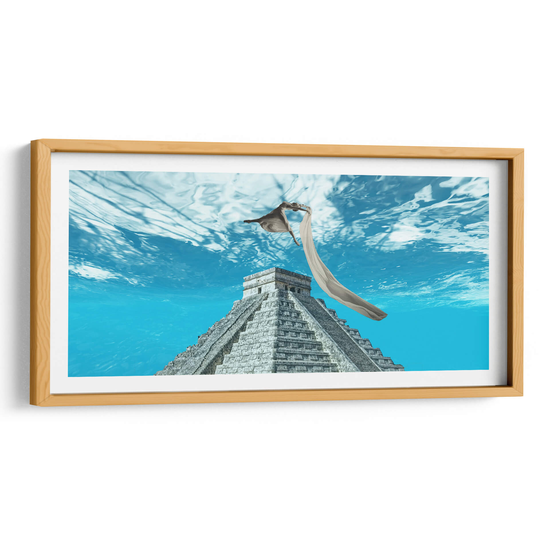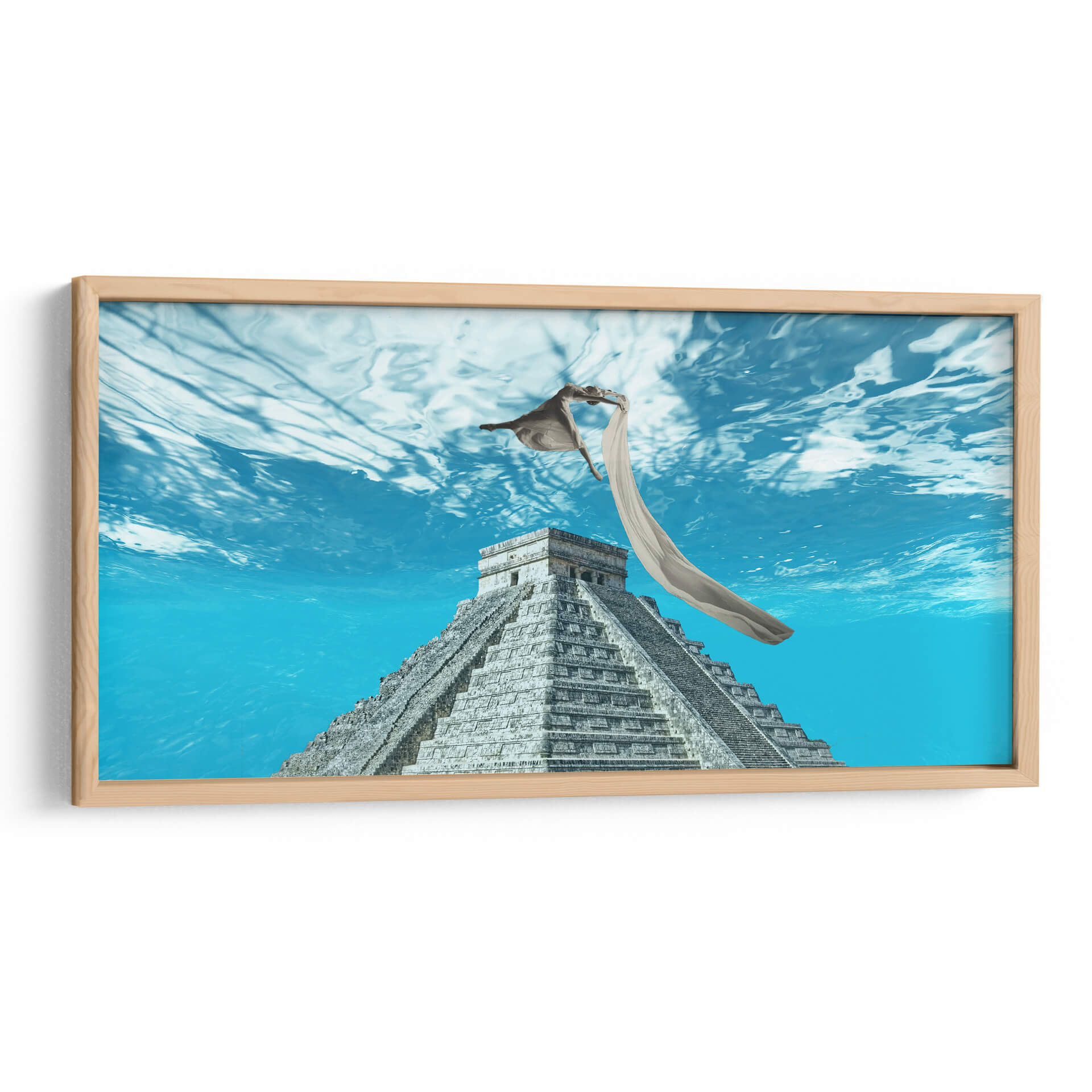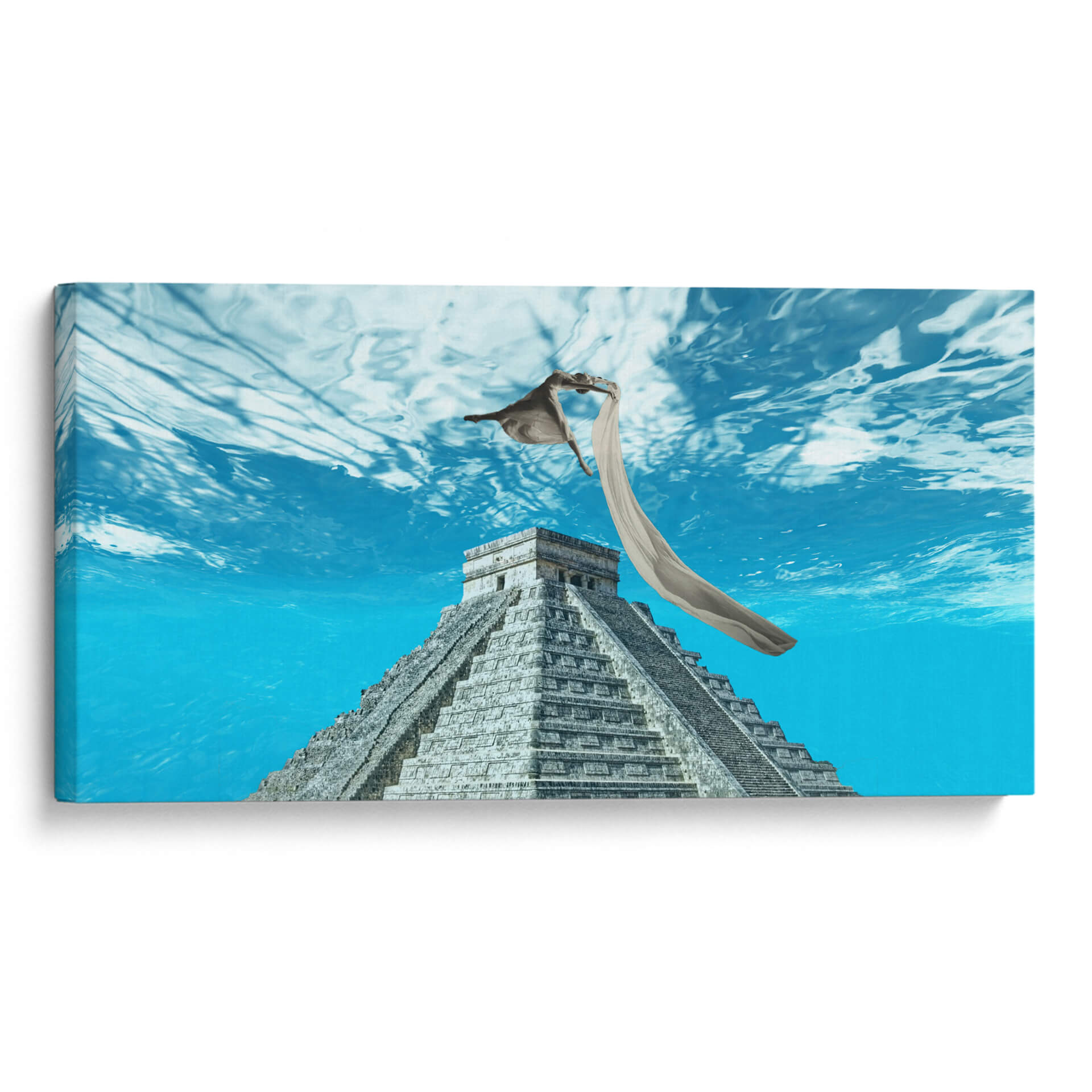 Sumérgete en la etérea obra de arte 'Libertad' de Danilo Guio R., una pieza que fusiona lo ancestral con lo onírico. La composición presenta la imponente estructura de una pirámide maya, evocando historia y misterio, sumergida en un vibrante mar azul que transmite una profunda sensación de serenidad y expansión. Sobre la pirámide, una figura humana se eleva con gracia, envuelta en una tela etérea que ondea con el movimiento del agua, simbolizando la trascendencia y la liberación. Los tonos azules predominantes crean una atmósfera de calma y contemplación, mientras que la textura detallada de la pirámide añade un contraste terrenal. Este cuadro decorativo es perfecto para añadir un toque de profundidad intelectual y espiritual a tu sala de estar, estudio u oficina. Su estilo único, que combina elementos históricos con una narrativa surrealista, lo convierte en un punto focal cautivador. Deja que 'Libertad' inspire conversaciones y eleve el espíritu de tu espacio, creando un ambiente de paz y descubrimiento.