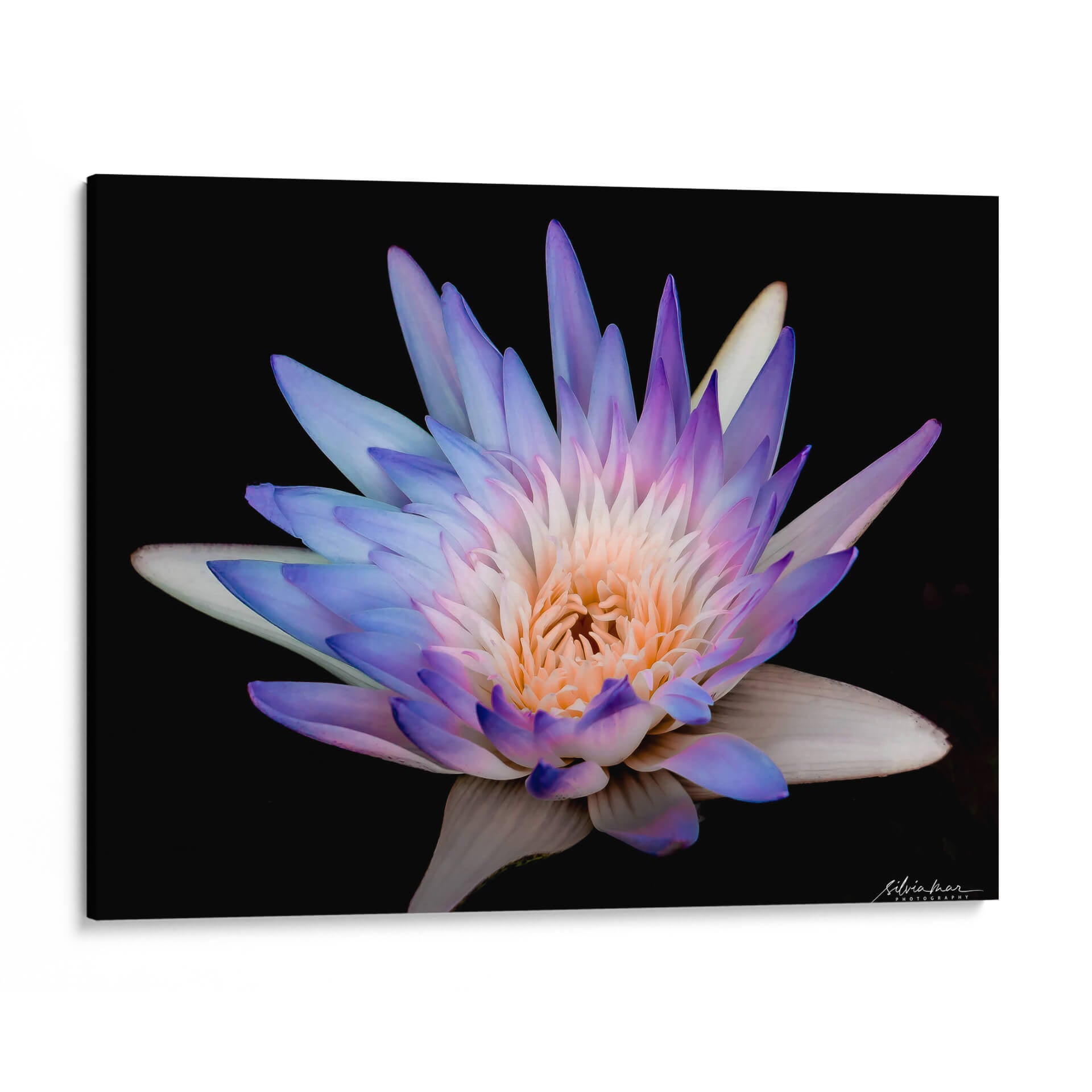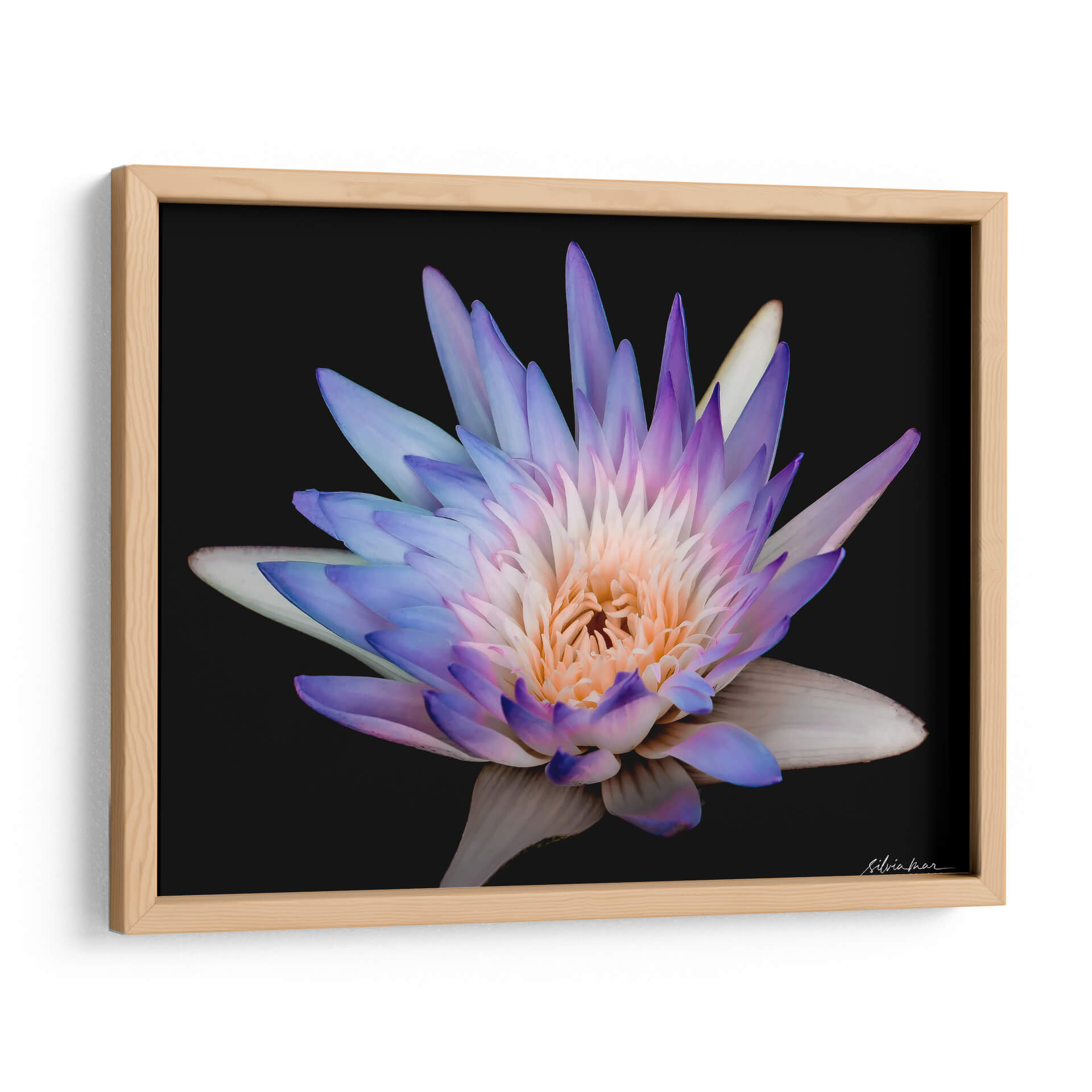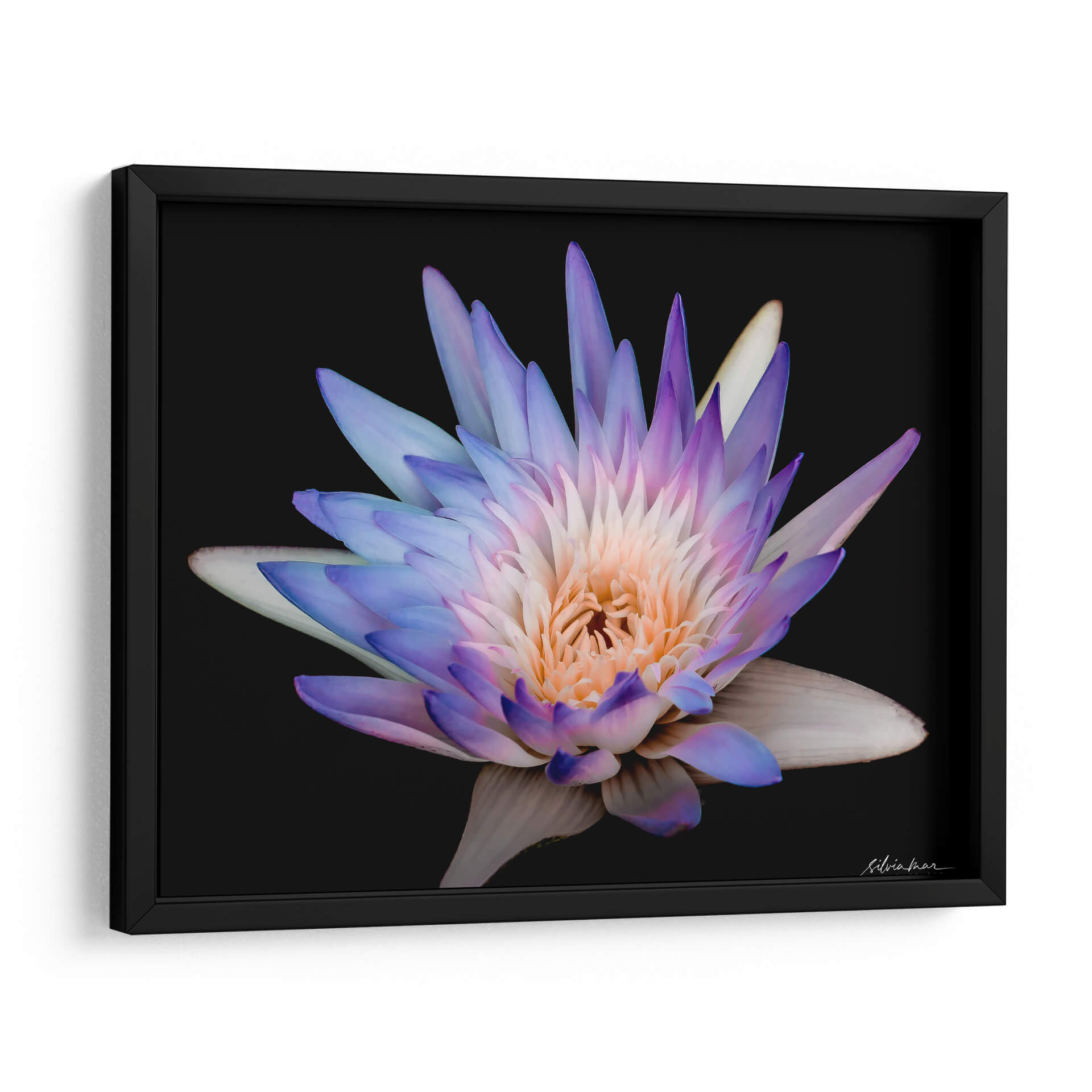 Sumérgete en la serenidad y la belleza etérea de nuestro cuadro decorativo "Lirio rosa y azul de Chicago", una obra maestra capturada por Silviamarphotography. Esta impresionante pieza presenta un lirio de agua en un primer plano cautivador, donde los delicados pétalos se despliegan en una sinfonía de colores. La paleta cromática transita desde suaves tonos de rosa y melocotón en el centro, hacia vibrantes azules y púrpuras en los bordes exteriores, creando un contraste fascinante con el profundo fondo negro. La composición, centrada y detallada, resalta la intrincada simetría y la delicadeza de la flor, invitando a la contemplación y a la calma. Este cuadro decorativo es ideal para añadir un toque de elegancia natural y sofisticación a cualquier espacio, ya sea en un dormitorio que busca tranquilidad, una sala de estar que anhela un punto focal natural, o una oficina que necesita una dosis de inspiración serena. Su estilo fotográfico y la calidad de la imagen la convierten en una adición perfecta para amantes de la botánica y el arte contemporáneo. Transforma tu hogar u oficina con esta pieza que evoca paz, belleza y la maravilla de la naturaleza.