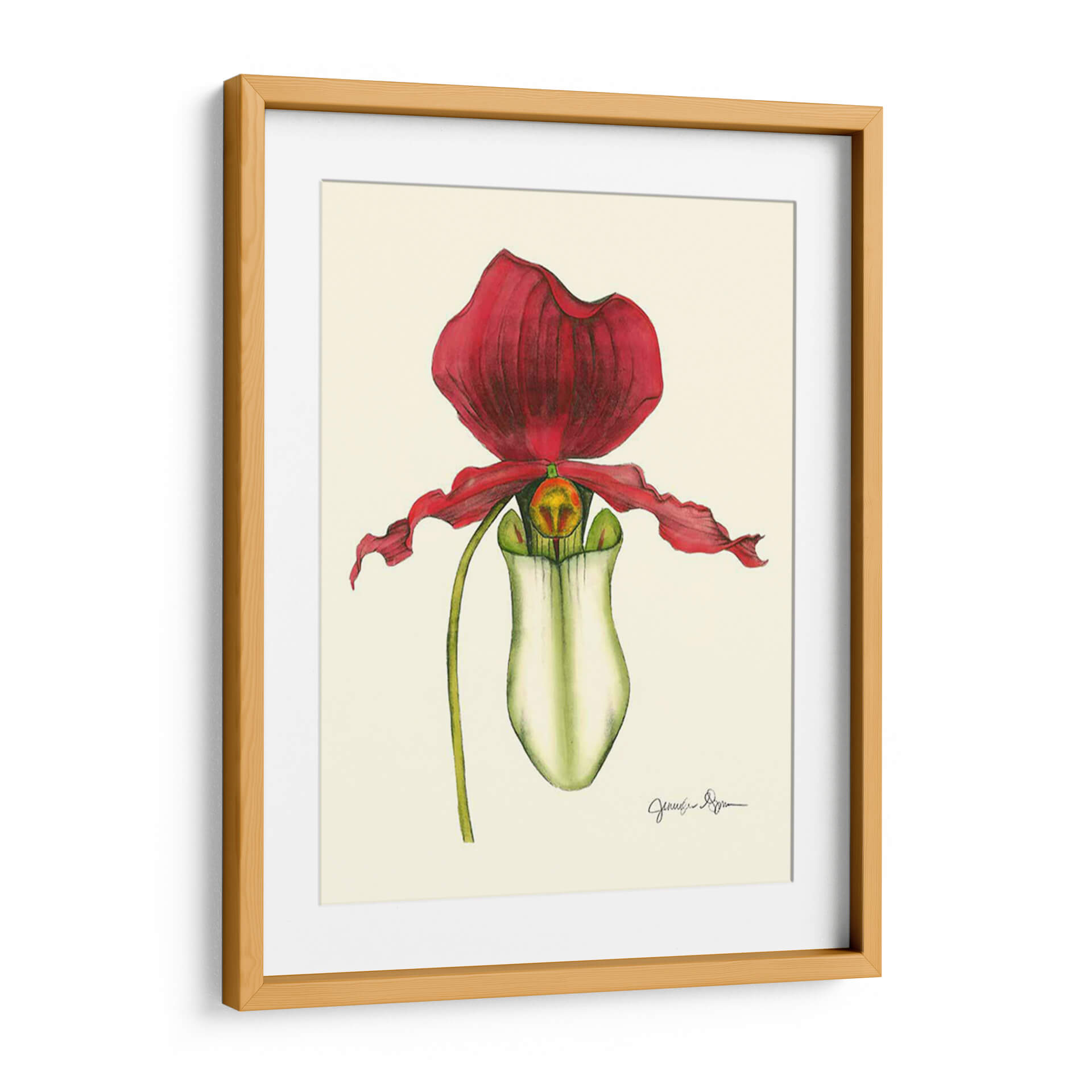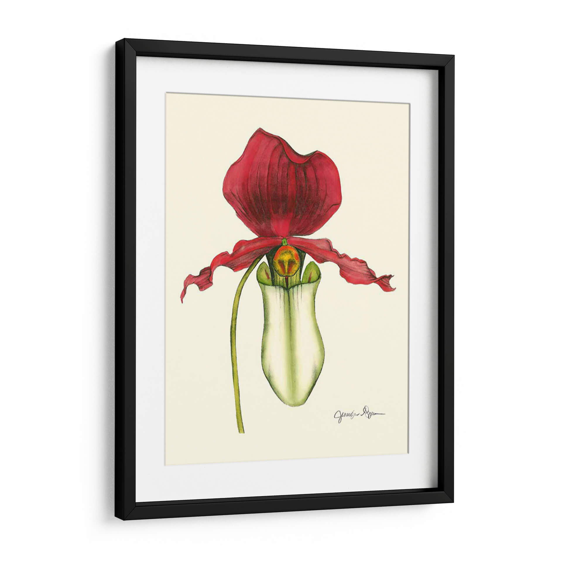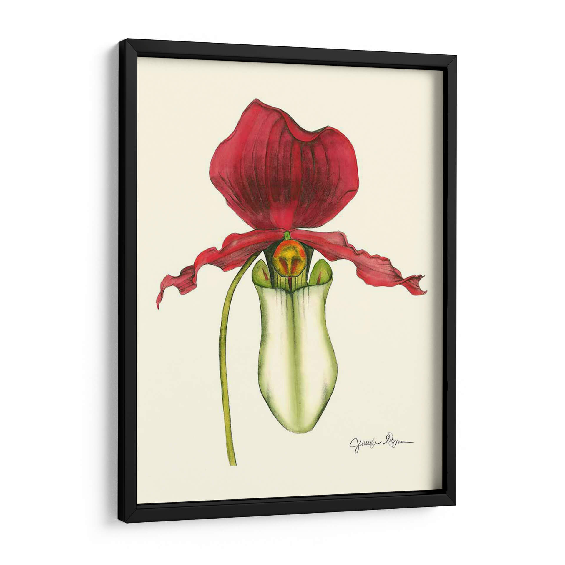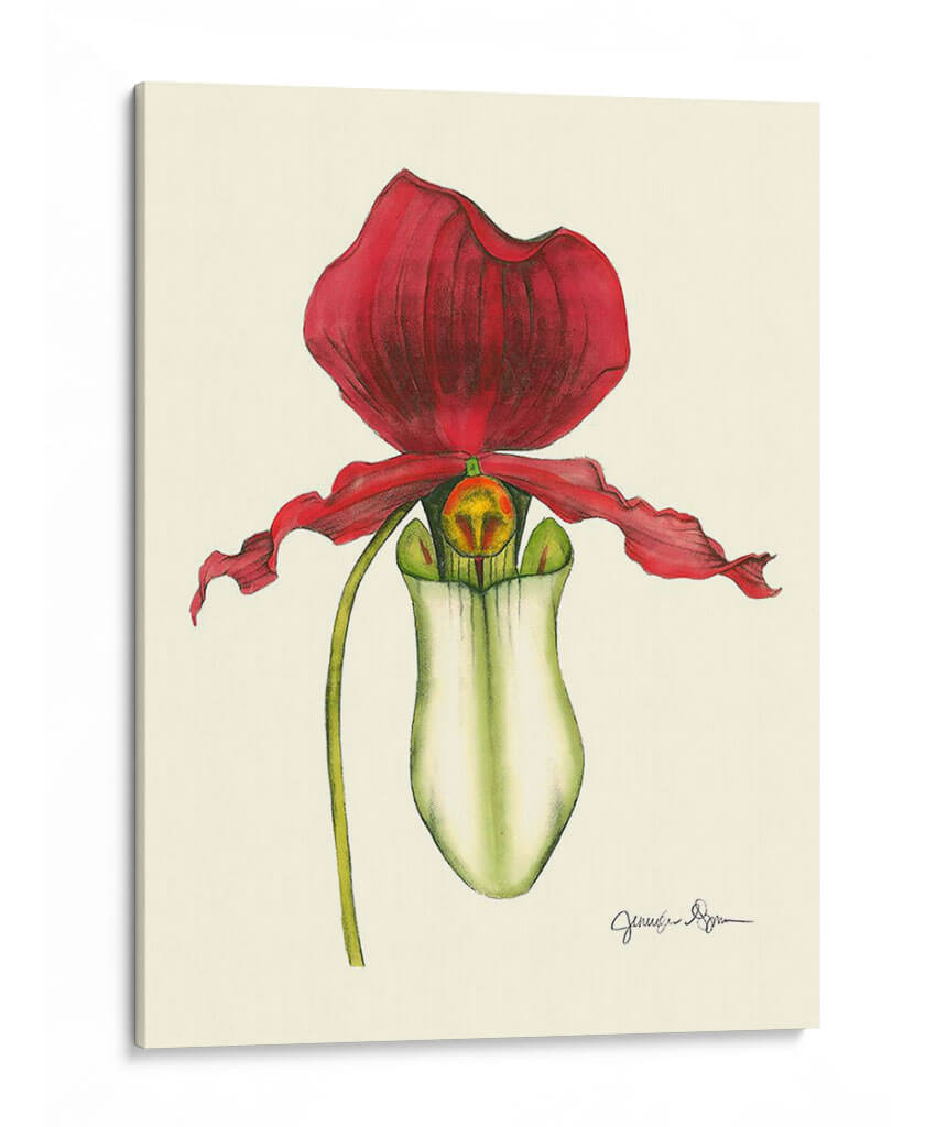 Añada un toque de elegancia natural a su hogar con este exquisito cuadro decorativo de "Majestuosa Orquídea Yo", una obra maestra de Jennifer Goldberger. Esta pieza captura la belleza intrincada y la forma seductora de una orquídea Paphiopedilum con un detalle botánico asombroso. Los vibrantes pétalos de color rojo carmesí contrastan maravillosamente con el blanco cremoso y los sutiles toques de verde y amarillo del labelo, creando una composición visualmente cautivadora. El fondo de tono neutro permite que la orquídea sea la protagonista indiscutible, resaltando su delicada estructura y su presencia casi escultórica. El estilo de la obra se inclina hacia el realismo botánico, ejecutado con una técnica que recuerda a las ilustraciones científicas clásicas, pero con una sensibilidad artística moderna. Esta pieza evoca una sensación de sofisticación, calma y admiración por la naturaleza. Es ideal para añadir un punto focal de color y textura a salones modernos, dormitorios serenos o estudios elegantes. Transforma cualquier espacio en una galería personal con la opulencia sutil de esta orquídea pintada.