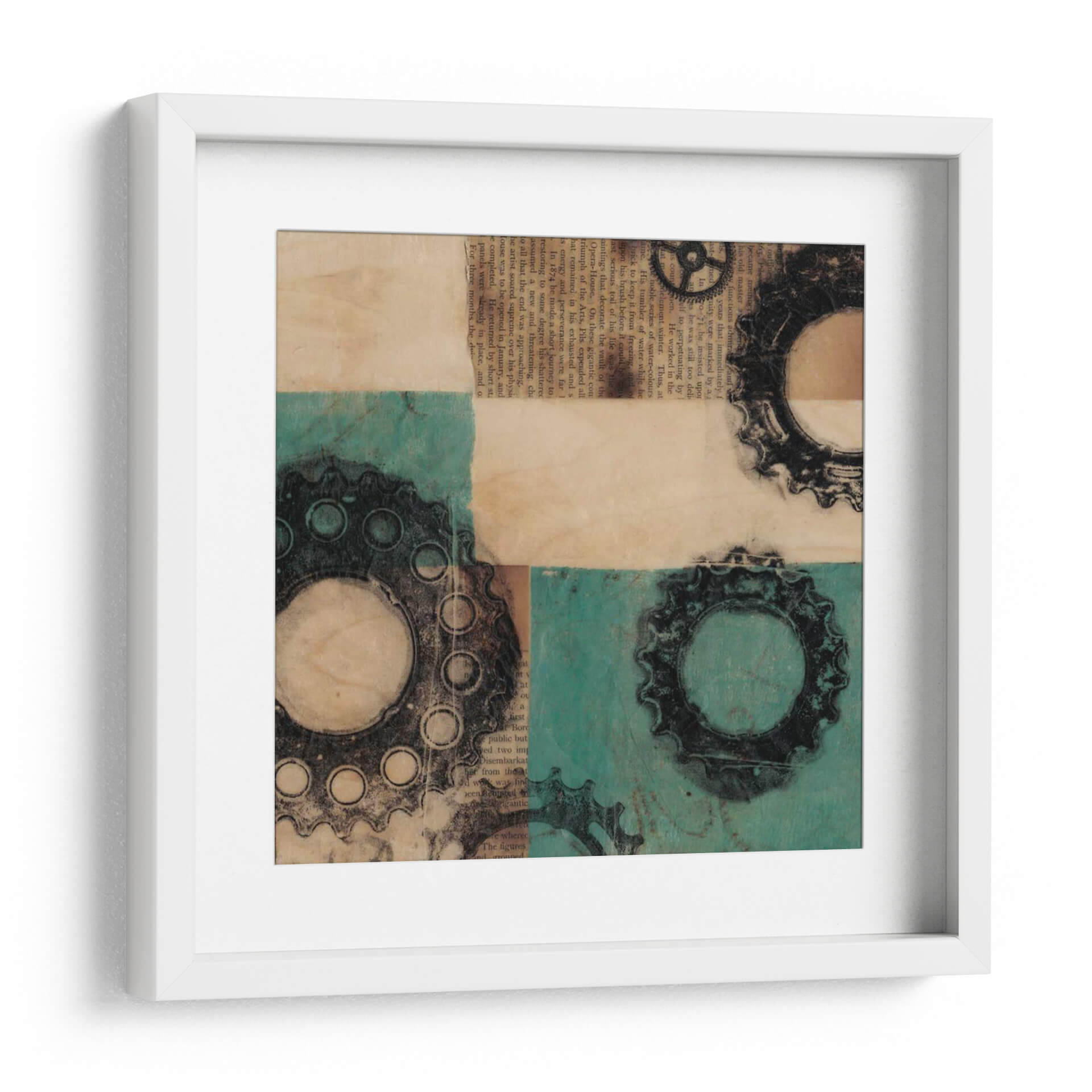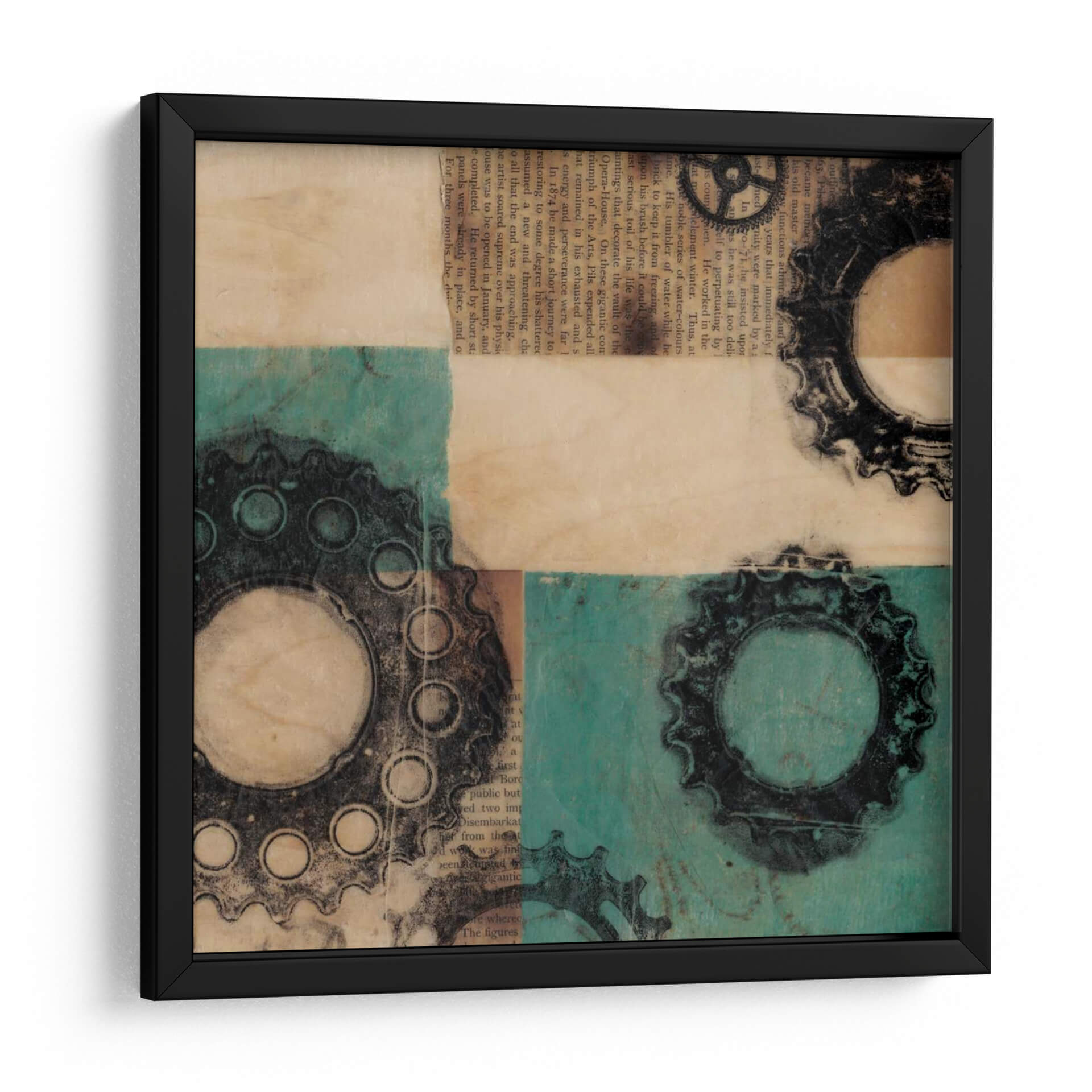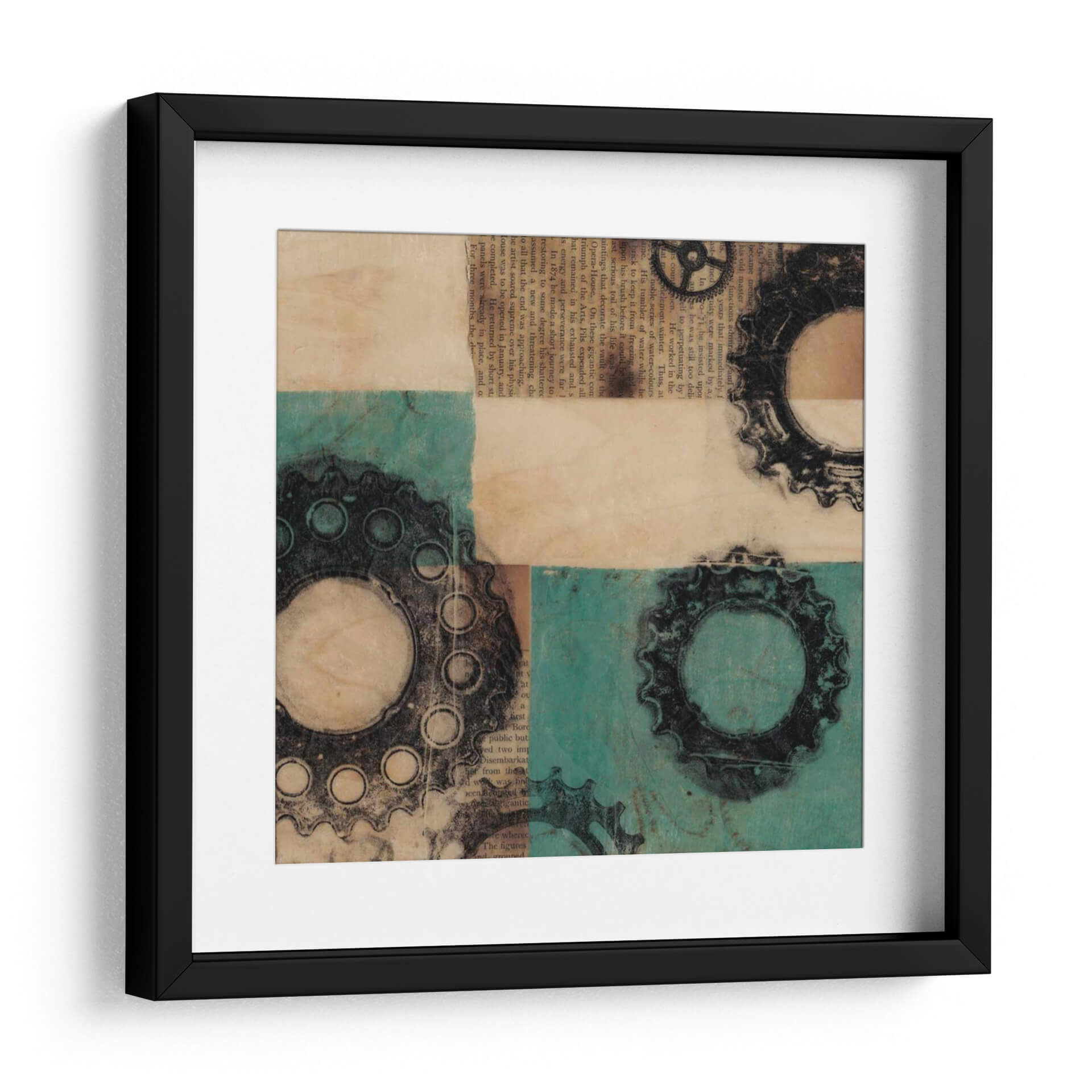 Adéntrate en el fascinante mundo de la ingeniería visual con "Maquinaria II", una obra de arte contemporáneo que fusiona elementos industriales y texturas orgánicas. Jennifer Goldberger nos presenta una composición dinámica que evoca la complejidad y la belleza de los mecanismos. Los engranajes, representados con un detallado trabajo gráfico en tonos oscuros, contrastan con un fondo texturizado que combina el cálido aspecto del papel envejecido con vibrantes bloques de color turquesa. La superposición de elementos y la paleta de colores crean una profundidad intrigante, invitando a la contemplación y a la reflexión sobre la interconexión de sistemas. Esta pieza es ideal para espacios que buscan un toque de carácter y sofisticación, como oficinas modernas, estudios creativos o salones con una estética industrial o ecléctica. "Maquinaria II" no es solo una decoración; es una declaración de estilo que añade una dimensión intelectual y visualmente estimulante a tu entorno, atrayendo la mirada y generando conversación.