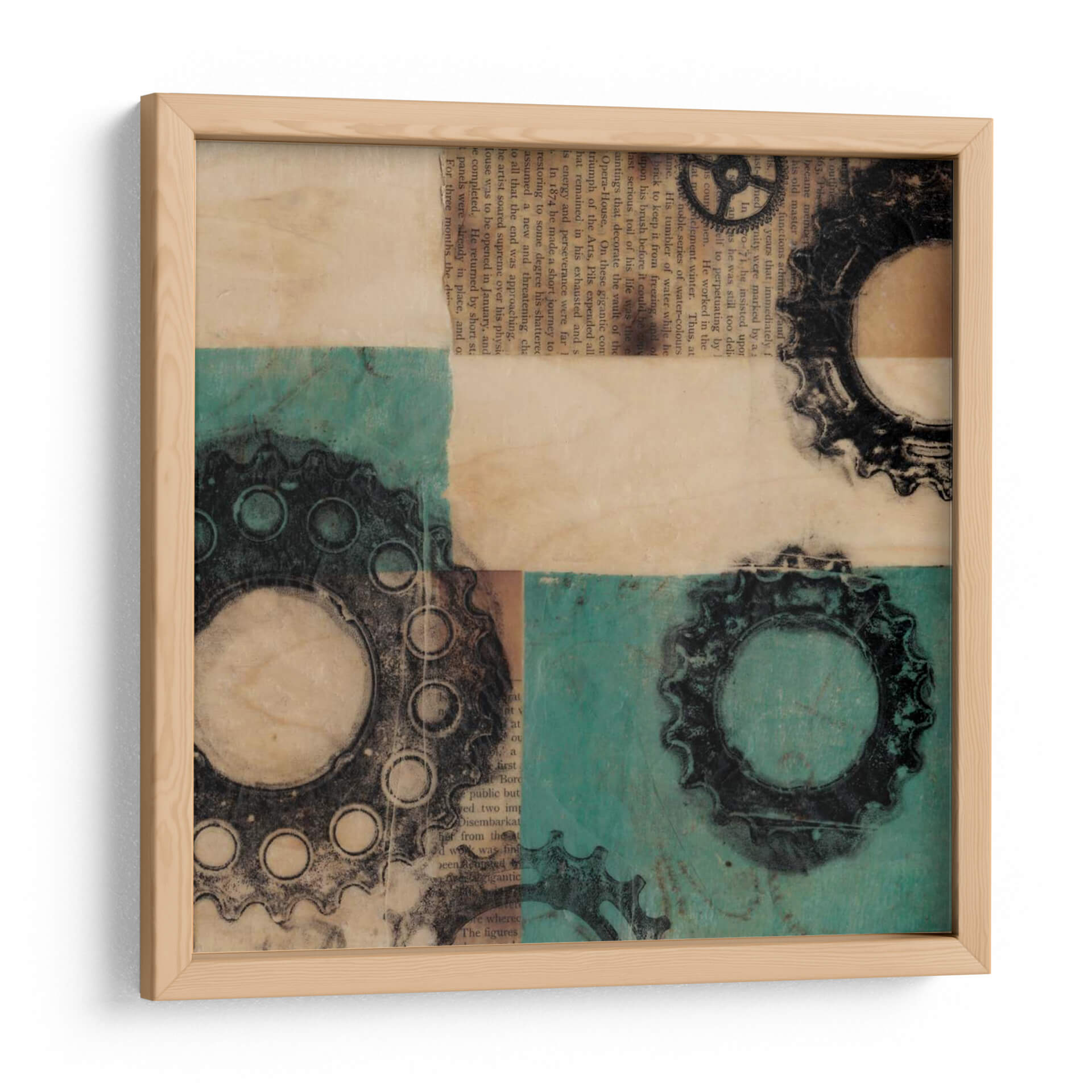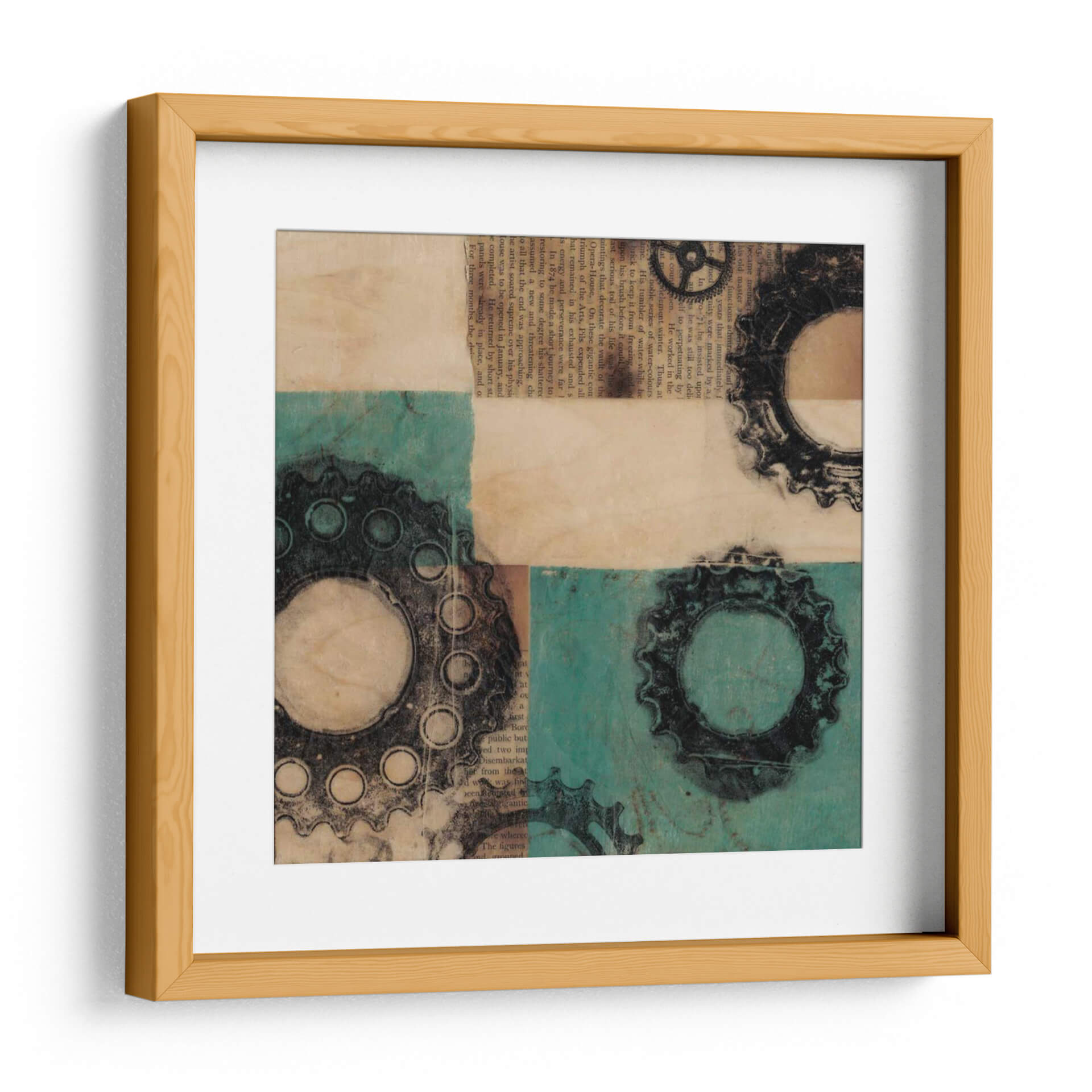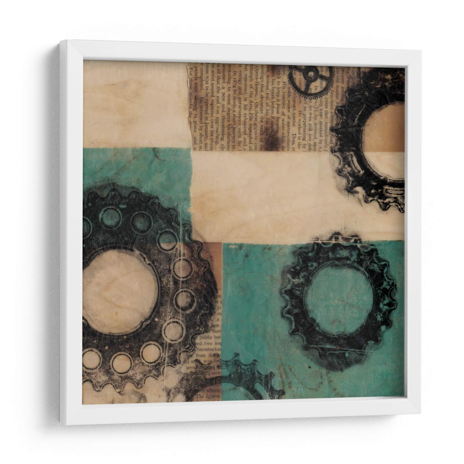 Adéntrate en el fascinante mundo de la ingeniería visual con "Maquinaria II", una obra de arte contemporáneo que fusiona elementos industriales y texturas orgánicas. Jennifer Goldberger nos presenta una composición dinámica que evoca la complejidad y la belleza de los mecanismos. Los engranajes, representados con un detallado trabajo gráfico en tonos oscuros, contrastan con un fondo texturizado que combina el cálido aspecto del papel envejecido con vibrantes bloques de color turquesa. La superposición de elementos y la paleta de colores crean una profundidad intrigante, invitando a la contemplación y a la reflexión sobre la interconexión de sistemas. Esta pieza es ideal para espacios que buscan un toque de carácter y sofisticación, como oficinas modernas, estudios creativos o salones con una estética industrial o ecléctica. "Maquinaria II" no es solo una decoración; es una declaración de estilo que añade una dimensión intelectual y visualmente estimulante a tu entorno, atrayendo la mirada y generando conversación.
