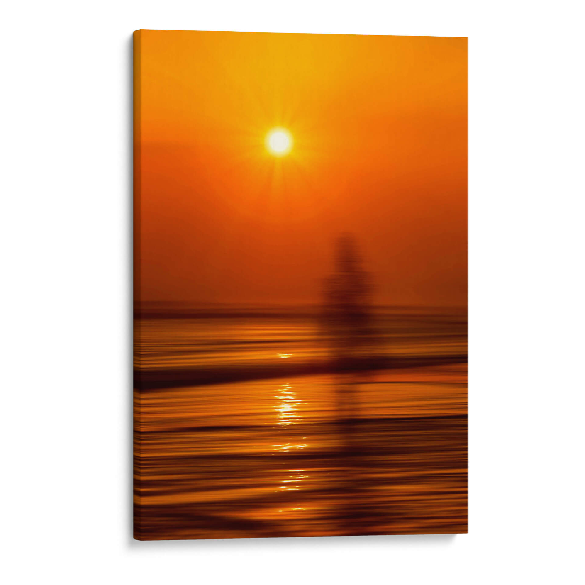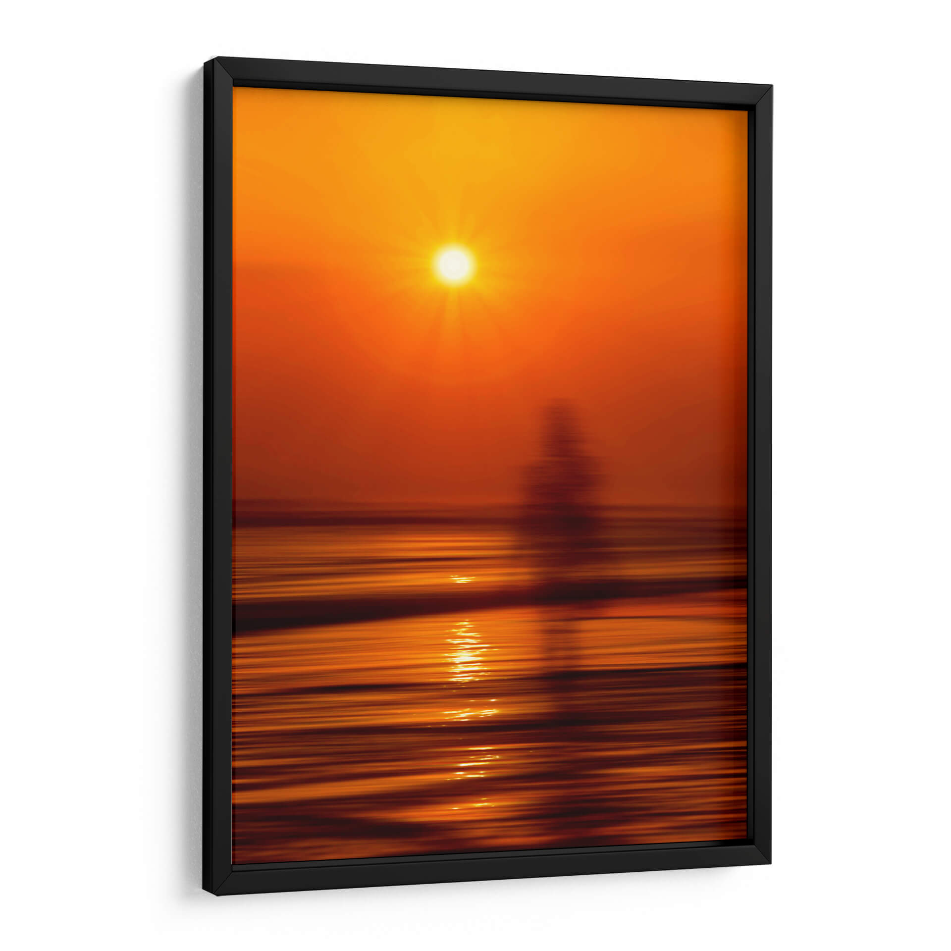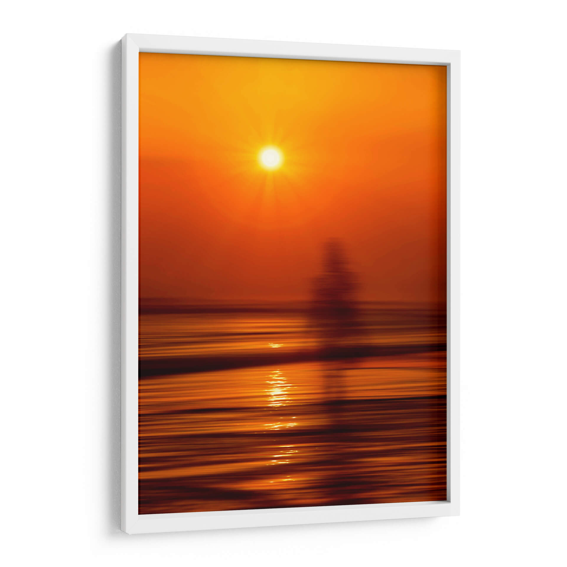 Sumérgete en la atmósfera hipnótica de "Mar de Espejismos", una obra de arte contemporáneo que captura la esencia etérea de un atardecer junto al mar. Los vibrantes tonos anaranjados y dorados se fusionan en un gradiente cálido, dominado por el resplandor del sol que se refleja en las aguas tranquilas. Una figura sombreada, apenas discernible, se adentra en el paisaje, evocando una sensación de introspección y misterio. La técnica pictórica, con sus líneas horizontales fluidas y la suave difuminación, crea una ilusión de movimiento y profundidad, transportando al espectador a un momento de serena contemplación. Este cuadro decorativo es ideal para infundir calidez y un toque de ensoñación a tu salón, dormitorio o cualquier espacio que busque transmitir paz y una conexión profunda con la naturaleza. Su estilo abstracto y su paleta de colores cálidos lo convierten en una pieza versátil, capaz de complementar tanto decoraciones modernas como rústicas, añadiendo un punto focal cautivador que invita a la reflexión. Deja que "Mar de Espejismos" sea tu ventana a un mundo de serenidad y belleza efímera.
