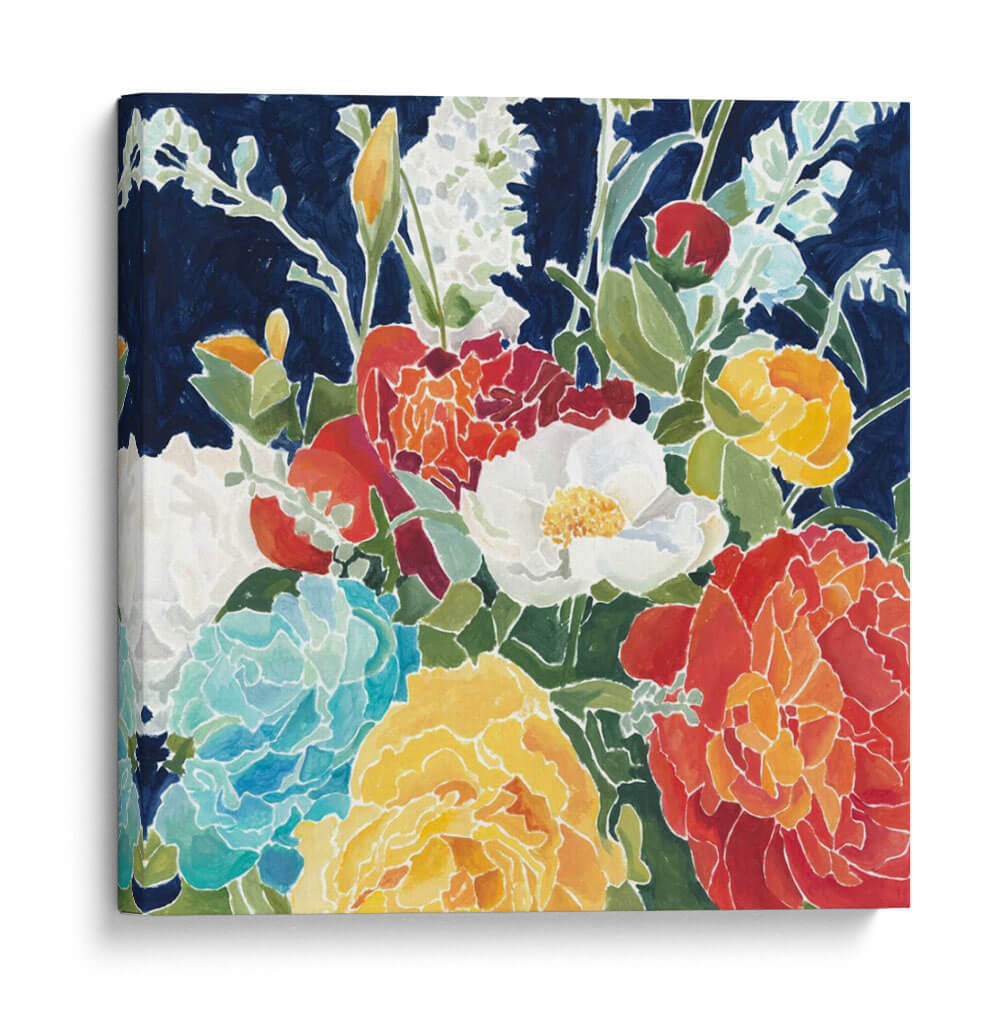 Sumérgete en la vibrante serenidad de "Medianoche Florals I", una obra de arte cautivadora de Megan Meagher. Este cuadro decorativo presenta un exuberante arreglo floral que estalla en colores sobre un profundo fondo azul medianoche. Las flores, representadas con trazos audaces y expresivos, evocan una sensación de vitalidad y alegría, mientras que los tonos contrastantes de blanco, rojo, naranja, amarillo y azul turquesa añaden profundidad y dinamismo a la composición. El estilo artístico, que combina elementos figurativos con una pincelada suelta y contemporánea, crea una pieza que es a la vez clásica y moderna. "Medianoche Florals I" es ideal para infundir energía y un toque de sofisticación natural en cualquier espacio, desde una sala de estar luminosa hasta un sereno dormitorio o un inspirador estudio. Transforma tu hogar u oficina con la belleza atemporal de las flores, capturada en una explosión de color y emoción.