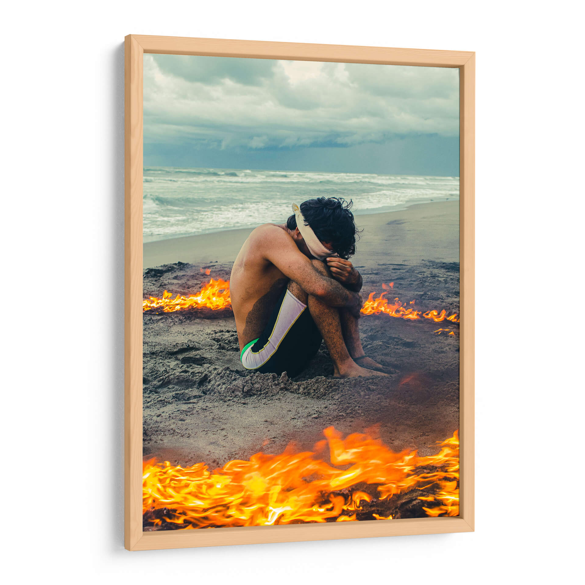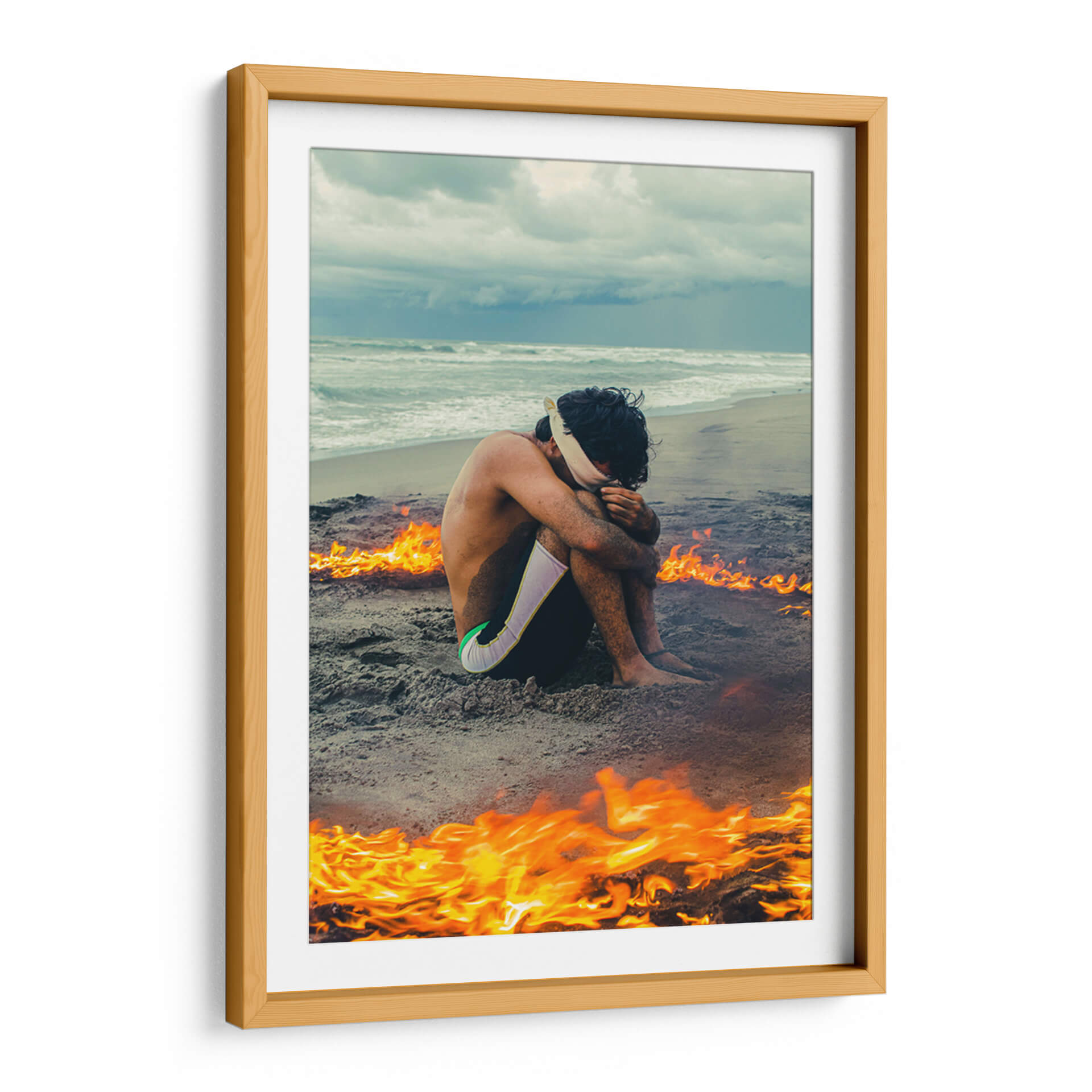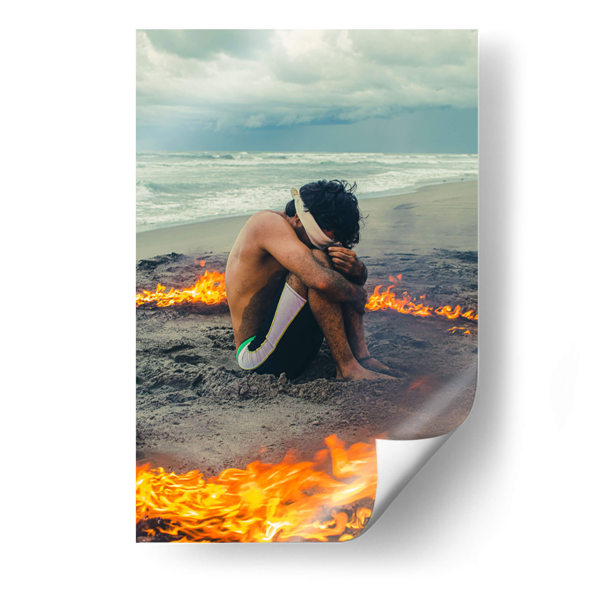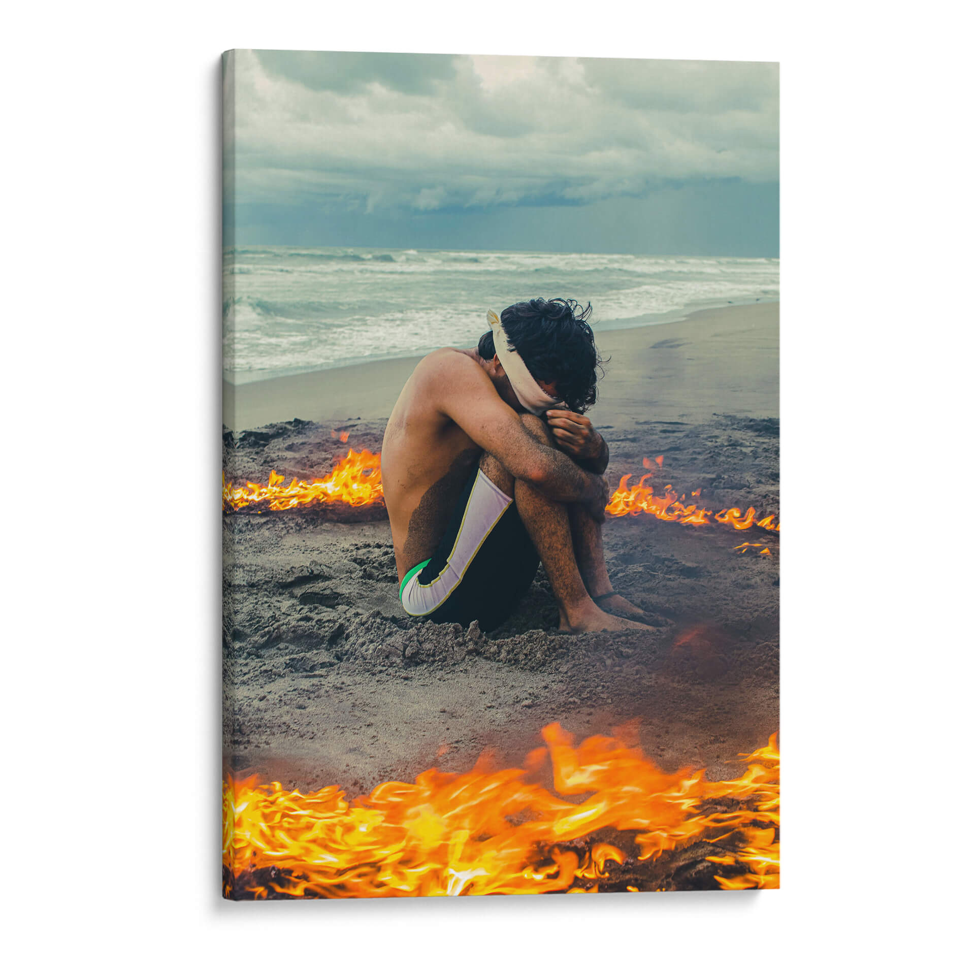 Sumérgete en la cruda y poderosa expresión del cuadro decorativo "Miedo" del artista El Mugiwaraa. Esta obra captura un momento íntimo y visceral de vulnerabilidad humana, con una figura solitaria acurrucada en la arena de una playa desolada, rodeada por un círculo de llamas intensas. La paleta de colores, dominada por tonos fríos del cielo y el mar, contrasta dramáticamente con el fuego ardiente, creando una atmósfera de conflicto interno y lucha. La composición, centrada en la figura encogida, evoca una profunda introspección y la sensación de estar atrapado en un tormento personal. Este cuadro decorativo es ideal para aquellos que buscan añadir una pieza de arte que invite a la reflexión y genere conversación en espacios como estudios, salas de estar o incluso oficinas, aportando un toque de intensidad emocional y profundidad artística. La representación del miedo no es solo visual, sino que se siente a través de la tensión en la pose de la figura y el entorno simbólico, convirtiéndola en una adición impactante a cualquier colección de arte contemporáneo.