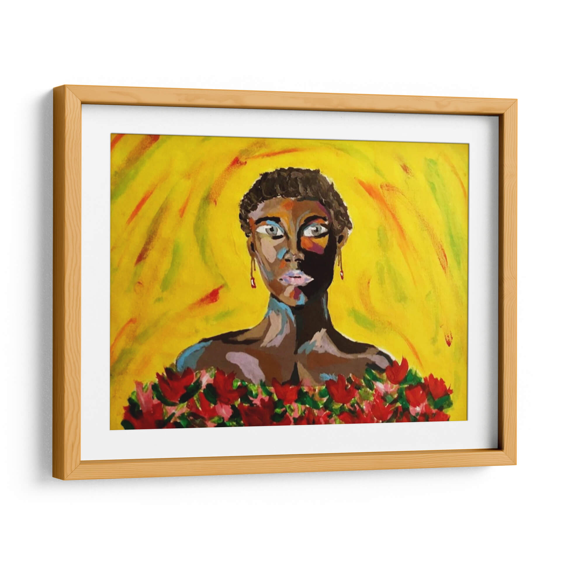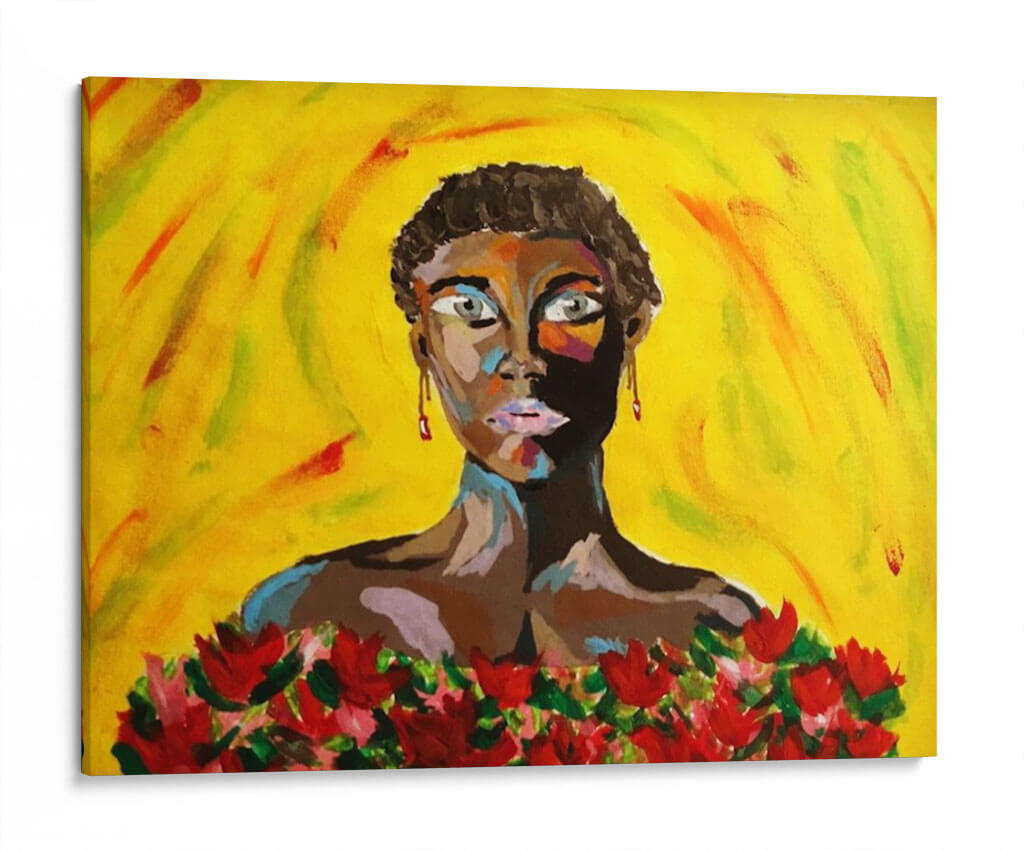 Este cautivador cuadro decorativo de "Mujer con flores" de Jimena Escobedo es una explosión de color y vida que transformará cualquier espacio. La obra presenta un retrato vibrante de una mujer con una mirada penetrante, enmarcada por un fondo abstracto de tonos amarillos intensos con pinceladas en rojo y verde que sugieren movimiento y energía. La artista ha utilizado una paleta audaz y expresiva, resaltando los contornos del rostro con contrastes de sombra y luz que le otorgan profundidad y carácter. La parte inferior de la obra se adorna con un exuberante arreglo de flores rojas, que añaden un toque de feminidad y vitalidad. El estilo artístico, que combina elementos figurativos con toques abstractos, crea una pieza dinámica y moderna, ideal para añadir un punto focal de interés en salas de estar, comedores o estudios. Este cuadro decorativo no solo embellece, sino que también evoca sentimientos de fuerza, belleza y la conexión con la naturaleza. Perfecto para quienes buscan arte contemporáneo que inspire y dialogue con su entorno, aportando personalidad y un toque de sofisticación.