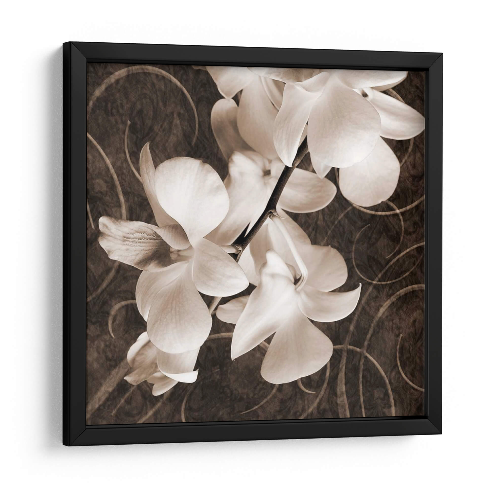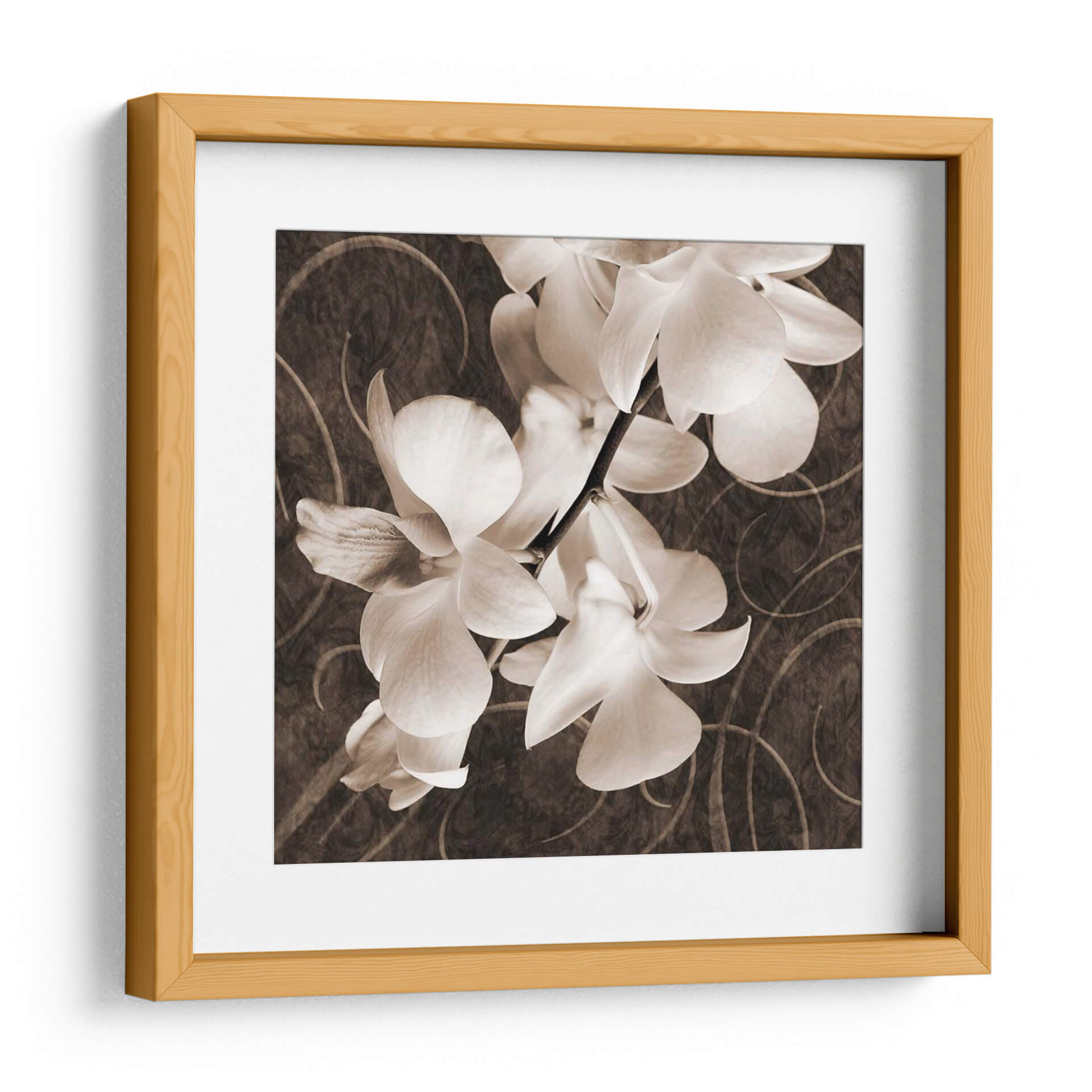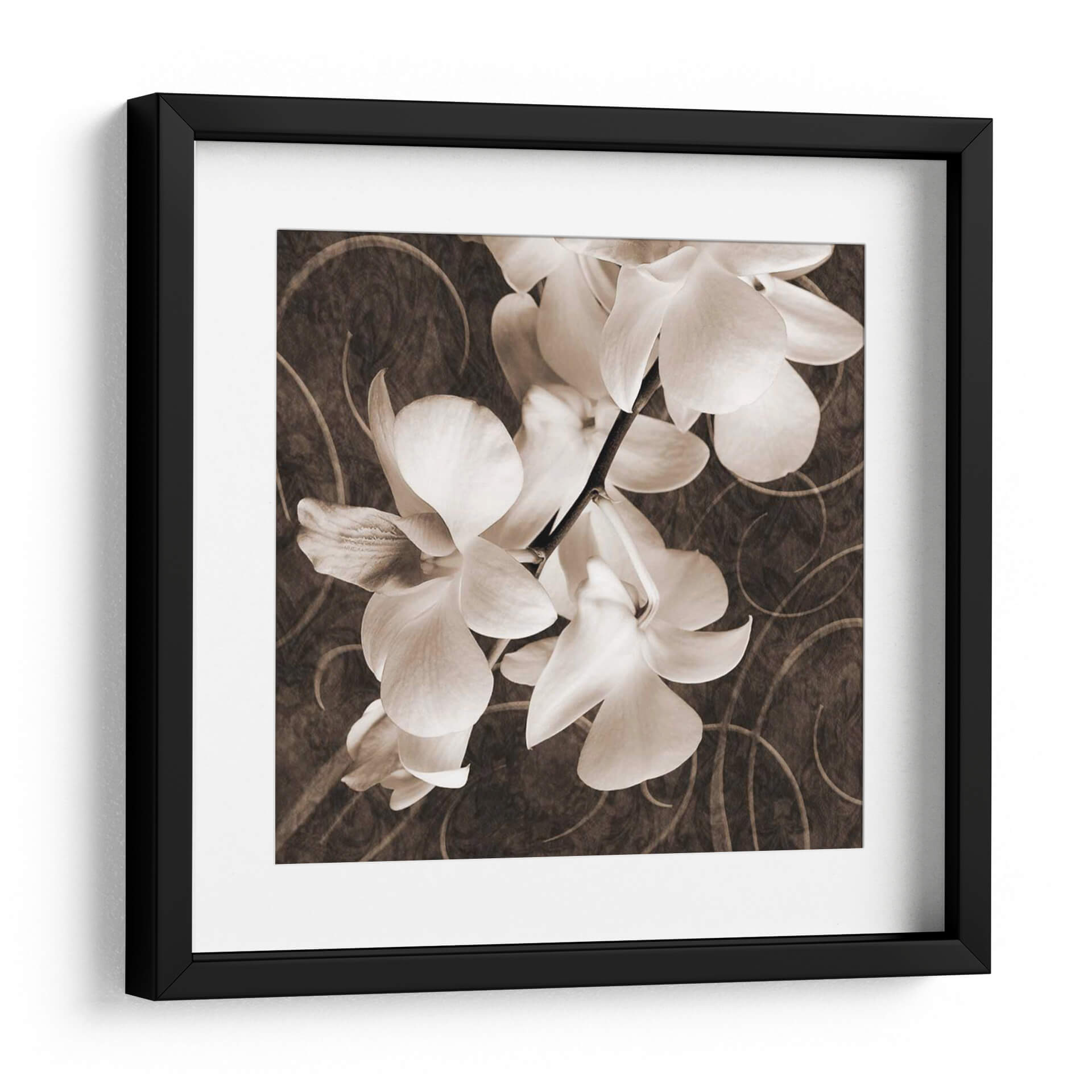 Sumérgete en la delicadeza y elegancia de 'Orquídea Y Remolinos I', una obra de Christine Zalewski que captura la esencia etérea de estas flores exóticas. Este cuadro decorativo presenta un primer plano de orquídeas en tonos sepia, con sus pétalos blancos y sedosos desplegándose con gracia sobre un fondo texturizado y adornado con remolinos sutiles. La paleta de colores cálidos y apagados crea una atmósfera de serenidad y sofisticación, perfecta para cualquier espacio que busque un toque de calma y belleza natural. La composición, centrada en la forma intrincada de las flores y el contraste con los patrones decorativos, invita a la contemplación y añade profundidad visual. Ideal para dormitorios, salones o estudios que deseen una pieza artística que combine lo orgánico con un diseño abstracto, este cuadro transformará tu ambiente en un santuario de paz y estilo. Añade esta pieza atemporal a tu colección y deja que su belleza natural enriquezca tu hogar.