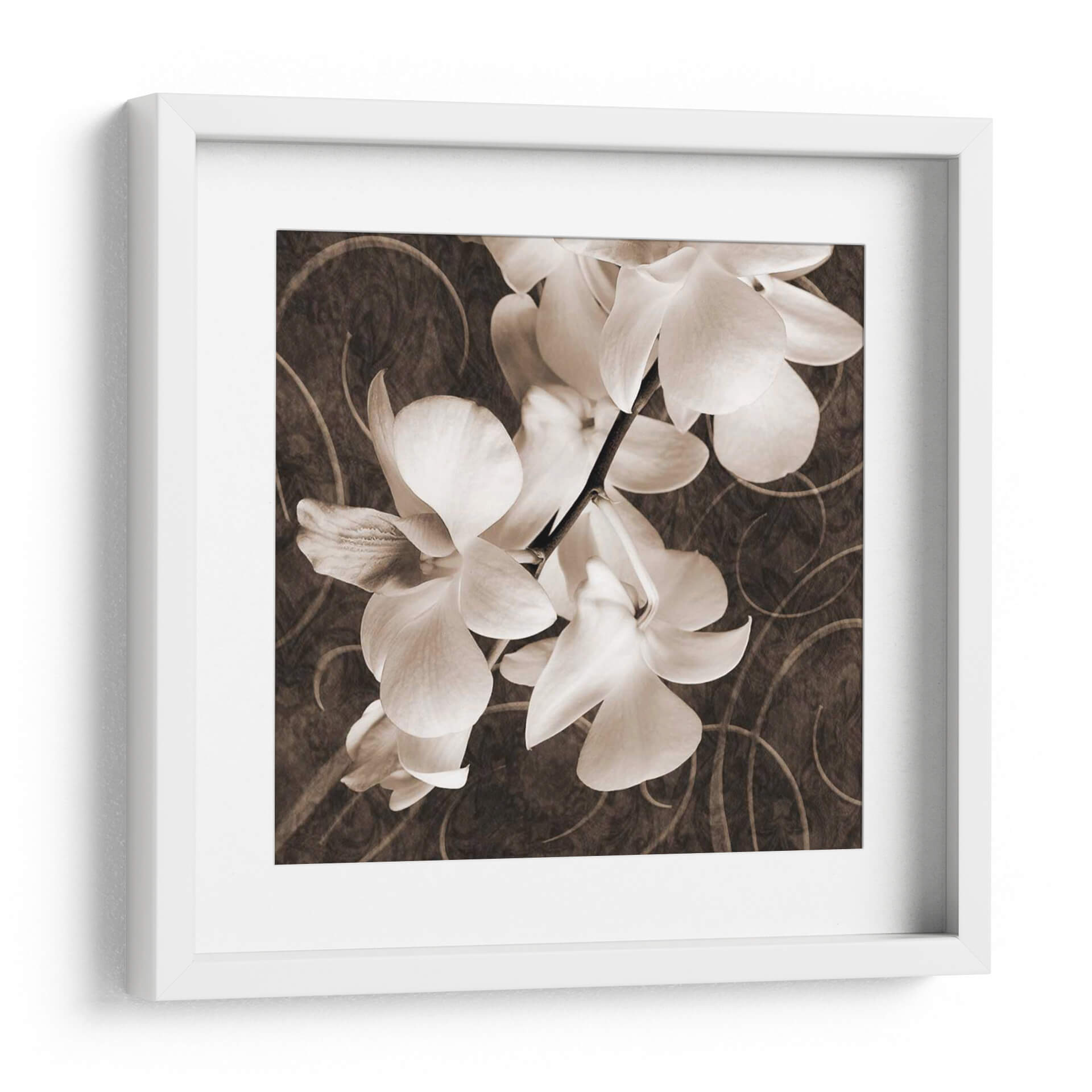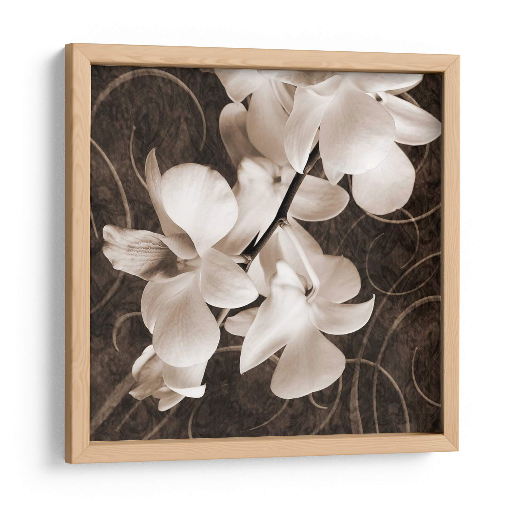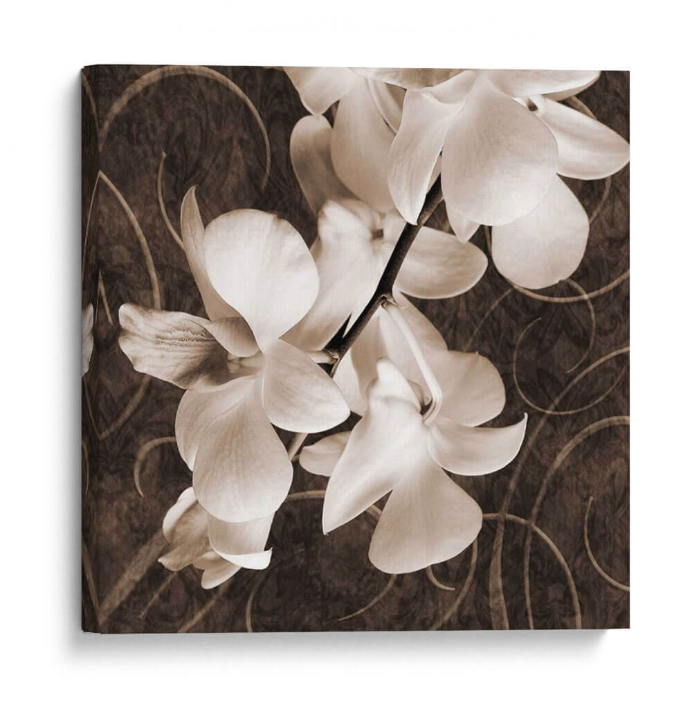 Sumérgete en la delicadeza y elegancia de 'Orquídea Y Remolinos I', una obra de Christine Zalewski que captura la esencia etérea de estas flores exóticas. Este cuadro decorativo presenta un primer plano de orquídeas en tonos sepia, con sus pétalos blancos y sedosos desplegándose con gracia sobre un fondo texturizado y adornado con remolinos sutiles. La paleta de colores cálidos y apagados crea una atmósfera de serenidad y sofisticación, perfecta para cualquier espacio que busque un toque de calma y belleza natural. La composición, centrada en la forma intrincada de las flores y el contraste con los patrones decorativos, invita a la contemplación y añade profundidad visual. Ideal para dormitorios, salones o estudios que deseen una pieza artística que combine lo orgánico con un diseño abstracto, este cuadro transformará tu ambiente en un santuario de paz y estilo. Añade esta pieza atemporal a tu colección y deja que su belleza natural enriquezca tu hogar.