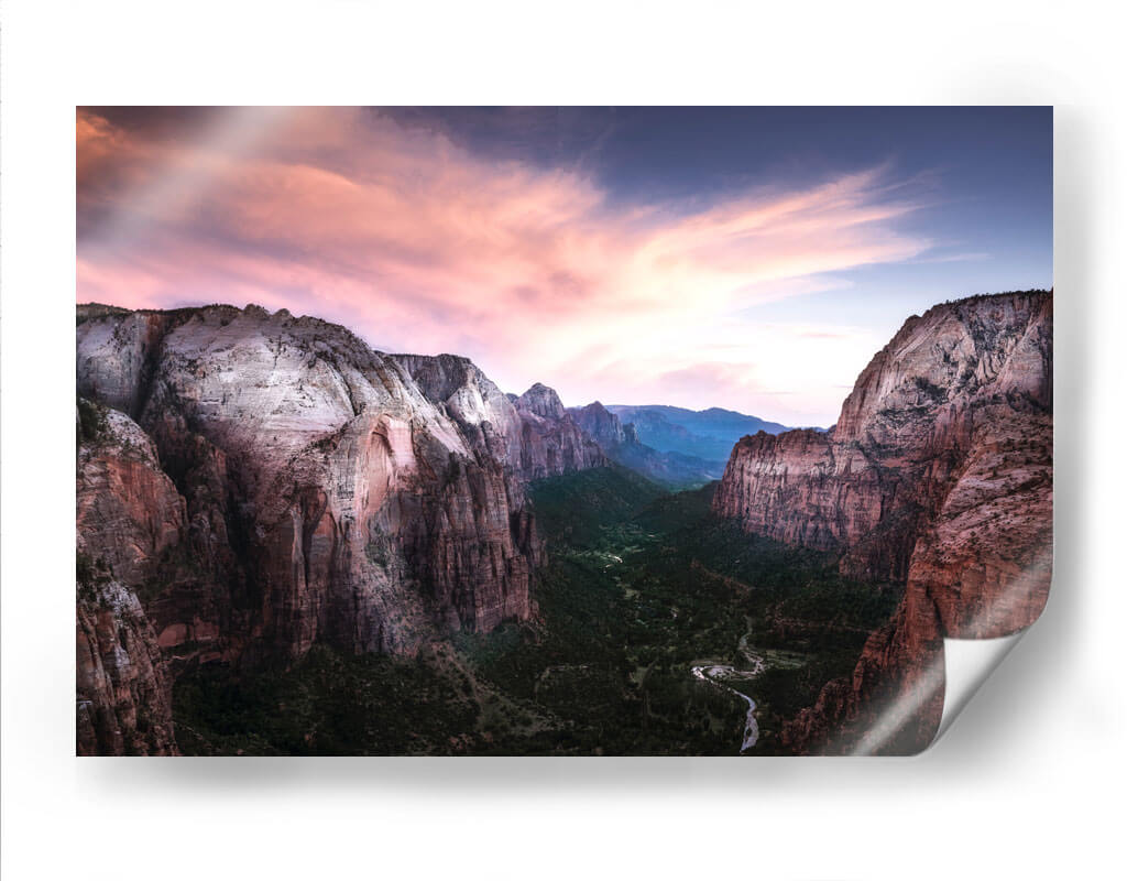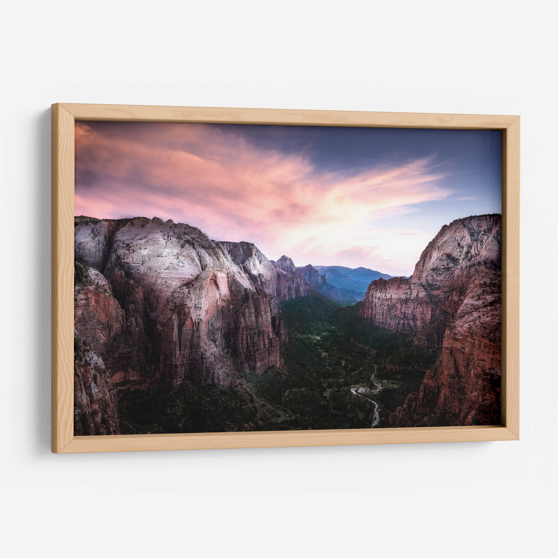Captura la majestuosidad de la naturaleza con este impresionante cuadro decorativo del Parque Nacional Zion. La obra maestra presenta imponentes formaciones rocosas de tonos rojizos y ocres, bañadas por la luz dorada del atardecer. Un río sinuoso serpentea a través de un valle verde exuberante, creando un contraste vibrante con la aridez de las montañas. El cielo, pintado con delicados matices de rosa, naranja y púrpura, añade una atmósfera de serenidad y asombro. Este cuadro es ideal para aquellos que buscan infundir a su hogar u oficina una sensación de aventura y conexión con la tierra. Su composición panorámica y la riqueza de sus colores lo convierten en un punto focal cautivador para cualquier espacio, desde una sala de estar moderna hasta un estudio tranquilo. Transforma tu ambiente con la belleza atemporal de uno de los paisajes más icónicos de América. Una elección perfecta para amantes de la fotografía de paisajes, la naturaleza y la decoración de interiores que busca evocar paz y grandeza.