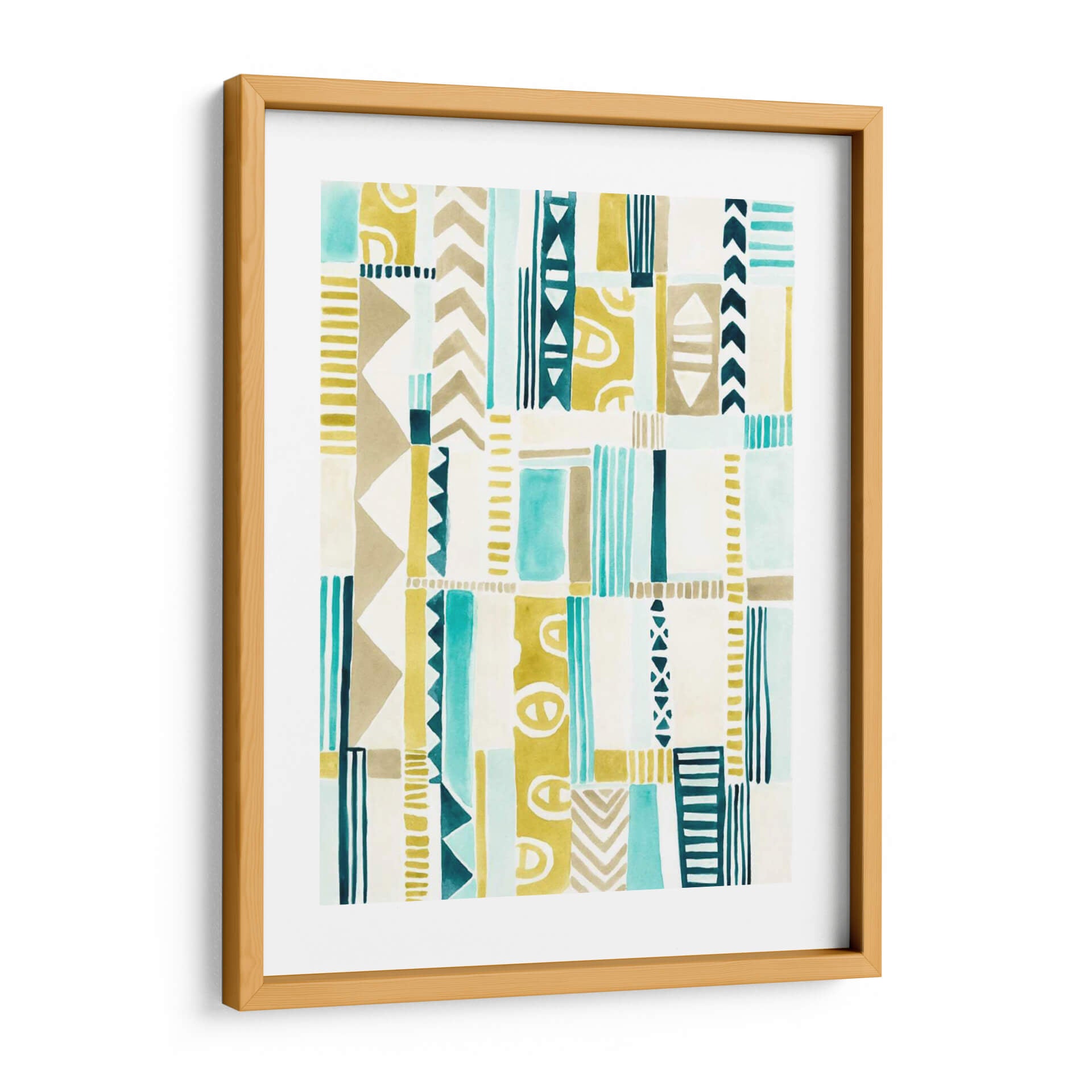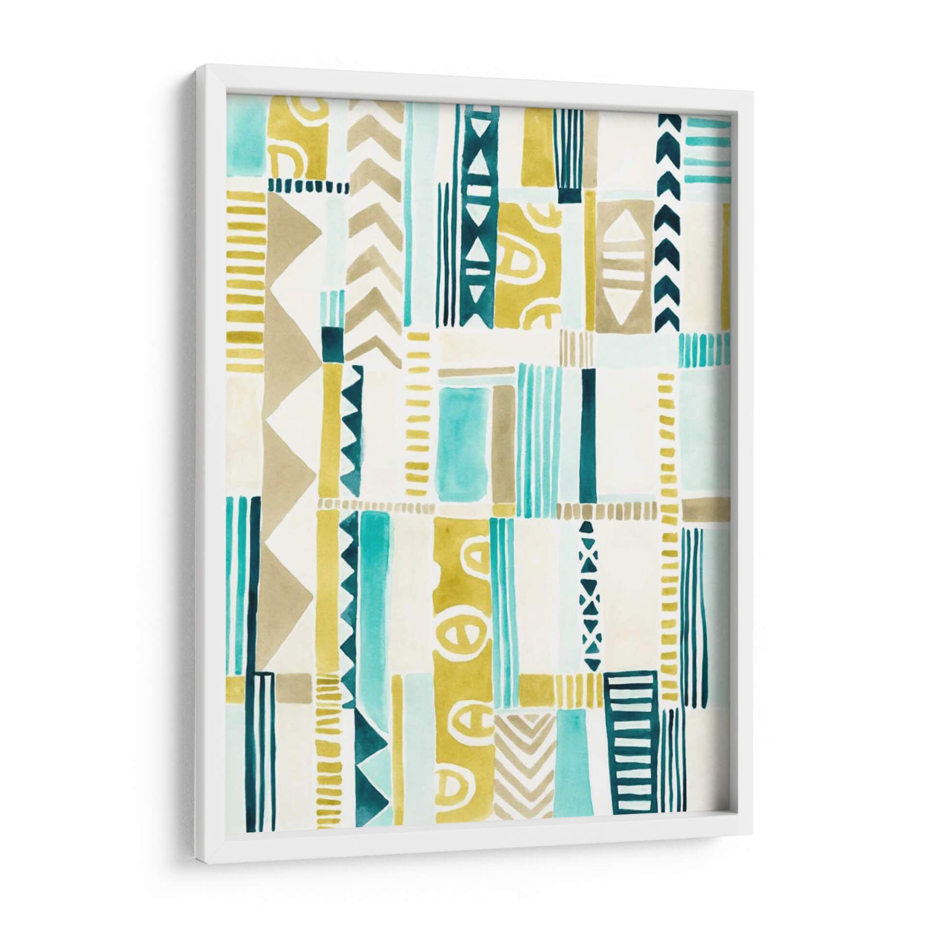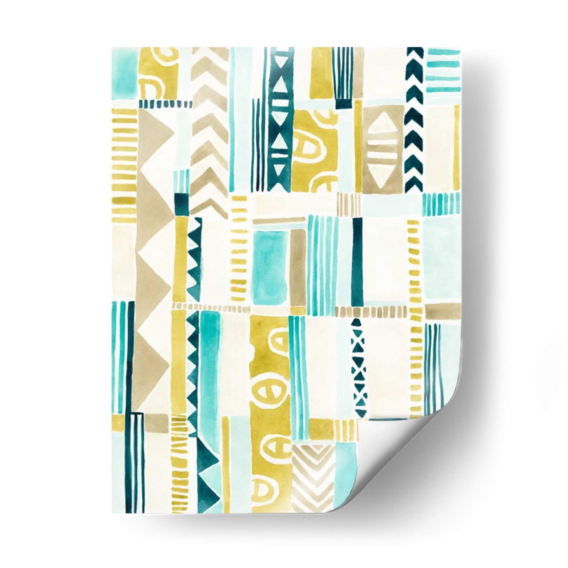 Sumérgete en la riqueza visual de "Patchwork Tribal I", una obra de arte abstracta que evoca la esencia de los patrones tribales con un toque contemporáneo. Creada por June Erica Vess, esta pieza se caracteriza por su cautivadora paleta de colores, donde los tonos tierra, el azul turquesa vibrante y el amarillo mostaza se entrelazan armoniosamente sobre un fondo blanco o crudo. La composición se basa en una serie de rectángulos y formas geométricas irregulares, creando un efecto de mosaico dinámico y lleno de textura. Cada sección presenta patrones distintos, desde líneas verticales finas y gruesas hasta patrones de chevron y formas circulares estilizadas, que recuerdan a textiles y símbolos ancestrales. La técnica utilizada, que parece emular la acuarela o la pintura a base de agua, aporta una suavidad y una fluidez que contrasta con la definición de los motivos, resultando en una obra equilibrada y estéticamente atractiva. "Patchwork Tribal I" es ideal para añadir un toque de carácter y calidez a cualquier espacio, desde una sala de estar moderna hasta un dormitorio acogedor o una oficina con un estilo bohemio o ecléctico. Su diseño abstracto pero con resonancias culturales la convierte en una pieza versátil, capaz de complementar una amplia gama de decoraciones, aportando energía sutil y un aire de sofisticación tribal.
