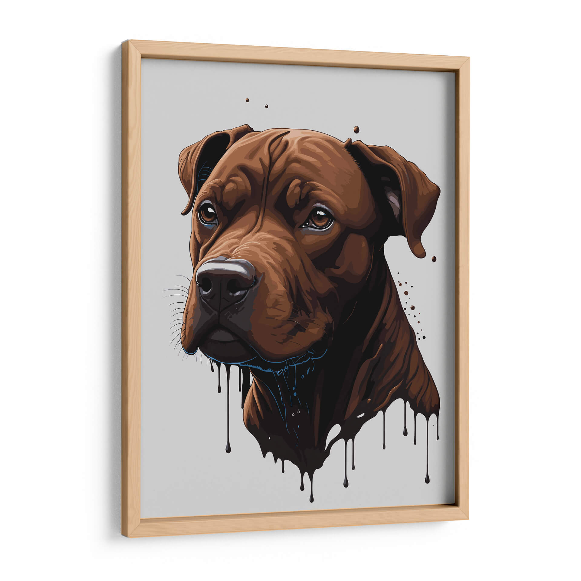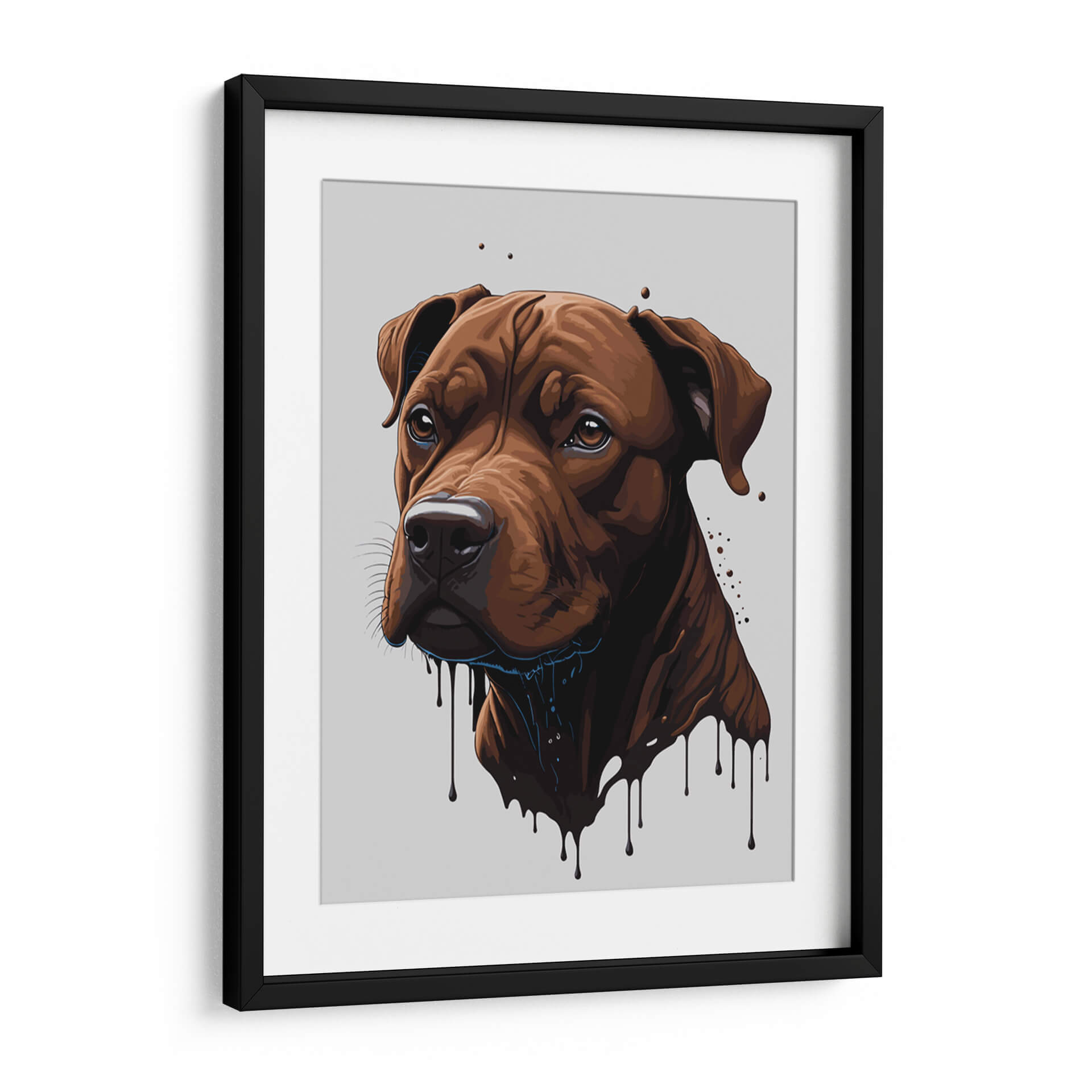 Captura la esencia de la lealtad y la fuerza con este impactante cuadro decorativo de un pitbull, titulado "Pitbull de Chocolate" por Infiniity Art. La obra presenta un primer plano del rostro de un perro pitbull en tonos marrones profundos, con un acabado que simula chocolate derretido, creando un efecto visual único y cautivador. Las gotas que caen desde su hocico y cuello añaden un toque de dinamismo y arte contemporáneo a la pieza, contrastando con la mirada penetrante y serena del animal. El fondo neutro en gris claro permite que el protagonista, el perro, resalte y se convierta en el punto focal de cualquier espacio. Este cuadro decorativo es ideal para los amantes de los perros, especialmente aquellos con una afinidad por los pitbulls, y para quienes buscan añadir un toque de carácter y personalidad a su hogar u oficina. Su estilo moderno y ligeramente abstracto lo hace perfecto para salas de estar, estudios o incluso espacios comerciales que busquen una decoración audaz y llena de sentimiento. Integra de forma sutil la calidez de los tonos tierra con un diseño gráfico contemporáneo, haciendo de esta obra un elemento decorativo que inspira admiración y conversación. Añade un toque de arte que celebra la nobleza canina con esta pieza exclusiva.