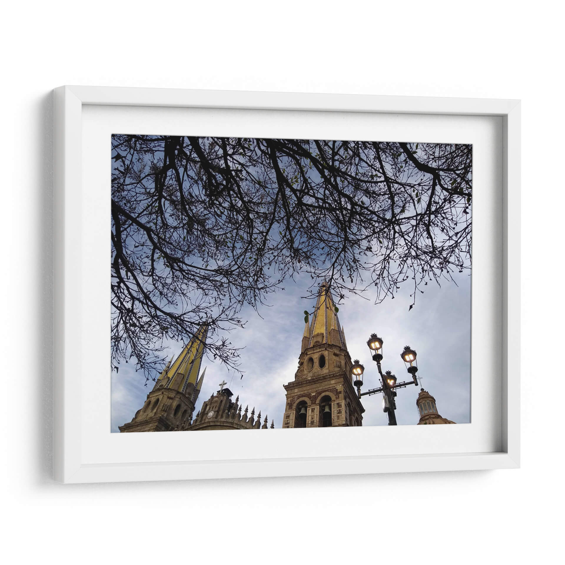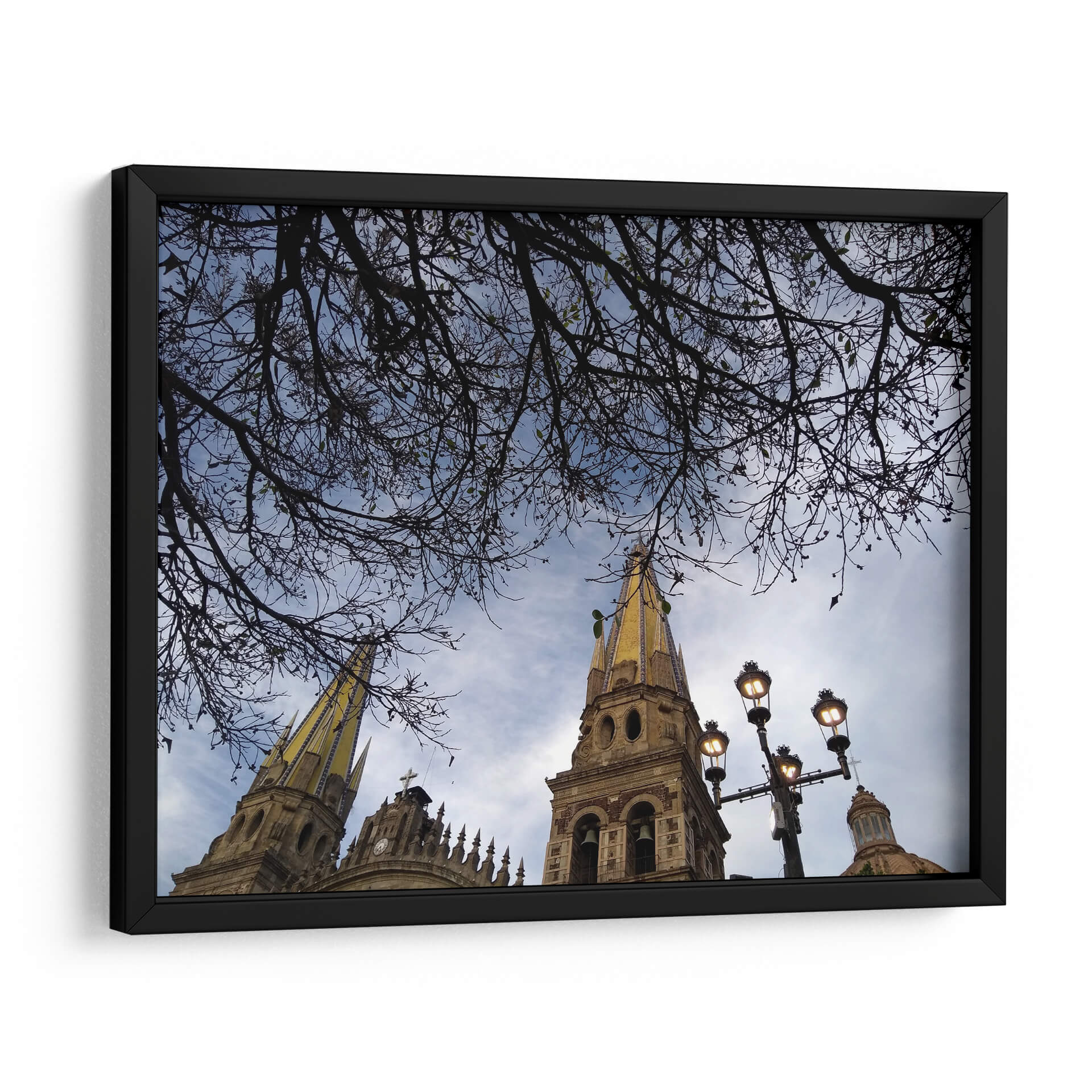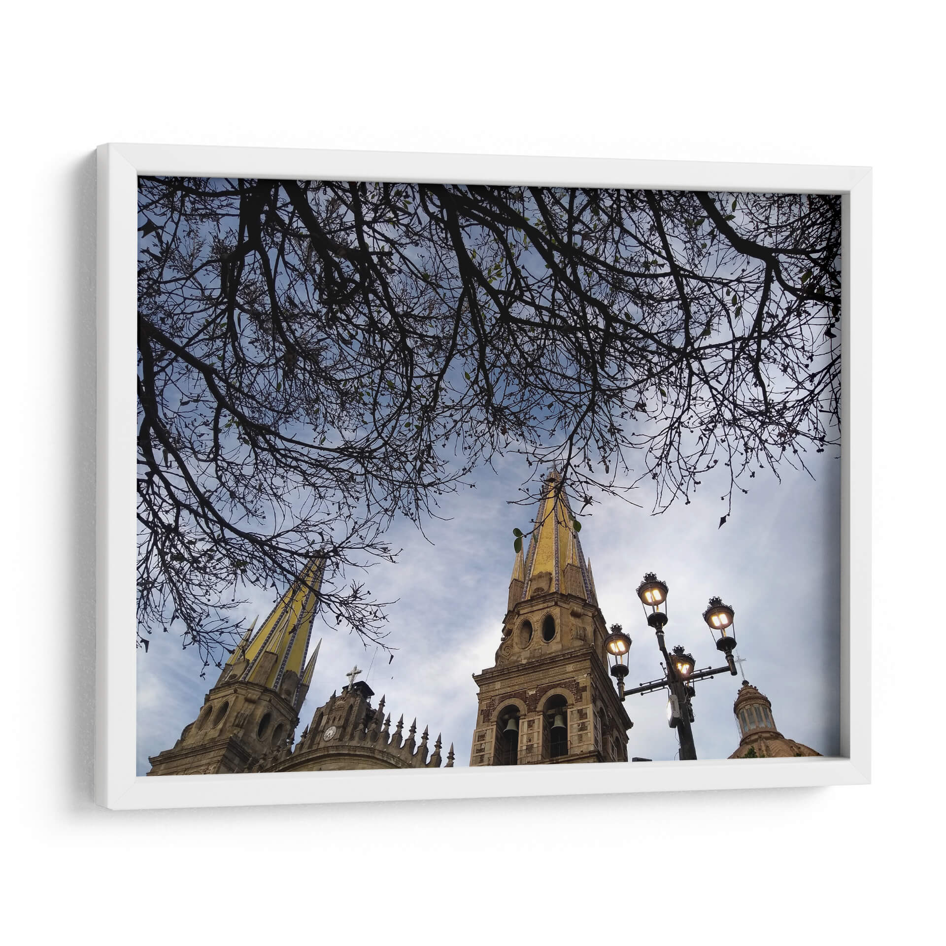 Sumérgete en la majestuosidad arquitectónica y la serenidad natural con este cautivador cuadro decorativo "Ramas" de Hugo Segura. La obra captura una perspectiva única de altas torres eclesiásticas, coronadas con detalles dorados que brillan bajo un cielo azul moteado de nubes. En primer plano, una intrincada red de ramas desnudas se extiende como un velo protector, enmarcando la escena y añadiendo una capa de profundidad y misterio. La paleta de colores se centra en tonos azules y grises del cielo, contrastando con la calidez terrosa de la arquitectura y el sutil toque dorado, creando una atmósfera contemplativa y a la vez vibrante. La composición, con su juego de líneas orgánicas de las ramas y las formas geométricas de los campanarios, invita a la reflexión y aporta un equilibrio visual excepcional. Este cuadro decorativo es ideal para transformar cualquier espacio en un refugio de paz y belleza, perfecto para salones modernos, estudios o incluso para infundir calma en un dormitorio. Añade un toque de arte contemporáneo y espiritualidad a tu hogar con esta pieza única que evoca la quietud de un momento suspendido en el tiempo. Las farolas integradas en la composición añaden un toque de iluminación tenue, sugiriendo la transición del día a la noche o la calidez de la luz artificial en un entorno urbano.