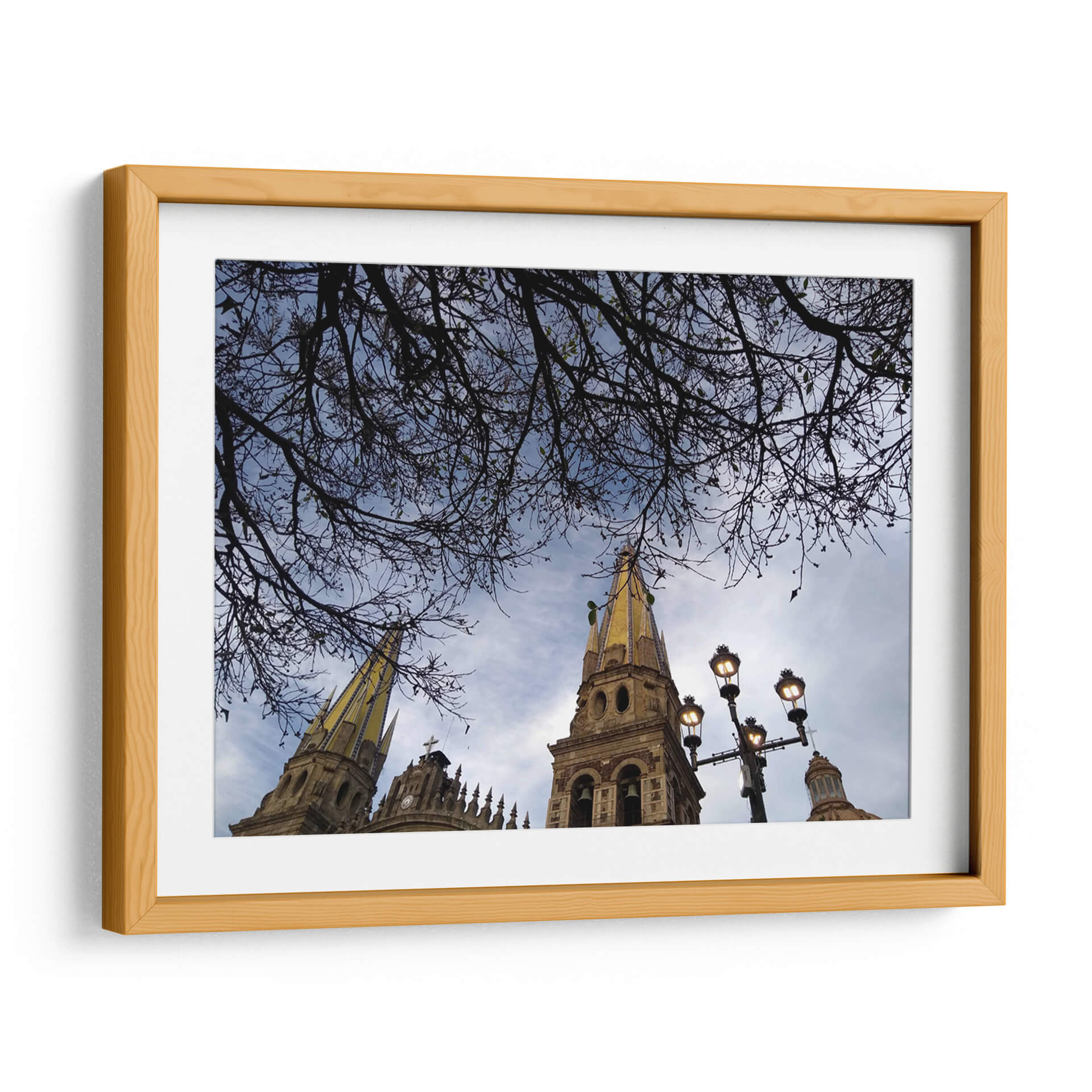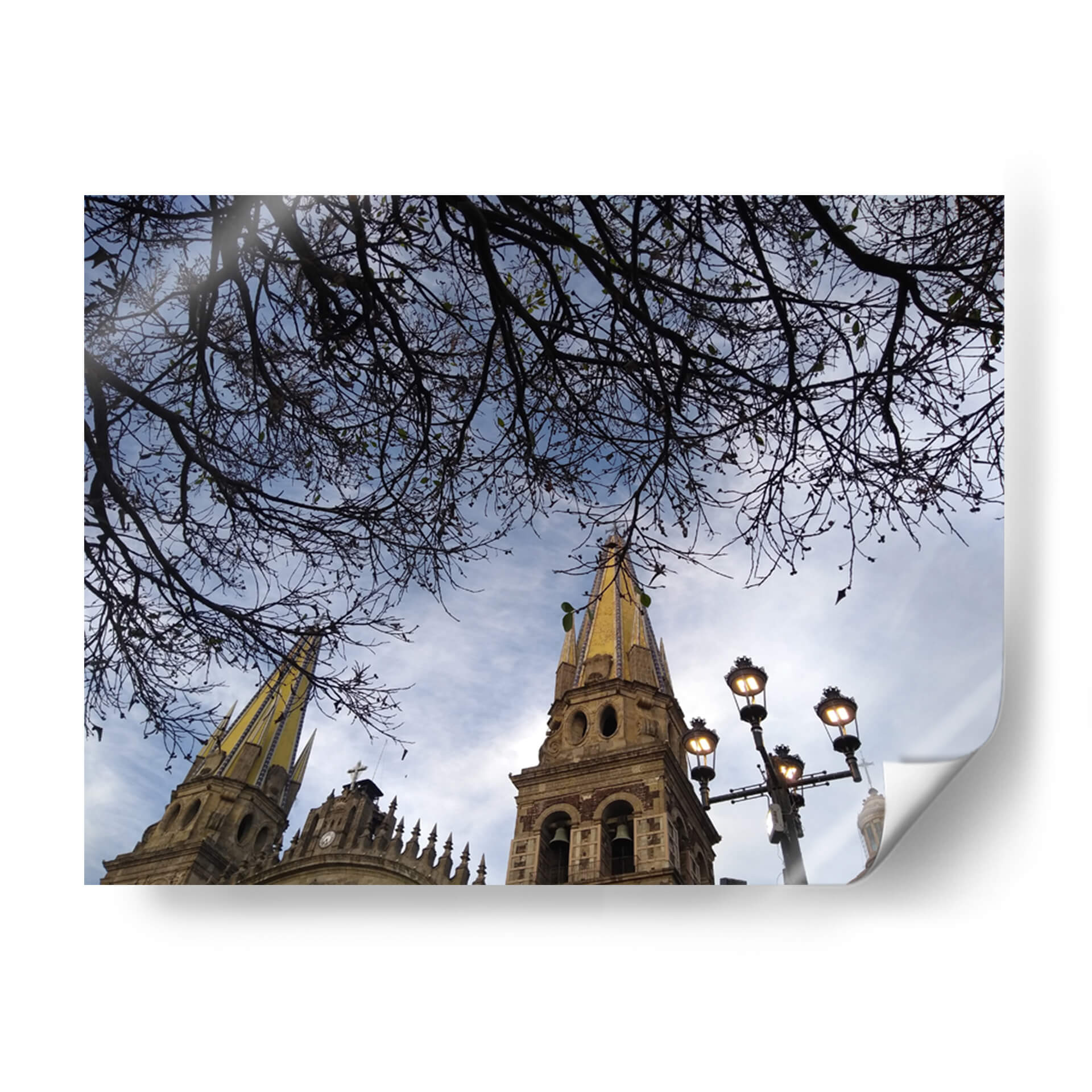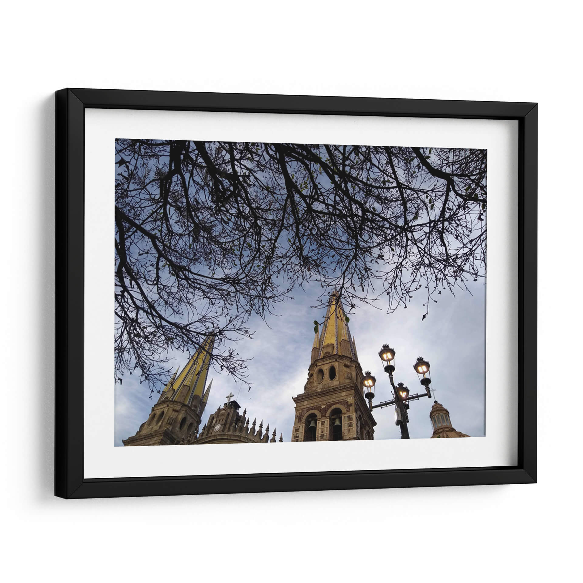 Sumérgete en la majestuosidad arquitectónica y la serenidad natural con este cautivador cuadro decorativo "Ramas" de Hugo Segura. La obra captura una perspectiva única de altas torres eclesiásticas, coronadas con detalles dorados que brillan bajo un cielo azul moteado de nubes. En primer plano, una intrincada red de ramas desnudas se extiende como un velo protector, enmarcando la escena y añadiendo una capa de profundidad y misterio. La paleta de colores se centra en tonos azules y grises del cielo, contrastando con la calidez terrosa de la arquitectura y el sutil toque dorado, creando una atmósfera contemplativa y a la vez vibrante. La composición, con su juego de líneas orgánicas de las ramas y las formas geométricas de los campanarios, invita a la reflexión y aporta un equilibrio visual excepcional. Este cuadro decorativo es ideal para transformar cualquier espacio en un refugio de paz y belleza, perfecto para salones modernos, estudios o incluso para infundir calma en un dormitorio. Añade un toque de arte contemporáneo y espiritualidad a tu hogar con esta pieza única que evoca la quietud de un momento suspendido en el tiempo. Las farolas integradas en la composición añaden un toque de iluminación tenue, sugiriendo la transición del día a la noche o la calidez de la luz artificial en un entorno urbano.