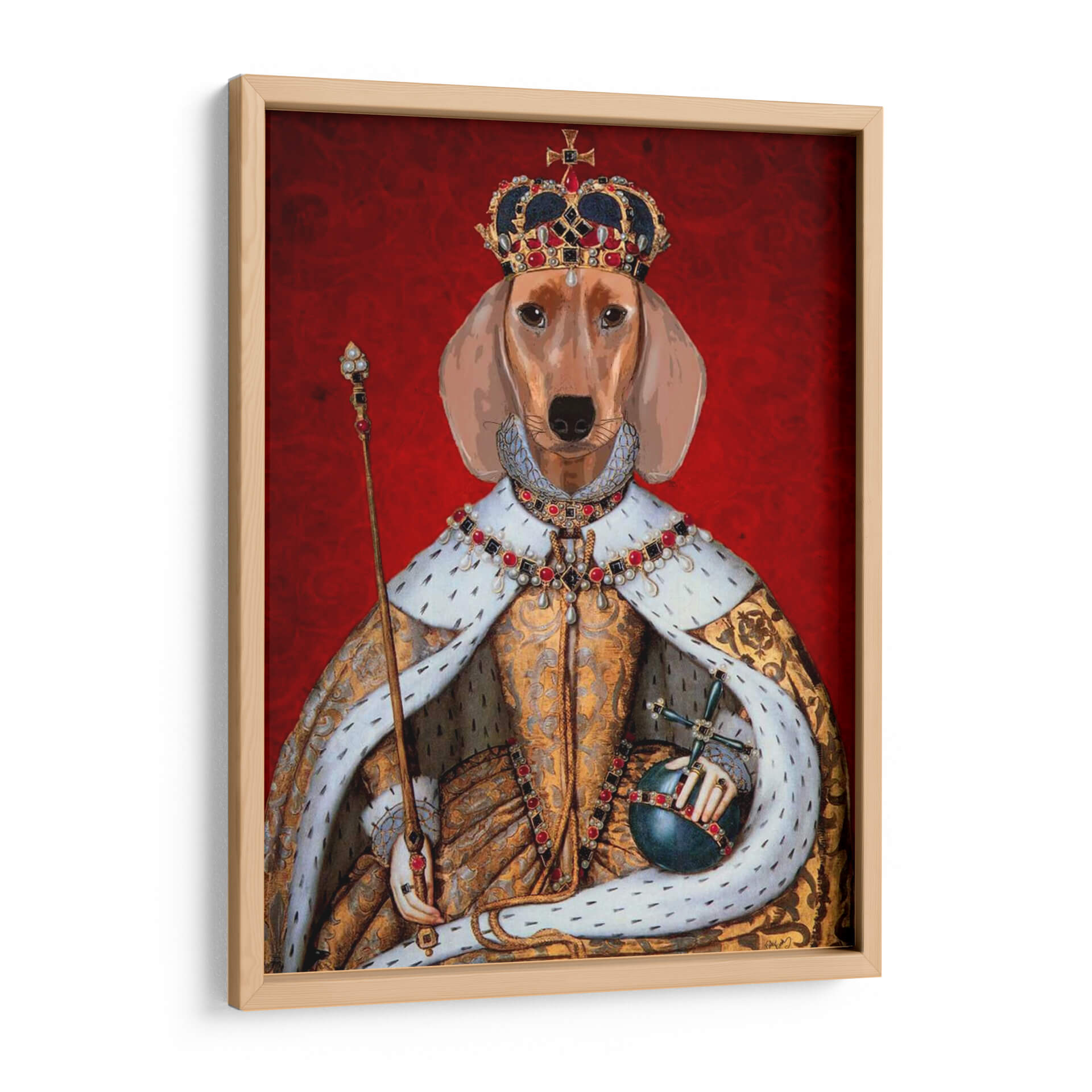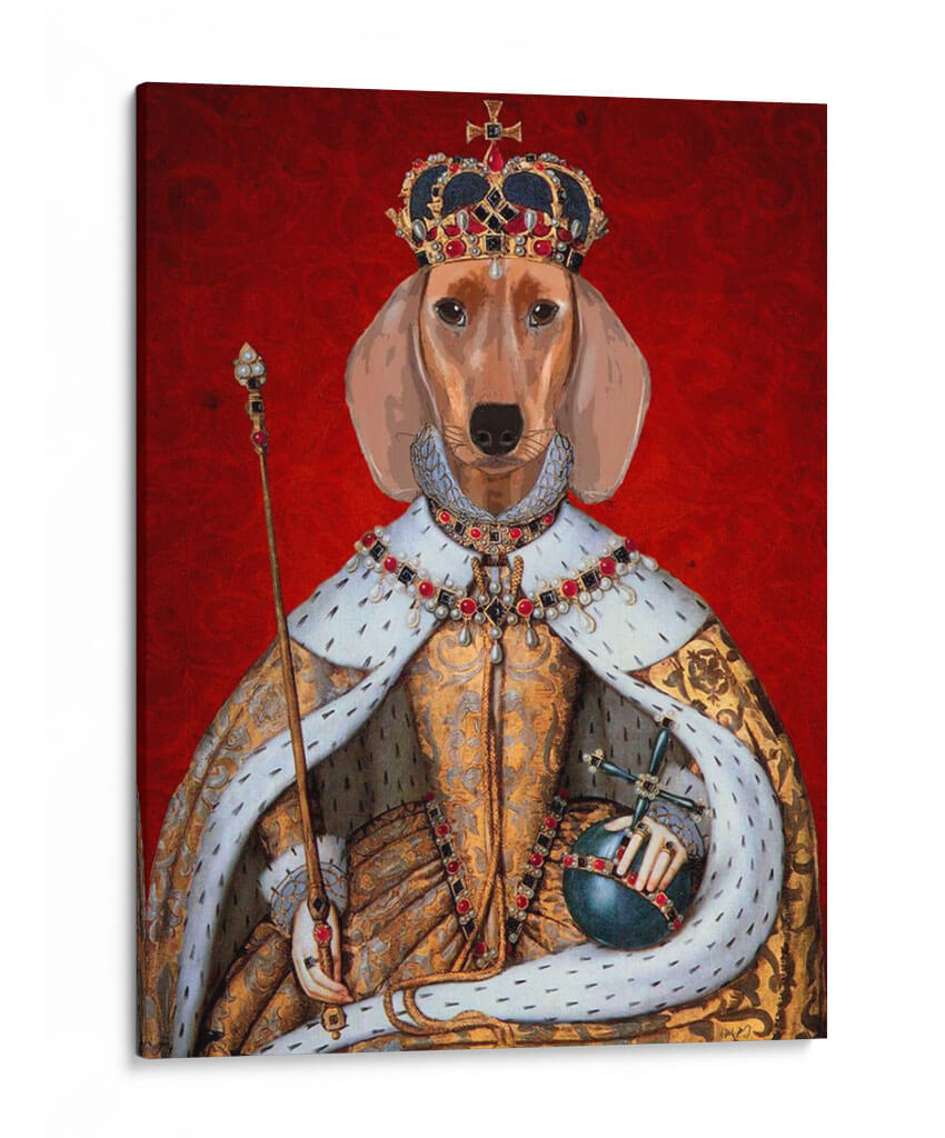 Transforma tu espacio con "Reina Dachshund", una obra de arte digital cautivadora que fusiona la nobleza con un toque de humor y originalidad. Este cuadro decorativo presenta a un Dachshund ataviado con una majestuosa corona y un manto real, sosteniendo el orbe y el cetro, símbolos de poder y soberanía. La paleta de colores vibrantes, dominada por un profundo rojo texturizado en el fondo y los ricos dorados y plateados del atuendo real, crea un contraste impactante y una atmósfera de opulencia y elegancia. El estilo, una mezcla de retrato clásico y surrealismo moderno, convierte a esta pieza en un punto focal inigualable para cualquier habitación. Ideal para amantes de los perros, entusiastas del arte contemporáneo y aquellos que buscan añadir un elemento distintivo y lleno de personalidad a su hogar u oficina. "Reina Dachshund" no es solo una imagen, es una declaración de estilo que evoca admiración y sonrisas, perfecta para salas de estar, estudios o incluso espacios comerciales que buscan destacar.