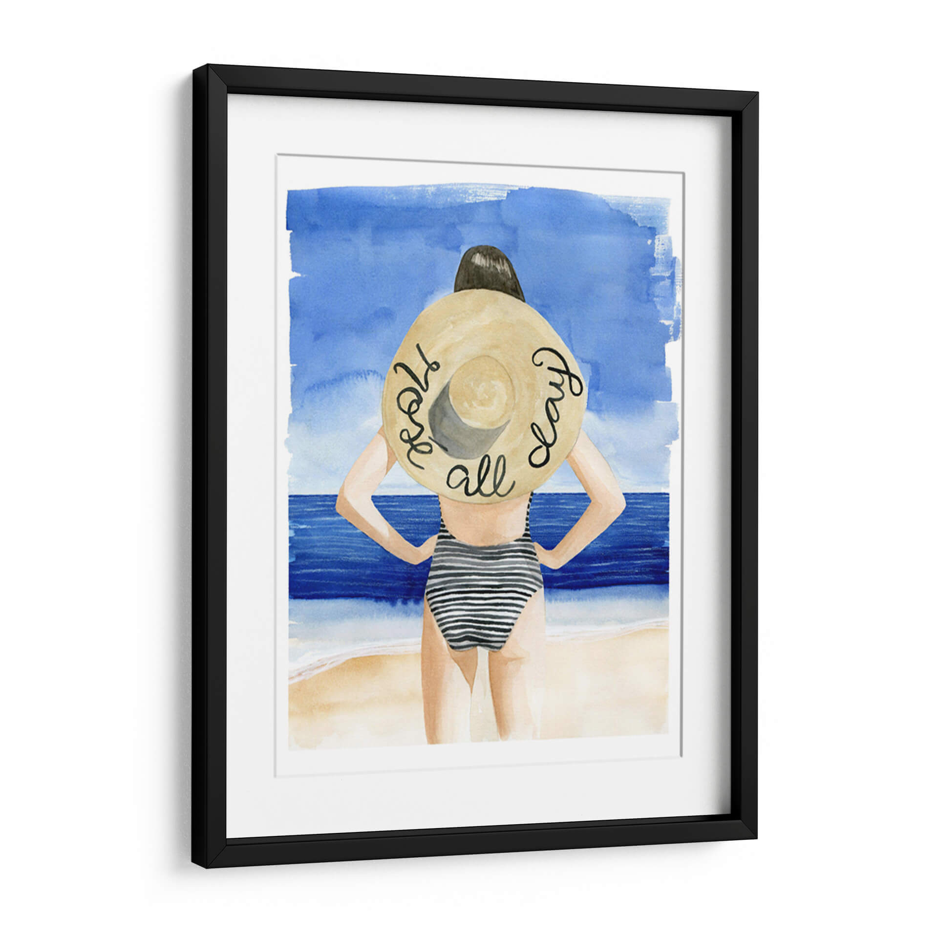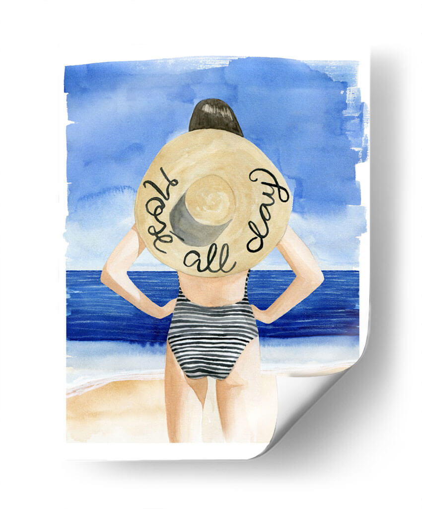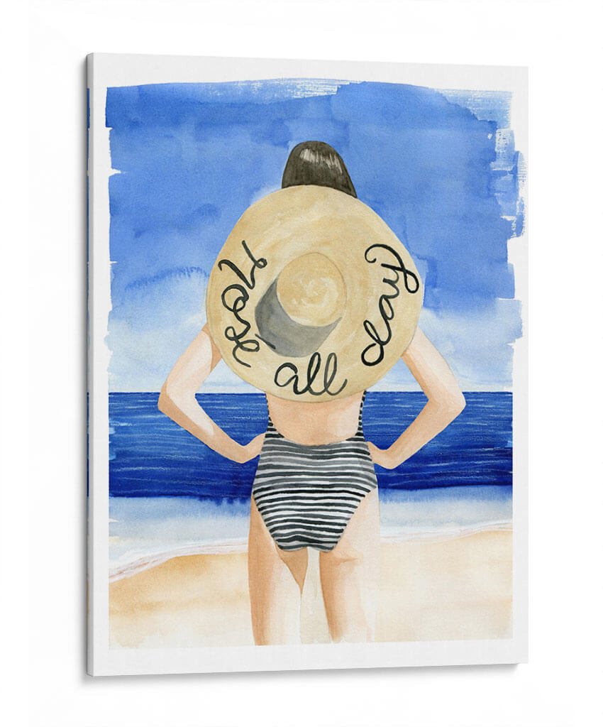 Captura la esencia del verano y la despreocupación con este encantador cuadro decorativo 'Rosé all day'. La obra presenta a una mujer de espaldas, luciendo un traje de baño a rayas y un sombrero de ala ancha, parada en una playa bañada por el sol. El estilo acuarela evoca una sensación de ligereza y frescura, con pinceladas suaves que dan vida al vibrante azul del mar y el cielo, contrastando con la arena dorada. Las palabras 'Rosé all day' inscritas en el sombrero añaden un toque lúdico y festivo, perfecto para quienes buscan celebrar la vida y los buenos momentos. Este cuadro decorativo es ideal para infundir una atmósfera de relajación y alegría en cualquier espacio, ya sea una sala de estar, un dormitorio o incluso un baño con temática playera. Su composición centrada y los colores alegres lo convierten en un punto focal atractivo que invita a soñar con vacaciones y días soleados. Transforma tu hogar en un oasis de tranquilidad y estilo con esta pieza única que celebra el placer de vivir el momento.