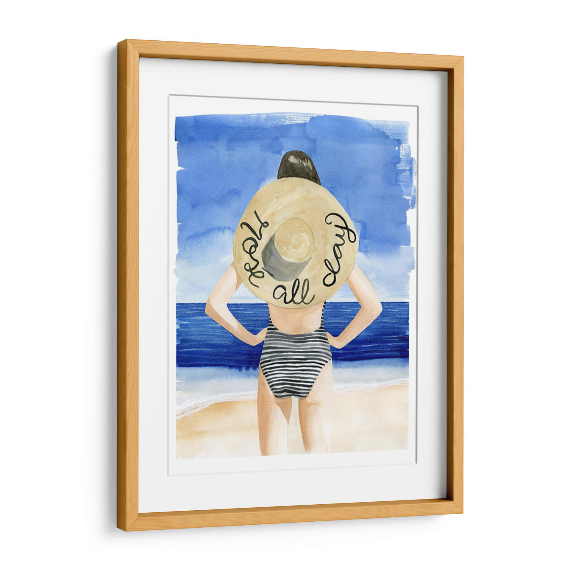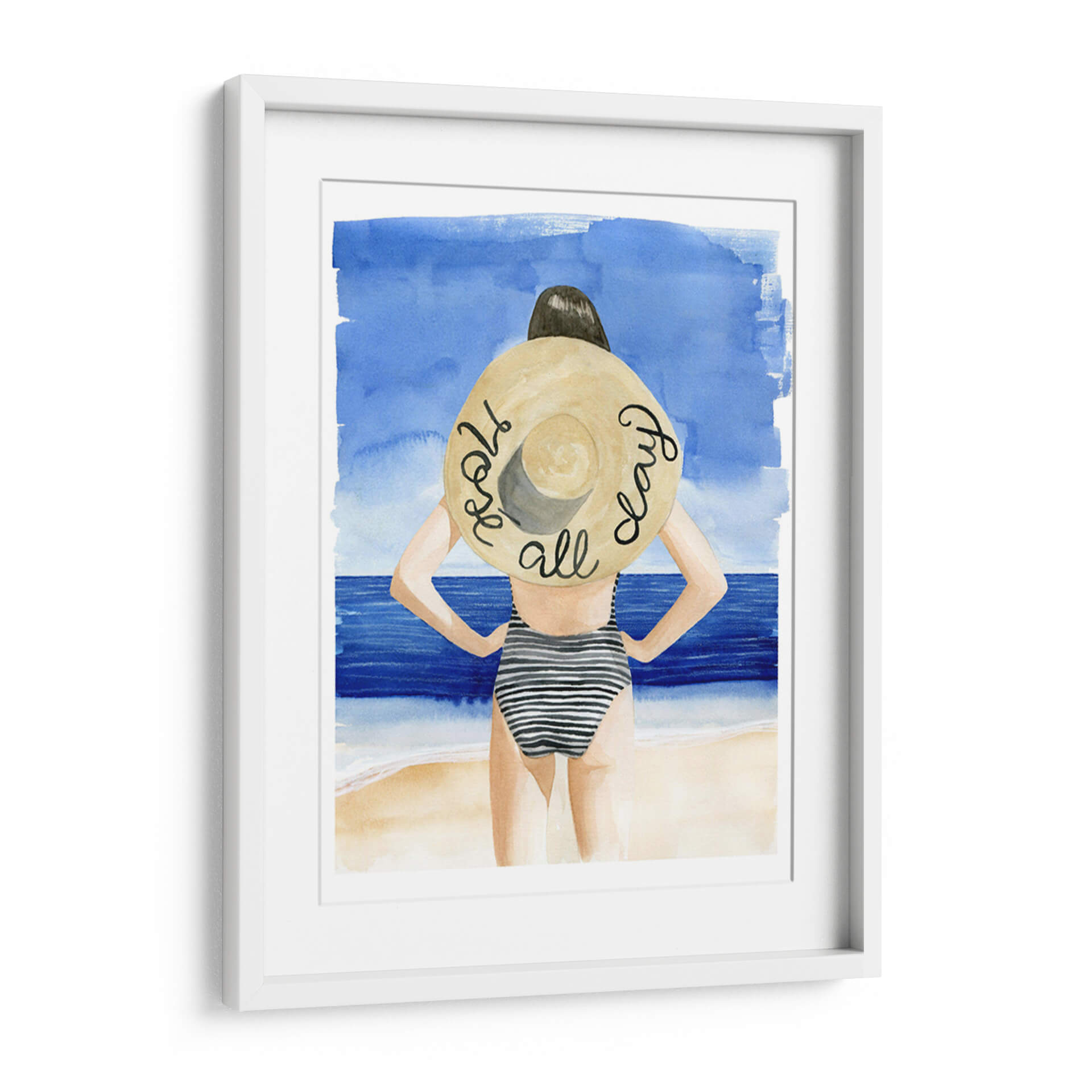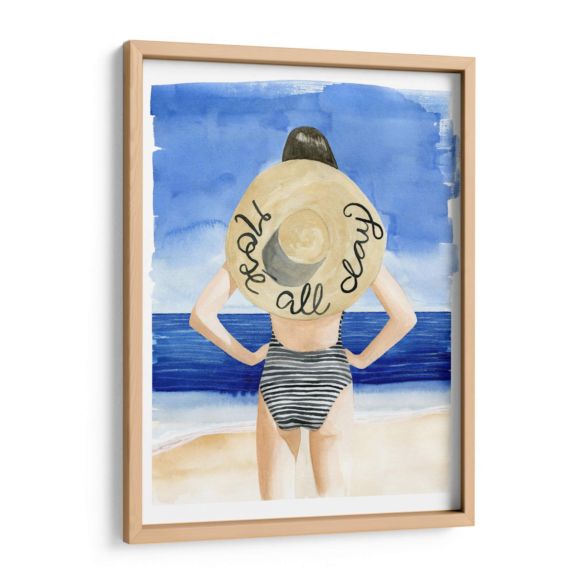 Captura la esencia del verano y la despreocupación con este encantador cuadro decorativo 'Rosé all day'. La obra presenta a una mujer de espaldas, luciendo un traje de baño a rayas y un sombrero de ala ancha, parada en una playa bañada por el sol. El estilo acuarela evoca una sensación de ligereza y frescura, con pinceladas suaves que dan vida al vibrante azul del mar y el cielo, contrastando con la arena dorada. Las palabras 'Rosé all day' inscritas en el sombrero añaden un toque lúdico y festivo, perfecto para quienes buscan celebrar la vida y los buenos momentos. Este cuadro decorativo es ideal para infundir una atmósfera de relajación y alegría en cualquier espacio, ya sea una sala de estar, un dormitorio o incluso un baño con temática playera. Su composición centrada y los colores alegres lo convierten en un punto focal atractivo que invita a soñar con vacaciones y días soleados. Transforma tu hogar en un oasis de tranquilidad y estilo con esta pieza única que celebra el placer de vivir el momento.
