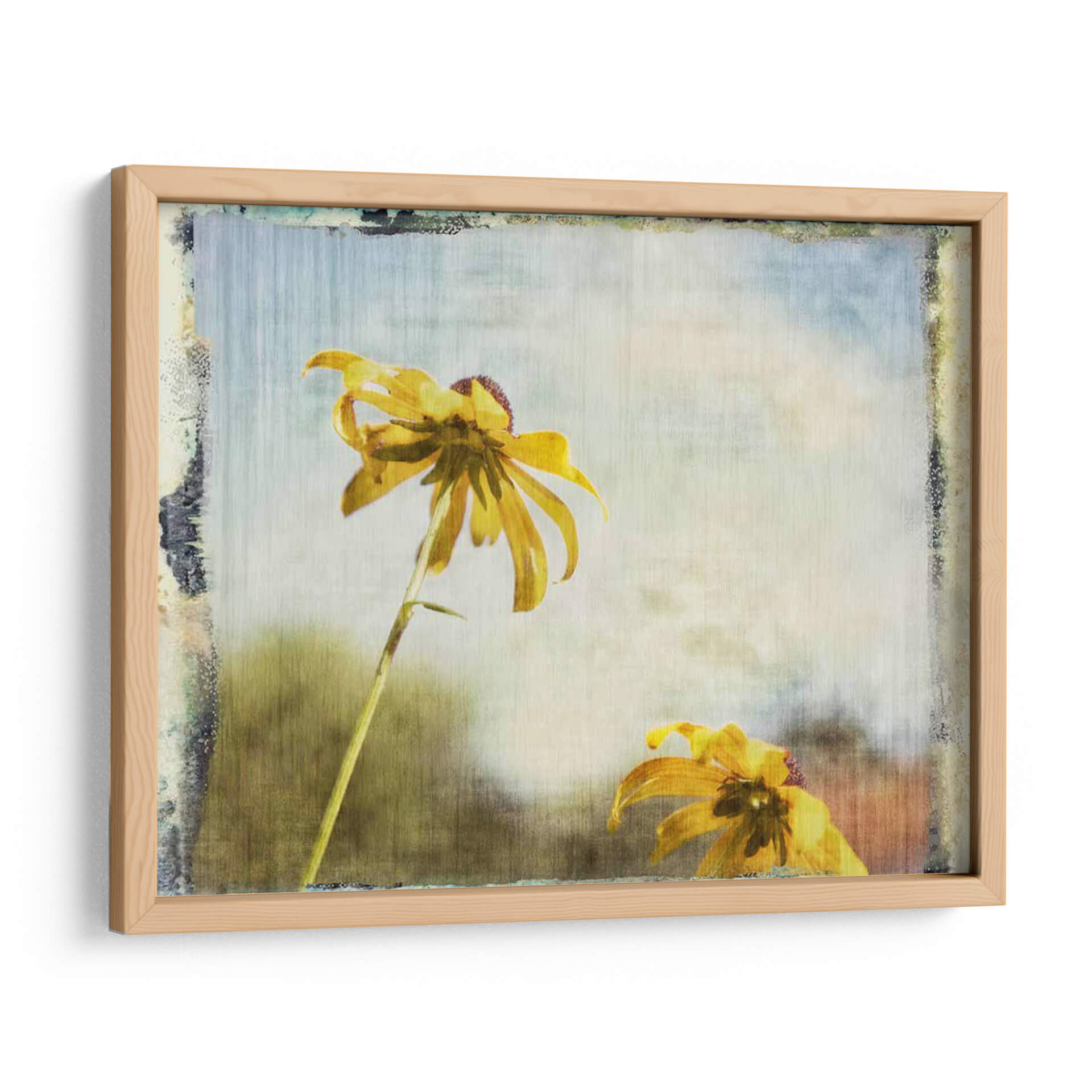 Sumérgete en la serena belleza de "Susans De Blackeyed", una cautivadora obra de arte de Meghan McSweeney que captura la delicadeza de la naturaleza con un toque etéreo. Este cuadro decorativo presenta dos flores amarillas vibrantes, cuyas pétalos parecen danzar suavemente en una brisa imaginaria, contra un fondo texturizado que evoca cielos nublados y paisajes difuminados. La paleta de colores, dominada por tonos pastel de azul y verde con toques cálidos de amarillo y ocre, crea una atmósfera de calma y nostalgia, perfecta para añadir un punto de serenidad a cualquier espacio. El estilo fotográfico con una estética vintage y un sutil efecto de "borde desgastado" otorga a la pieza un carácter único y atemporal, invitando a la contemplación. Ideal para salones, dormitorios o estudios, esta composición floral es un recordatorio de la belleza efímera y la elegancia sencilla. Su capacidad para infundir tranquilidad y sofisticación la convierte en una elección excepcional para quienes buscan una decoración que hable de paz y armonía. Añade un toque de arte inspirador y natural a tu hogar u oficina con este exquisito cuadro.