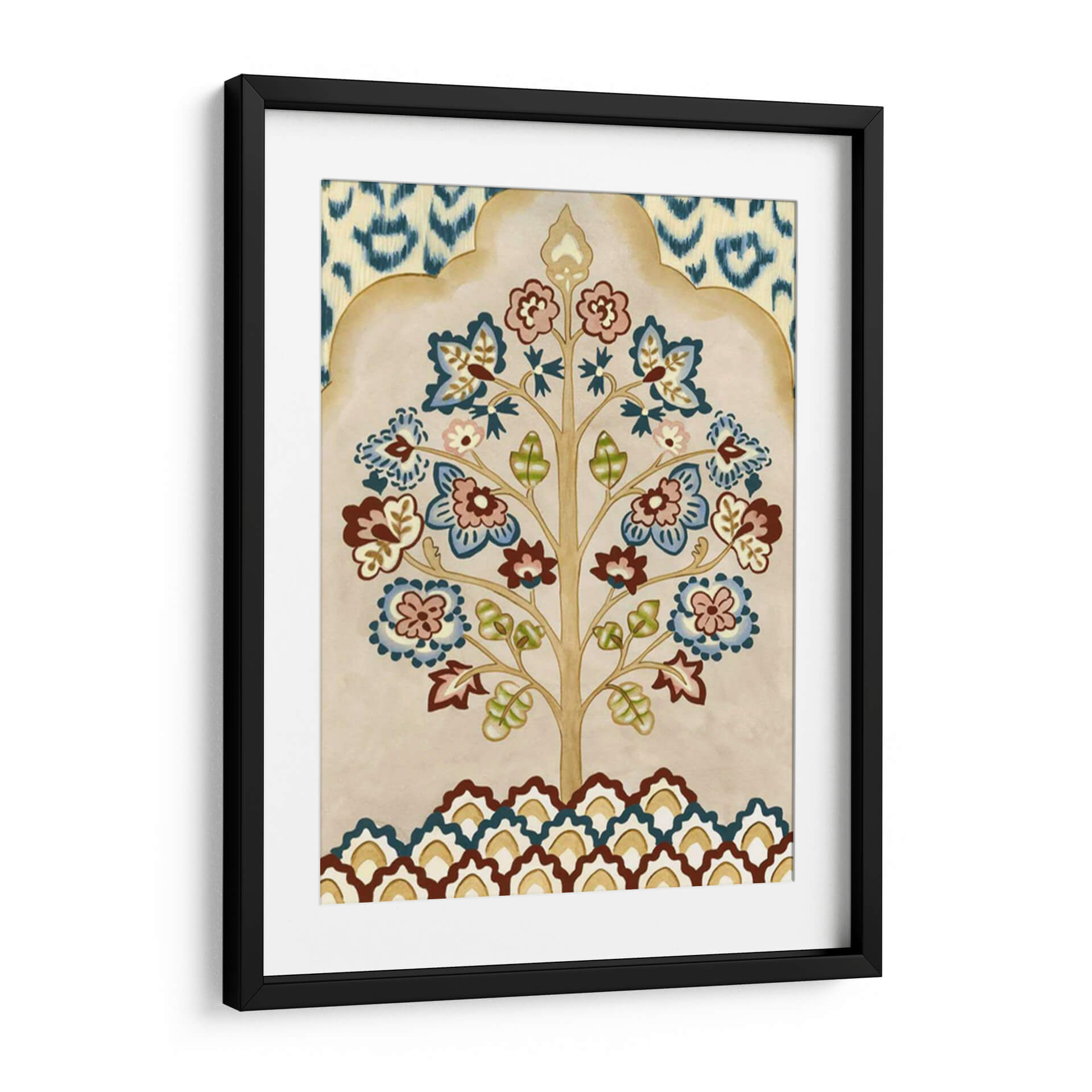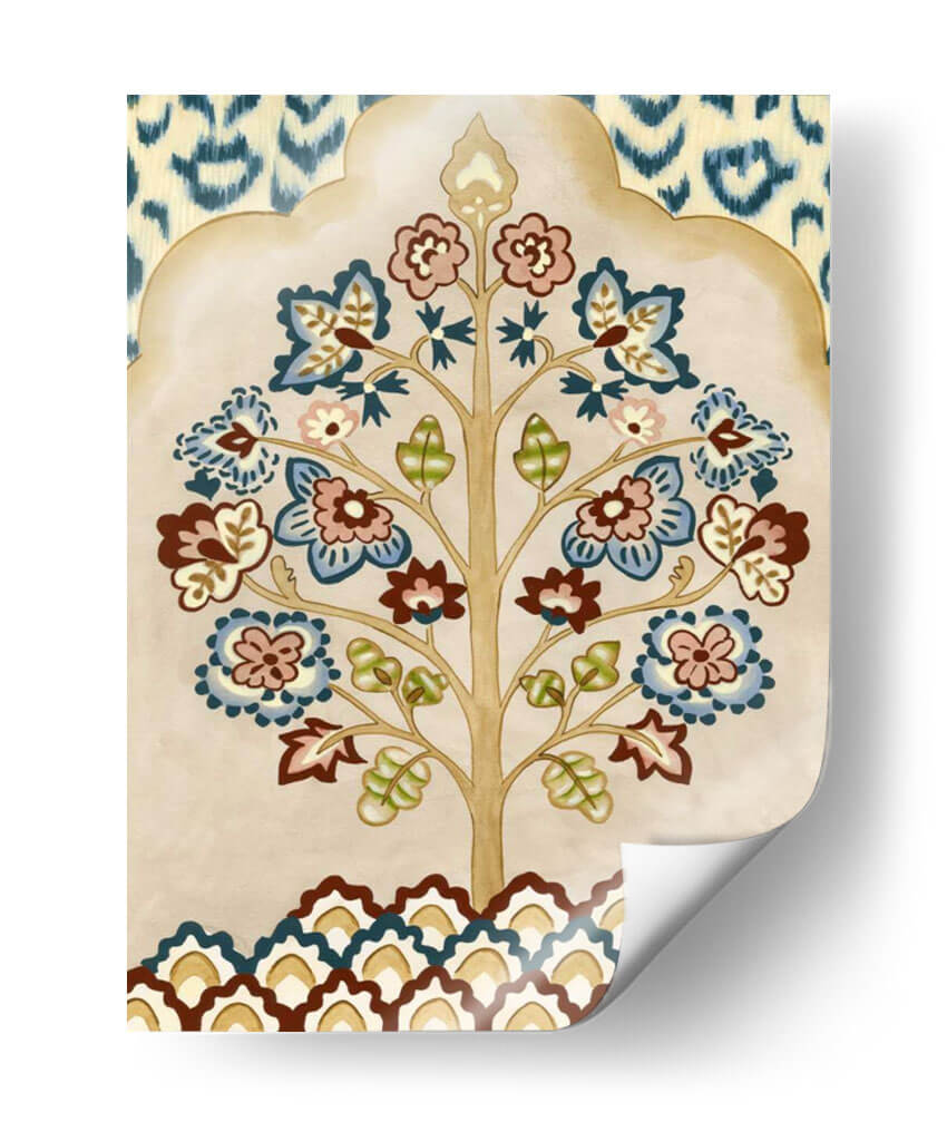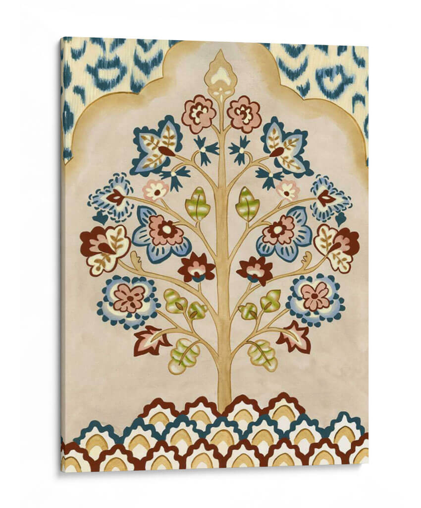 Sumérgete en la serenidad y la belleza botánica con "Tapiz Árbol II", una obra de arte contemporáneo de Chariklia Zarris. Este cautivador cuadro decorativo presenta un árbol estilizado, vibrante y floreciente, evocando una sensación de crecimiento y vitalidad. La paleta de colores, con sus suaves tonos tierra, azules profundos, toques de rosa y verdes sutiles, crea una atmósfera armoniosa y relajante, perfecta para cualquier espacio que busque un toque de naturaleza y sofisticación. Los intrincados detalles florales y los patrones geométricos en la base y en los bordes superiores añaden una dimensión de riqueza cultural y artesanal, sugiriendo influencias étnicas o tradicionales que enriquecen la pieza.