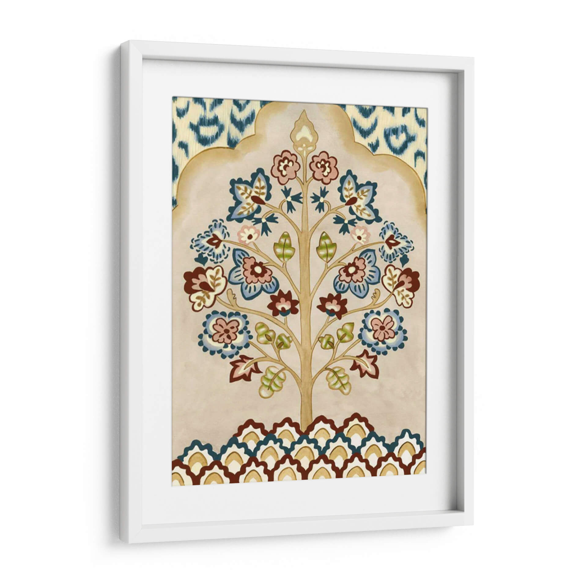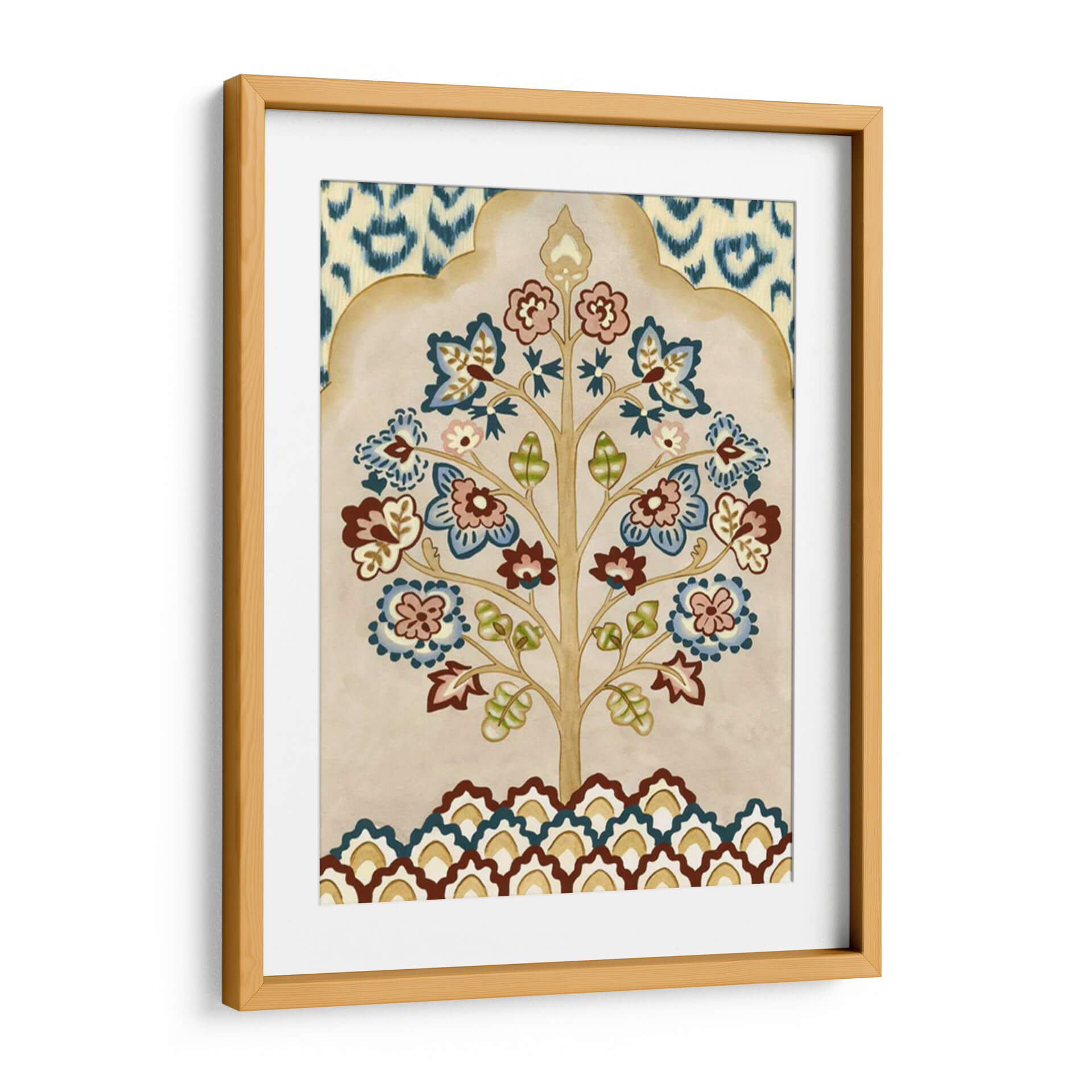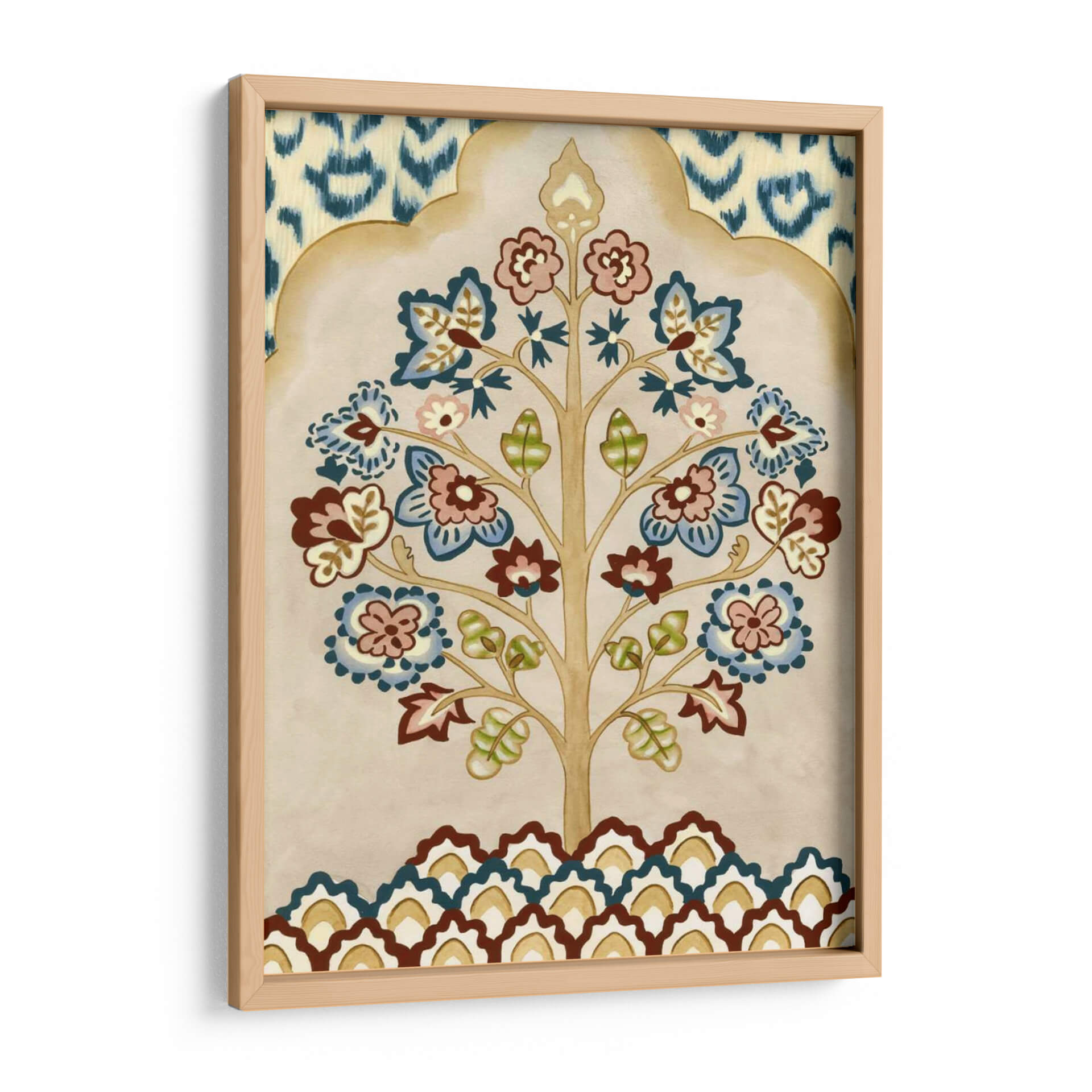 Sumérgete en la serenidad y la belleza botánica con "Tapiz Árbol II", una obra de arte contemporáneo de Chariklia Zarris. Este cautivador cuadro decorativo presenta un árbol estilizado, vibrante y floreciente, evocando una sensación de crecimiento y vitalidad. La paleta de colores, con sus suaves tonos tierra, azules profundos, toques de rosa y verdes sutiles, crea una atmósfera armoniosa y relajante, perfecta para cualquier espacio que busque un toque de naturaleza y sofisticación. Los intrincados detalles florales y los patrones geométricos en la base y en los bordes superiores añaden una dimensión de riqueza cultural y artesanal, sugiriendo influencias étnicas o tradicionales que enriquecen la pieza.