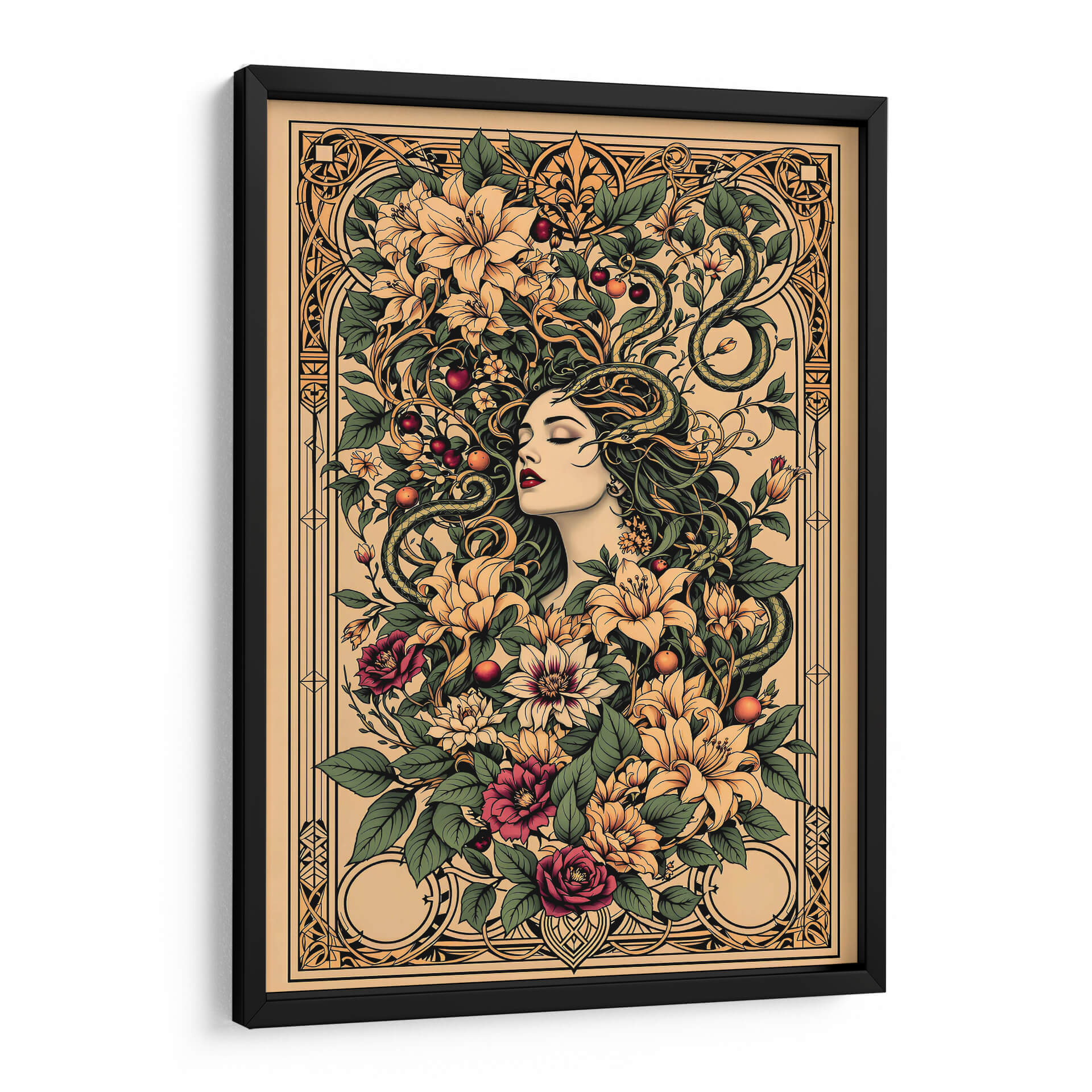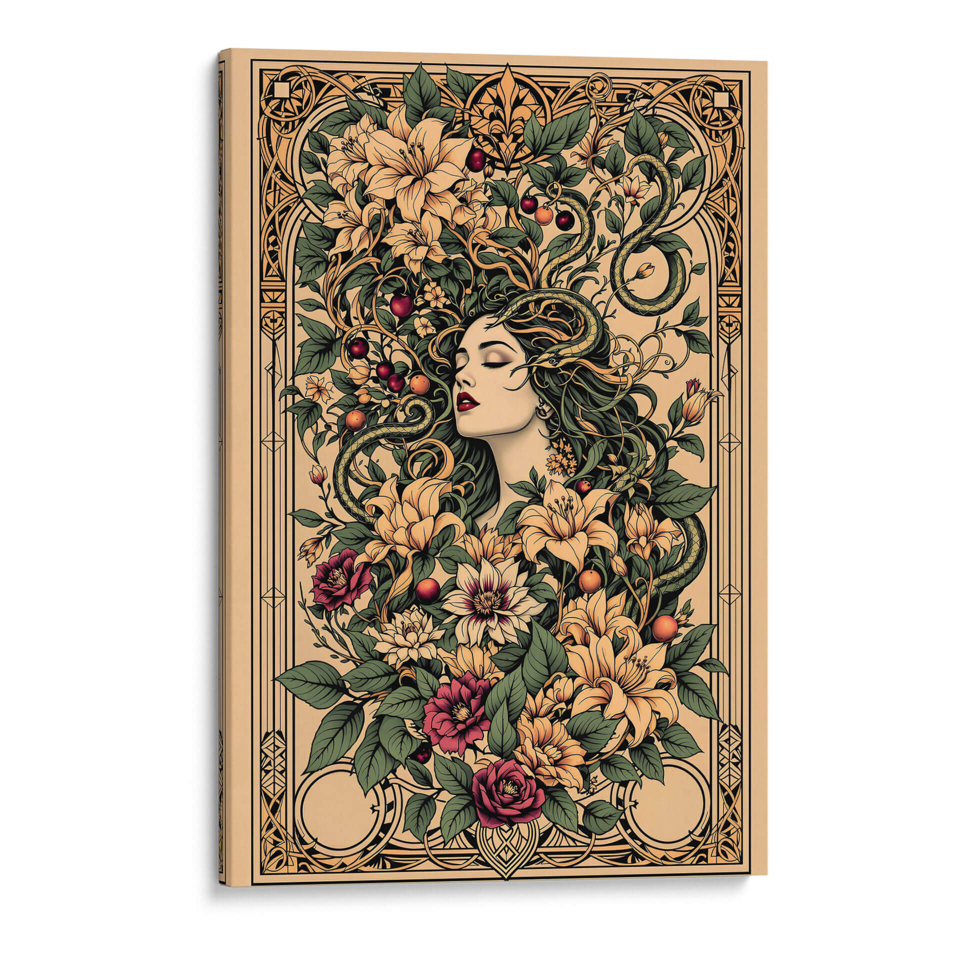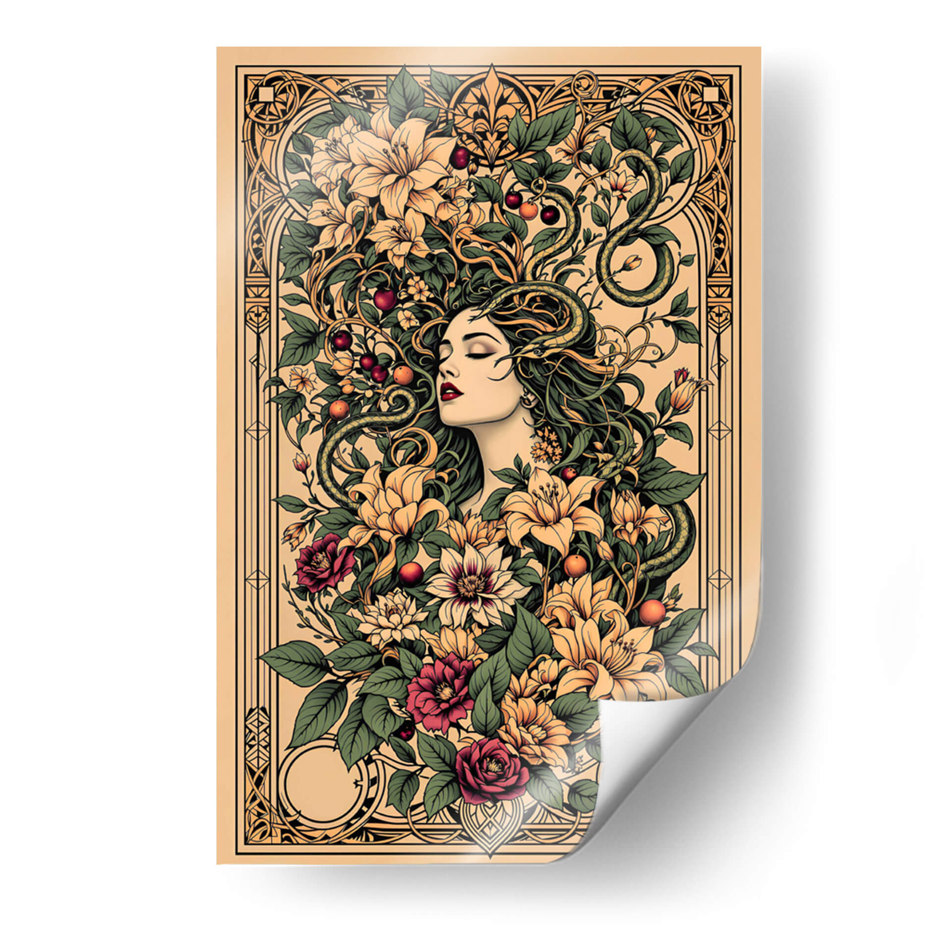 Sumérgete en la enigmática belleza de "Tattoo Art 004", una obra digital que fusiona la estética del arte del tatuaje con motivos botánicos exuberantes y una figura femenina serena. Esta pieza cautiva con su intrincado diseño, donde una mujer de rasgos delicados parece emerger de un torbellino de flores vibrantes y hojas verdes, entrelazadas con serpientes sinuosas que añaden un toque de misterio y dualidad. La paleta de colores, dominada por tonos tierra, ocres, verdes profundos y toques de carmesí y amarillo pálido, crea una atmósfera rica y sofisticada, evocando una sensación de conexión primordial con la naturaleza y lo esotérico. El estilo detallado, casi grabado, y la composición simétrica pero orgánica, invitan a la contemplación. Ideal para quienes buscan una decoración de pared con carácter, esta obra es perfecta para añadir un punto focal de elegancia y profundidad a salones modernos, estudios o incluso espacios que busquen un aire de misterio y sofisticación. "Tattoo Art 004" no es solo una imagen, es una invitación a explorar la simbología oculta y la belleza atemporal del arte que trasciende lo efímero.