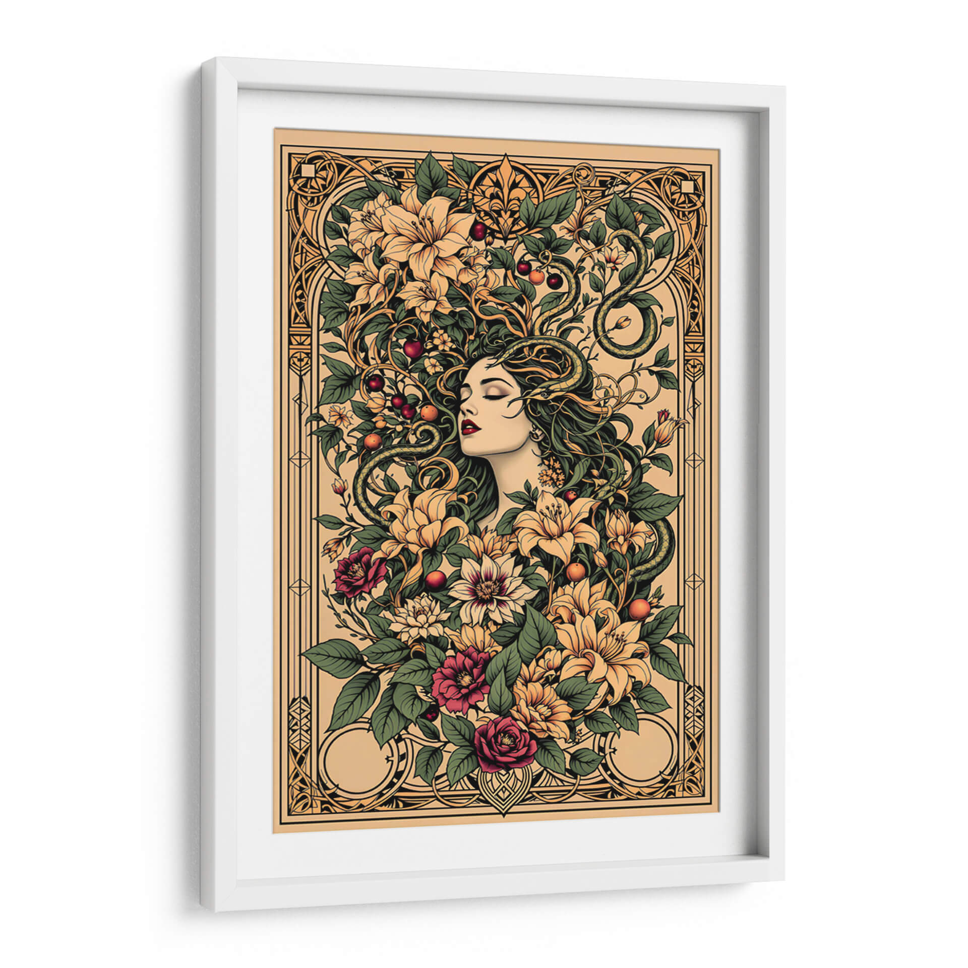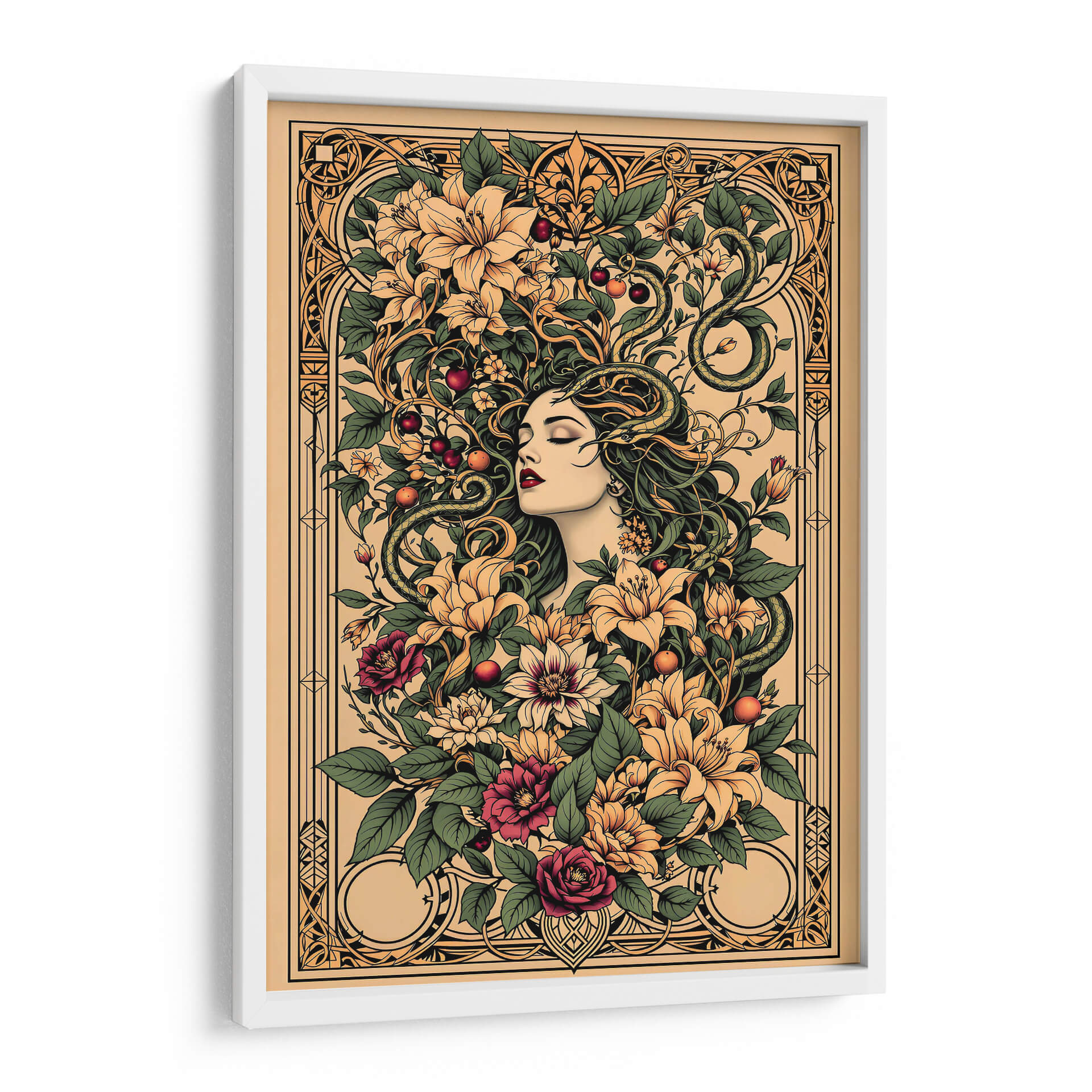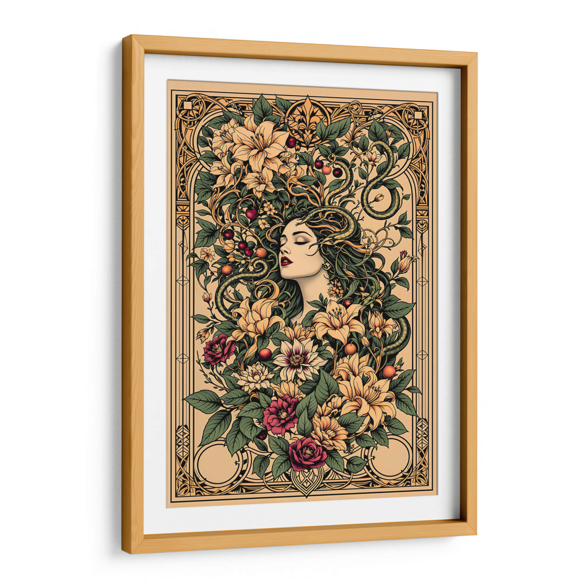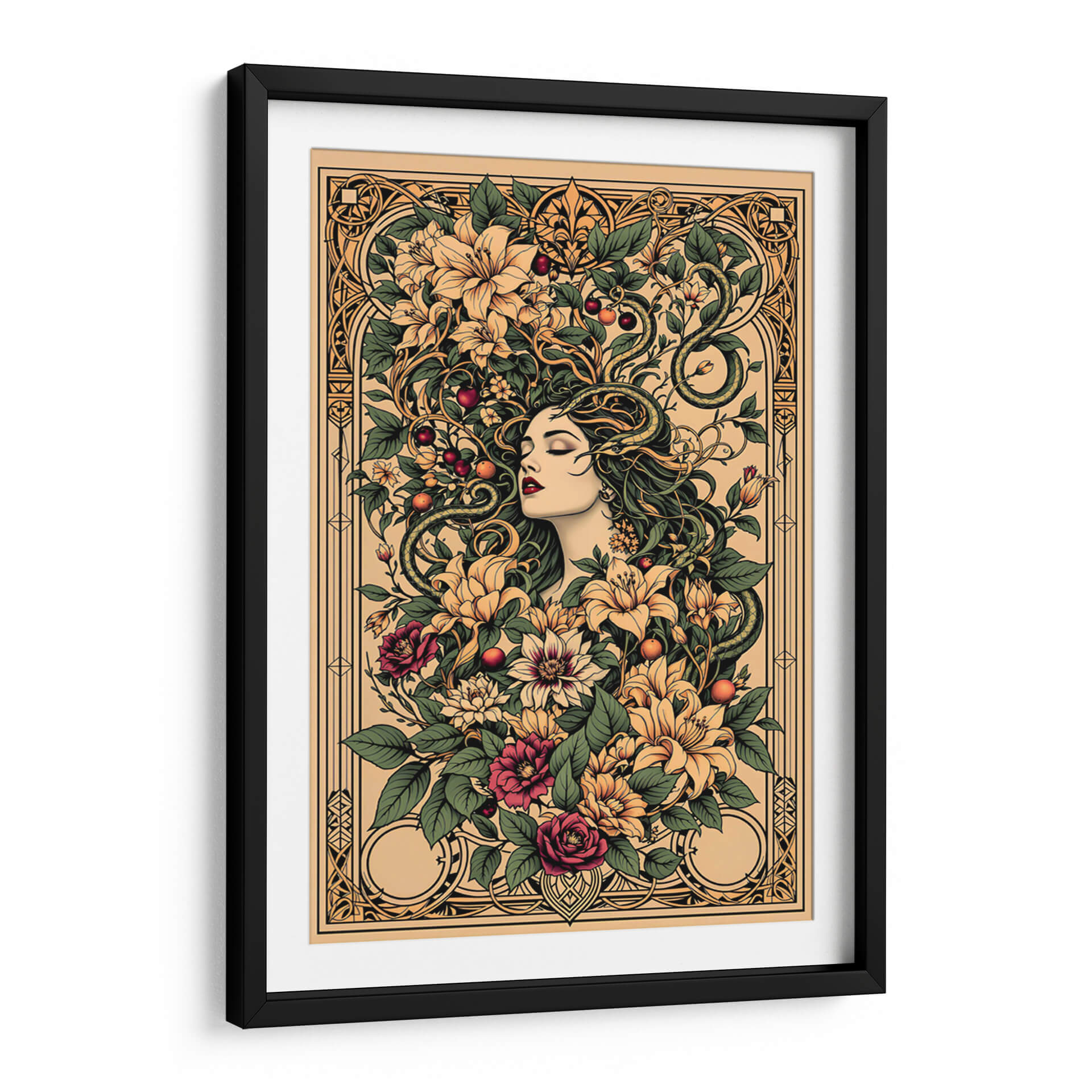 Sumérgete en la enigmática belleza de "Tattoo Art 004", una obra digital que fusiona la estética del arte del tatuaje con motivos botánicos exuberantes y una figura femenina serena. Esta pieza cautiva con su intrincado diseño, donde una mujer de rasgos delicados parece emerger de un torbellino de flores vibrantes y hojas verdes, entrelazadas con serpientes sinuosas que añaden un toque de misterio y dualidad. La paleta de colores, dominada por tonos tierra, ocres, verdes profundos y toques de carmesí y amarillo pálido, crea una atmósfera rica y sofisticada, evocando una sensación de conexión primordial con la naturaleza y lo esotérico. El estilo detallado, casi grabado, y la composición simétrica pero orgánica, invitan a la contemplación. Ideal para quienes buscan una decoración de pared con carácter, esta obra es perfecta para añadir un punto focal de elegancia y profundidad a salones modernos, estudios o incluso espacios que busquen un aire de misterio y sofisticación. "Tattoo Art 004" no es solo una imagen, es una invitación a explorar la simbología oculta y la belleza atemporal del arte que trasciende lo efímero.