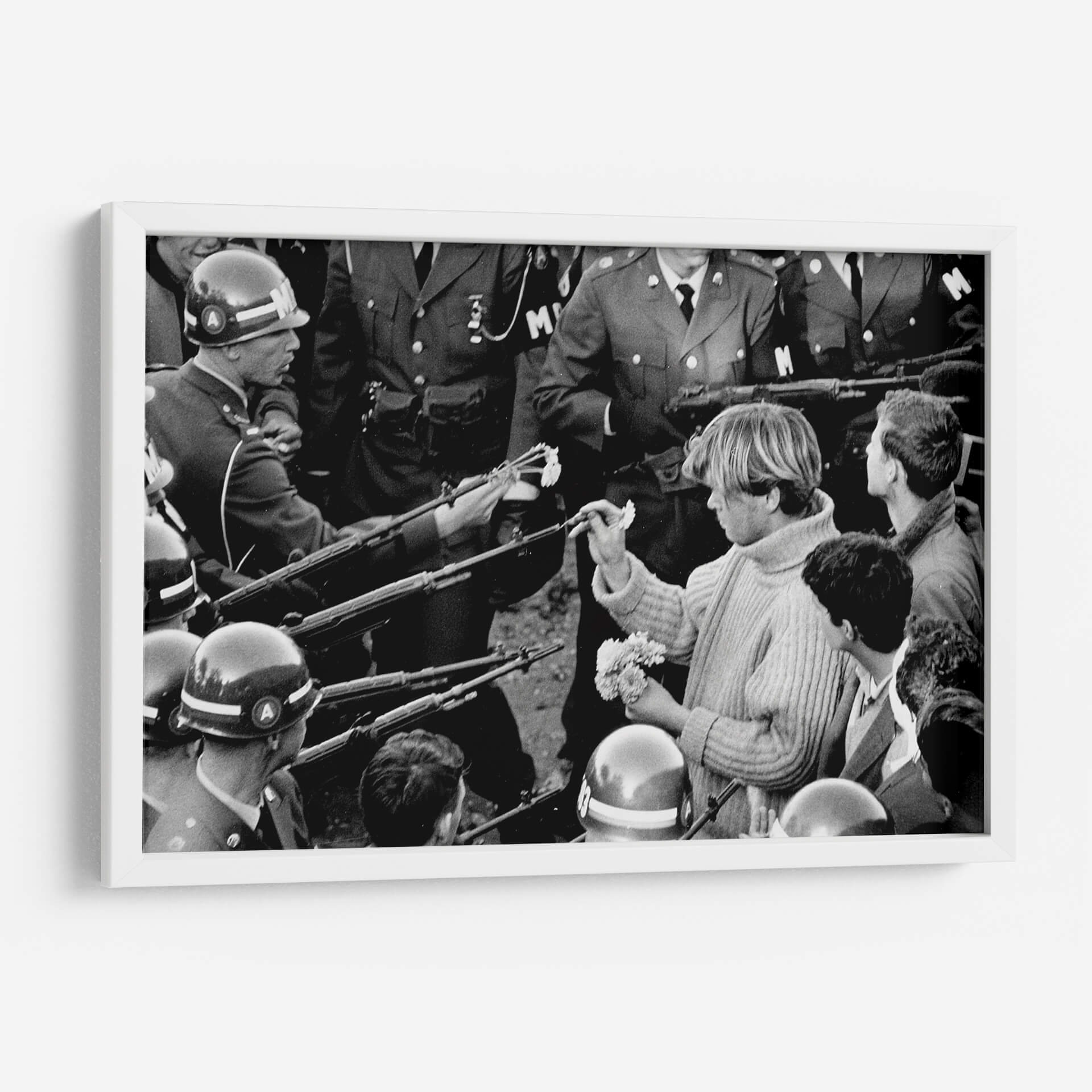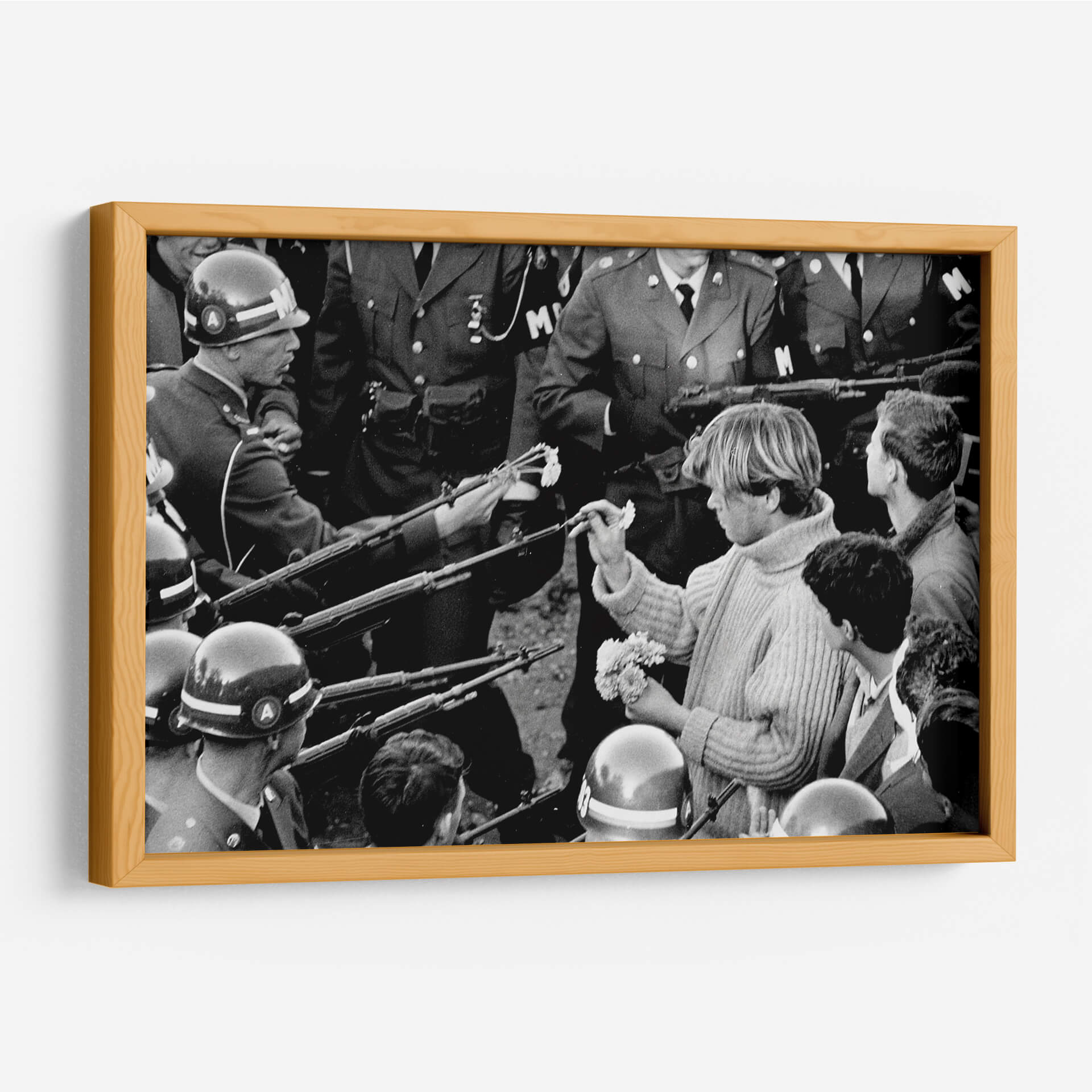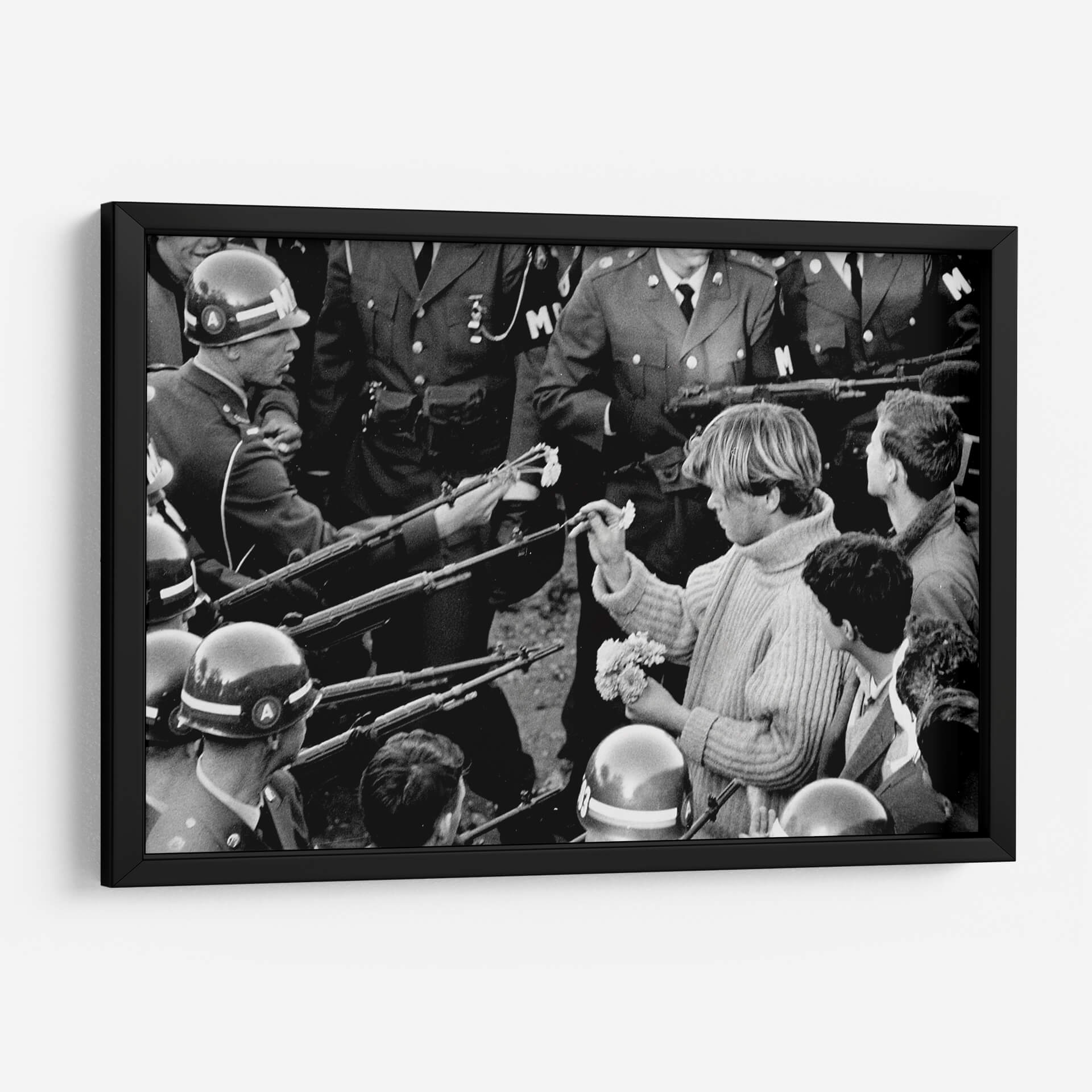 La obra "The Flower Power" captura un momento histórico de conmovedora humanidad y resistencia pacífica. Esta poderosa fotografía en blanco y negro representa un joven ofreciendo flores a soldados con armas, simbolizando el poder del amor y la no violencia frente a la confrontación. La composición tensa, pero esperanzadora, invita a la reflexión sobre el impacto de las acciones individuales en el curso de los acontecimientos. Es una pieza ideal para espacios que buscan inspirar diálogo y promover un mensaje de paz y unidad. Perfecta para salones, oficinas o áreas de recepción, este cuadro decorativo añadirá profundidad y significado a tu decoración, evocando emociones de esperanza y valentía. Su estética atemporal la convierte en una adición significativa a cualquier colección de arte que celebre la resiliencia del espíritu humano.