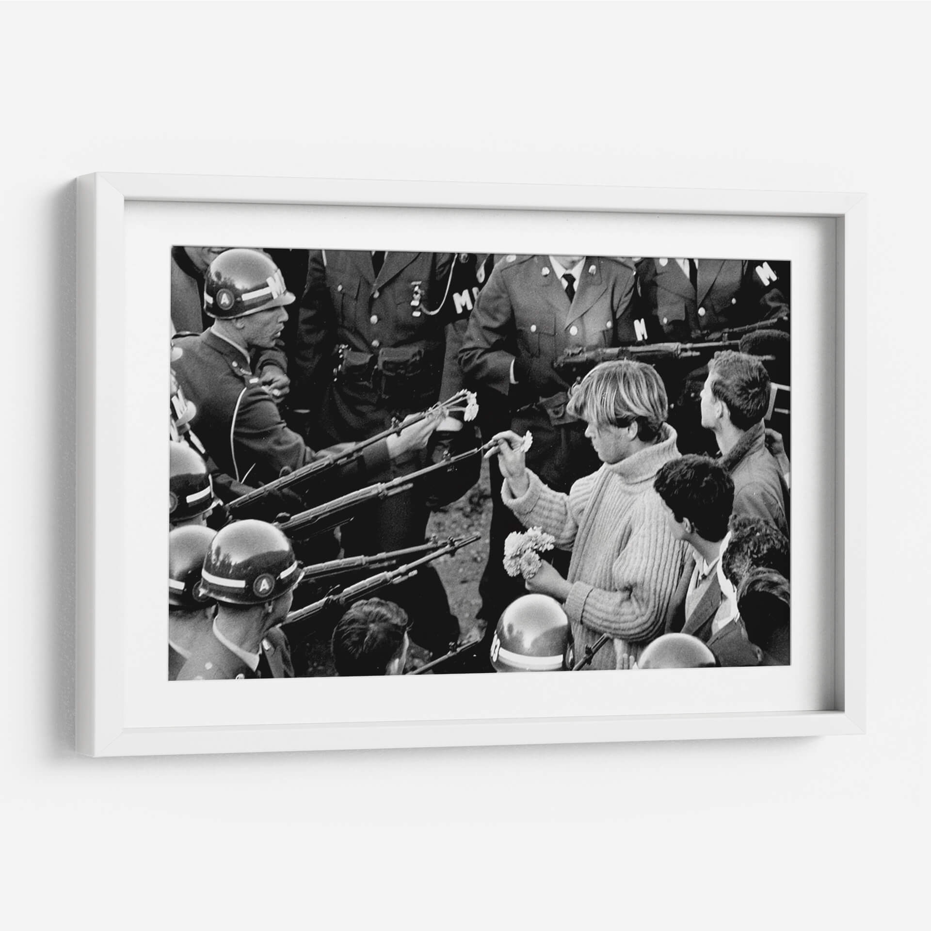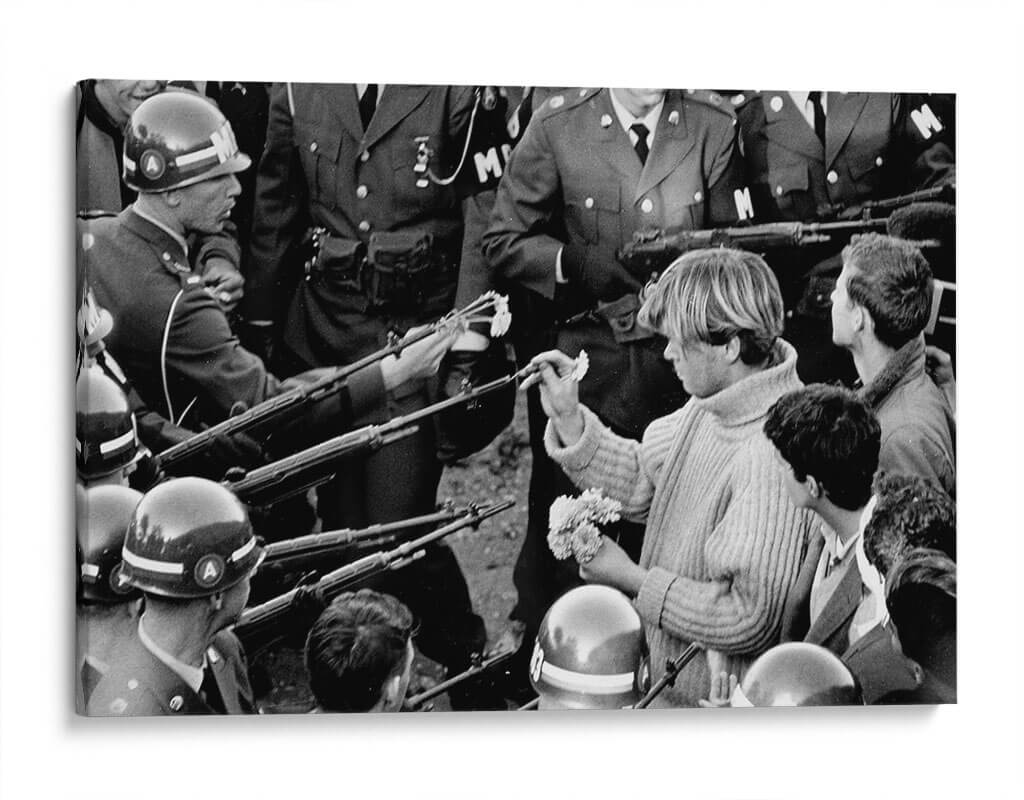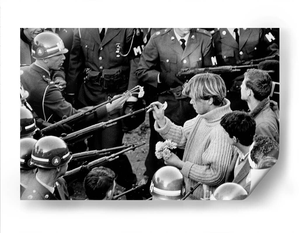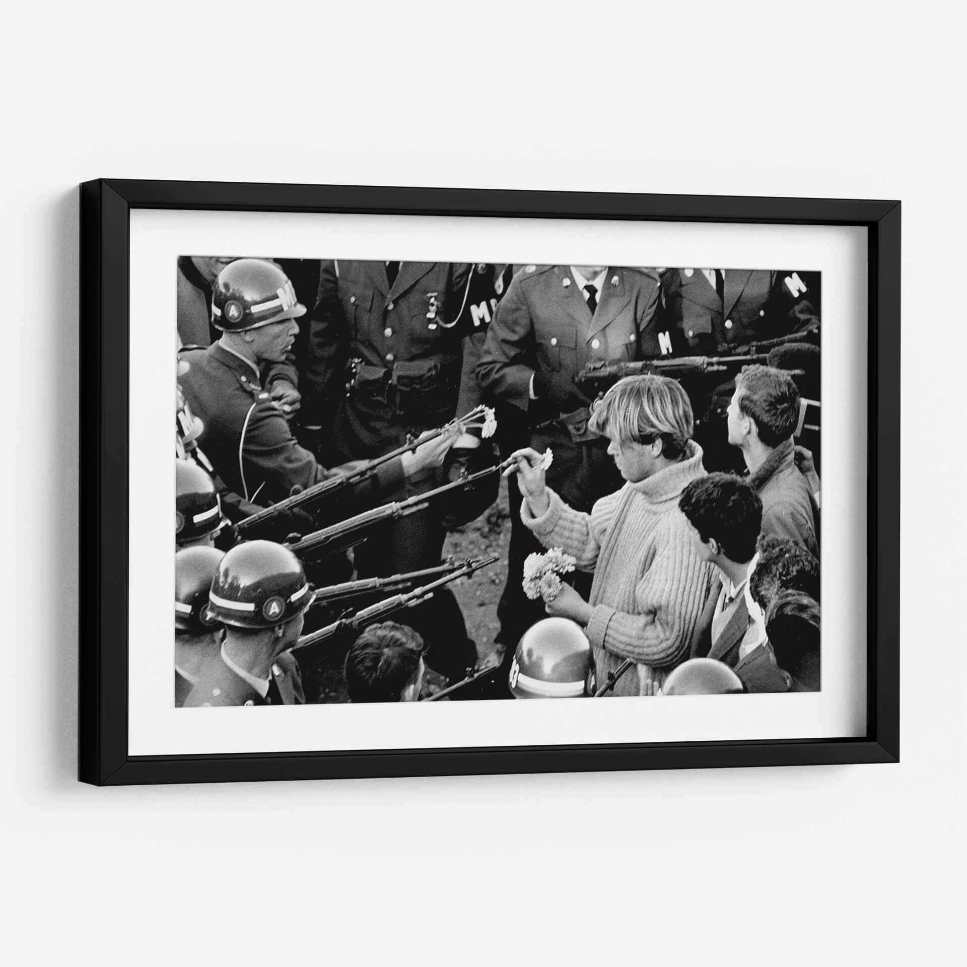 La obra "The Flower Power" captura un momento histórico de conmovedora humanidad y resistencia pacífica. Esta poderosa fotografía en blanco y negro representa un joven ofreciendo flores a soldados con armas, simbolizando el poder del amor y la no violencia frente a la confrontación. La composición tensa, pero esperanzadora, invita a la reflexión sobre el impacto de las acciones individuales en el curso de los acontecimientos. Es una pieza ideal para espacios que buscan inspirar diálogo y promover un mensaje de paz y unidad. Perfecta para salones, oficinas o áreas de recepción, este cuadro decorativo añadirá profundidad y significado a tu decoración, evocando emociones de esperanza y valentía. Su estética atemporal la convierte en una adición significativa a cualquier colección de arte que celebre la resiliencia del espíritu humano.