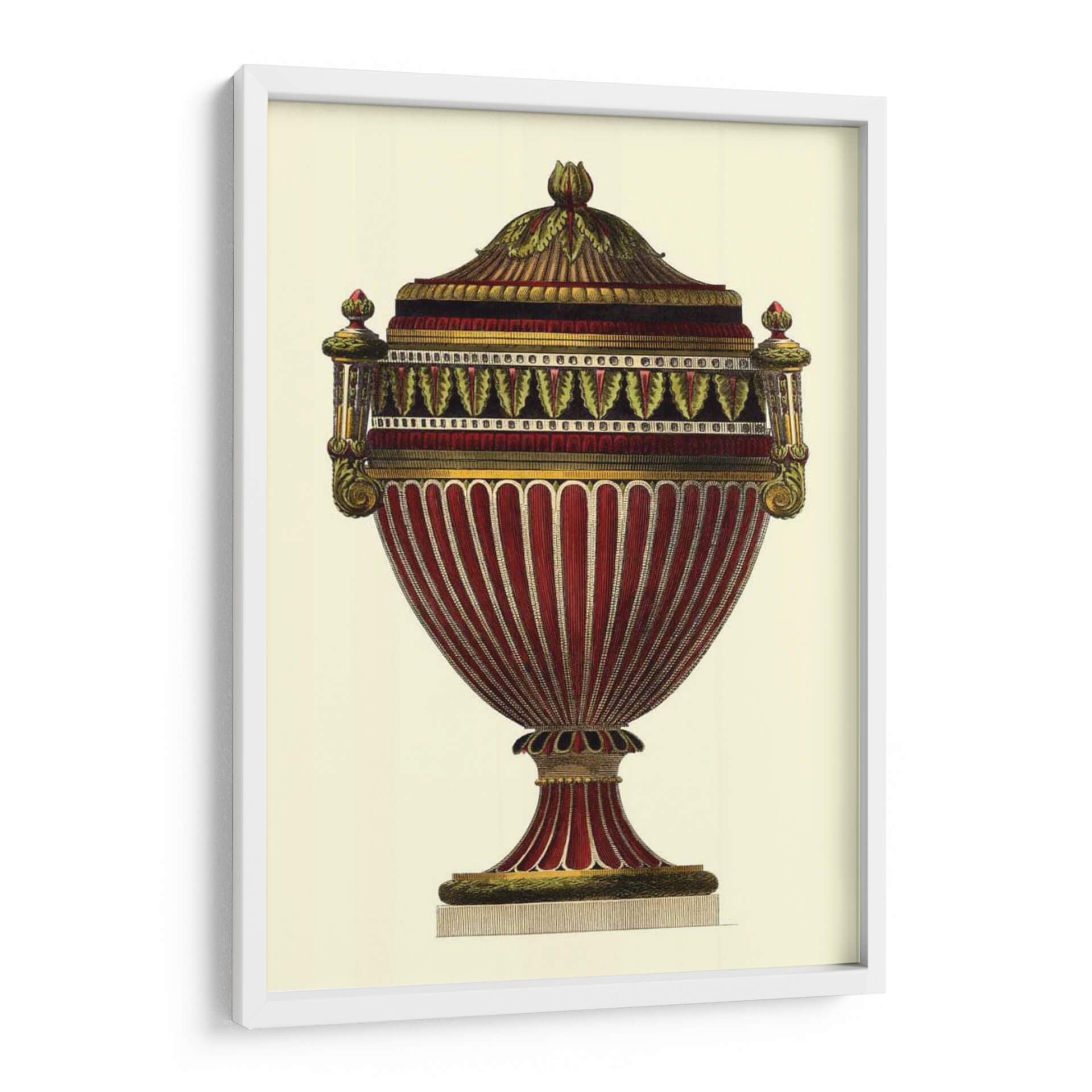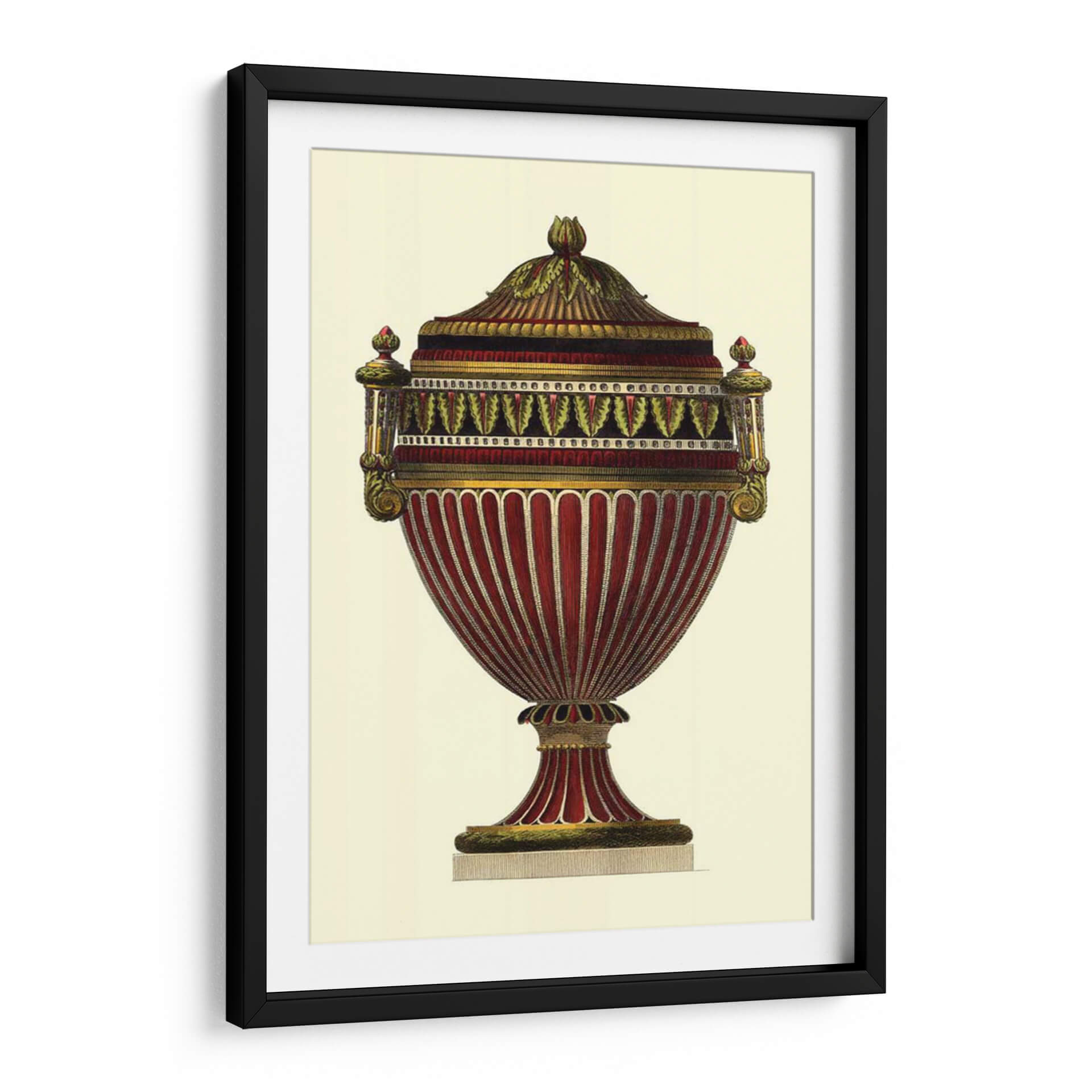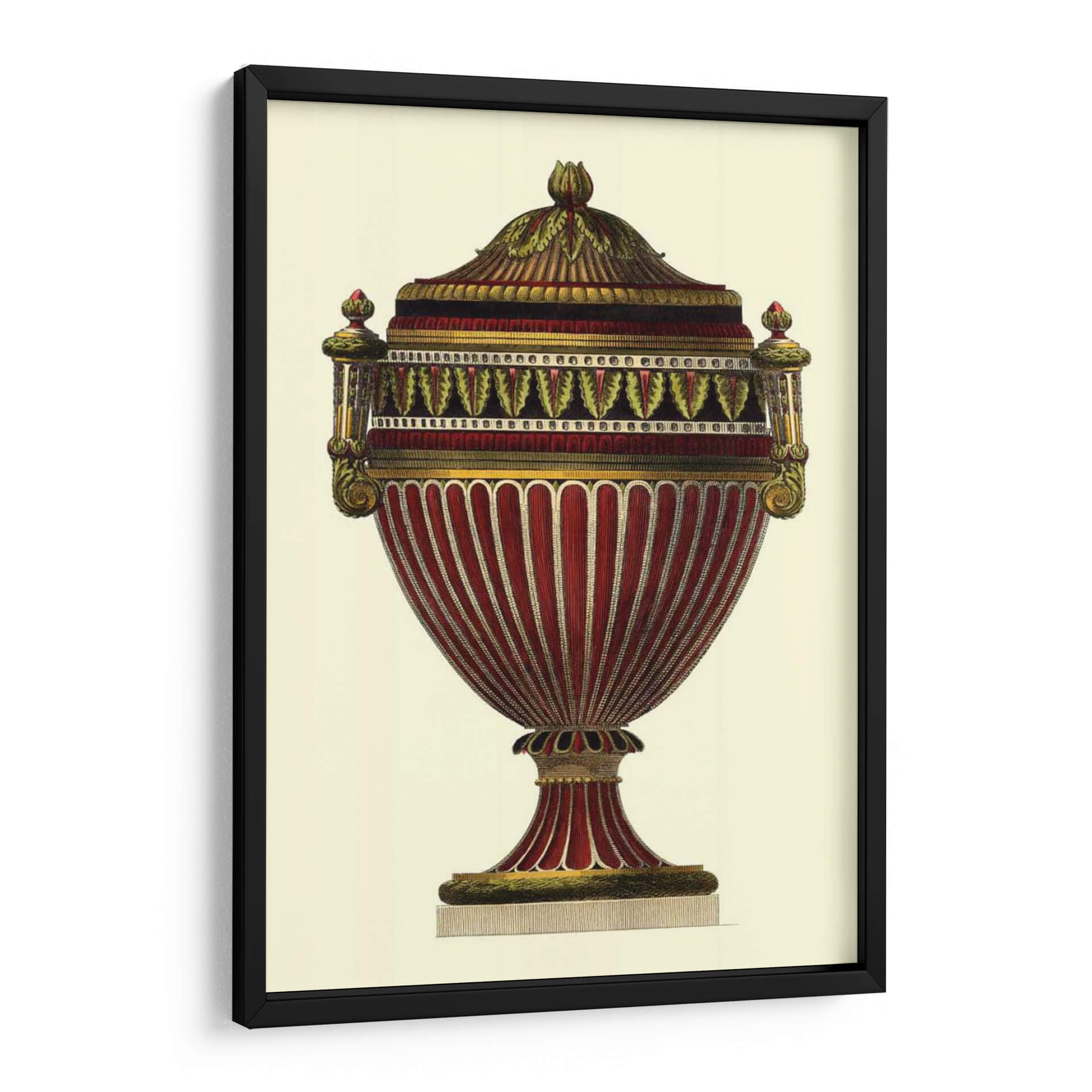 Este cuadro decorativo, titulado 'Urna II Imperio' por Vision Studio, es una pieza que evoca la grandeza y la opulencia de épocas pasadas. La obra presenta una detallada representación de una urna ornamentada, destacando su forma voluminosa y majestuosa. La paleta de colores se centra en intensos tonos de rojo carmesí, acentuados con dorados brillantes y toques de verde esmeralda en los detalles ornamentales. Las finas líneas plateadas que recorren el cuerpo de la urna crean un efecto de profundidad y sofisticación, imitando la caída de pliegues o la textura de la tela preciosa. La composición es simétrica y centrada, lo que confiere a la pieza una sensación de estabilidad y equilibrio clásico. La ornamentación detallada en la tapa y la base, junto con los elementos decorativos dorados y verdes, sugieren un estilo neoclásico o imperial, añadiendo un aire de lujo y refinamiento. Este cuadro decorativo es ideal para espacios que buscan un toque de elegancia atemporal, como salones formales, comedores o estudios. Su presencia puede transformar cualquier ambiente, aportando carácter y un punto de interés visual que invita a la contemplación. Perfecto para quienes aprecian el arte con historia y la maestría en la representación de objetos icónicos, 'Urna II Imperio' es una elección segura para quienes desean imprimir distinción y un legado de esplendor en su decoración.