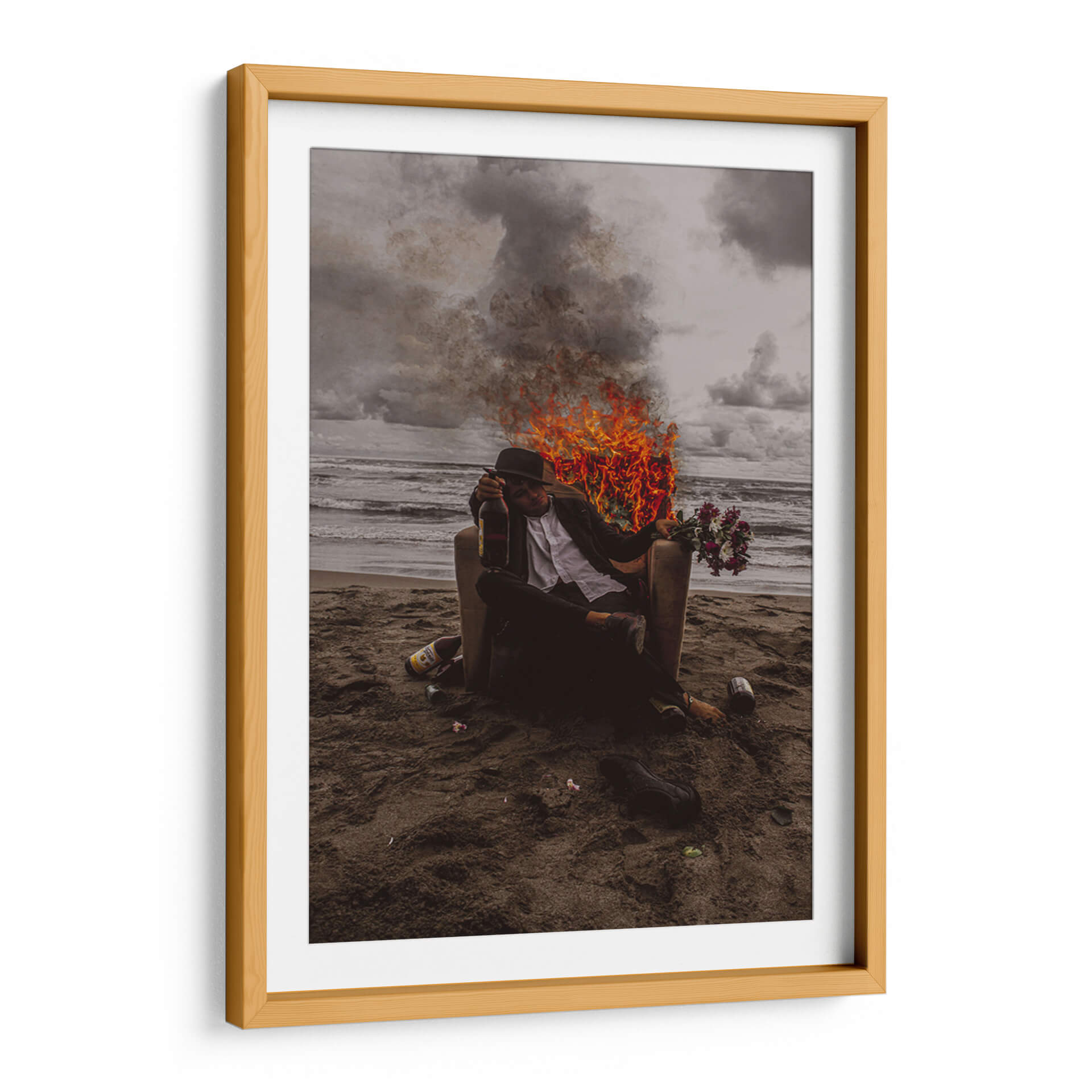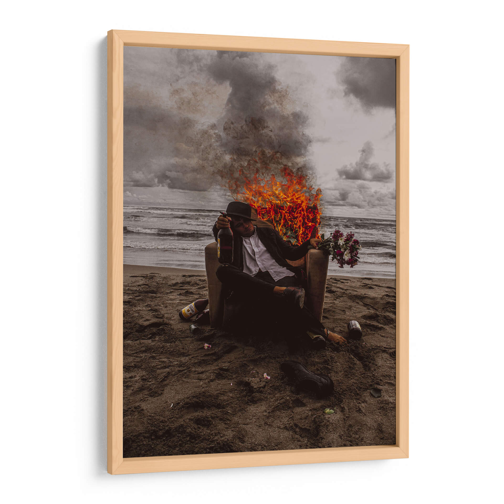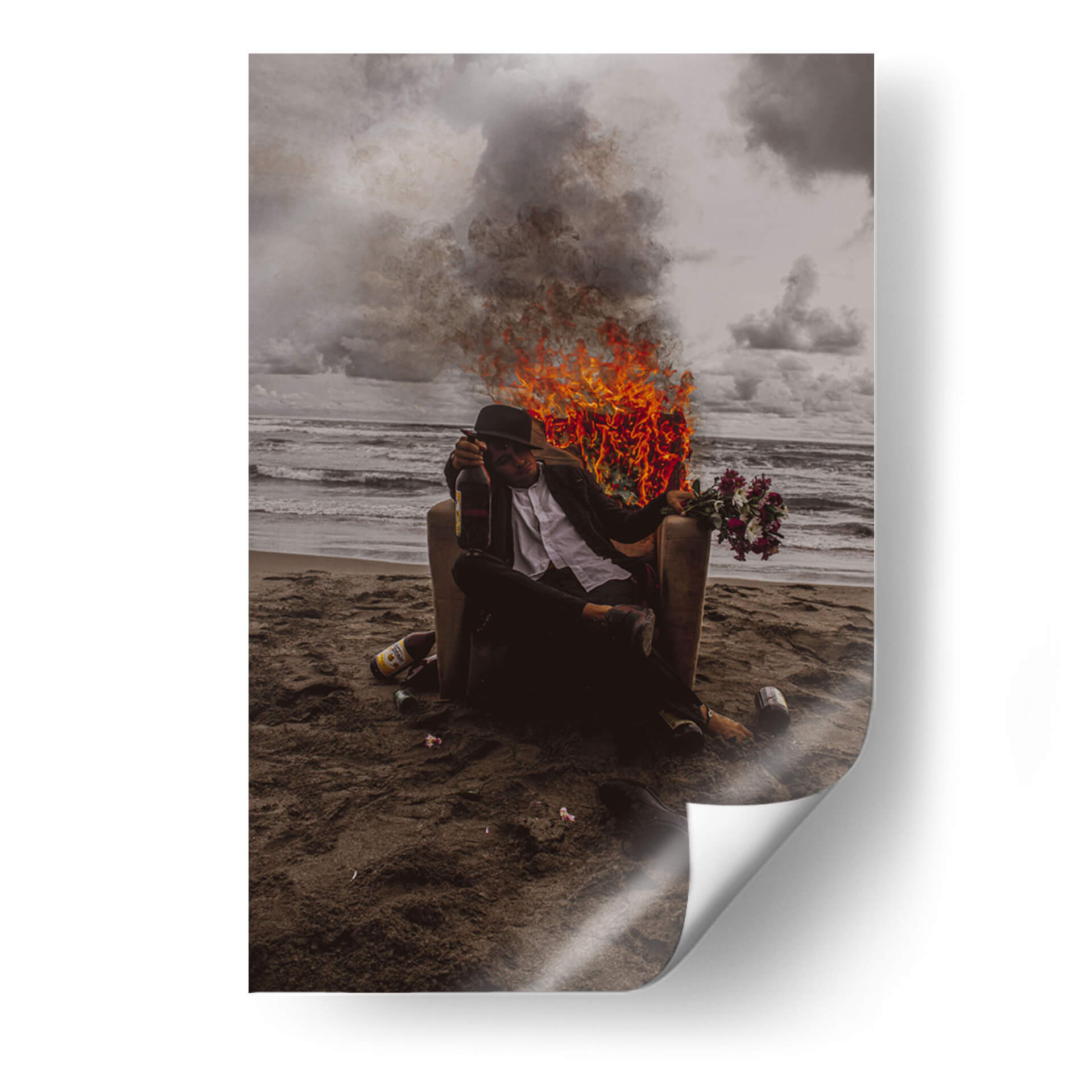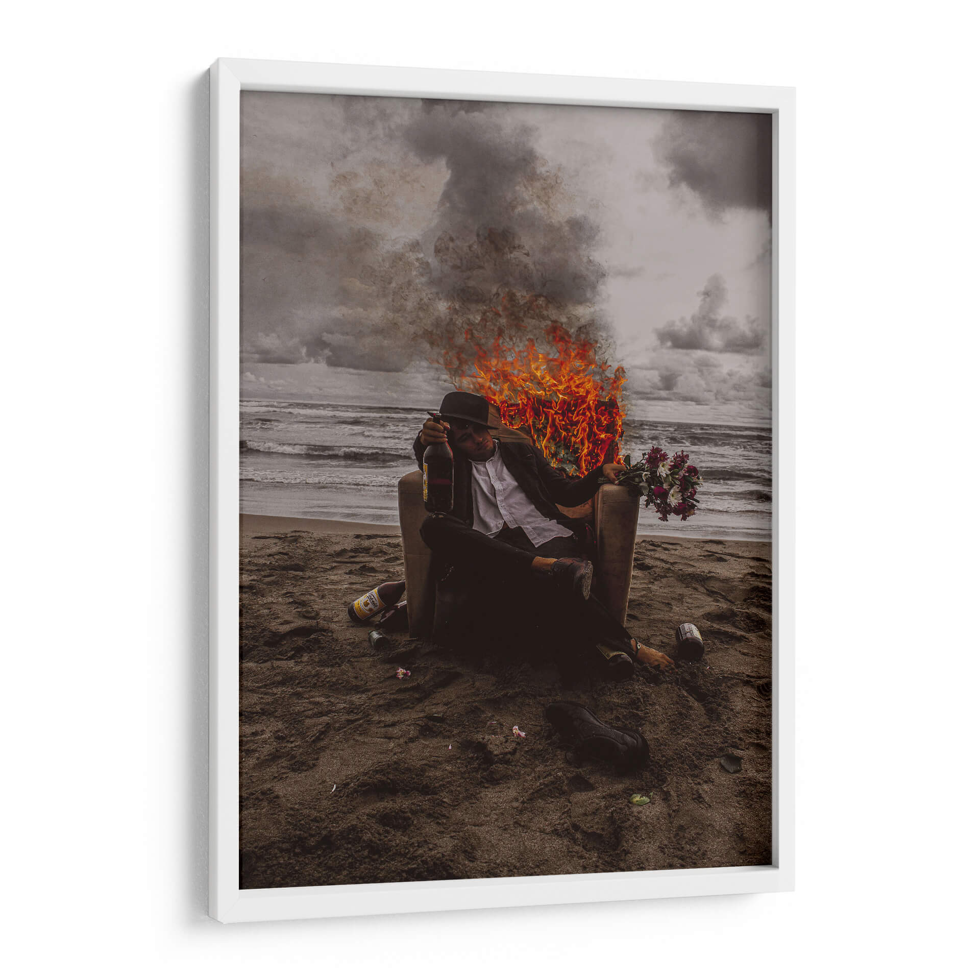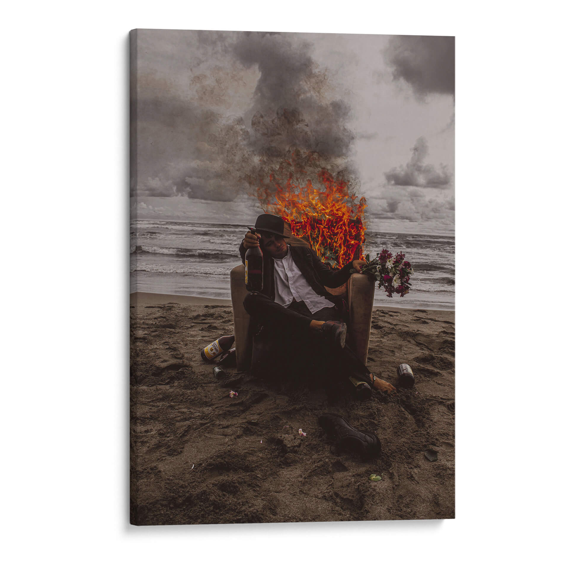 Sumérgete en la intensidad y el simbolismo de "Vicios", una obra de arte contemporáneo que captura un momento crudo y poderoso. La pieza presenta a una figura solitaria sentada en una silla en una playa desolada, rodeada por el caos de llamas y humo que contrastan con la calma del océano al fondo. La paleta de colores, dominada por tonos oscuros, grises y el vibrante naranja del fuego, crea una atmósfera de introspección y conflicto interno. Este cuadro decorativo es una declaración audaz para cualquier espacio, ideal para añadir un toque de drama y reflexión a salas de estar modernas, estudios o incluso oficinas que buscan inspiración en el arte. La composición, con la figura central enmarcada por el telón de fondo natural y los elementos de destrucción, invita a la contemplación sobre la naturaleza humana y las pasiones. "Vicios" no es solo una imagen, es una experiencia visual que provocará conversación y añadirá profundidad a tu decoración.