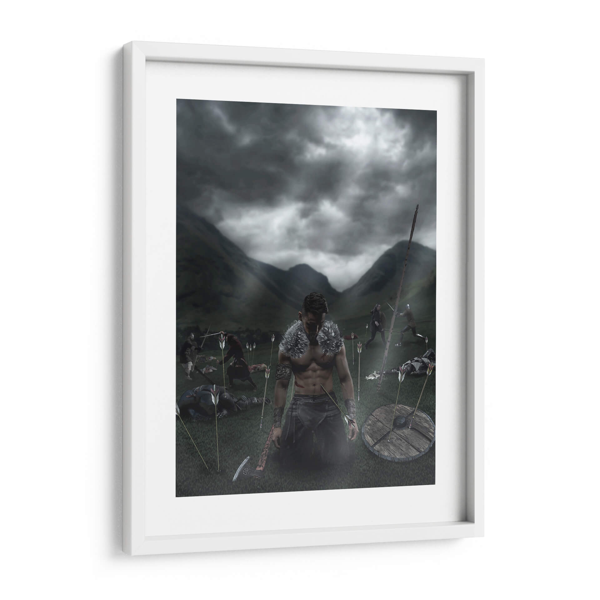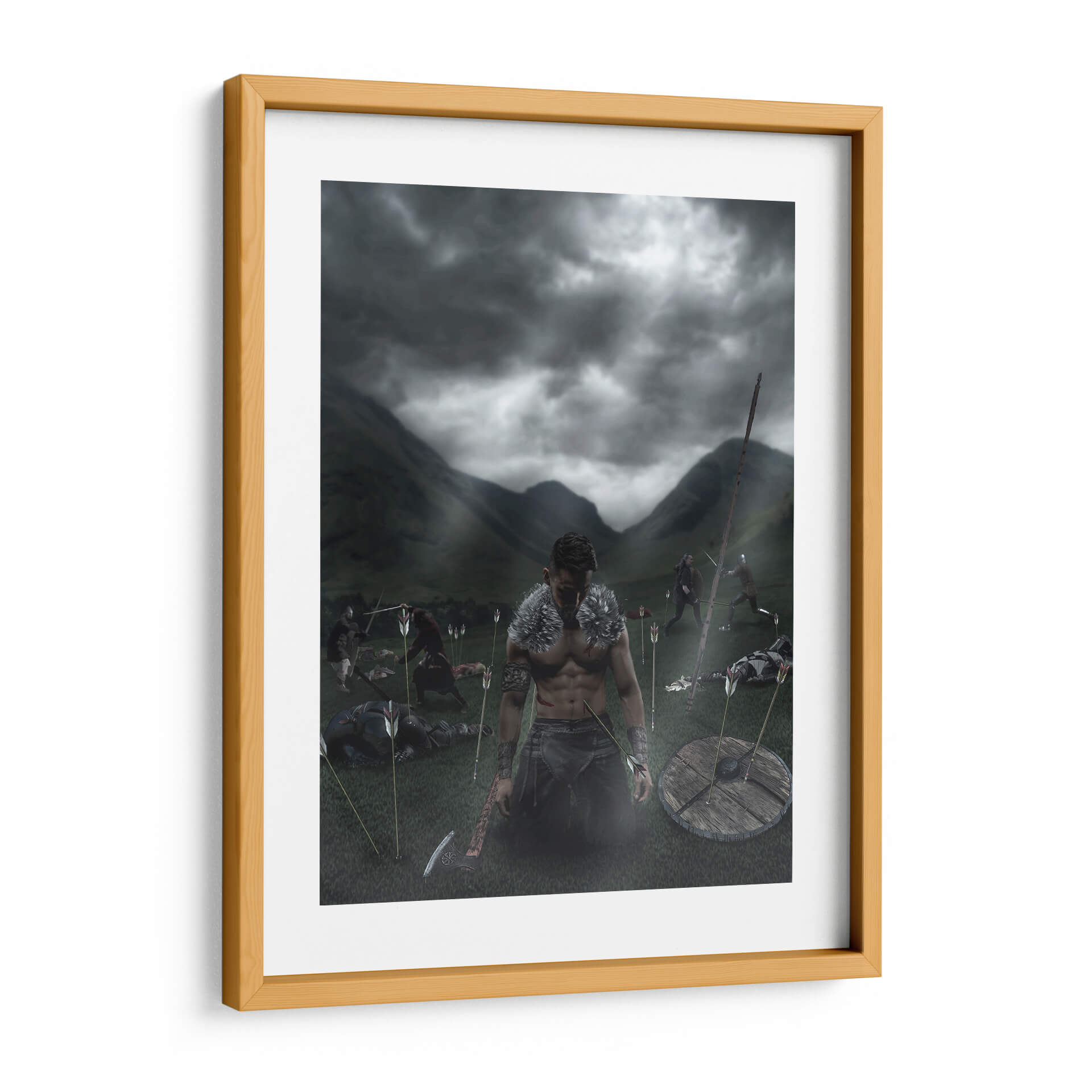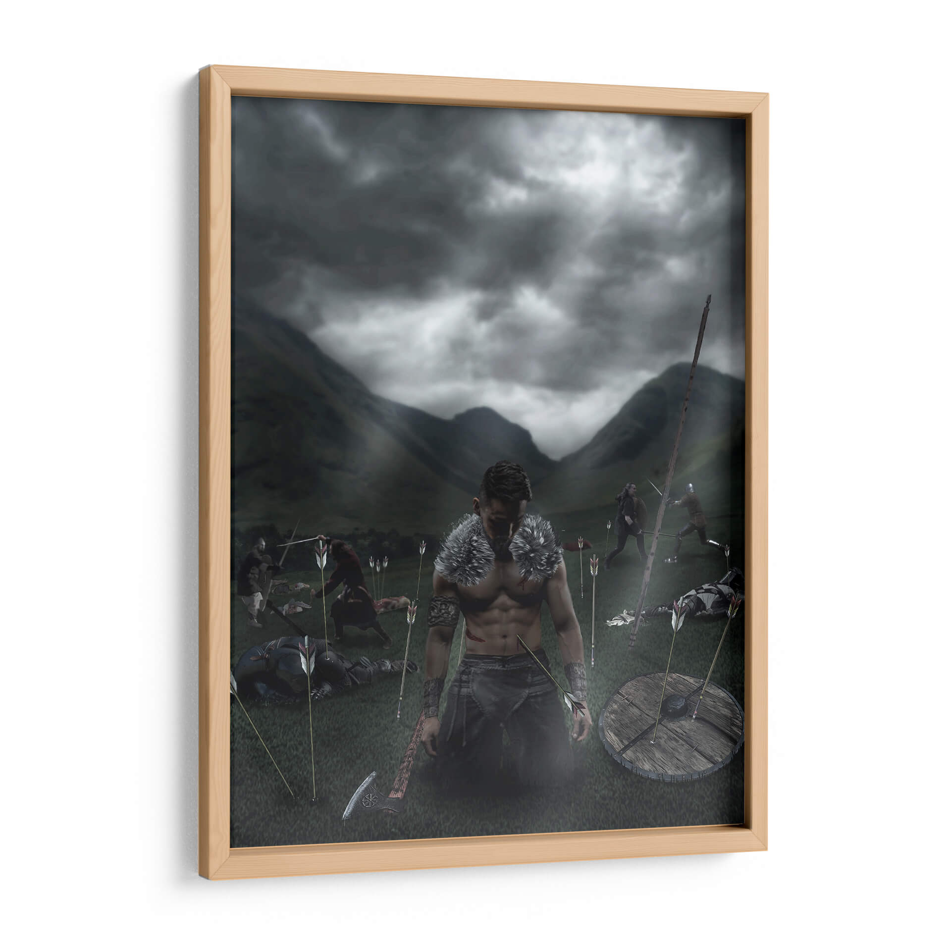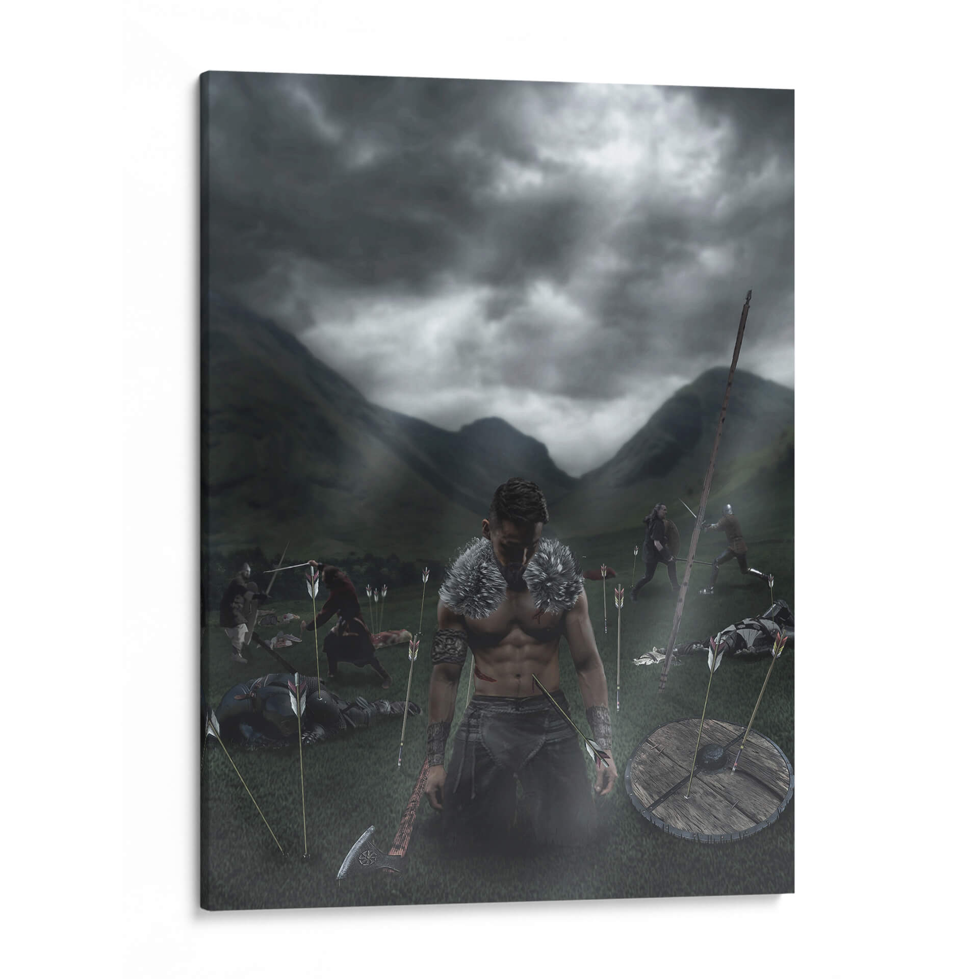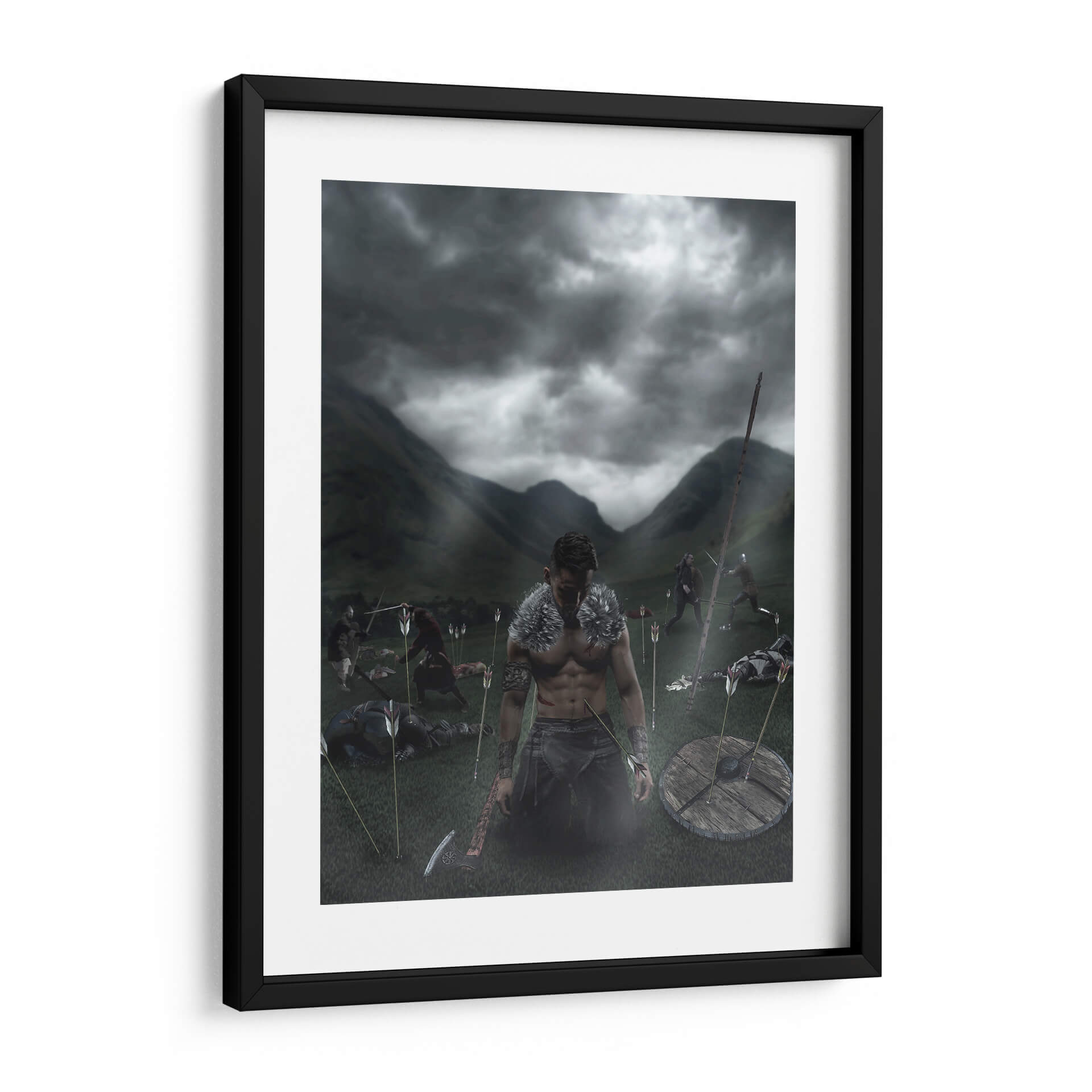 Sumérgete en la cruda y épica escena de batalla con "Viking", una obra de arte digital que captura la esencia de la guerra nórdica. La pieza central presenta a un guerrero vikingo formidable, rodilla en tierra en medio de un campo de batalla desolado, rodeado de flechas caídas y escudos. El artista GaryML ha utilizado una paleta de colores sombría y dramática, dominada por grises, verdes oscuros y toques de marrón terroso, acentuada por la niebla y los rayos de luz que atraviesan un cielo tormentoso. La composición es poderosa, con el guerrero en primer plano como símbolo de resistencia y fortaleza ante la adversidad. El estilo digital realista y la atmósfera de tensión y determinación hacen de este cuadro decorativo una pieza ideal para espacios que buscan un toque de fuerza, historia y carácter. Perfecto para salones modernos, estudios o cualquier área que necesite un punto focal audaz y una narrativa visual cautivadora. Este cuadro evoca sentimientos de coraje, sacrificio y la indomable voluntad del espíritu humano, convirtiéndolo en una adición impactante a tu decoración.