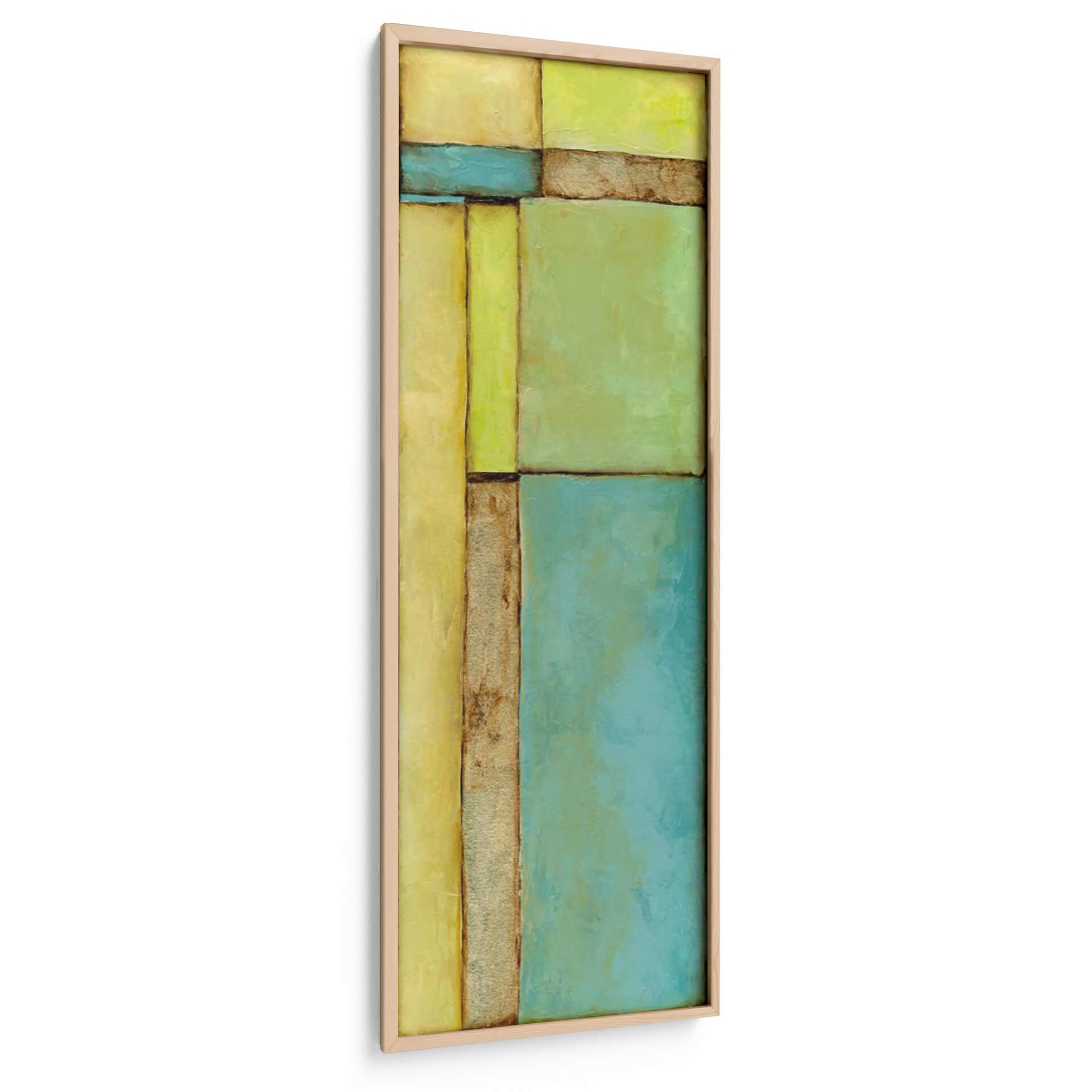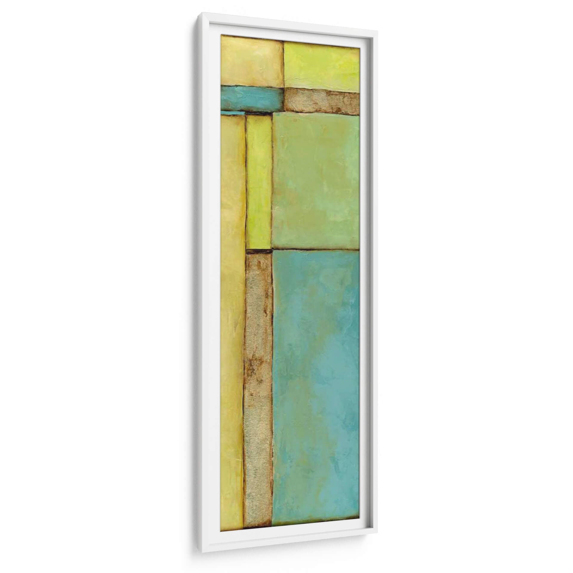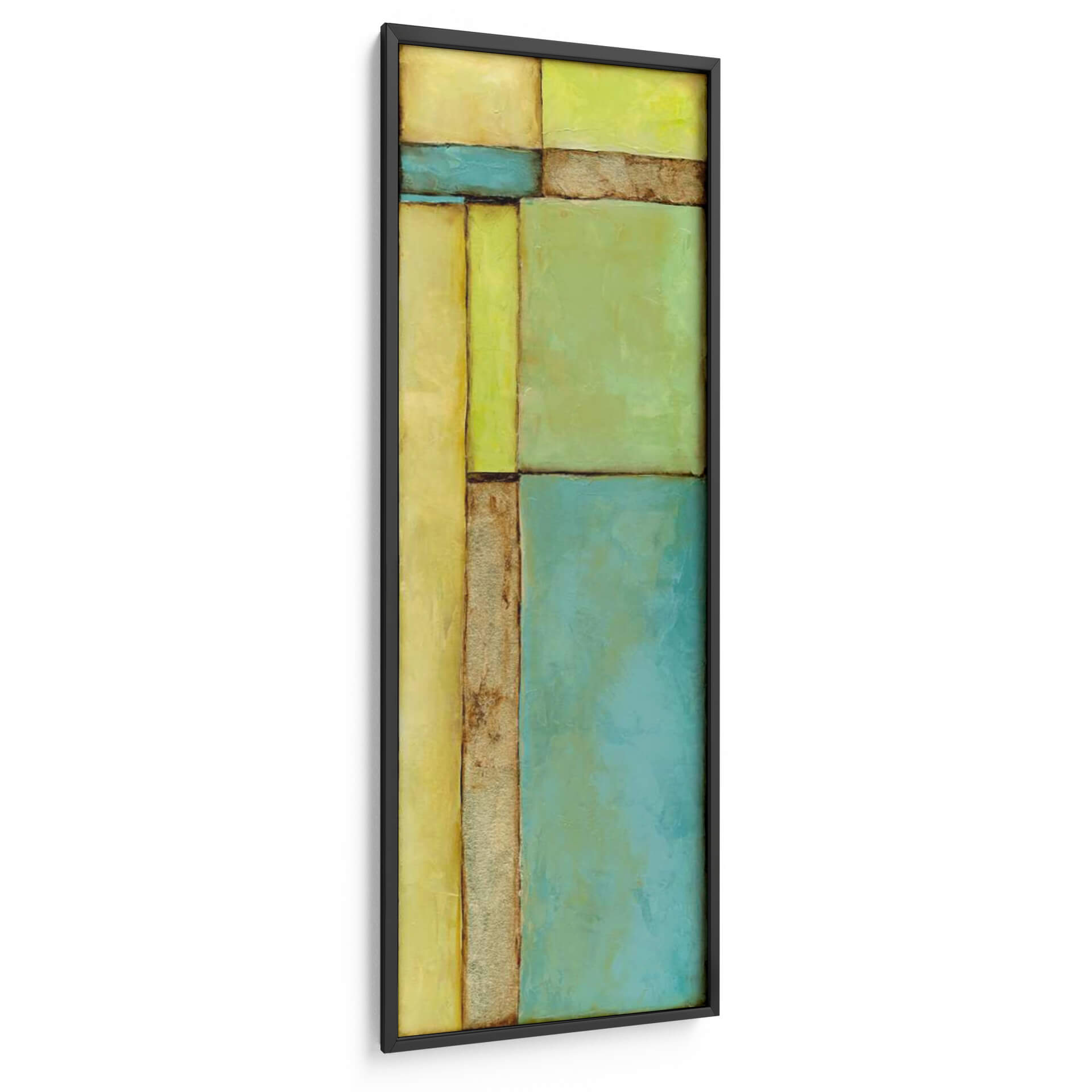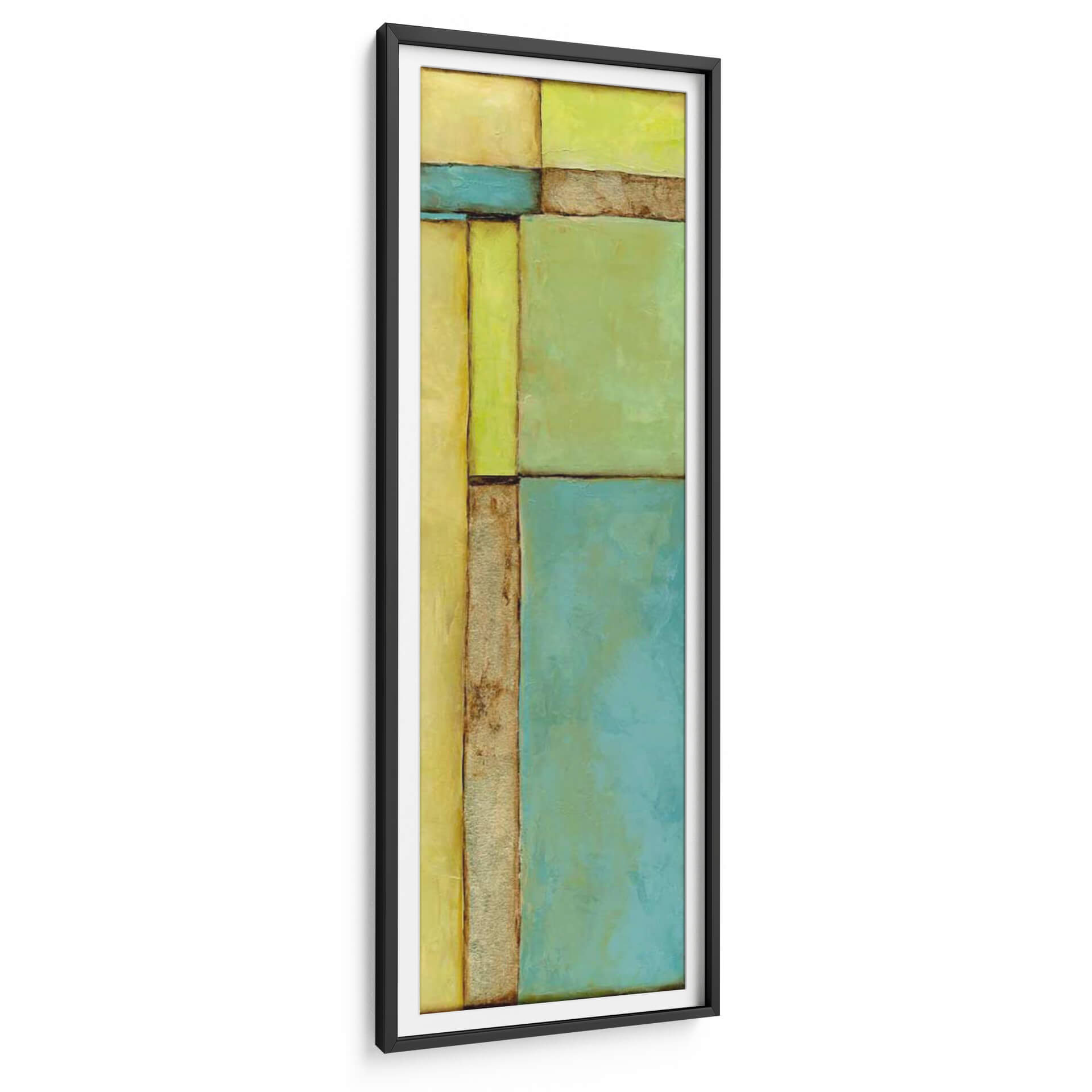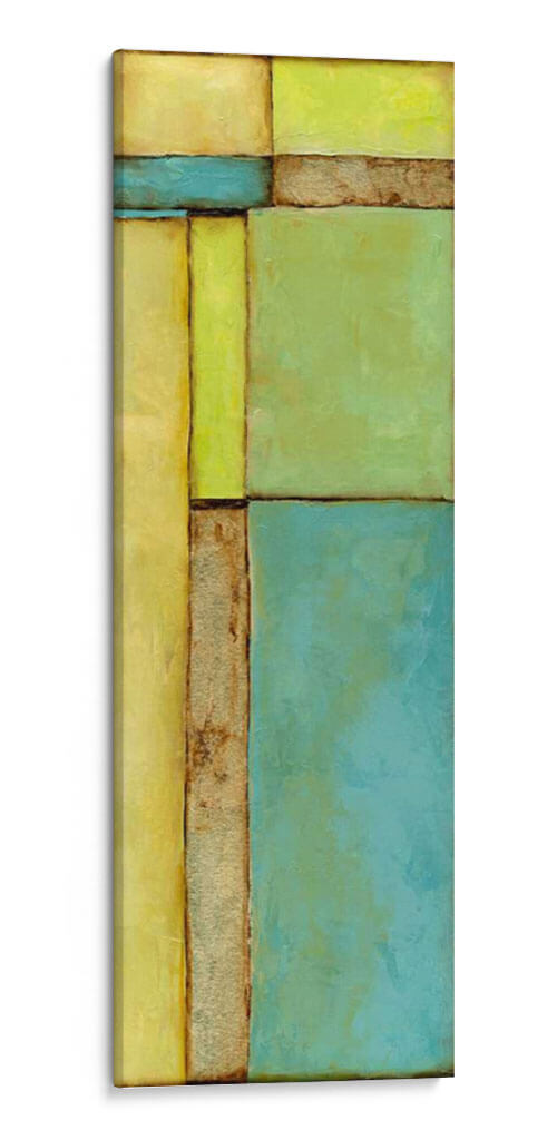 Sumérgete en la serenidad y el equilibrio visual de "Vitral VI", una cautivadora obra de arte abstracto de Jennifer Goldberger. Esta pieza se distingue por su composición geométrica audaz, que evoca la estructura y la luz de un vitral moderno. La paleta de colores, dominada por tonos cálidos de amarillo y verde vibrante, se complementa elegantemente con franjas de azul sereno y texturas terrosas, creando una atmósfera de calma y sofisticación. Las formas rectangulares y cuadradas se interconectan, guiando la mirada del espectador a través de un juego de luces y sombras sutiles. El estilo abstracto de la obra permite una interpretación personal, invitando a la reflexión y al disfrute estético. "Vitral VI" es una elección excepcional para quienes buscan infundir sus espacios con una energía positiva y un toque de arte contemporáneo. Ideal para salas de estar, oficinas o cualquier ambiente que desee una declaración visual tranquila pero impactante. Este cuadro decorativo es perfecto para añadir un punto de interés y modernidad a tu decoración, transformando cualquier pared en una galería personal. Deja que las líneas limpias y los colores armoniosos de esta pieza inspiren tu día a día.