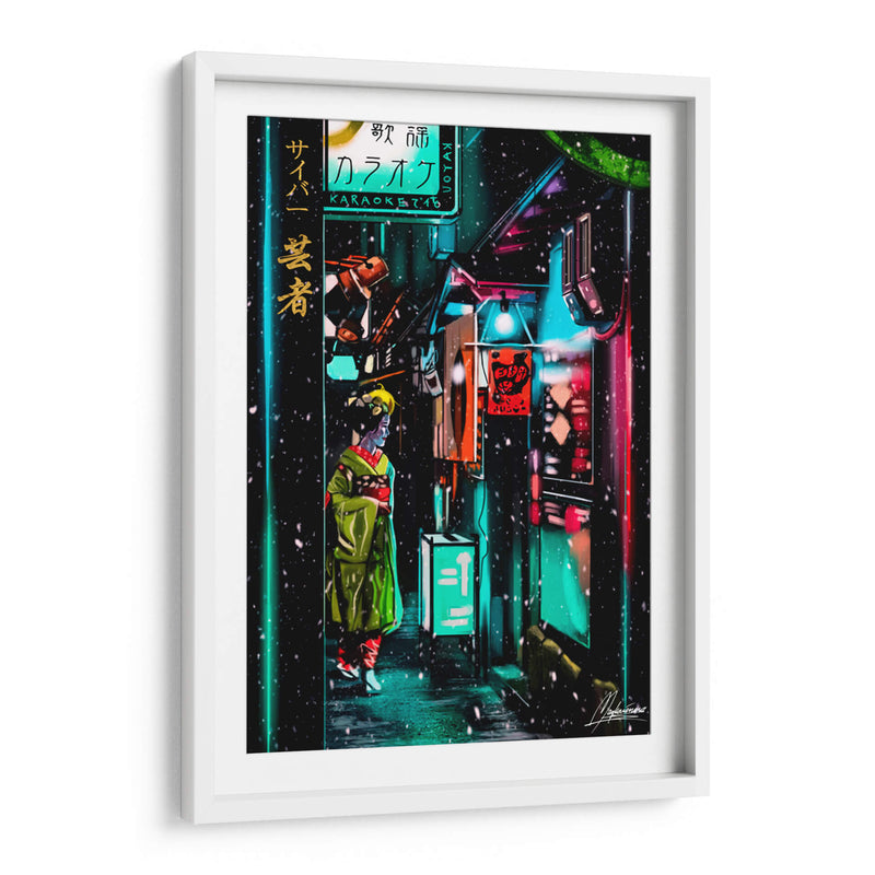 Sumérgete en el vibrante y enigmático mundo de "CYBER GEISHA" de Mayka ienova, una obra de arte digital que fusiona la estética tradicional japonesa con un toque futurista y ciberpunk. La pieza presenta a una geisha en un callejón urbano bañado por la luz neón de letreros en japonés, con una atmósfera de noche lluviosa o nevada que añade un velo de misterio. Los colores dominantes son azules eléctricos, verdes intensos y rojos vibrantes, creando un contraste cautivador que atrae la mirada. La composición, centrada en la figura de la geisha, invita a la reflexión sobre la coexistencia de lo antiguo y lo moderno, lo orgánico y lo tecnológico. Este cuadro decorativo es perfecto para quienes buscan añadir un toque de intriga y sofisticación a su hogar u oficina. Ideal para espacios que buscan un punto focal audaz y moderno, como salones contemporáneos, estudios o incluso dormitorios con un estilo urbano. "CYBER GEISHA" no es solo una imagen, es una invitación a explorar un universo donde la tradición se encuentra con la vanguardia, convirtiendo cualquier pared en una ventana a una narrativa visual fascinante y llena de energía.