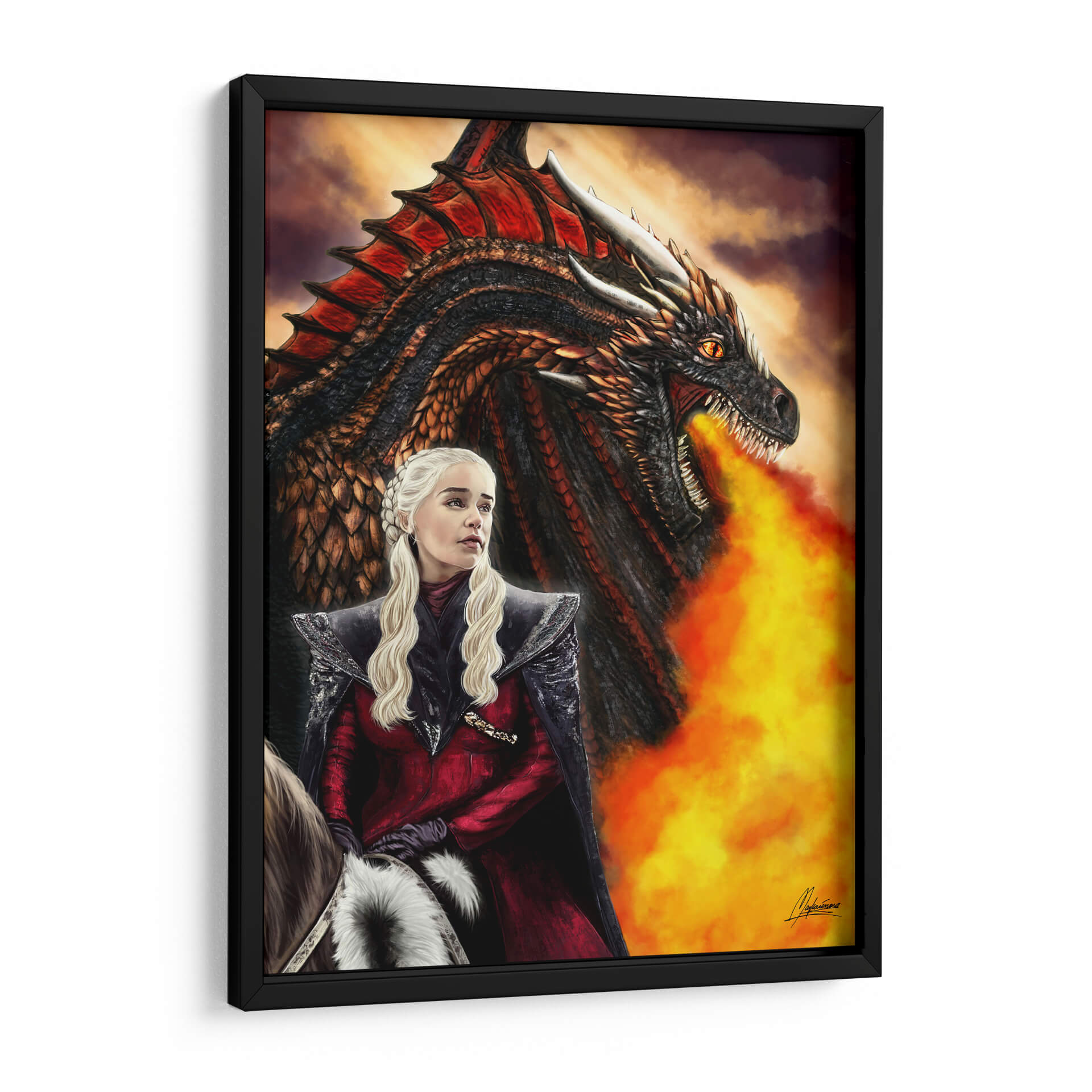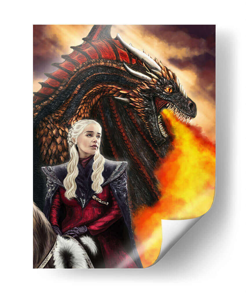 Sumérgete en la épica fantasía con este impactante cuadro decorativo 'DRACARYS' de Mayka ienova. La obra captura un momento de poder y determinación, presentando a una figura femenina icónica montada a caballo, con la mirada fija en el horizonte, mientras un formidable dragón exhala llamas intensas a su lado. La paleta de colores se centra en tonos cálidos y dramáticos, con el rojo vibrante del traje de la protagonista y el fuego contrastando con los tonos oscuros y texturizados del dragón y el cielo tormentoso. El estilo realista y detallado de la ilustración evoca una atmósfera de coraje y fuerza imparable. Este cuadro es ideal para añadir un toque de heroísmo y misticismo a tu sala de estar, estudio u oficina. Es una pieza perfecta para los amantes de las historias épicas y el arte visualmente cautivador, creando un punto focal que no pasará desapercibido y que invita a la contemplación de la valentía y la magia.