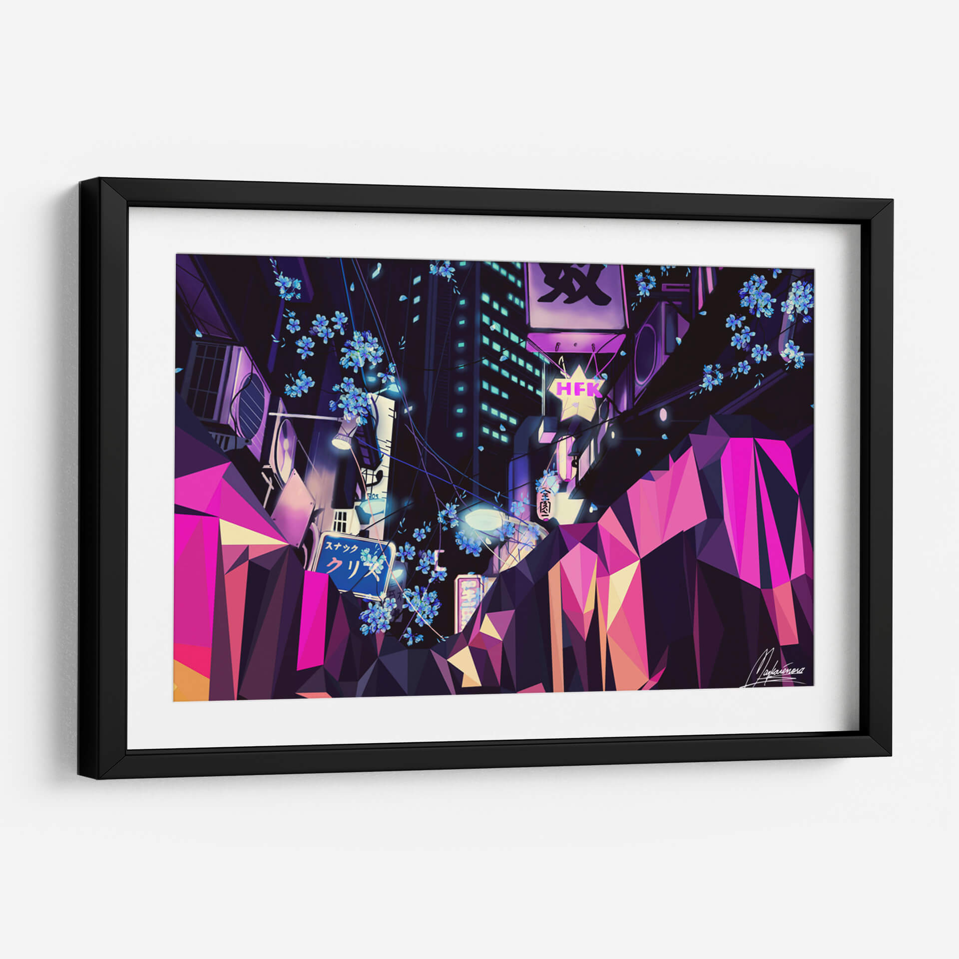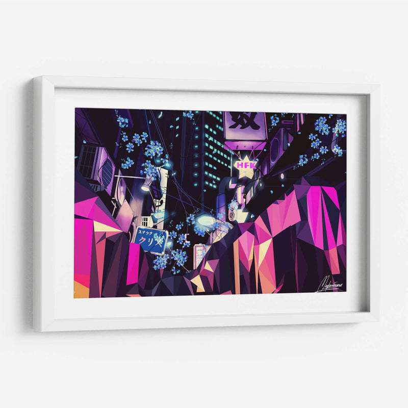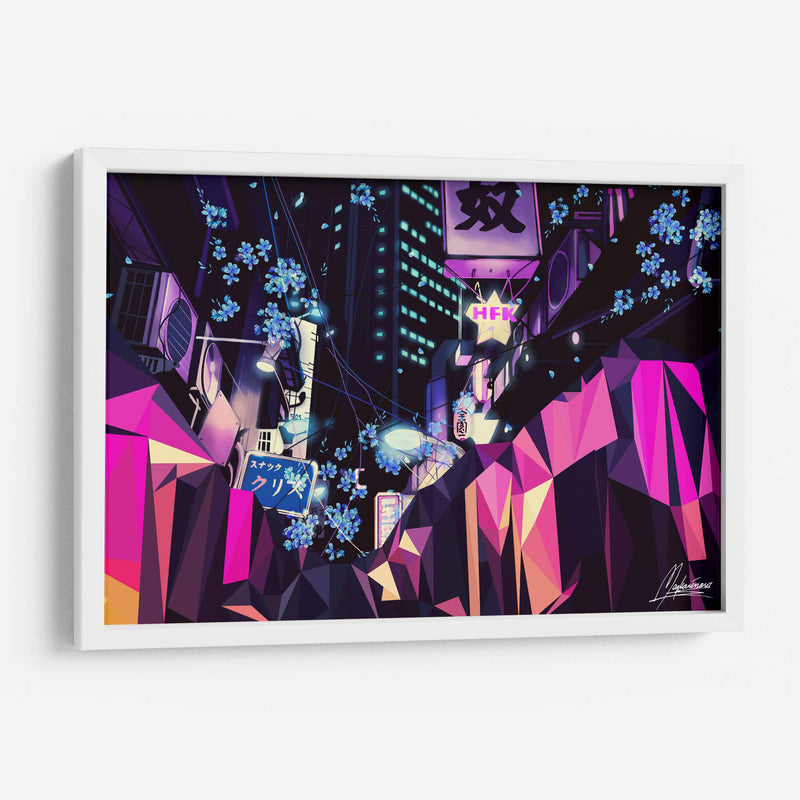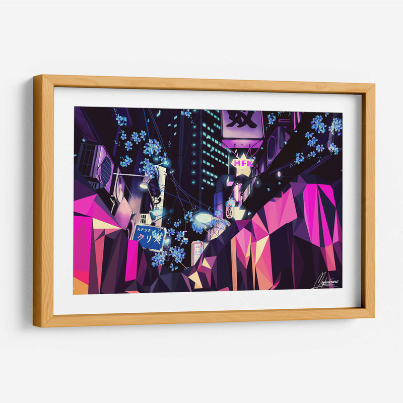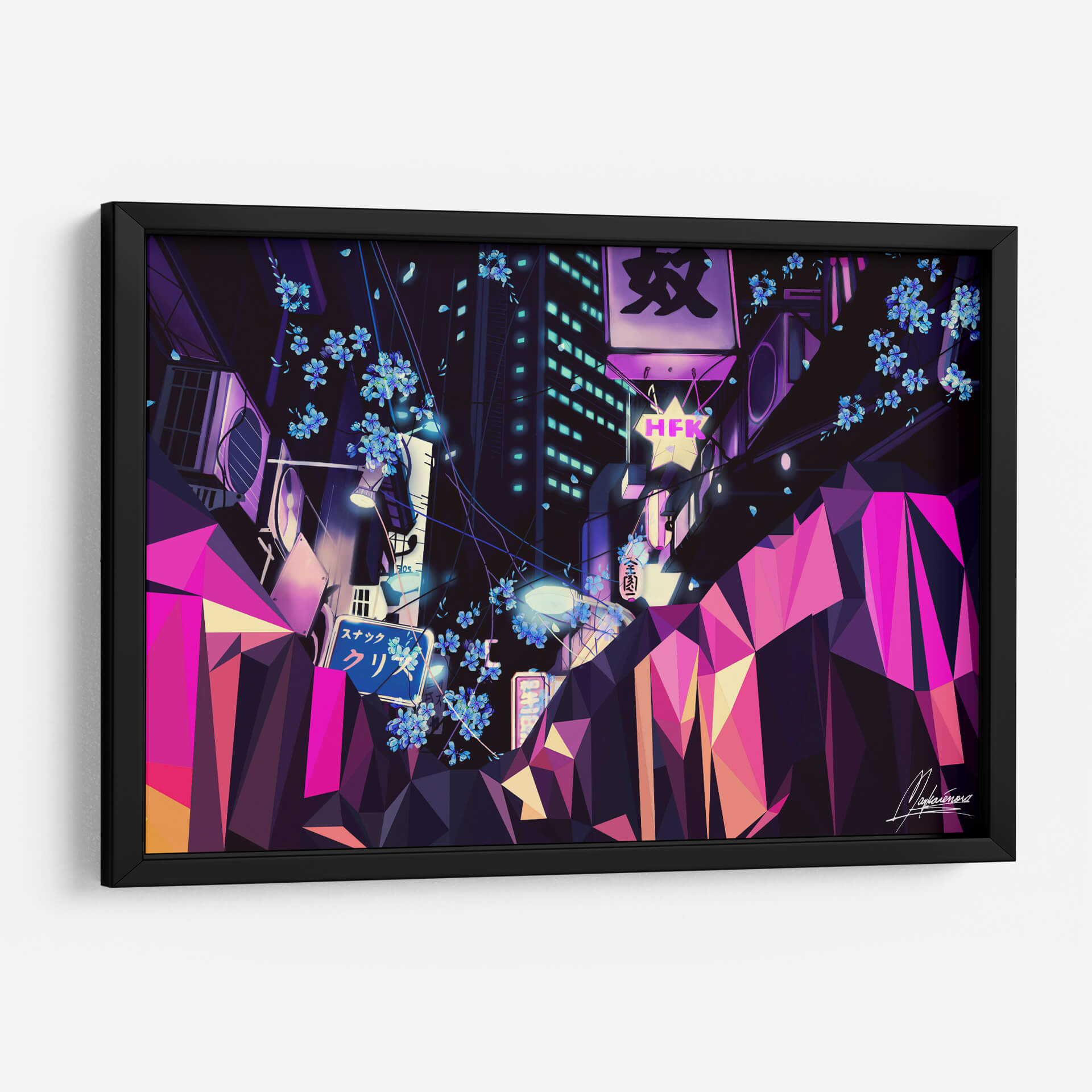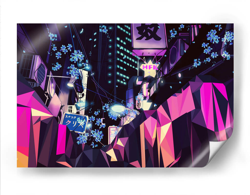 Sumérgete en la vibrante atmósfera de "GEOMETRIC BLOSSOMS", una obra de arte digital que fusiona la estética futurista de una ciudad nocturna con la delicadeza de las flores de cerezo. Esta pieza, creada por Mayka ienova, te transporta a un paisaje urbano estilizado donde rascacielos de neón se entrelazan con formas geométricas audaces en tonos púrpuras, rosas y azules eléctricos. Las delicadas flores, suspendidas en el aire como efímeros destellos de color, añaden un toque de serenidad y contraste a la energía pulsante de la urbe. La composición, caracterizada por su fuerte uso de ángulos y líneas definidas, evoca una sensación de movimiento y profundidad, invitando al espectador a explorar cada detalle de esta escena cautivadora. "GEOMETRIC BLOSSOMS" es ideal para aquellos que buscan infundir a sus espacios un aire de modernidad vanguardista con un toque de ensueño poético. Este cuadro decorativo es perfecto para salas de estar contemporáneas, oficinas de diseño o cualquier ambiente que desee un punto focal distintivo y lleno de carácter. Deja que esta obra inspire tu imaginación y transforme tu hogar en una galería de arte personal.