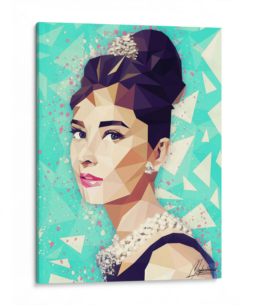 Sumérgete en la elegancia atemporal con "THE HEPBURN CLASS", una obra de arte contemporáneo que captura la esencia icónica de Audrey Hepburn a través de un vibrante estilo de arte geométrico y low poly. Cada faceta del rostro de la estrella se reinterpreta con audaces polígonos en tonos cálidos y fríos, creando un retrato dinámico que evoca sofisticación y glamour. El fondo, una explosión de formas triangulares y salpicaduras de color rosa vibrante sobre un turquesa enérgico, añade un toque moderno y audaz, contrastando a la perfección con la delicadeza del personaje. Esta pieza es una celebración del estilo clásico con una ejecución vanguardista, ideal para añadir un toque de distinción y carácter a cualquier espacio, desde una sala de estar elegante hasta un estudio de moda o una oficina contemporánea. "THE HEPBURN CLASS" no es solo un cuadro decorativo, es una declaración de estilo que fusiona la nostalgia cinematográfica con el arte digital de vanguardia, convirtiéndose en un punto focal cautivador y una fuente de inspiración diaria.