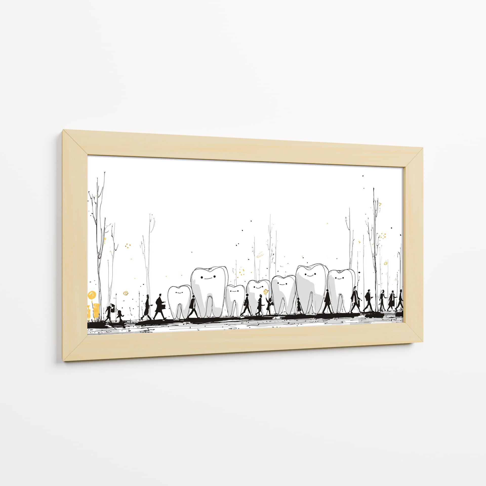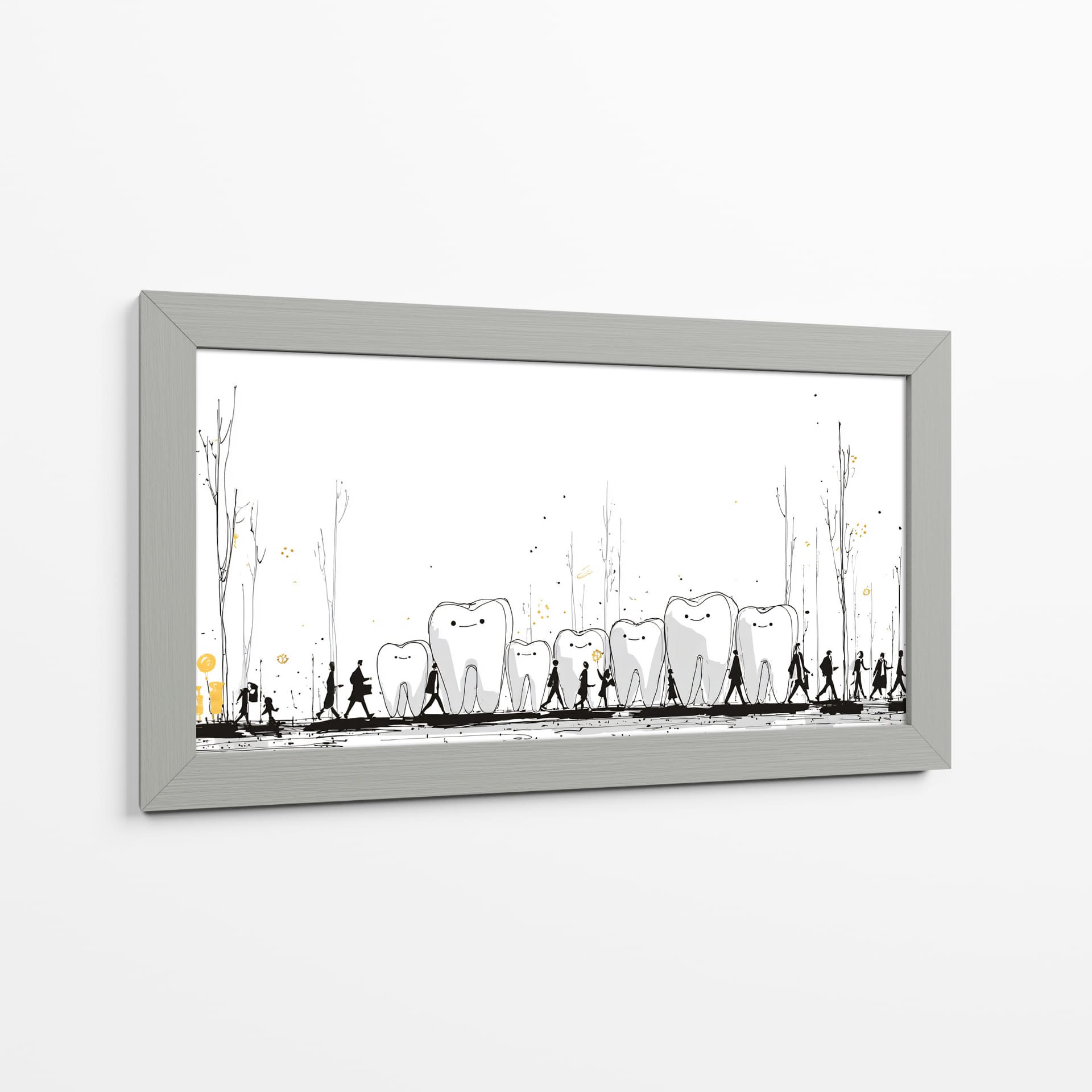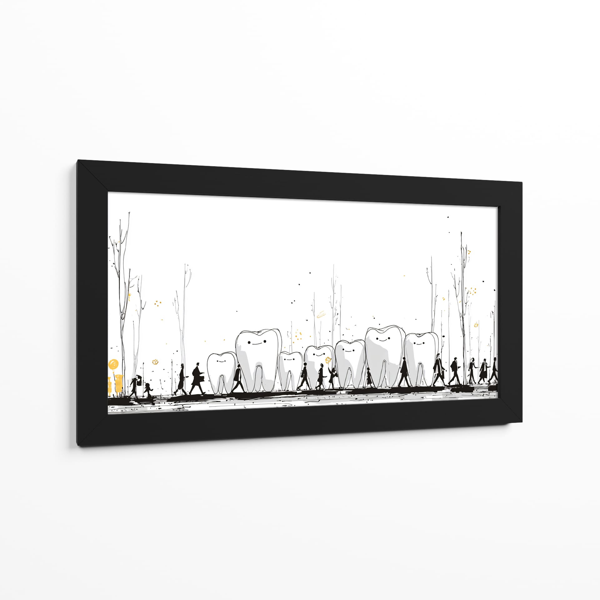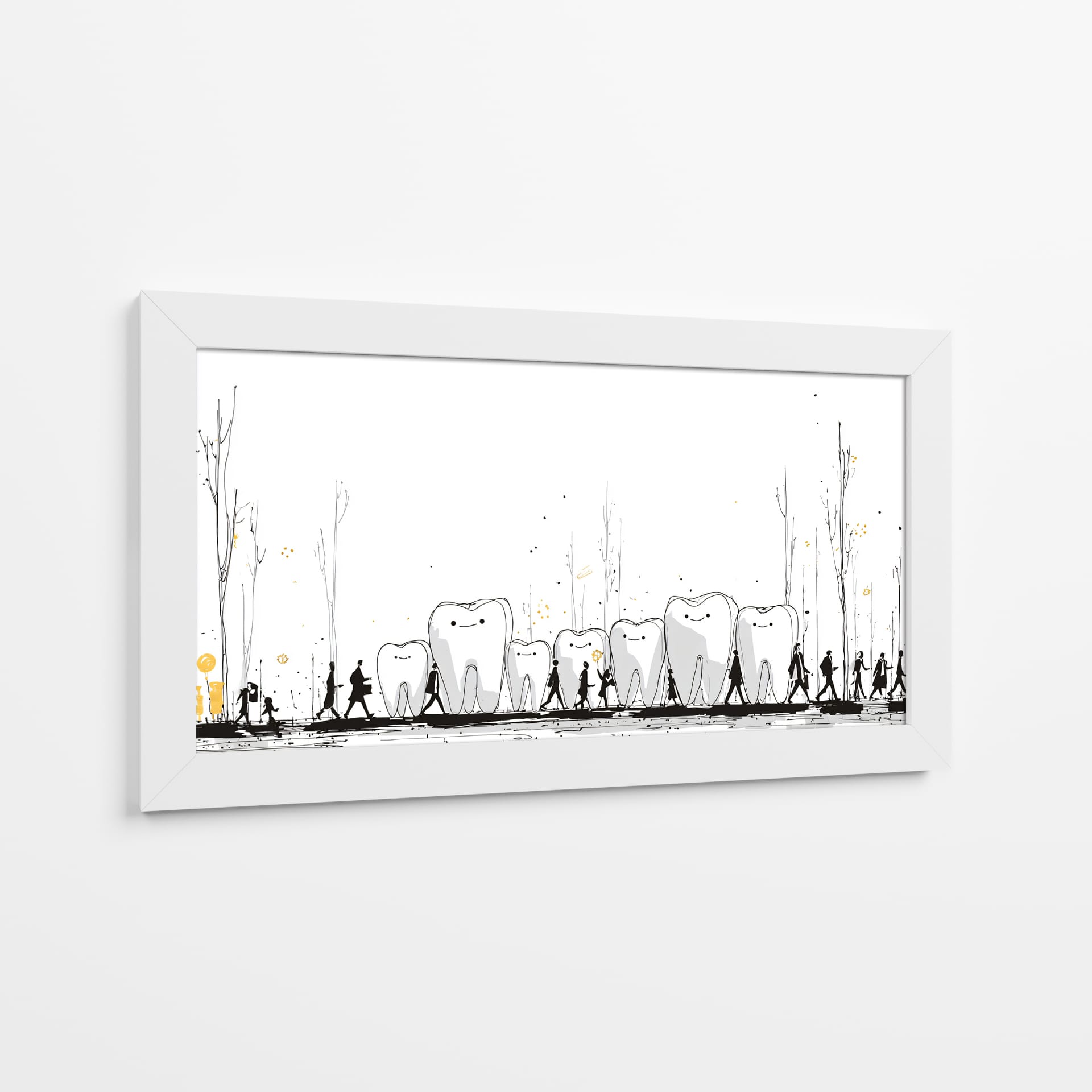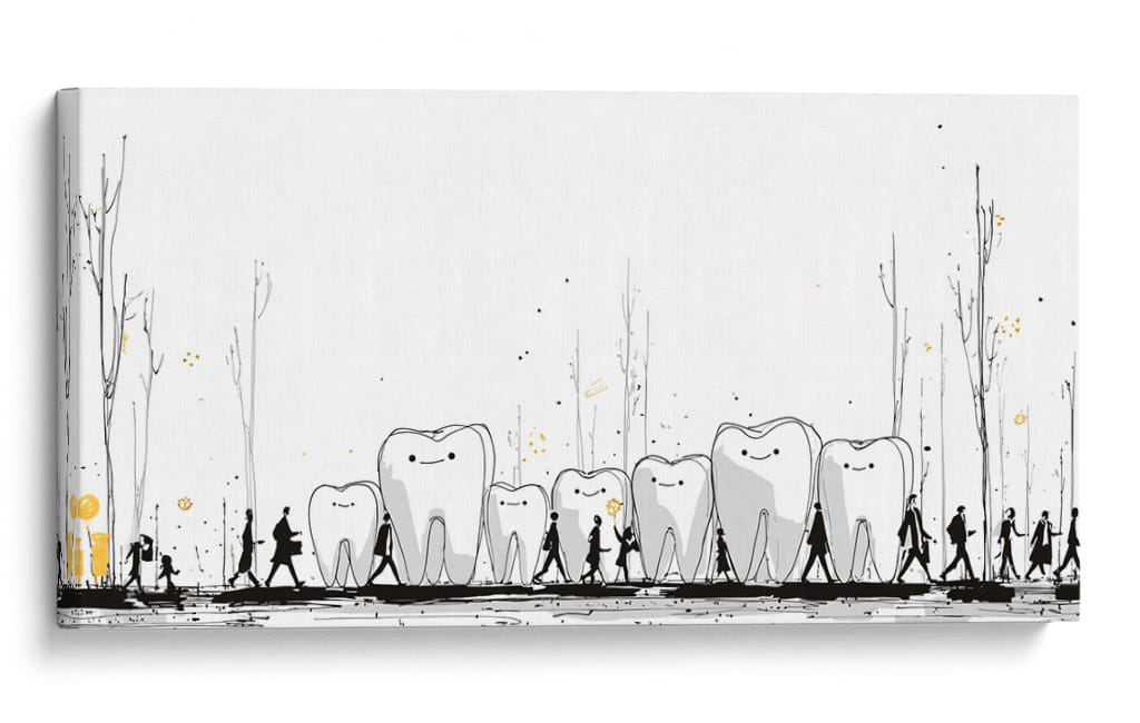 Sumérgete en el peculiar y encantador mundo de "Monumentos Dentales", una obra de arte contemporáneo que invita a la reflexión y arranca una sonrisa. Esta pieza visualmente intrigante presenta una hilera de dientes con expresiones amigables, bordeados por siluetas humanas en un paseo escénico. Los delicados trazos en blanco y negro, acentuados con toques de dorado y salpicaduras que evocan un paisaje onírico, crean una atmósfera lúdica y surrealista. La simplicidad del fondo blanco resalta la narrativa central, donde los dientes parecen monumentos o guías en un viaje, acompañados por figuras que caminan en fila, sugiriendo un camino o una procesión. Es una obra ideal para despachos de dentistas, salas de espera, o para cualquier espacio que busque un toque de originalidad, humor y un mensaje subyacente sobre el cuidado o la vitalidad. Este cuadro decorativo no solo embellece, sino que también inicia conversaciones, aportando una dosis de fantasía y alegría a tu decoración. Añade un elemento único y memorable a tu hogar u oficina con esta pieza excepcional del artista DIEGO D L.