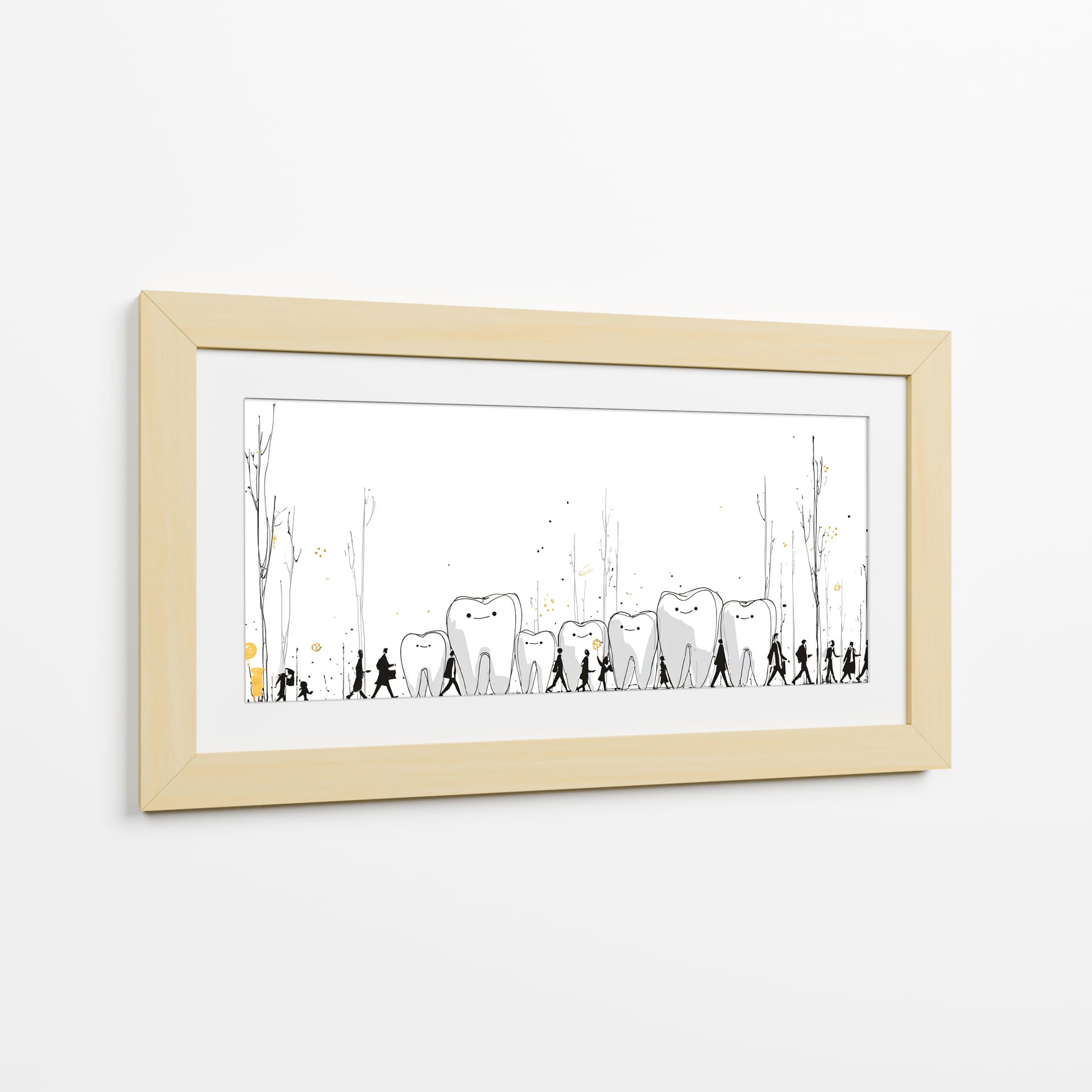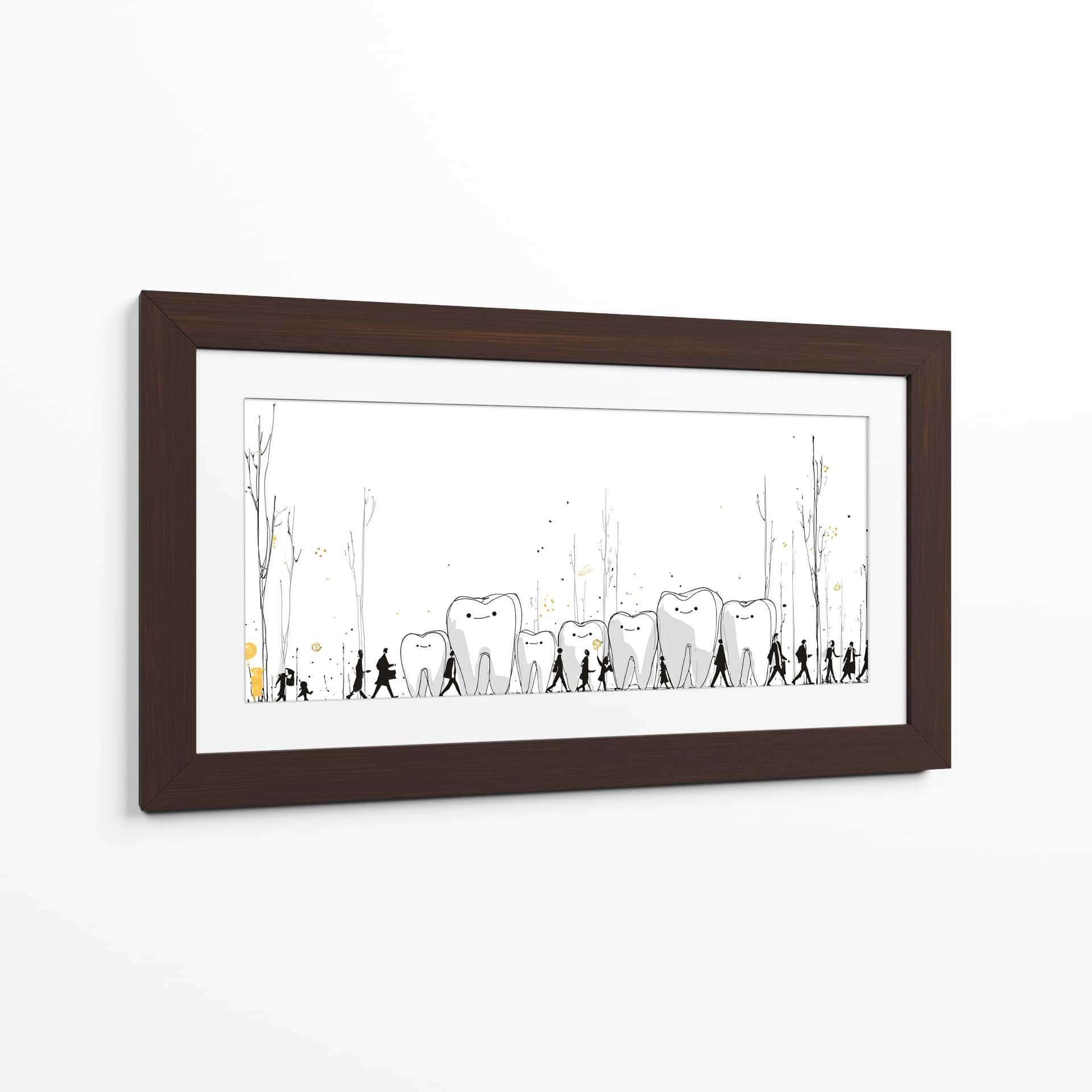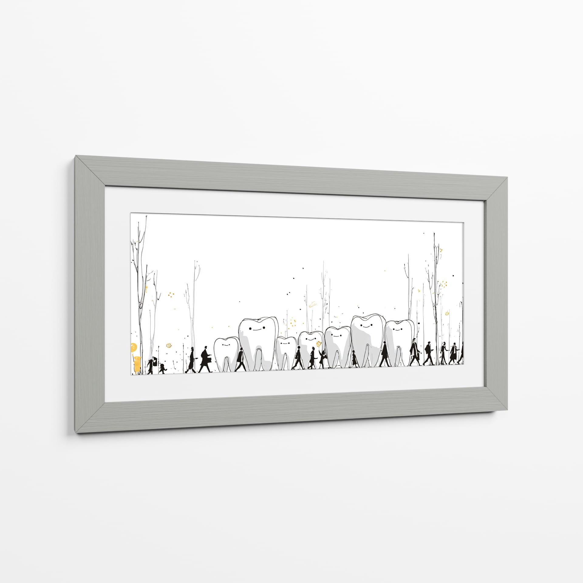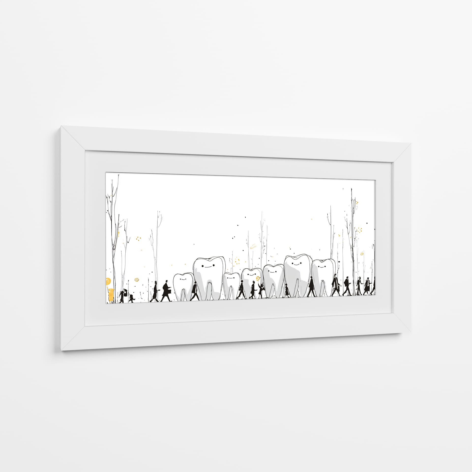 Sumérgete en el peculiar y encantador mundo de "Monumentos Dentales", una obra de arte contemporáneo que invita a la reflexión y arranca una sonrisa. Esta pieza visualmente intrigante presenta una hilera de dientes con expresiones amigables, bordeados por siluetas humanas en un paseo escénico. Los delicados trazos en blanco y negro, acentuados con toques de dorado y salpicaduras que evocan un paisaje onírico, crean una atmósfera lúdica y surrealista. La simplicidad del fondo blanco resalta la narrativa central, donde los dientes parecen monumentos o guías en un viaje, acompañados por figuras que caminan en fila, sugiriendo un camino o una procesión. Es una obra ideal para despachos de dentistas, salas de espera, o para cualquier espacio que busque un toque de originalidad, humor y un mensaje subyacente sobre el cuidado o la vitalidad. Este cuadro decorativo no solo embellece, sino que también inicia conversaciones, aportando una dosis de fantasía y alegría a tu decoración. Añade un elemento único y memorable a tu hogar u oficina con esta pieza excepcional del artista DIEGO D L.