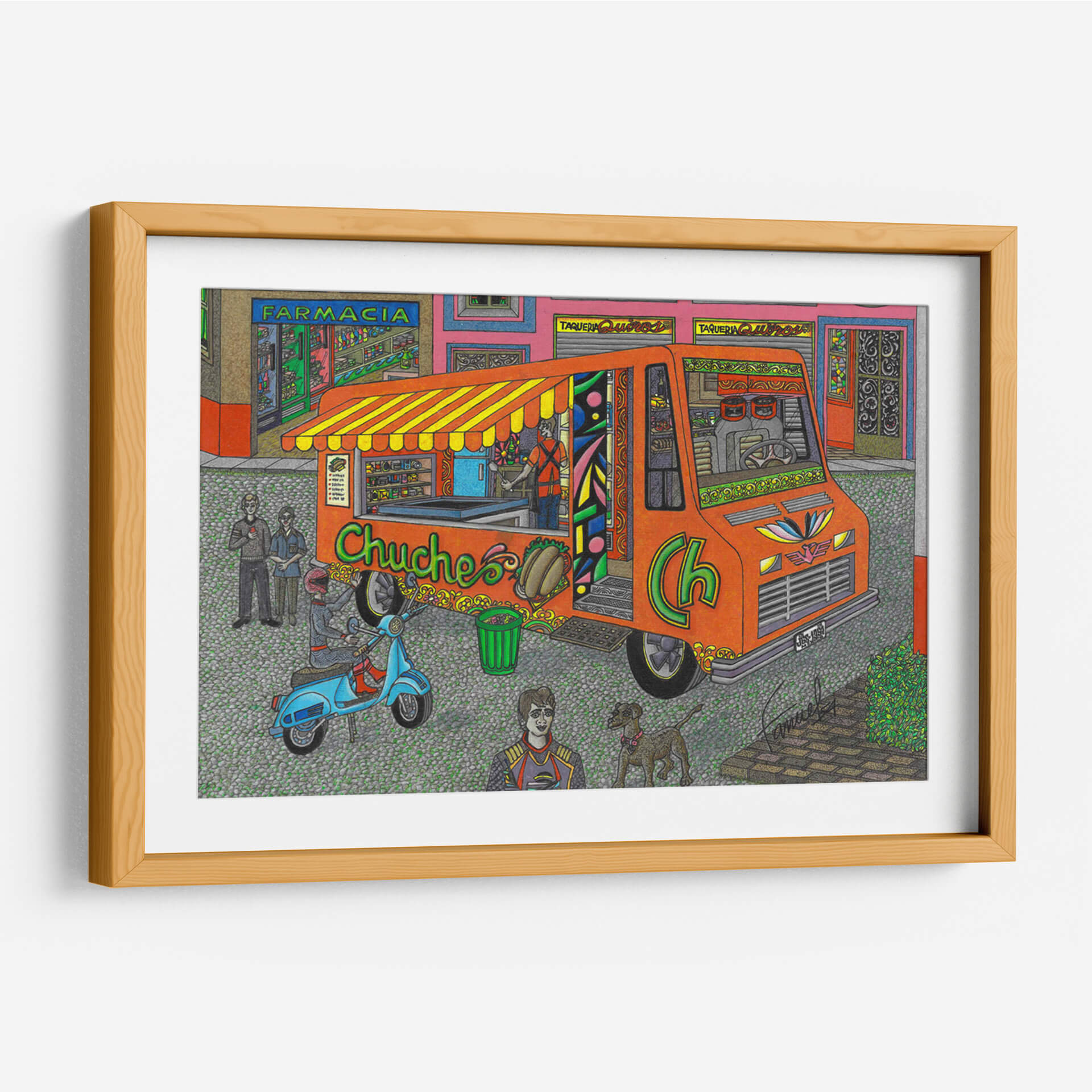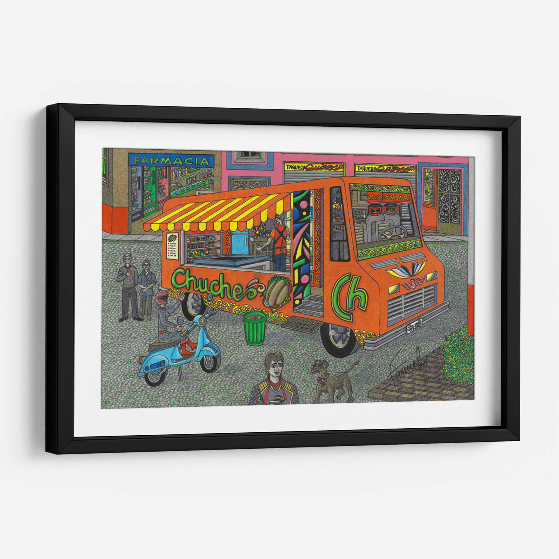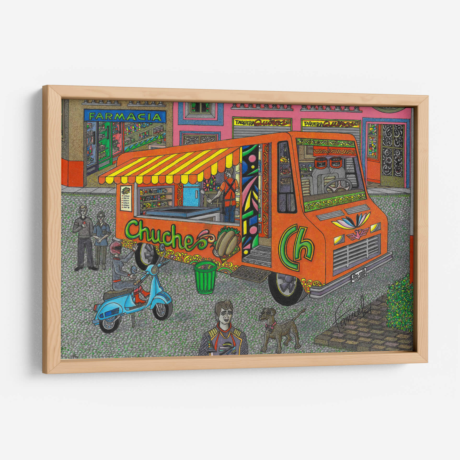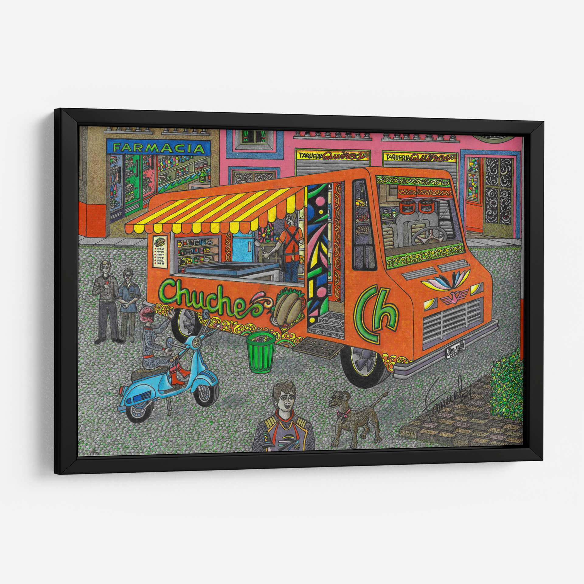 Adéntrate en el vibrante mundo de "El Antojo" de Fanuel, una obra de arte que captura la esencia de la vida urbana con un toque de nostalgia y color. Este cuadro decorativo presenta una escena callejera llena de detalles, con un camión de comida naranja brillante como protagonista, adornado con gráficos llamativos y un toldo a rayas amarillas y naranjas. La ilustración evoca la atmósfera de un día soleado, con personas y sus vehículos dispersos por el empedrado, creando una narrativa visual dinámica. Los colores vivos y el estilo de dibujo distintivo de Fanuel dan vida a cada elemento, desde la fachada de la "Farmacia" hasta la "Taquería Quiros", invitando al espectador a explorar los recovecos de esta escena urbana. "El Antojo" es una pieza perfecta para añadir un toque de personalidad y conversación a tu sala de estar, cocina u oficina, transformando cualquier espacio en un lugar lleno de carácter y energía. Ideal para quienes aprecian el arte contemporáneo con un enfoque en la vida cotidiana y los detalles encantadores. Añade esta joya a tu colección y deja que su vitalidad ilumine tu hogar.