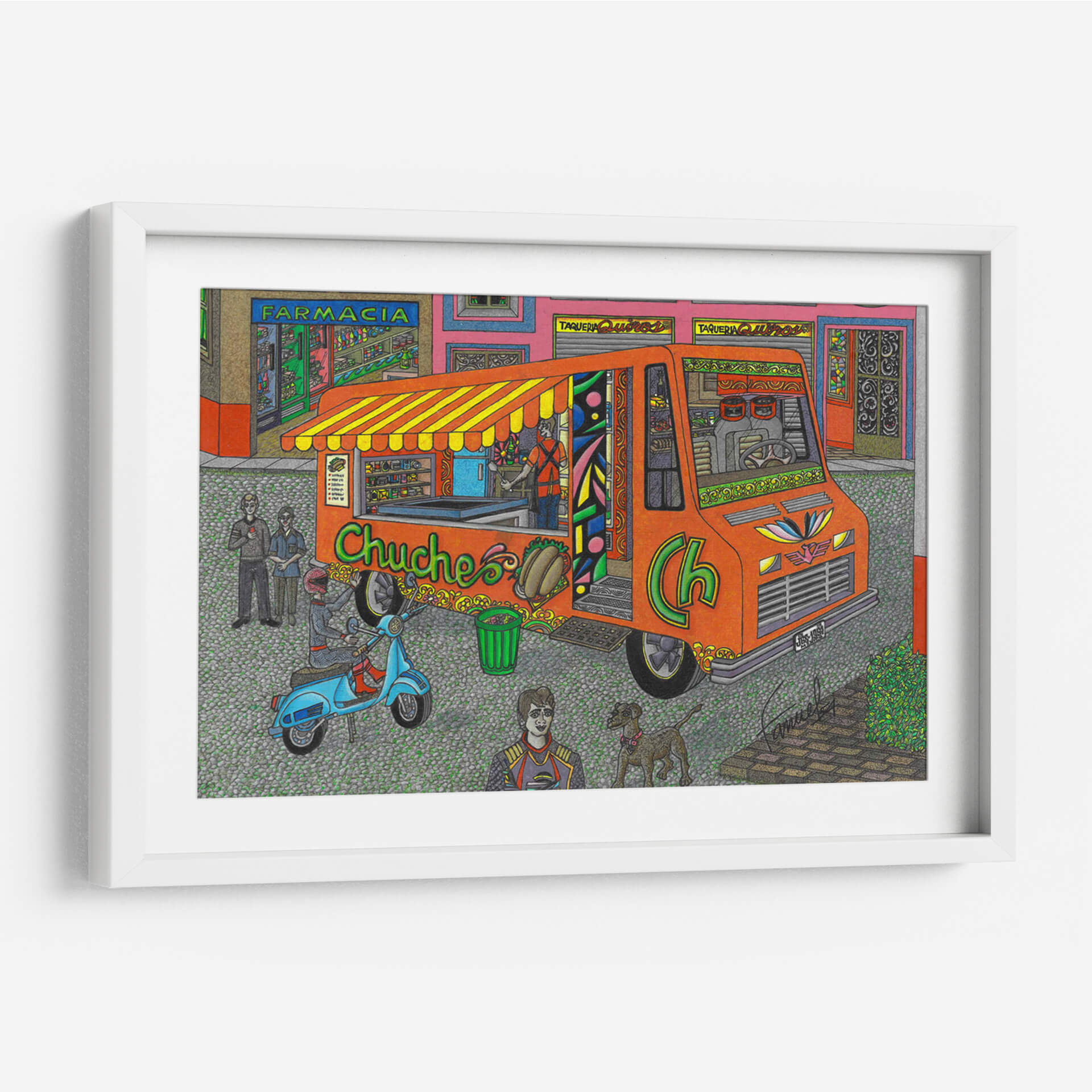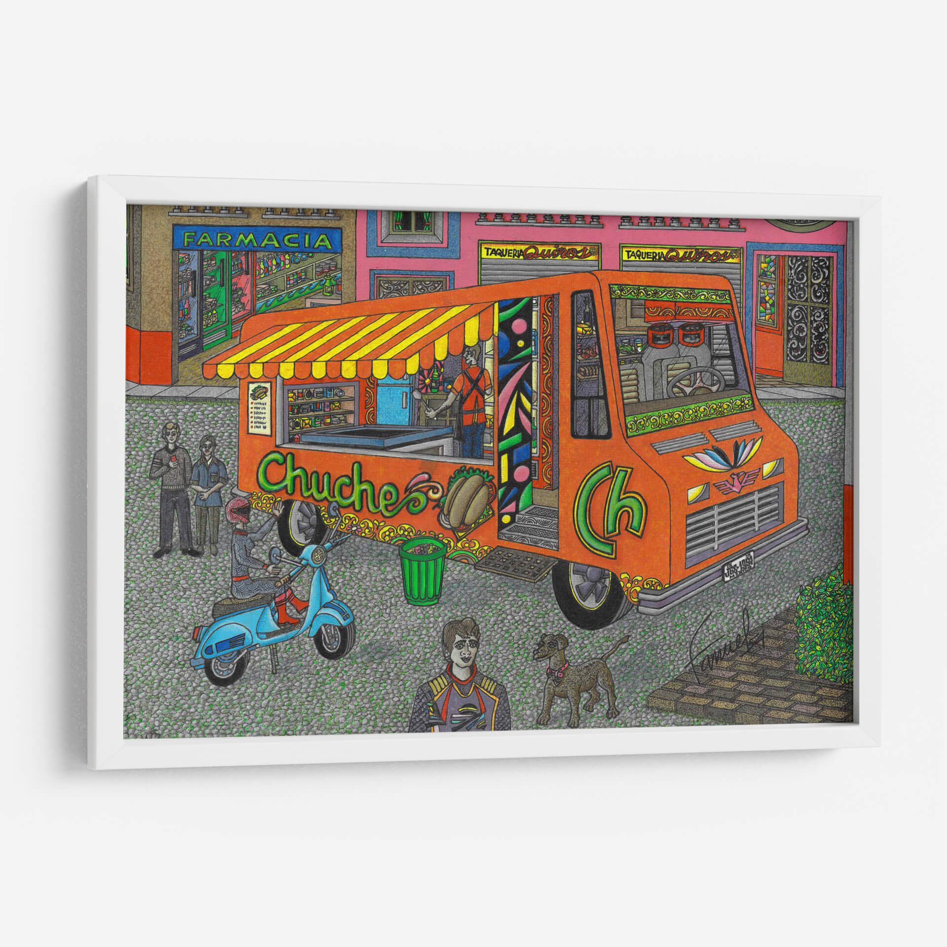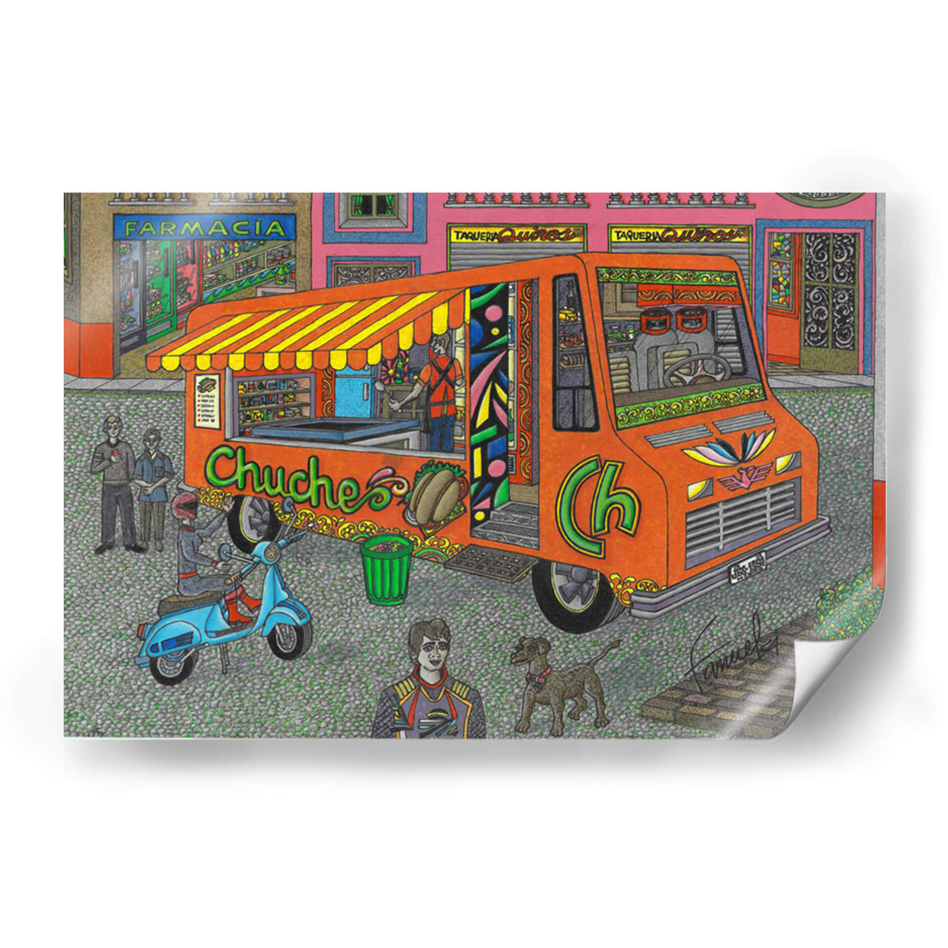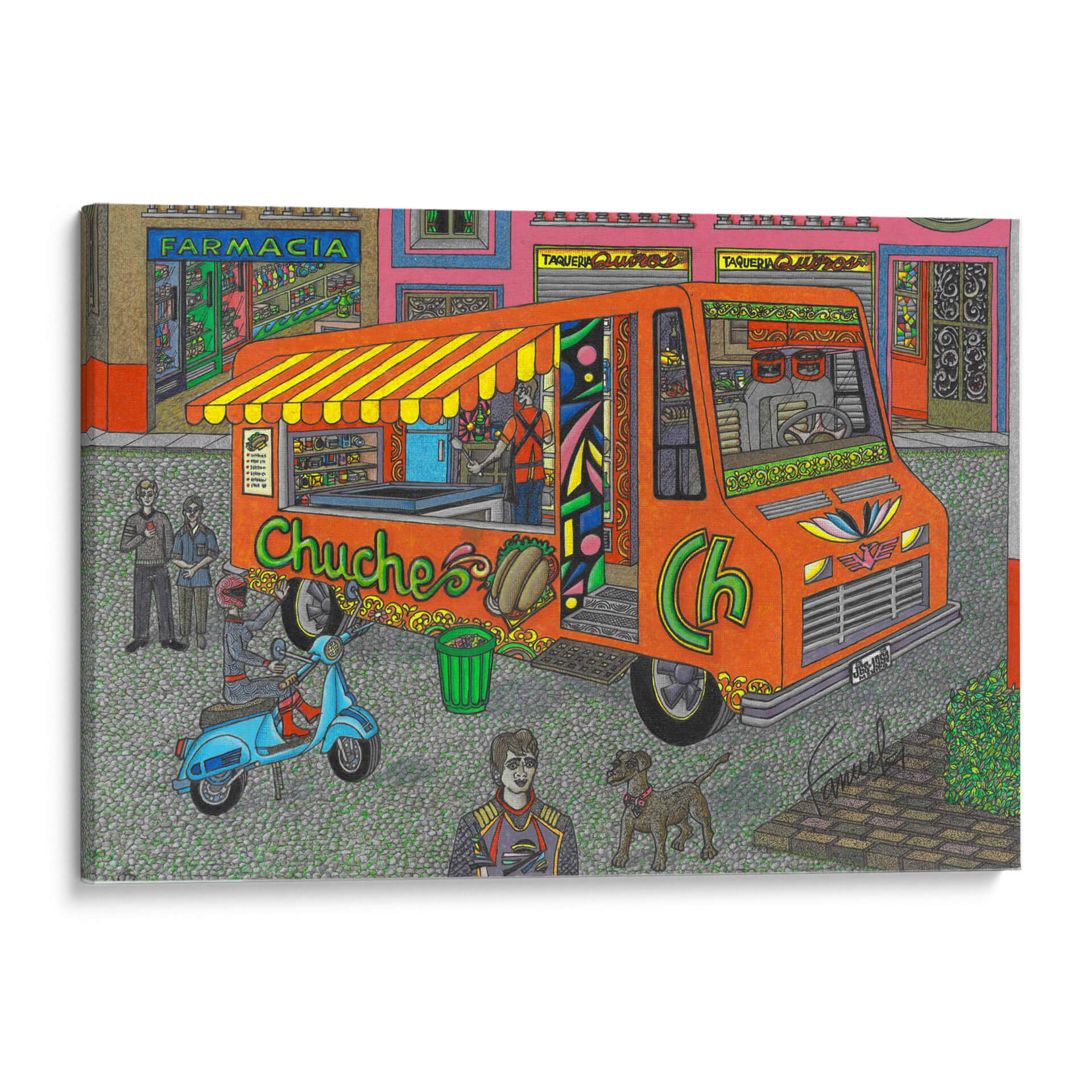 Adéntrate en el vibrante mundo de "El Antojo" de Fanuel, una obra de arte que captura la esencia de la vida urbana con un toque de nostalgia y color. Este cuadro decorativo presenta una escena callejera llena de detalles, con un camión de comida naranja brillante como protagonista, adornado con gráficos llamativos y un toldo a rayas amarillas y naranjas. La ilustración evoca la atmósfera de un día soleado, con personas y sus vehículos dispersos por el empedrado, creando una narrativa visual dinámica. Los colores vivos y el estilo de dibujo distintivo de Fanuel dan vida a cada elemento, desde la fachada de la "Farmacia" hasta la "Taquería Quiros", invitando al espectador a explorar los recovecos de esta escena urbana. "El Antojo" es una pieza perfecta para añadir un toque de personalidad y conversación a tu sala de estar, cocina u oficina, transformando cualquier espacio en un lugar lleno de carácter y energía. Ideal para quienes aprecian el arte contemporáneo con un enfoque en la vida cotidiana y los detalles encantadores. Añade esta joya a tu colección y deja que su vitalidad ilumine tu hogar.