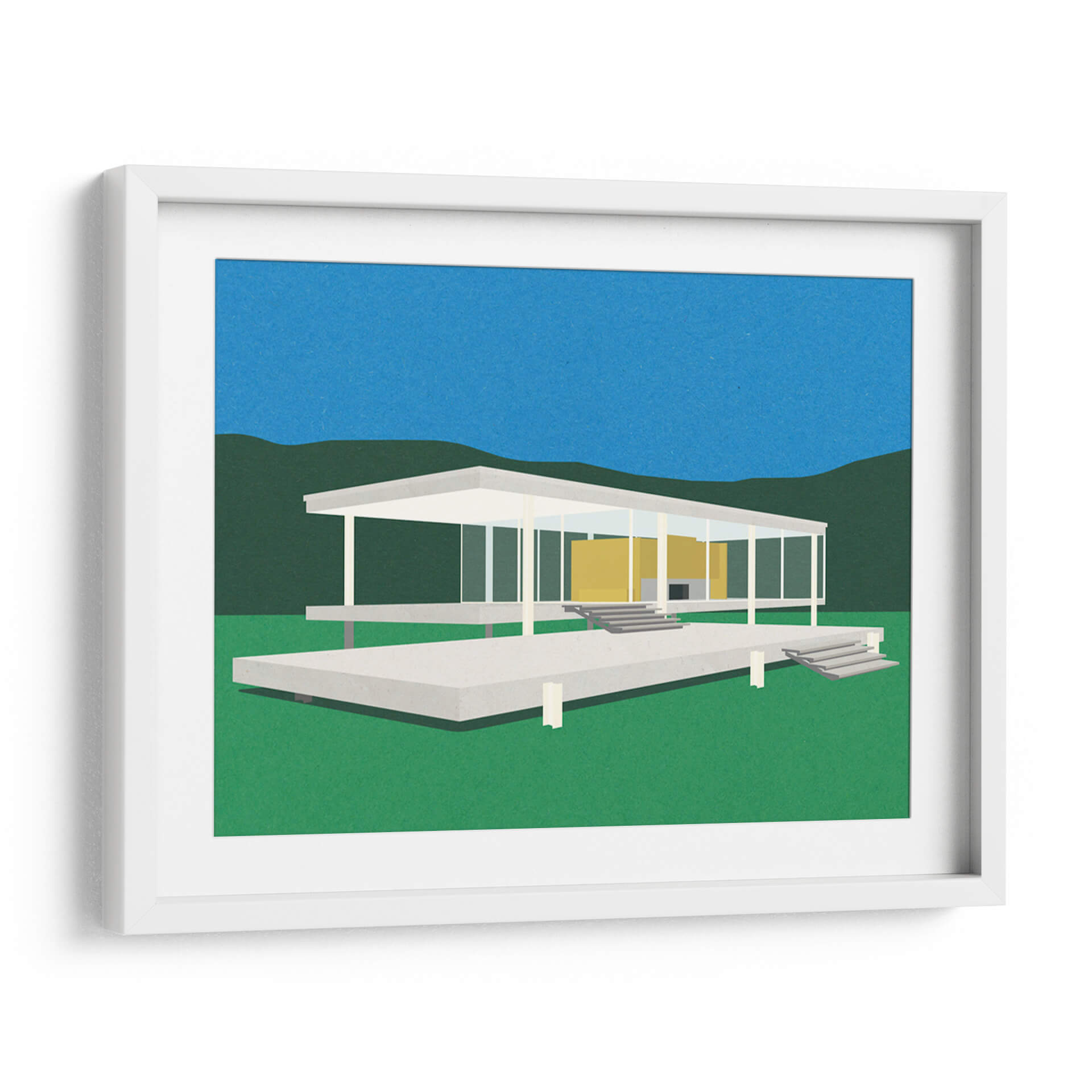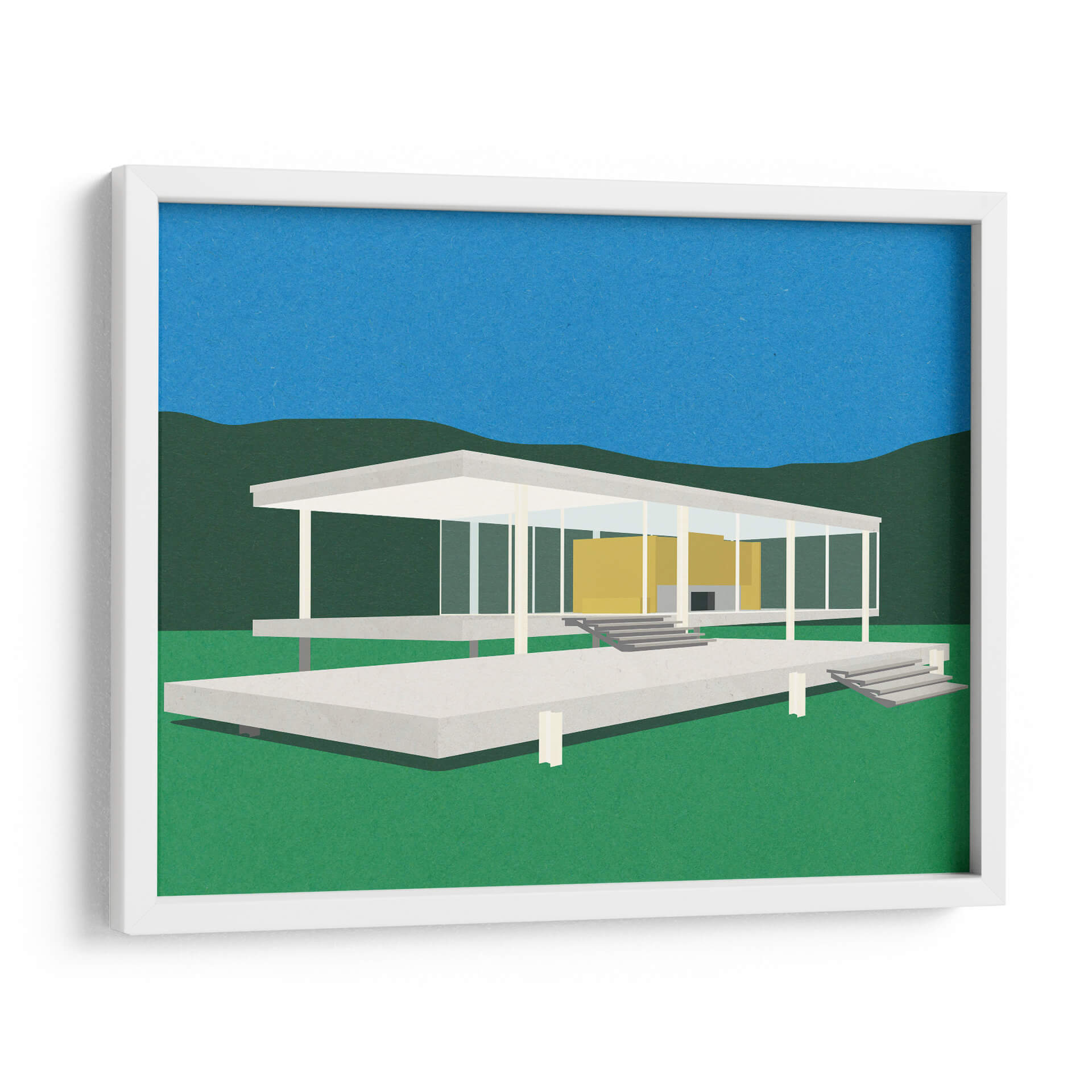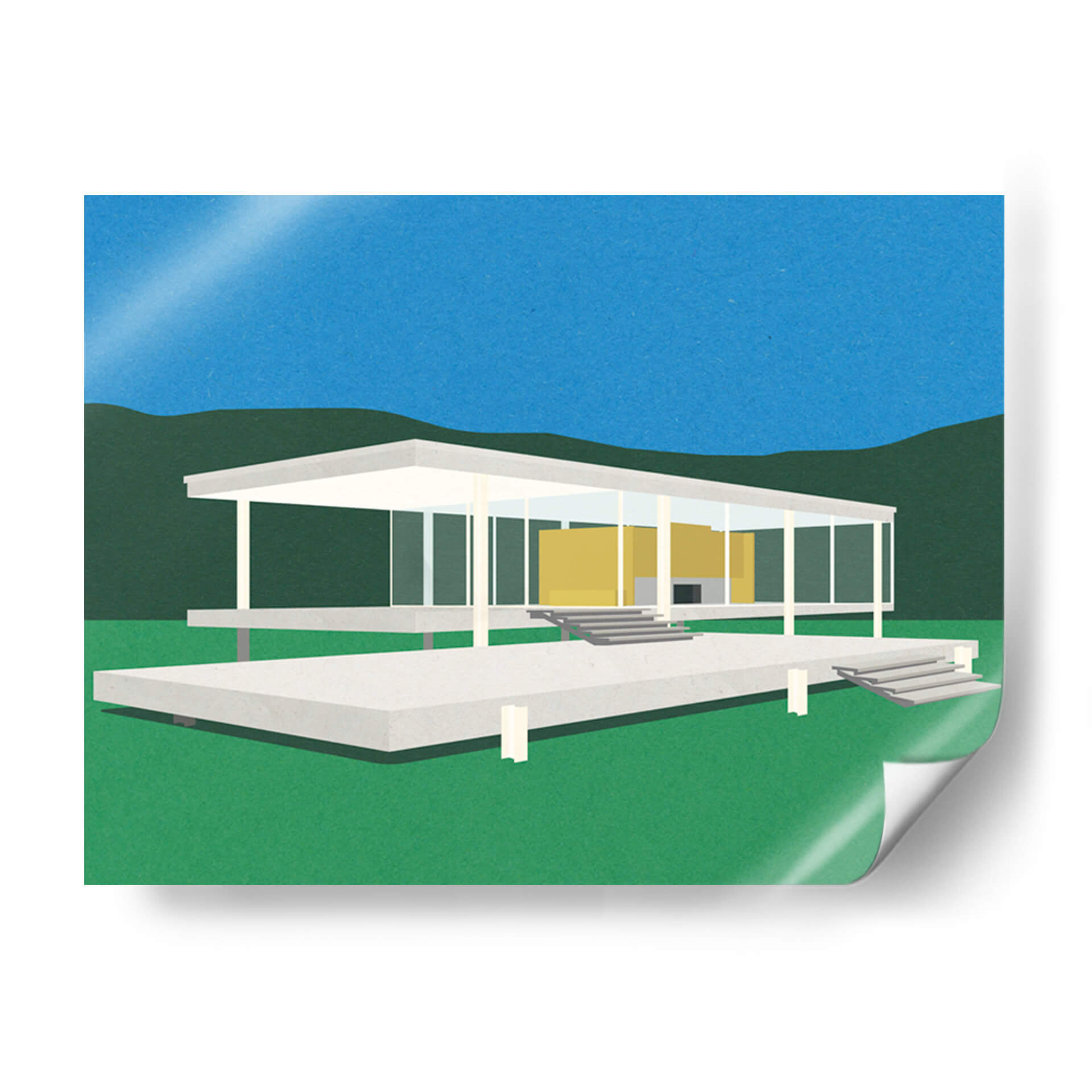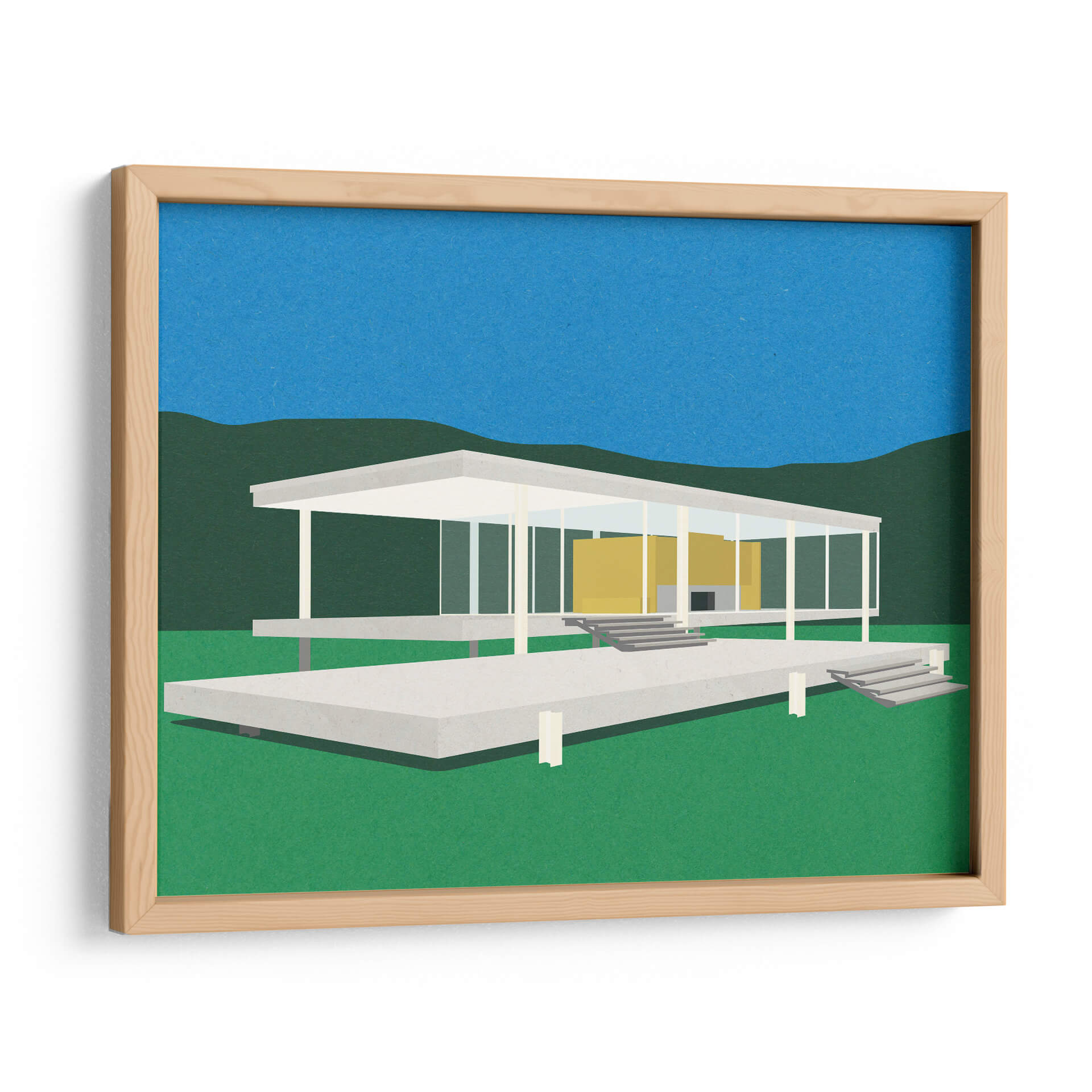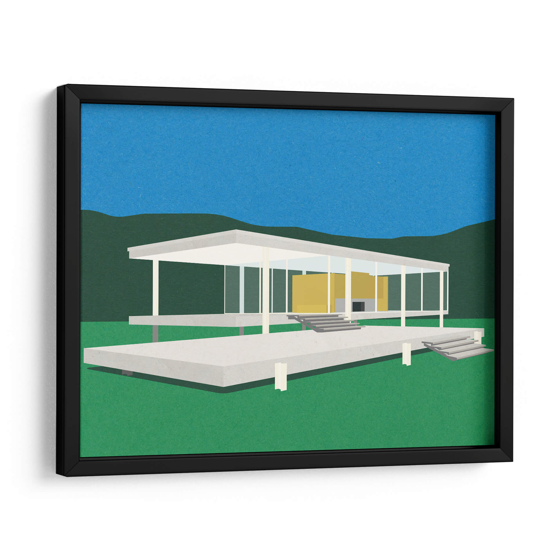 Sumérgete en la elegancia arquitectónica con este cuadro decorativo inspirado en la icónica Casa Farnsworth de Ludwig Mies van der Rohe. La obra captura la esencia del modernismo con sus líneas limpias, amplios ventanales y la integración armoniosa con el entorno natural. Los colores vibrantes y la composición geométrica crean una atmósfera de serenidad y sofisticación, invitando a la contemplación. Los tonos verdes del césped y el follaje contrastan con el azul intenso del cielo y los detalles en amarillo cálido del interior, generando un equilibrio visual cautivador. Este cuadro abstracto de arquitectura es ideal para espacios que buscan un toque de diseño contemporáneo y minimalista, como salas de estar, oficinas o estudios. Añade una pieza de arte que celebra la forma, la función y la belleza atemporal de la arquitectura moderna a tu hogar u oficina. Una representación gráfica única que evoca tranquilidad y orden, perfecta para aquellos que aprecian el diseño y la estética depurada. Transforma tu pared en una ventana a un mundo de claridad y estilo.